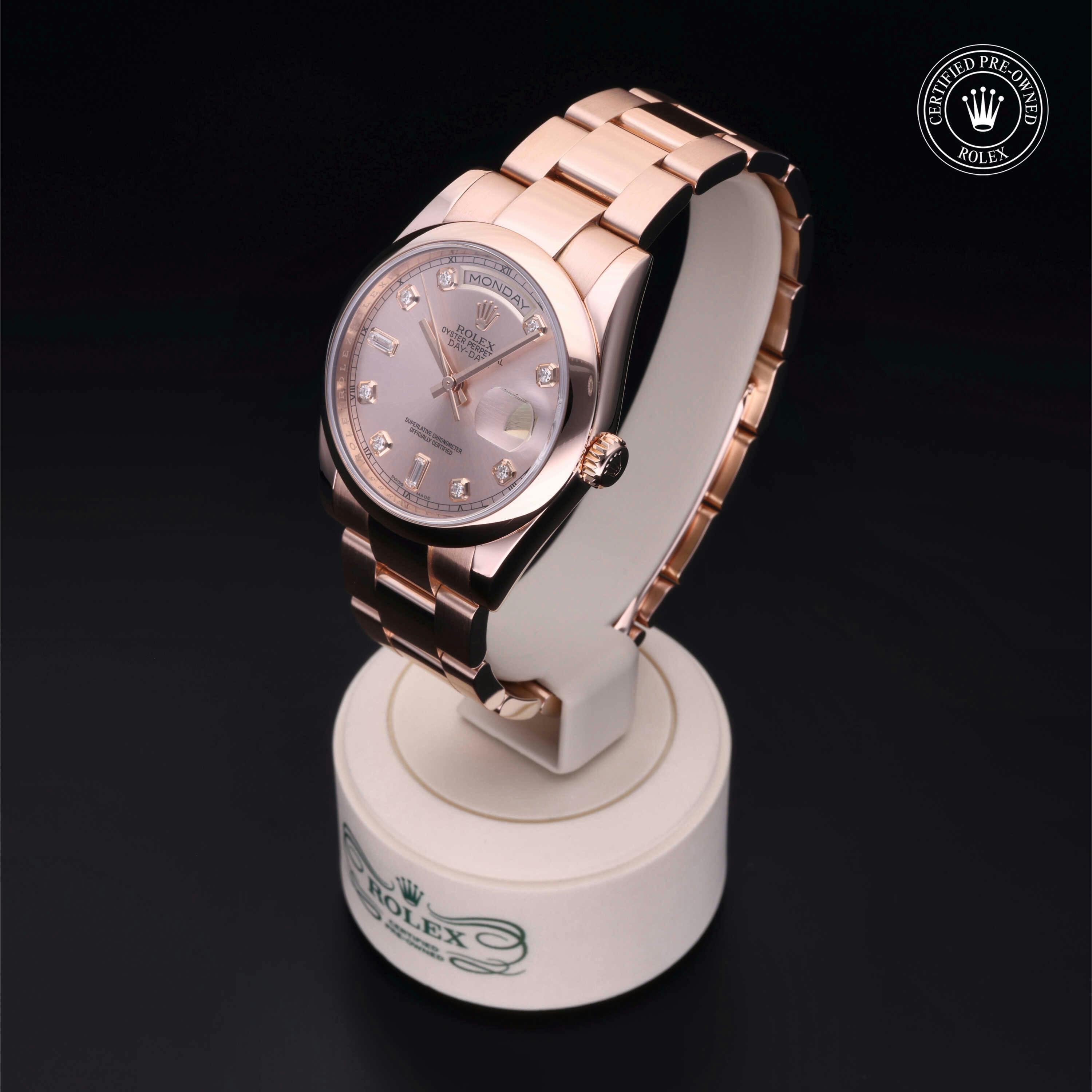 Pre-Owned Rolex Day-Date (118205F) self - winding automatic watch, features a 36mm 18k rose gold case surrounding a pink dial on a bracelet with folding buckle. Functions include hours, minutes, seconds, date, day This watch has been serviced and comes with the original box. Time remaining on the Manufacturer's service warranty!