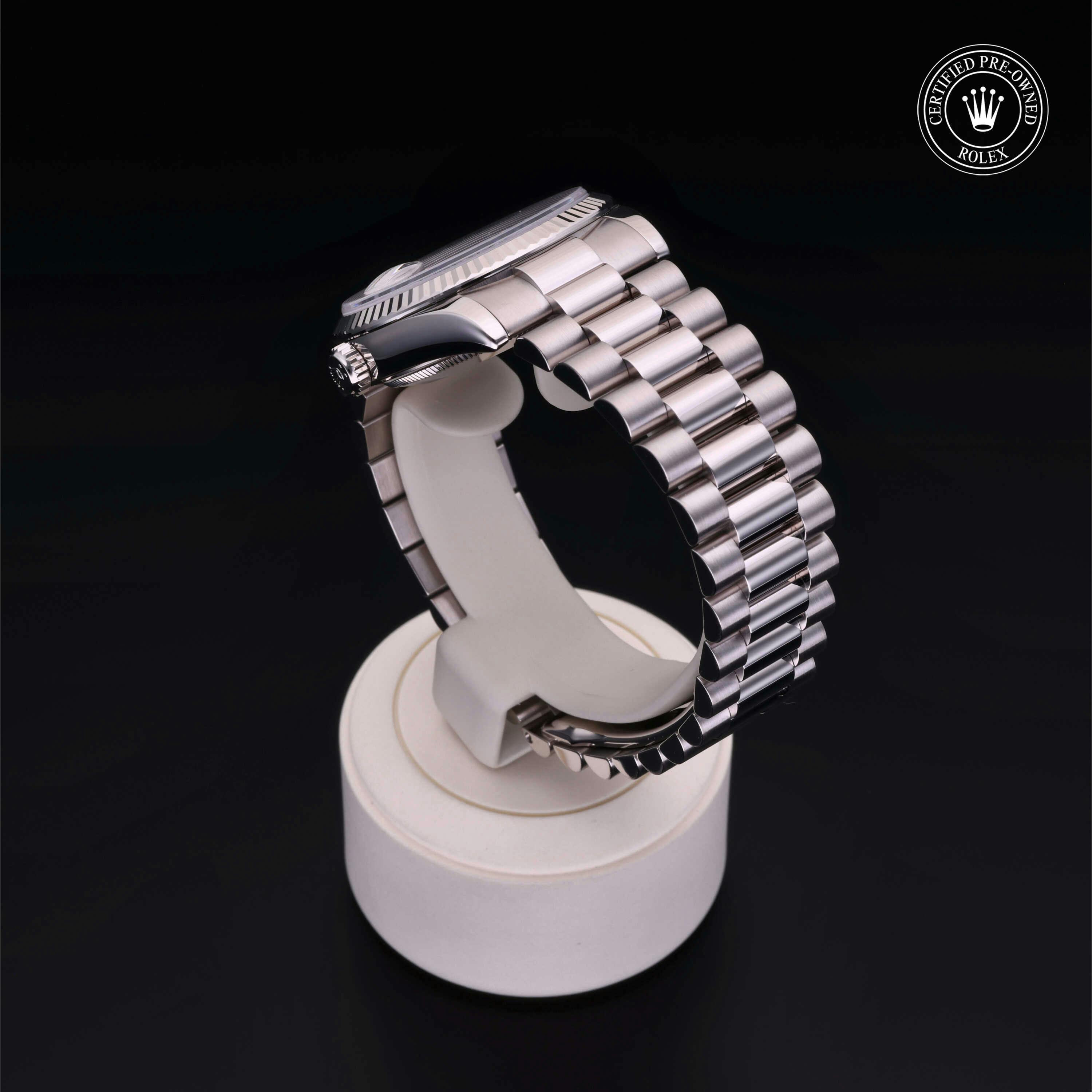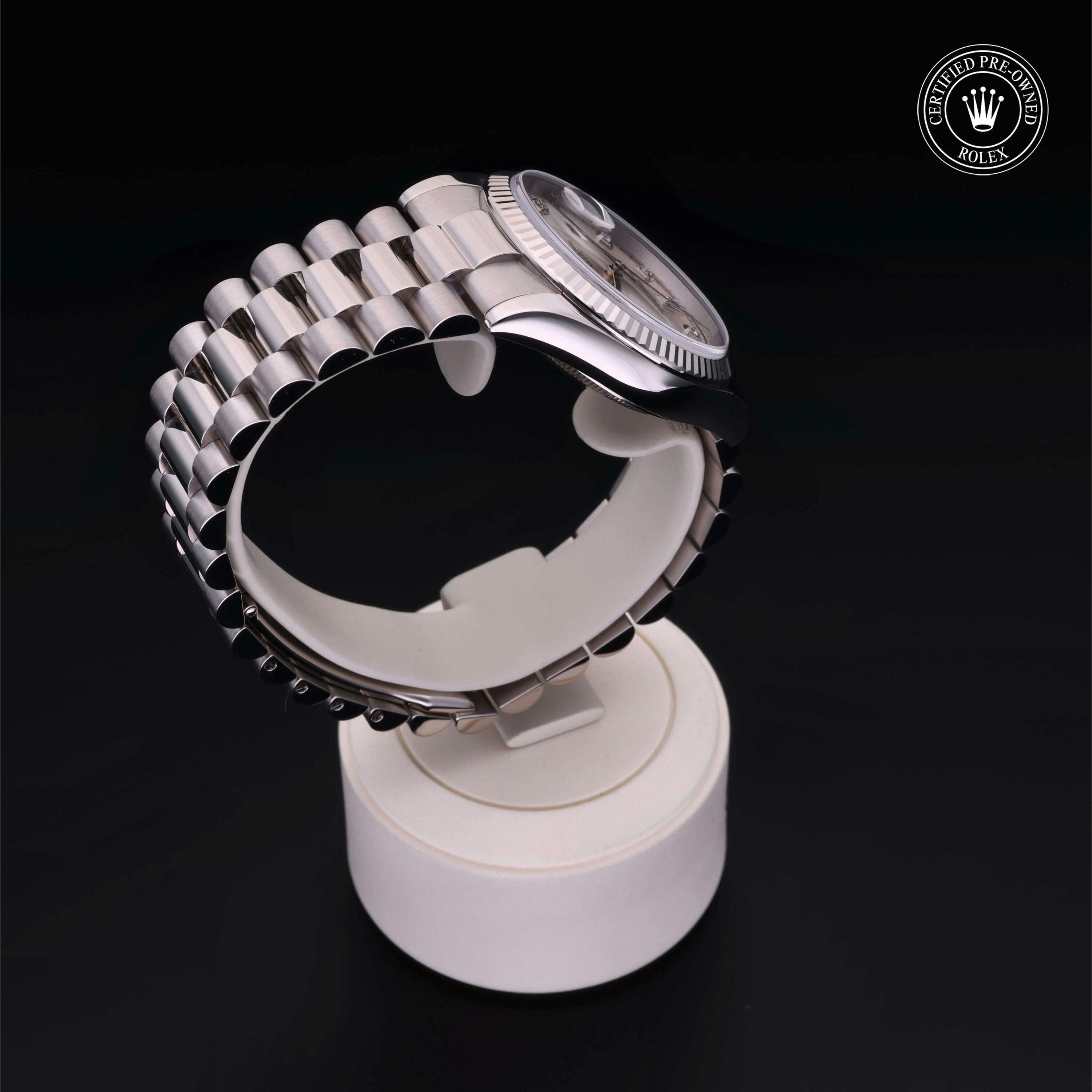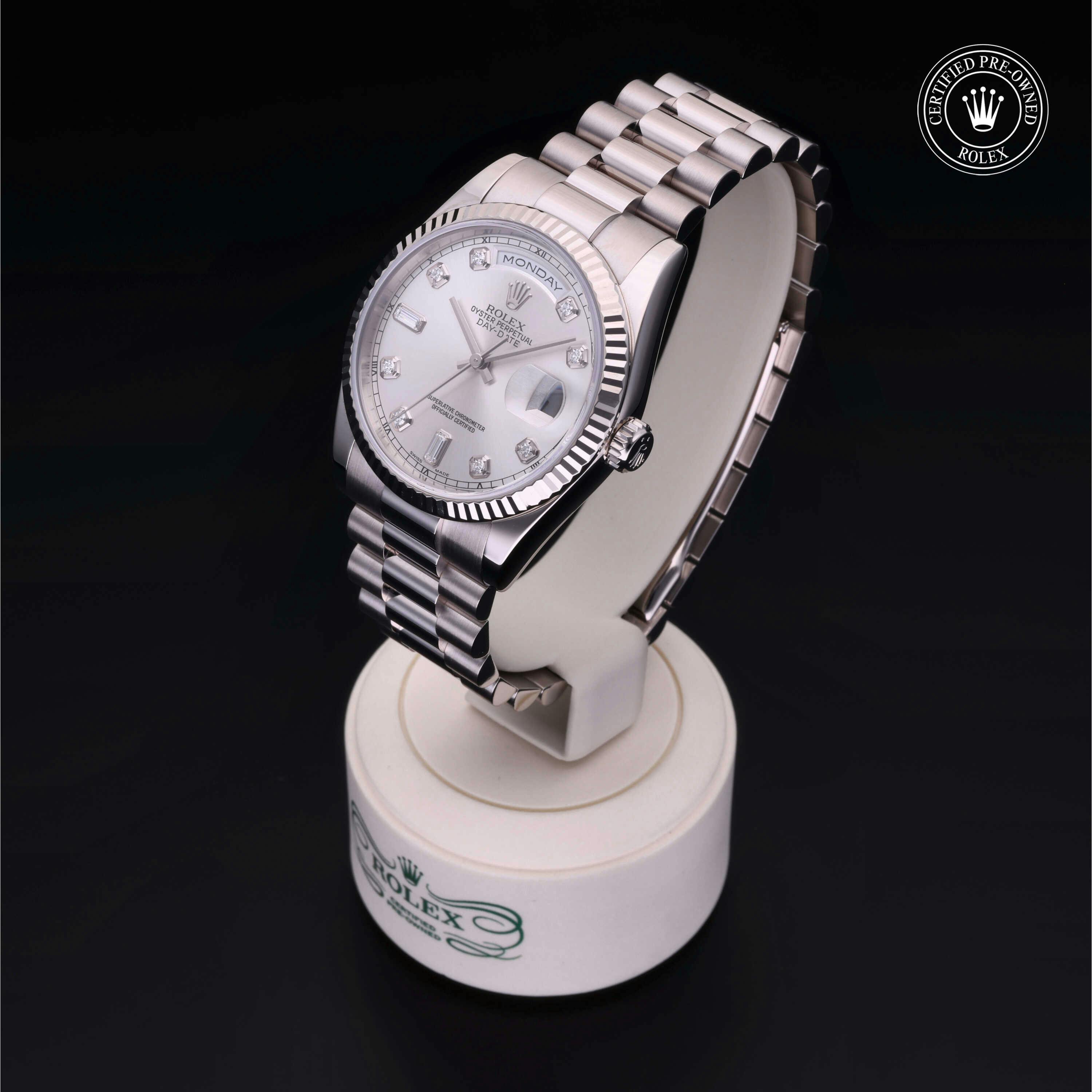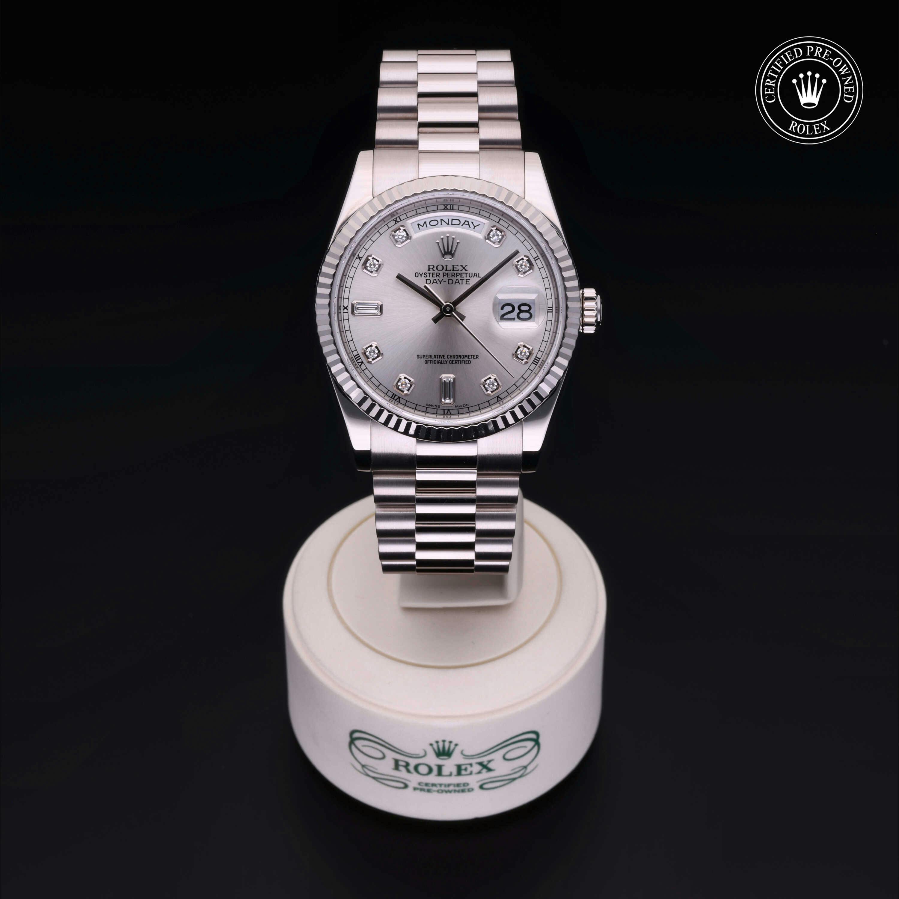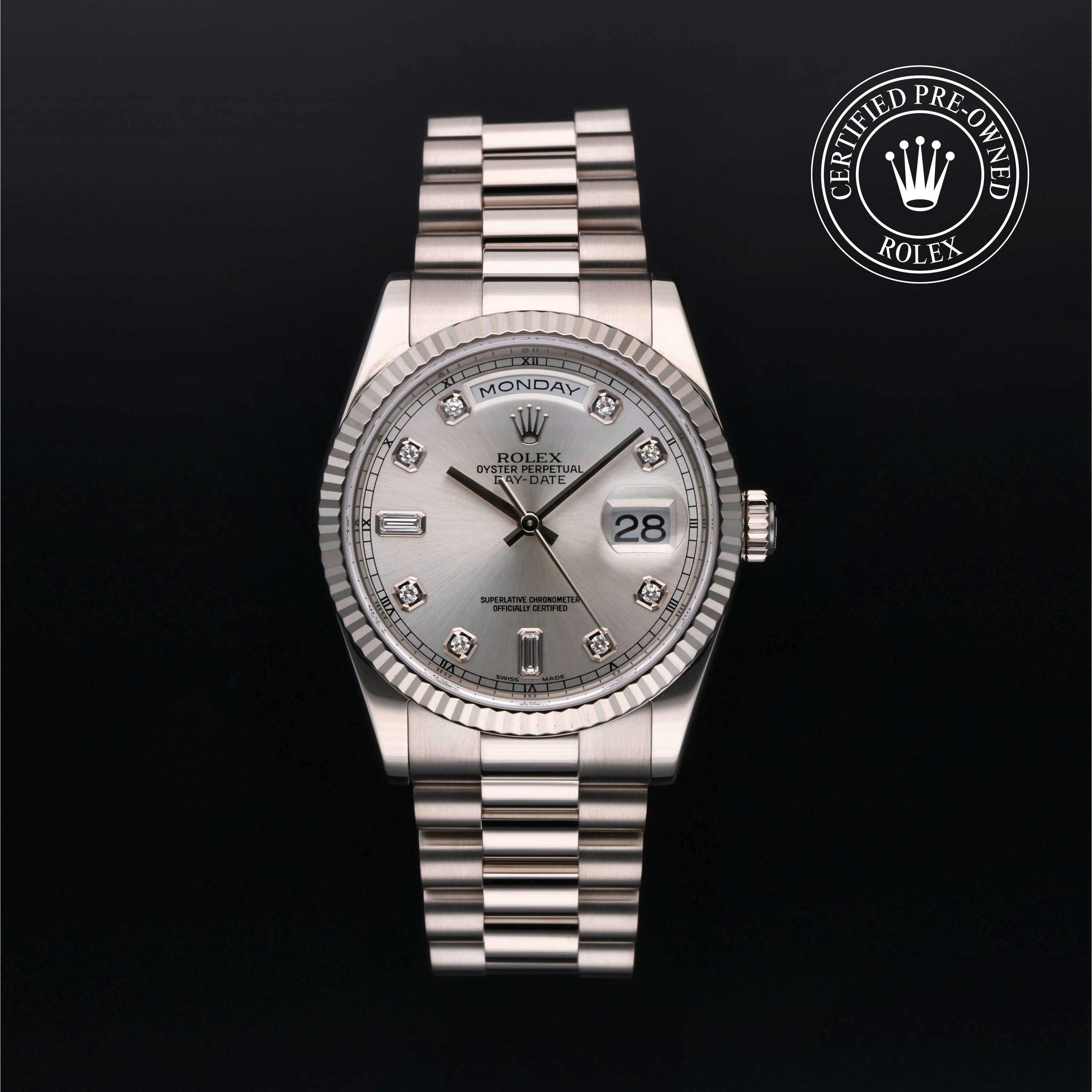 Pre-Owned Rolex Day-Date (118239) self - winding automatic watch, features a 36mm 18k white gold case surrounding a silver dial on a strap. Functions include hours, minutes, seconds, date, day This watch has been serviced and comes complete with the original box and papers. Time remaining on the Manufacturer's service warranty! This watch will be ready to ship in 5-7 days!