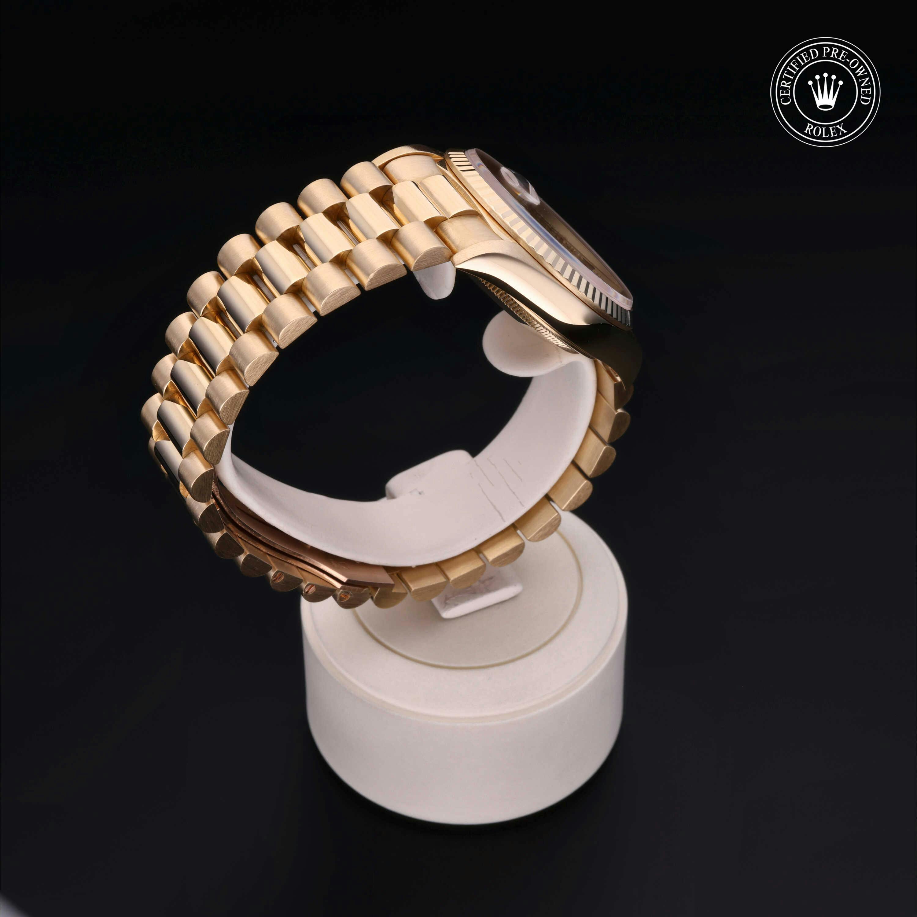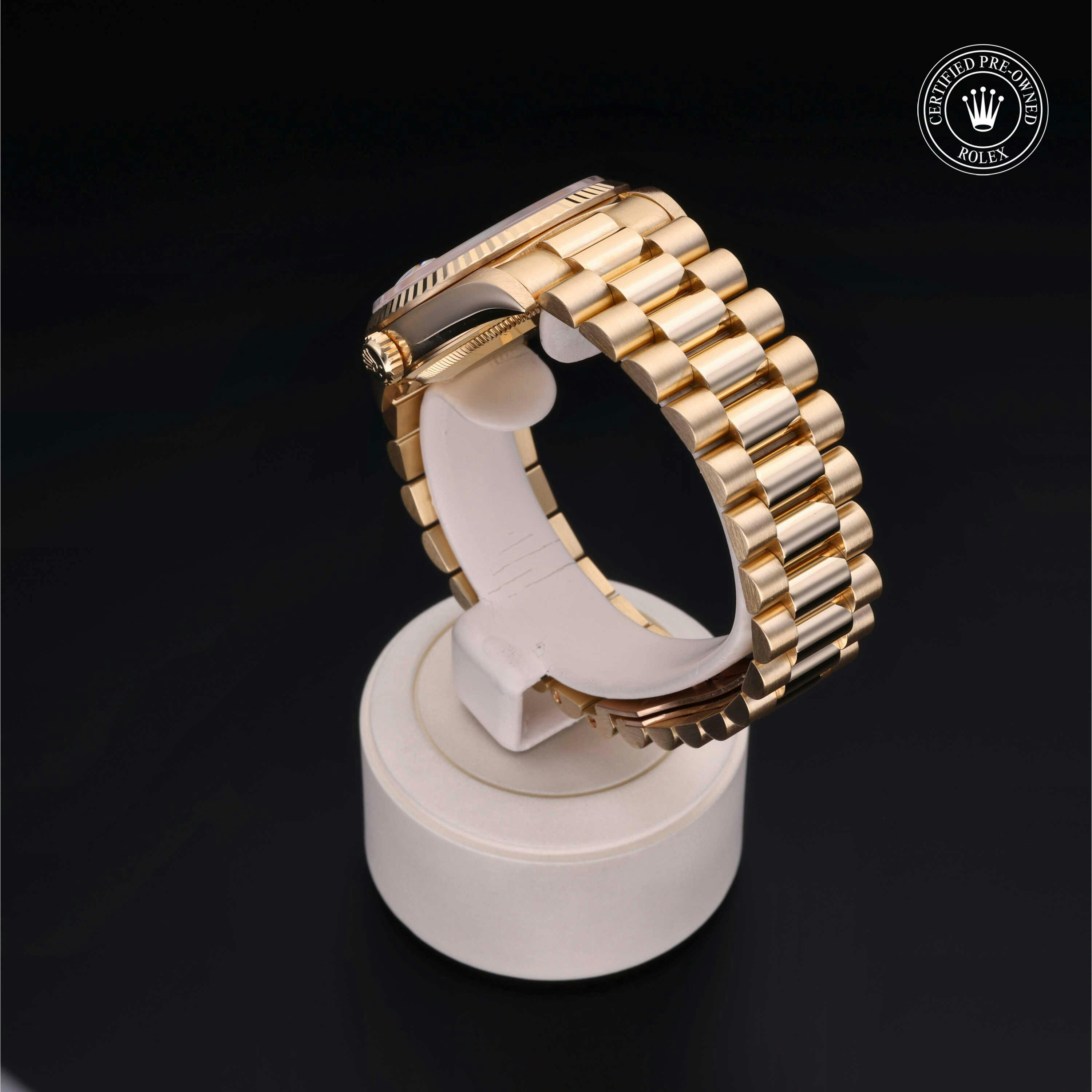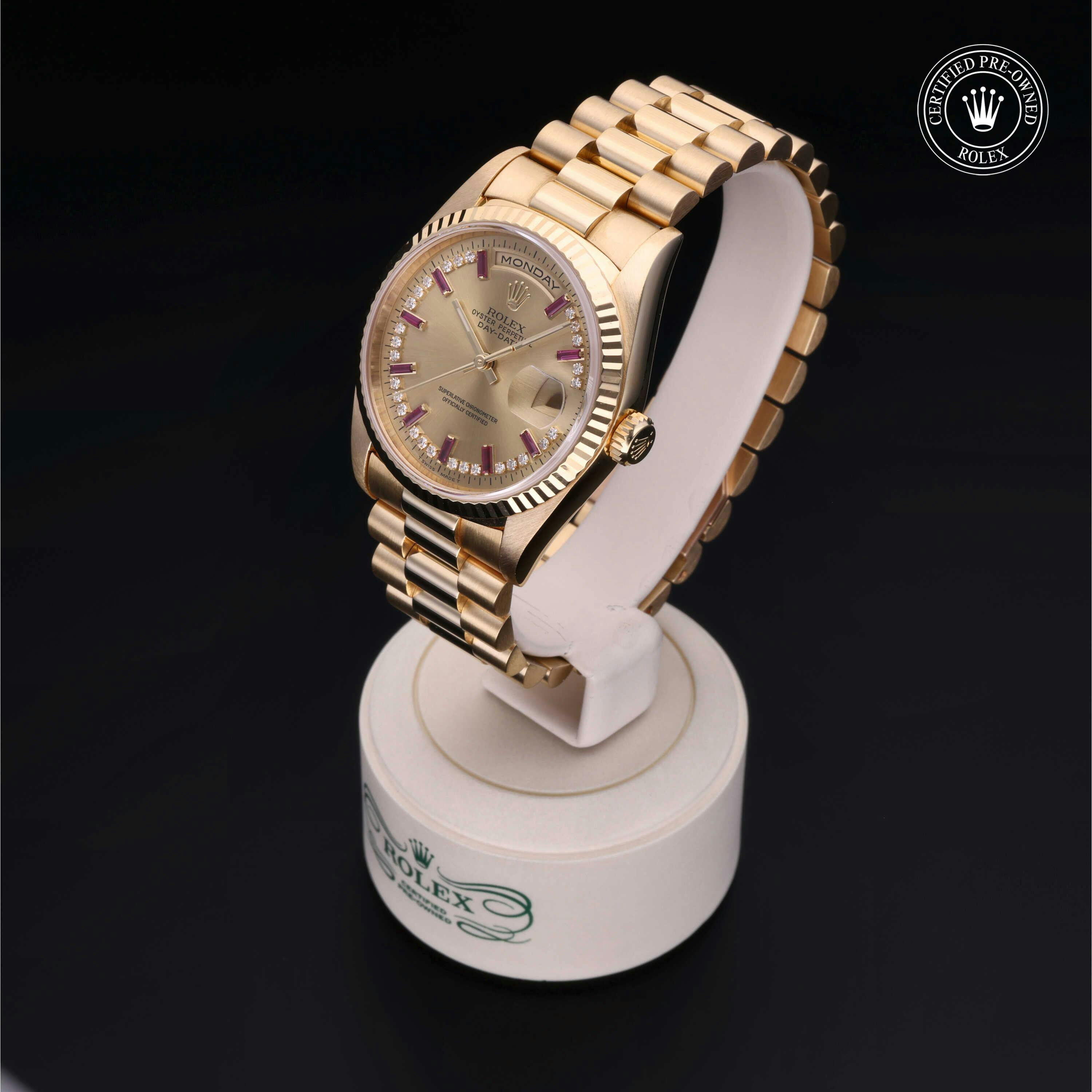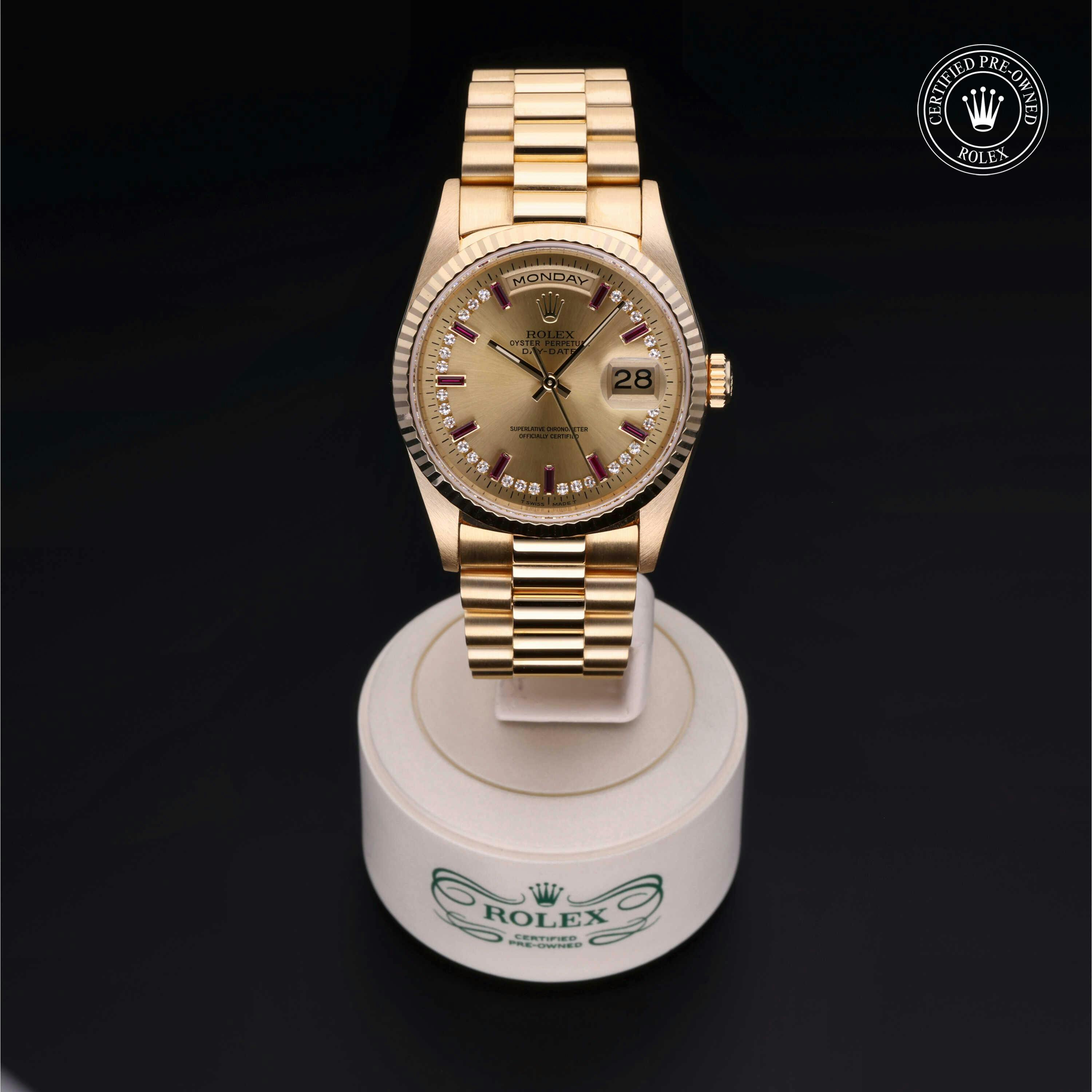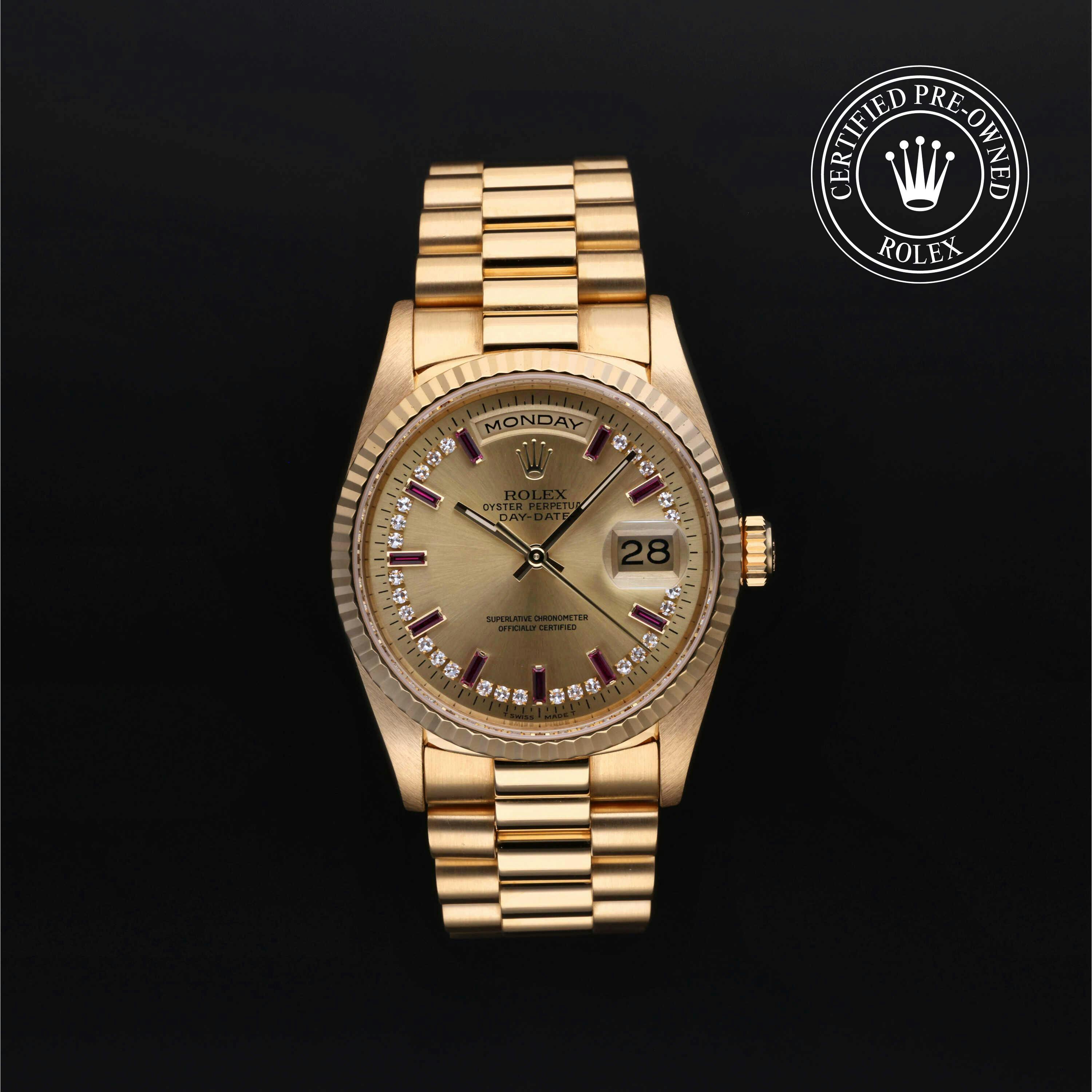 Rolex Certified Pre-Owned Day-Date (18238) features a 36mm 18k yellow gold case and fluted bezel surrounding a champagne diamond and ruby set dial on an 18k yellow gold president bracelet. Functions include hours, minutes, seconds, day and date. This watch has received Rolex-authorized service and certification. It comes with the original papers, and includes a custom Rolex Certified Pre-Owned hang tag, travel pouch and RCPO international warranty card.
