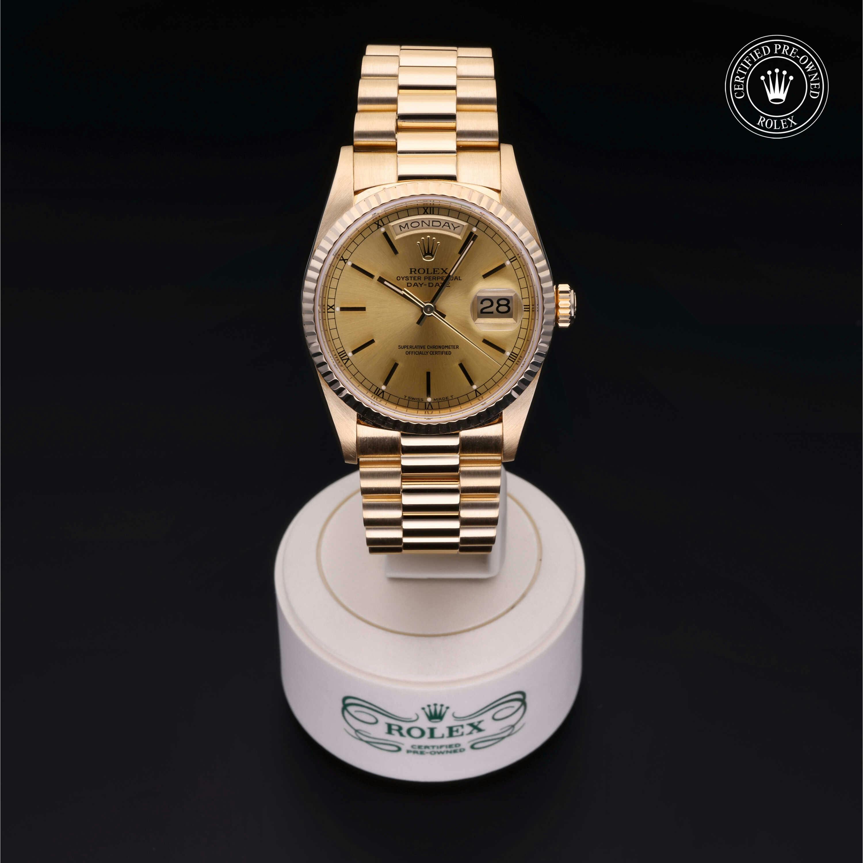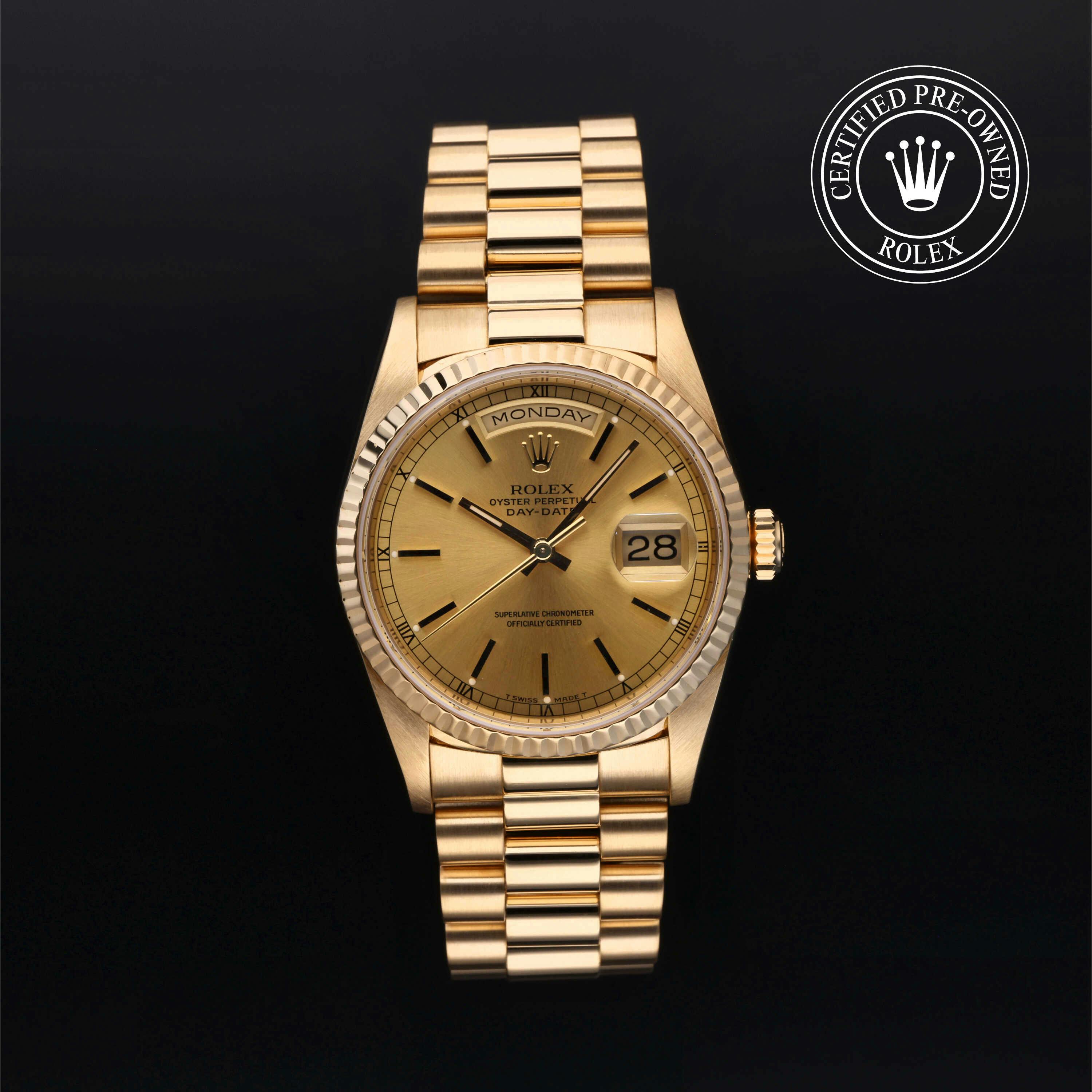 Pre-Owned Rolex Day-Date (18238) self - winding automatic watch, features a 36mm 18k yellow gold case surrounding a champagne dial on a strap. Functions include hours, minutes, seconds, date, day This watch has been serviced and does not come with box or papers. Time remaining on the Manufacturer's service warranty! This watch will be ready to ship in 5-7 days!
