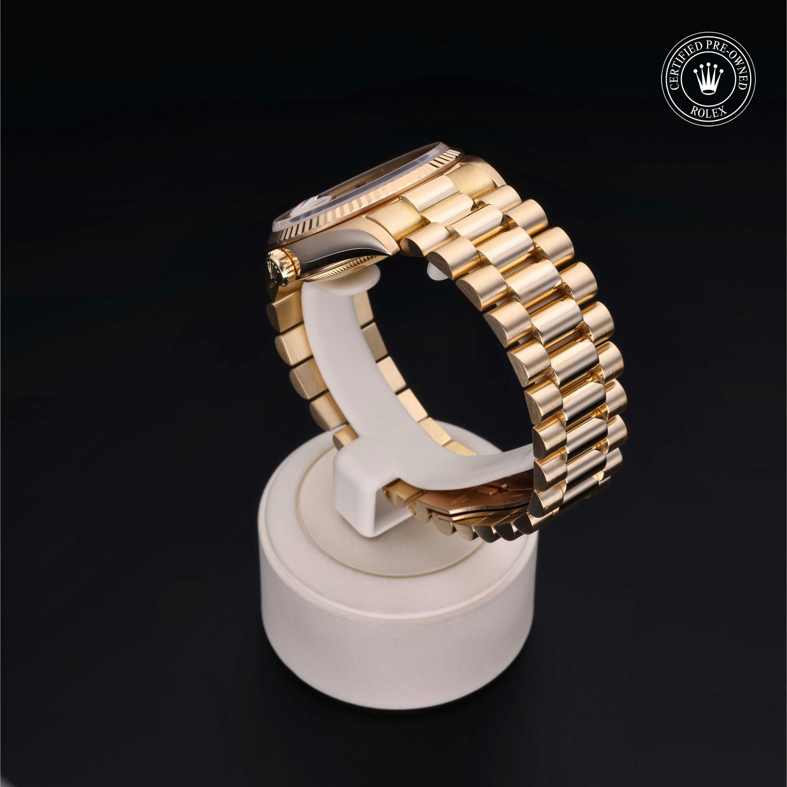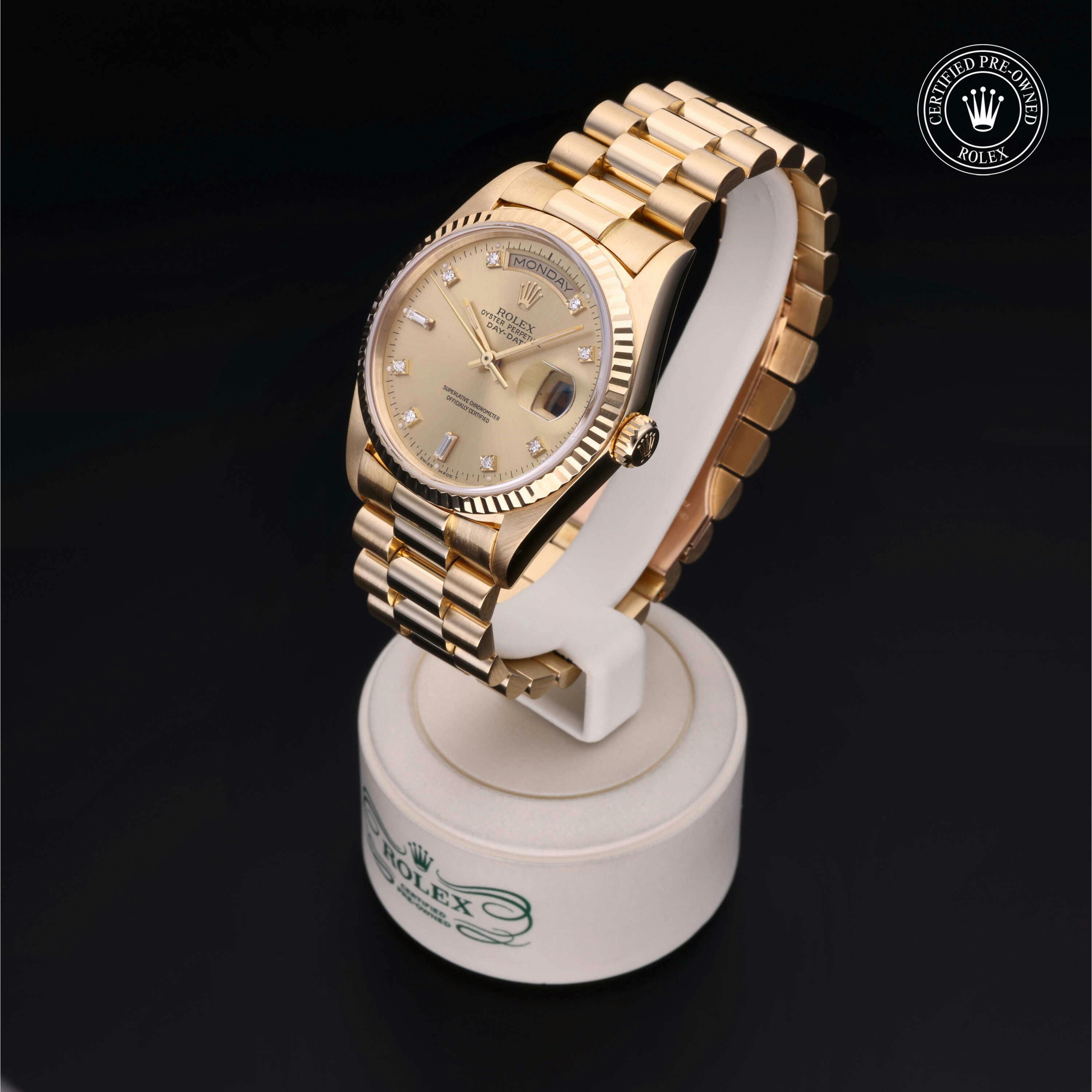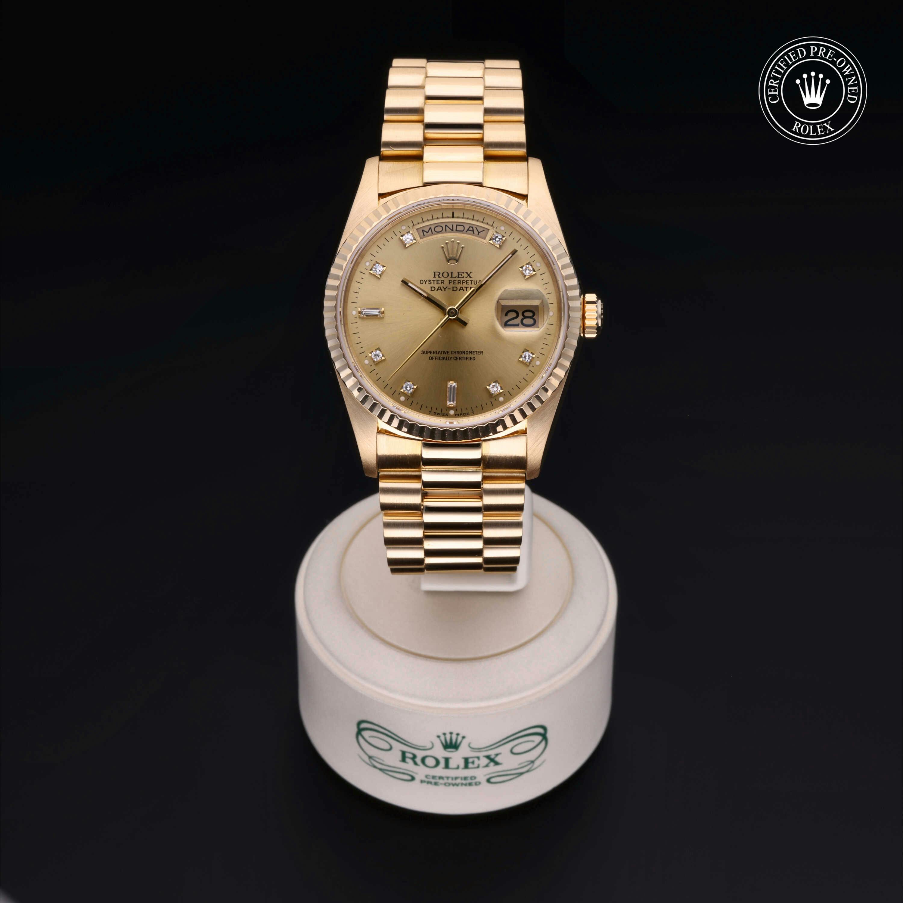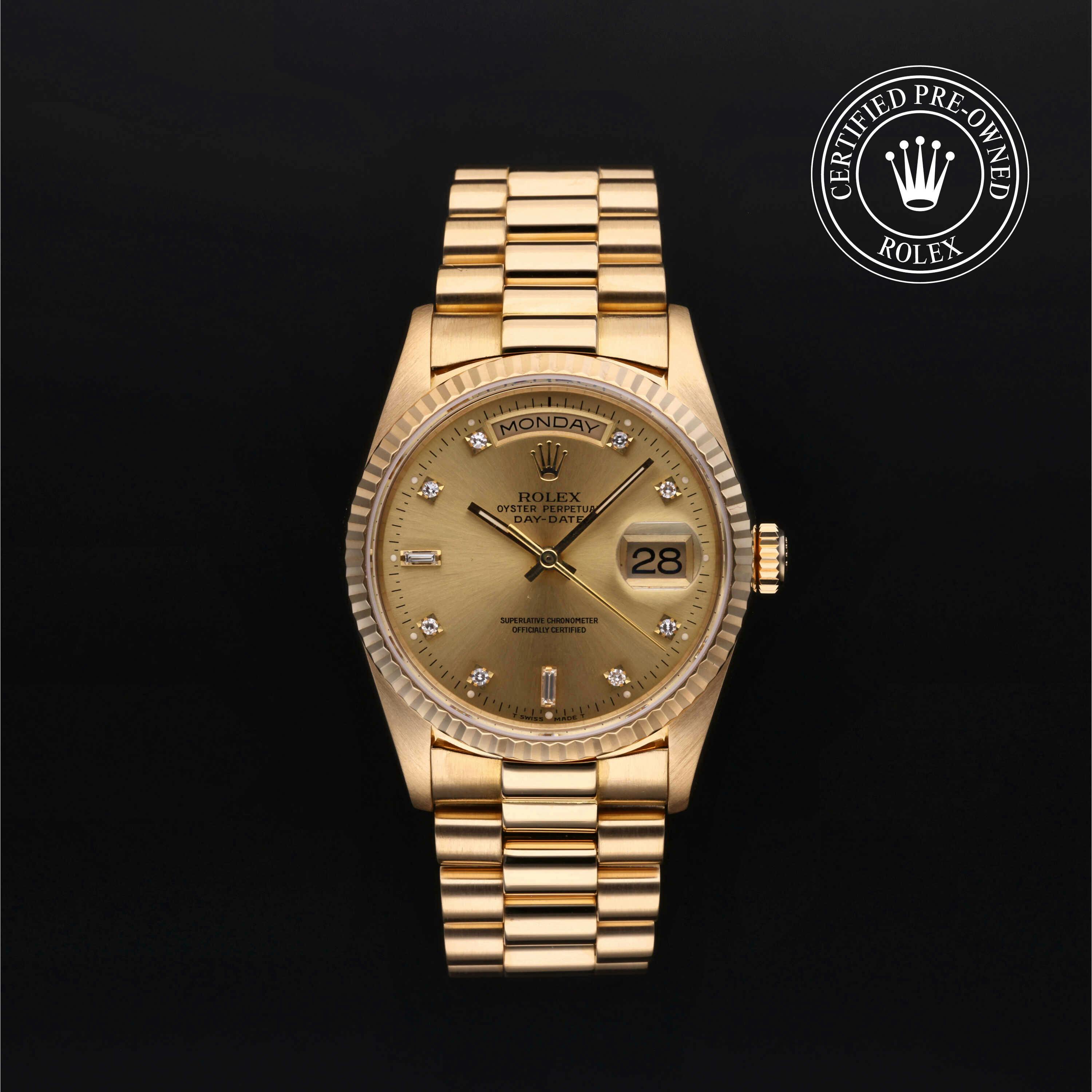 Rolex Certified Pre-Owned Day-Date (18238) self - winding automatic watch, features a 36mm 18k yellow gold case and fluted bezel surrounding a champagne diamond set dial on an 18k yellow gold president bracelet. Functions include hours, minutes, seconds, date and day. This watch has received Rolex-authorized service and certification. It does not come with the original box or papers, but includes a custom Rolex Certified Pre-Owned hang tag, travel pouch and RCPO international warranty card.