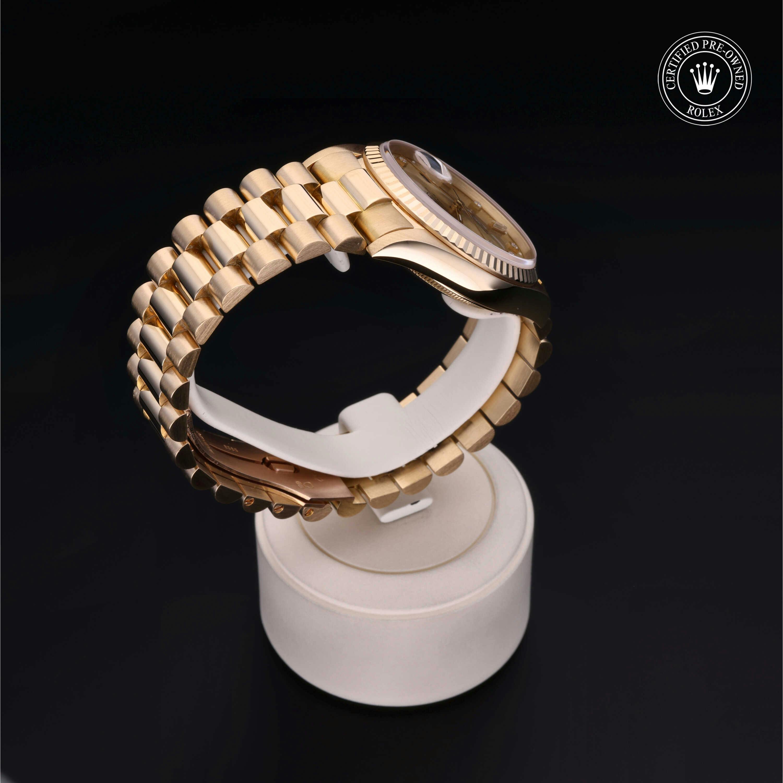 Rolex Certified Pre-Owned Day-Date (18238) self - winding automatic watch, features a 36mm 18k yellow gold case and fluted bezel surrounding a champagne diamond set dial on an 18k yellow gold president bracelet. Functions include hours, minutes, seconds, date and day. This watch has received Rolex-authorized service and certification. It does not come with the original box or papers, but includes a custom Rolex Certified Pre-Owned hang tag, travel pouch and RCPO international warranty card.