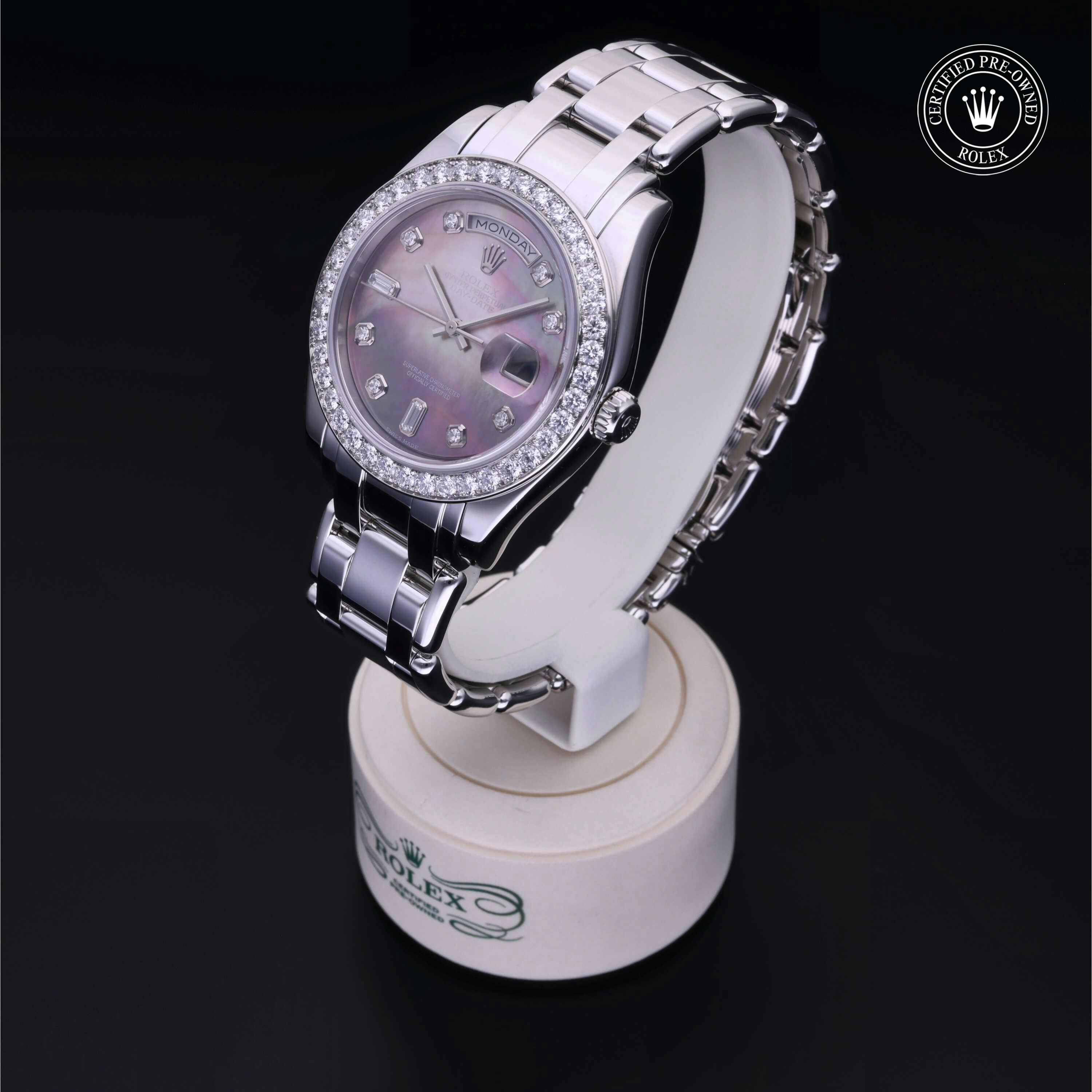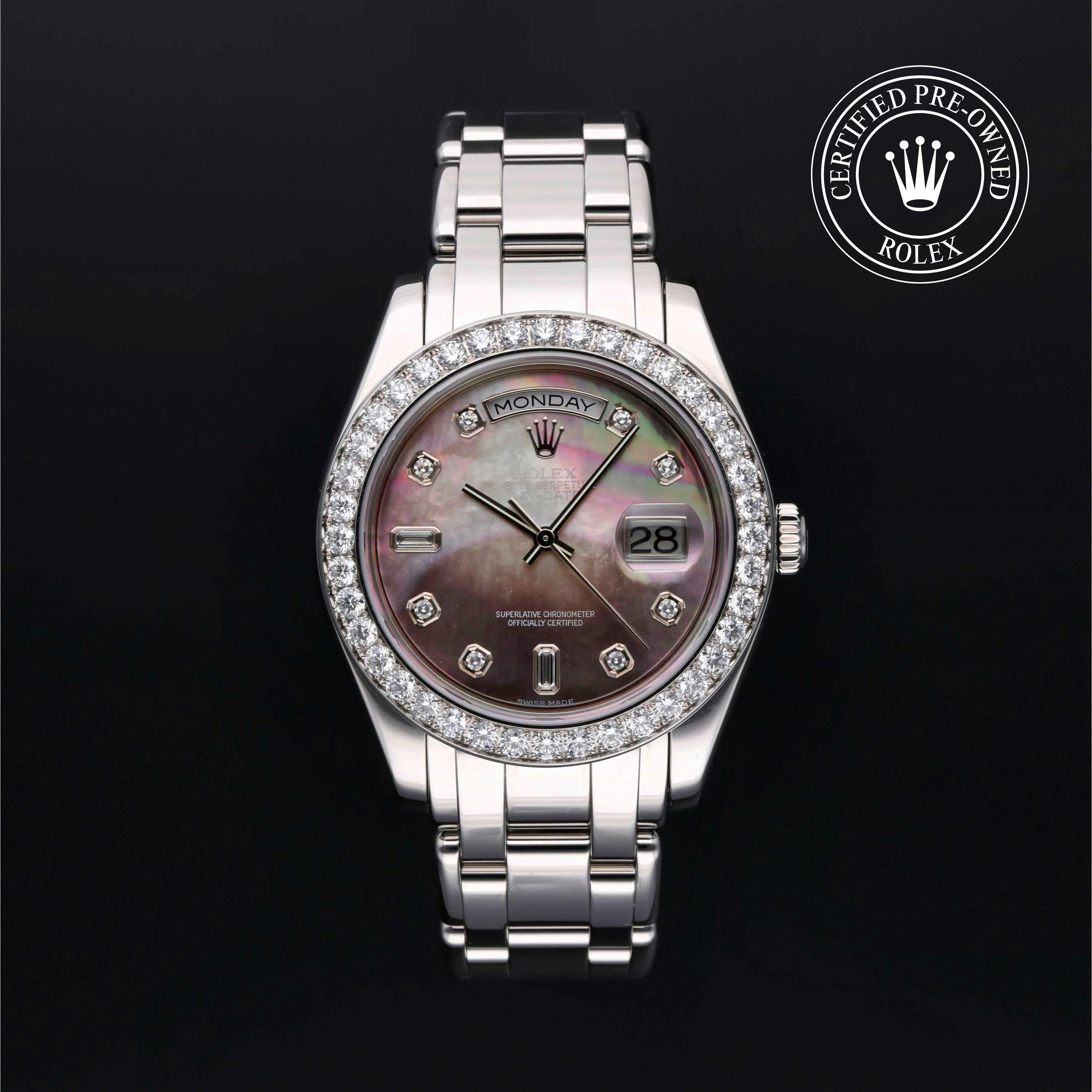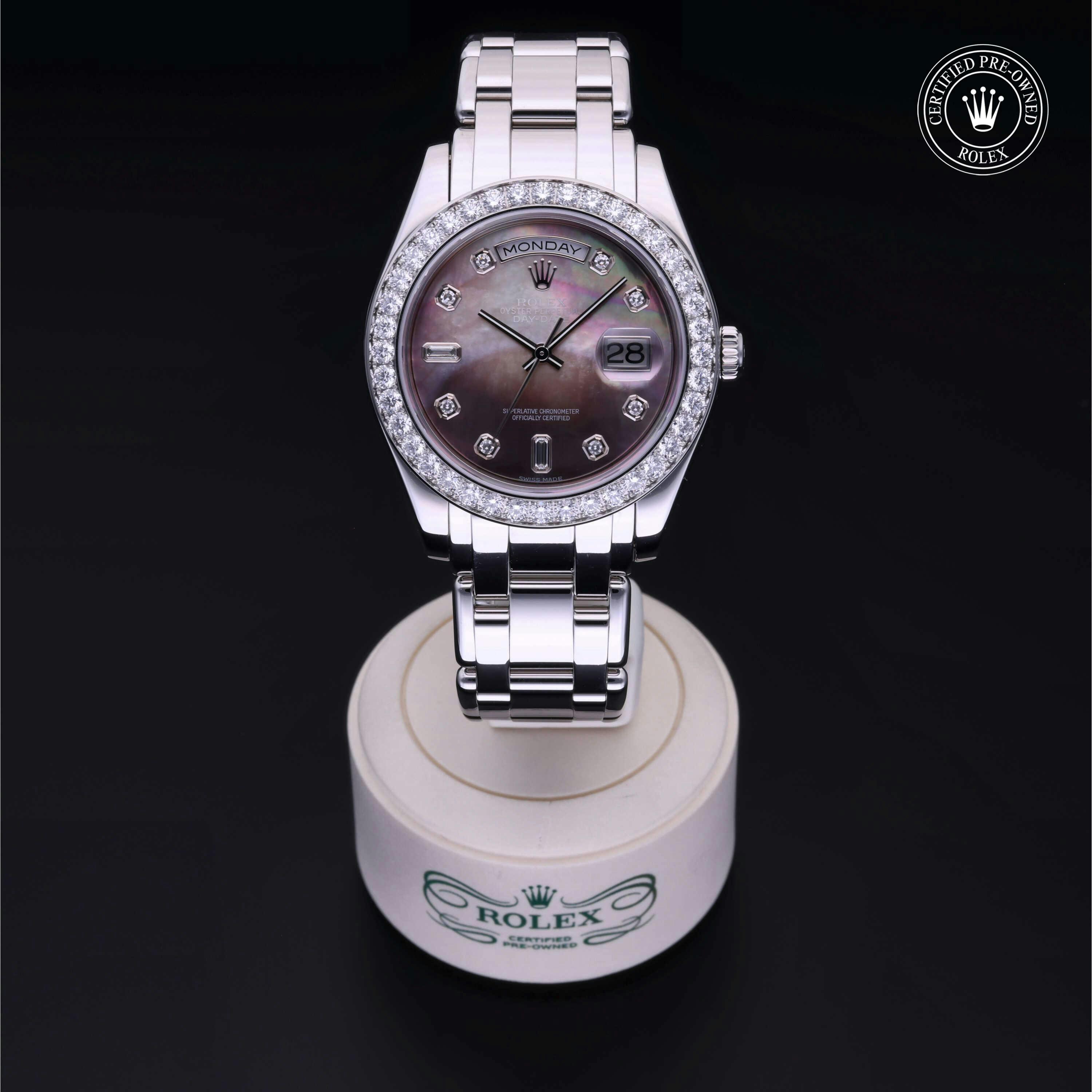 Rolex Certified Pre-Owned Day-Date (18946) self - winding automatic watch, features a 39mm platinum case and diamond set bezel surrounding a black, mother of pearl diamond set dial on a platinum pearlmaster bracelet. Functions include hours, minutes, seconds, date and day. This watch has received Rolex-authorized service and certification. It comes with the original box and papers, and includes a custom Rolex Certified Pre-Owned hang tag, travel pouch and RCPO international warranty card.
