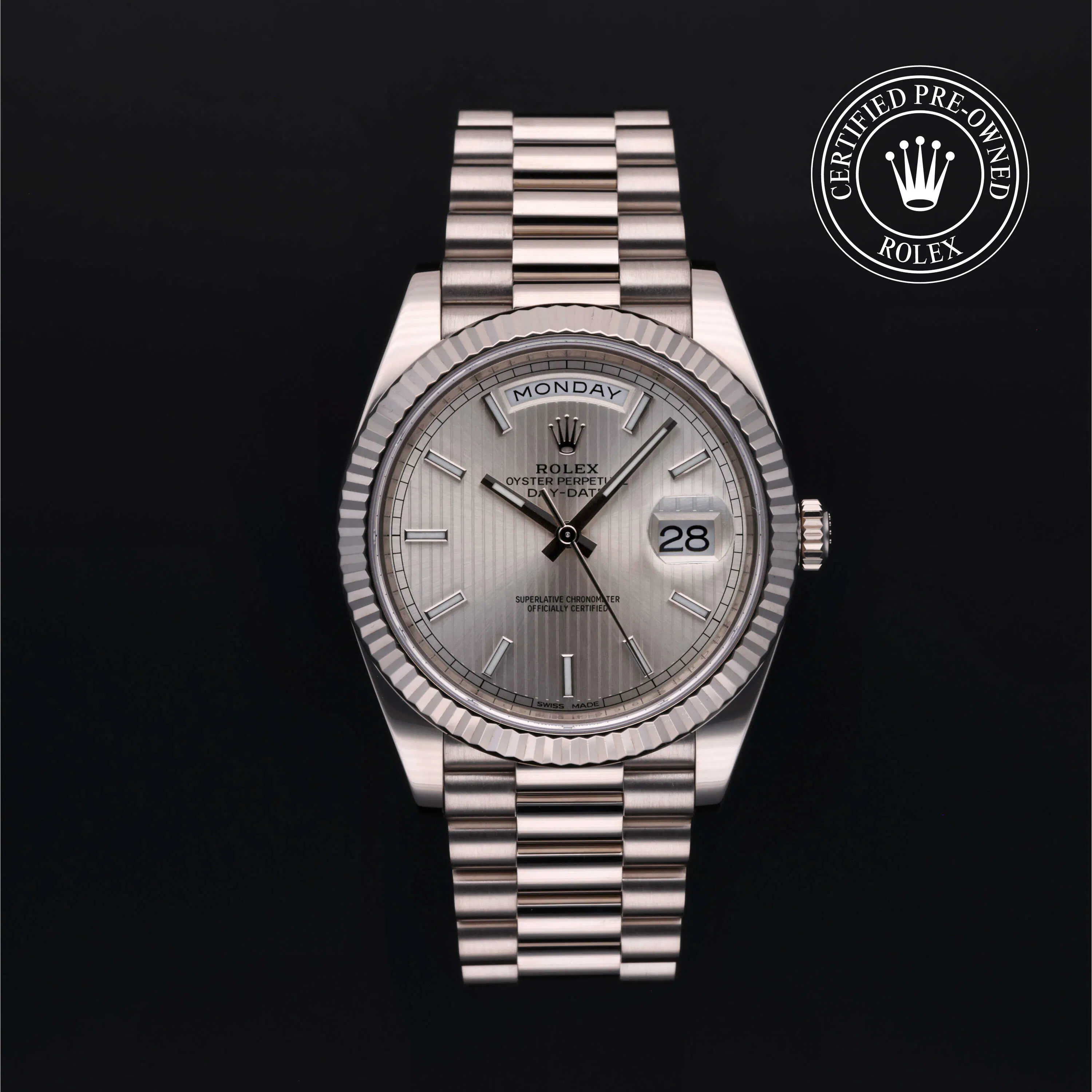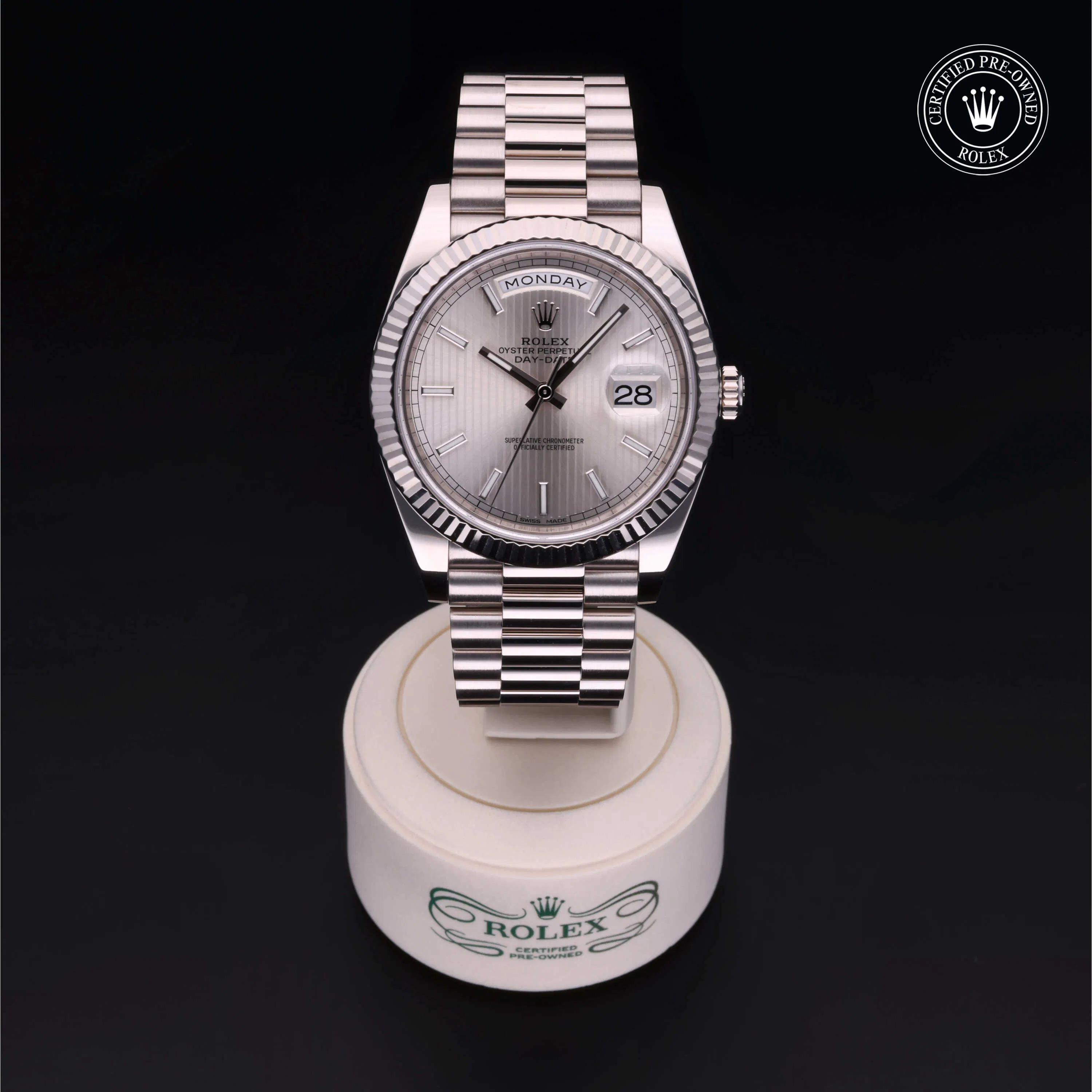 Pre-Owned Rolex Day-Date (228239) self - winding automatic watch, features a 40mm 18k white gold case surrounding a silver dial on a strap. Functions include hours, minutes, seconds This watch has been serviced and comes complete with the original box and papers. Time remaining on the Manufacturer's service warranty! This watch will be ready to ship in 5-7 days!