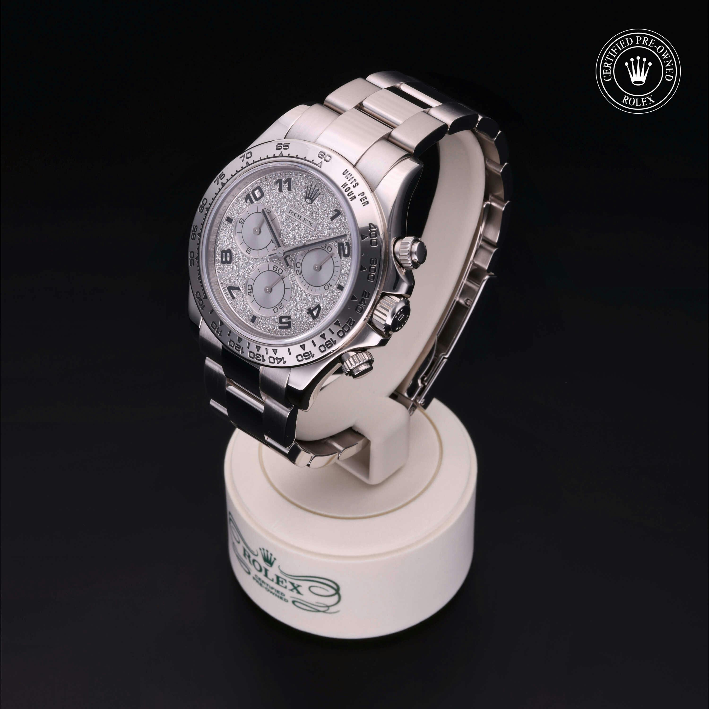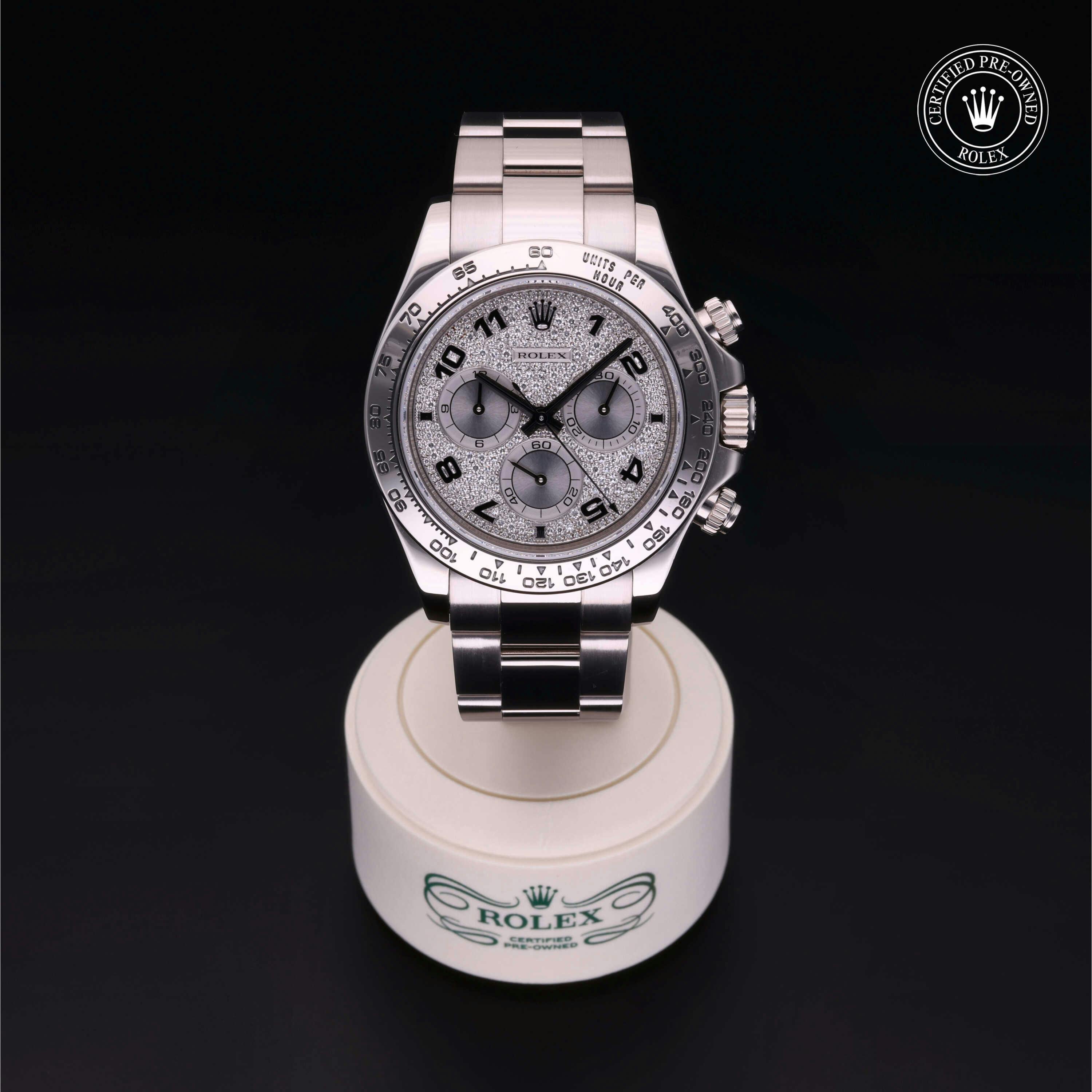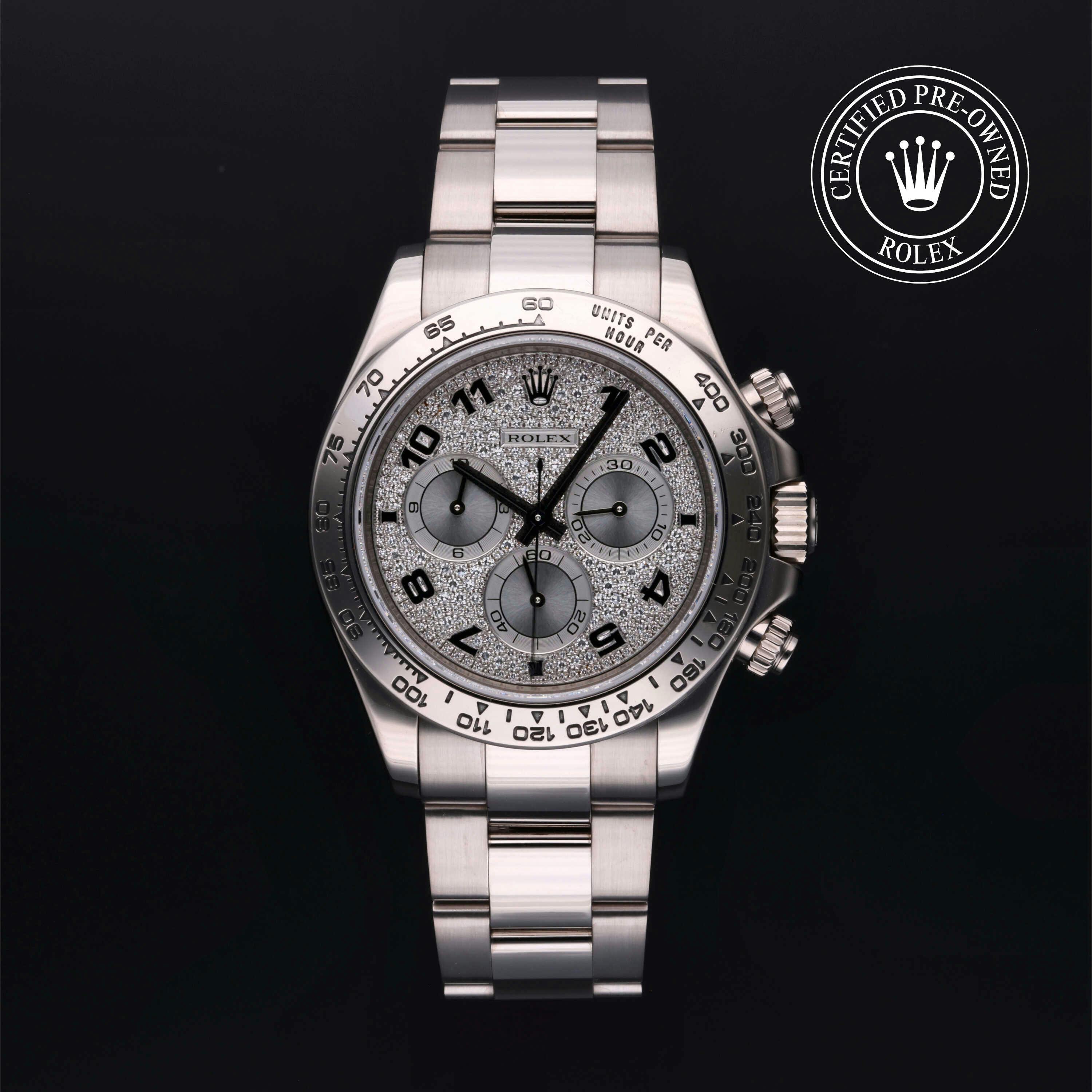 This Rolex Certified Pre-Owned Cosmograph Daytona (116509) features a 40mm 18k white gold case surrounding a full pavé diamond dial. Fitted with an 18k white gold Oyster bracelet with folding clasp. Powered by a self-winding automatic movement, it offers hours, minutes, seconds and chronograph functions. The watch includes a sapphire crystal and water resistance to 100m. This watch has been serviced and comes with papers. It also includes a custom Rolex Certified Pre-Owned hang tag, travel pouch and international warranty card.