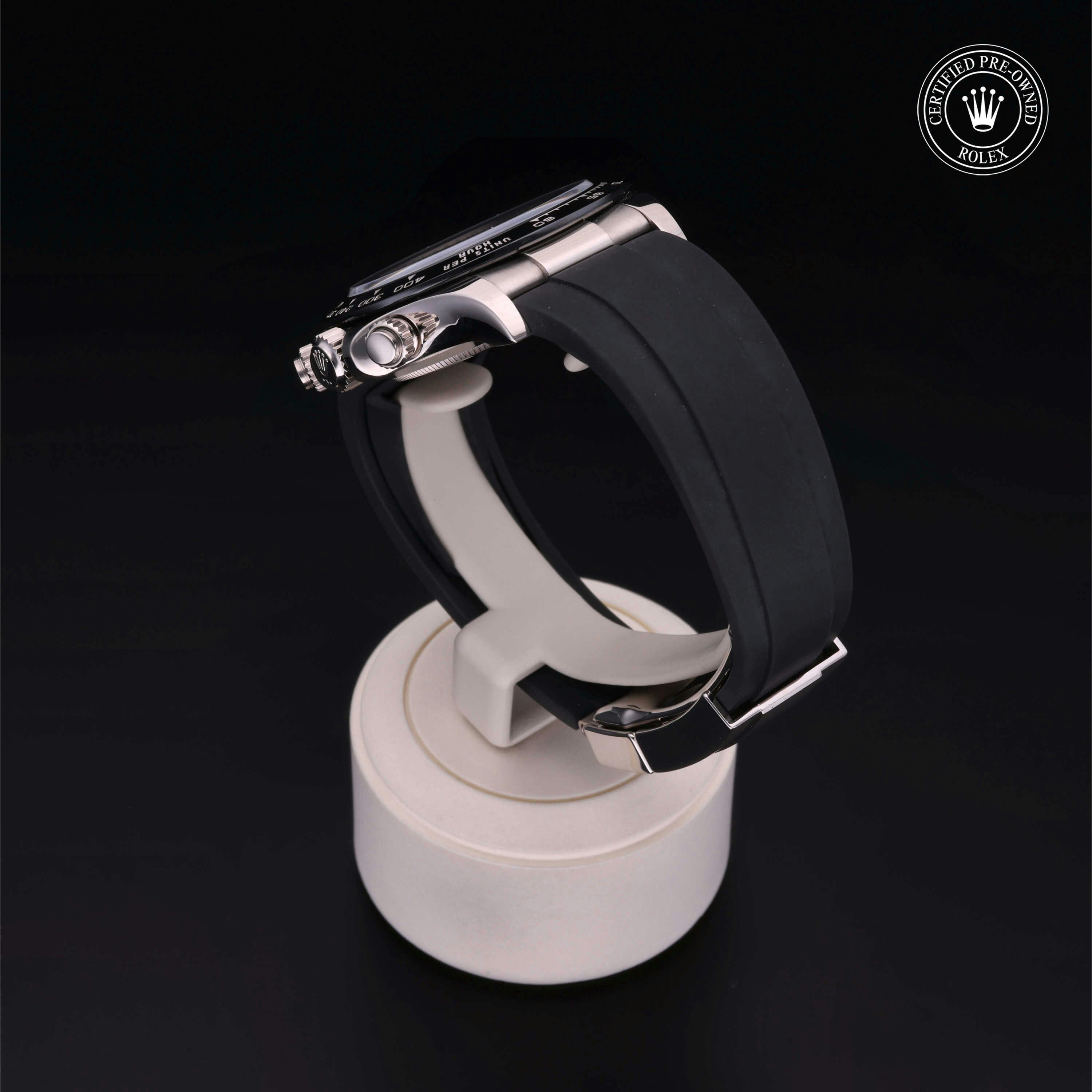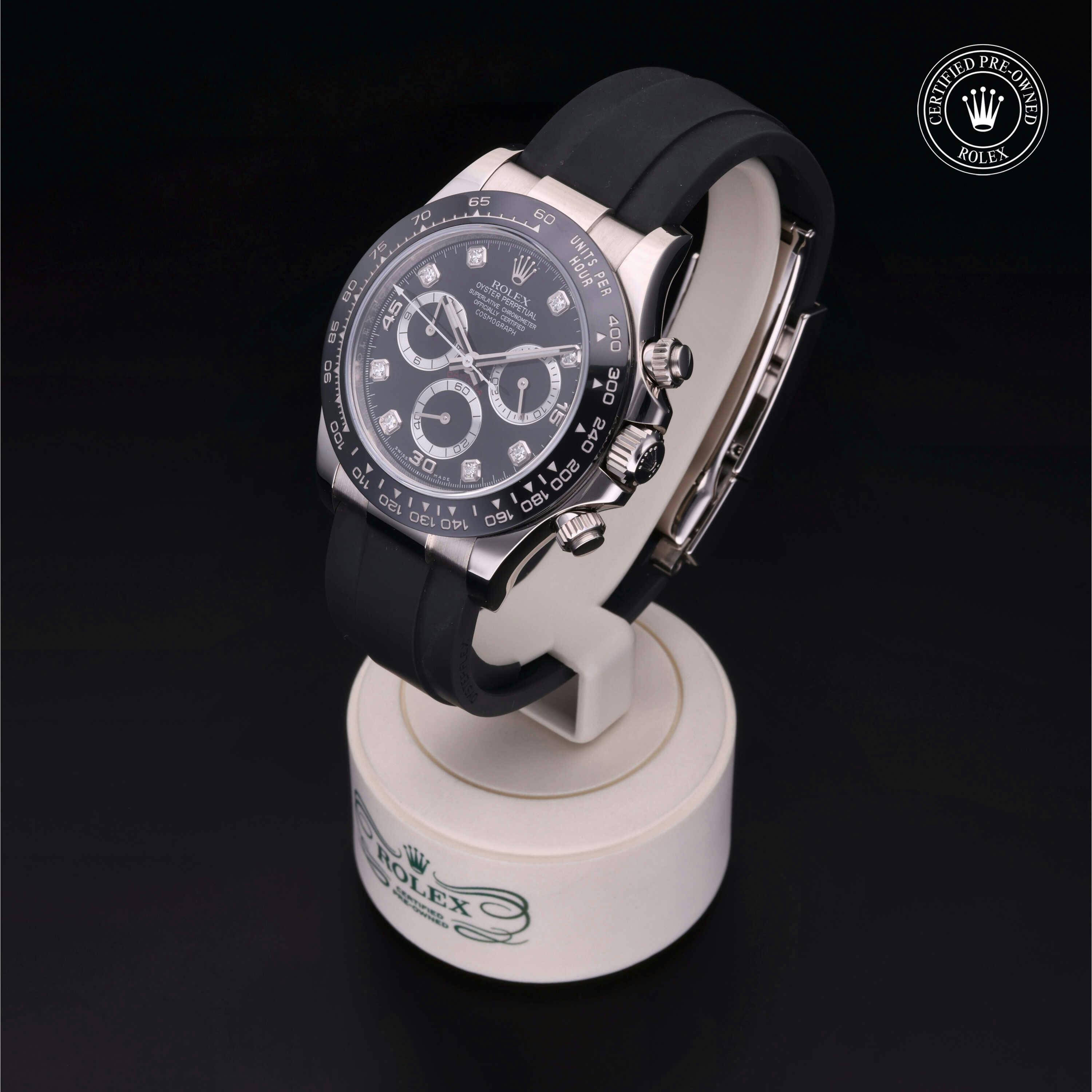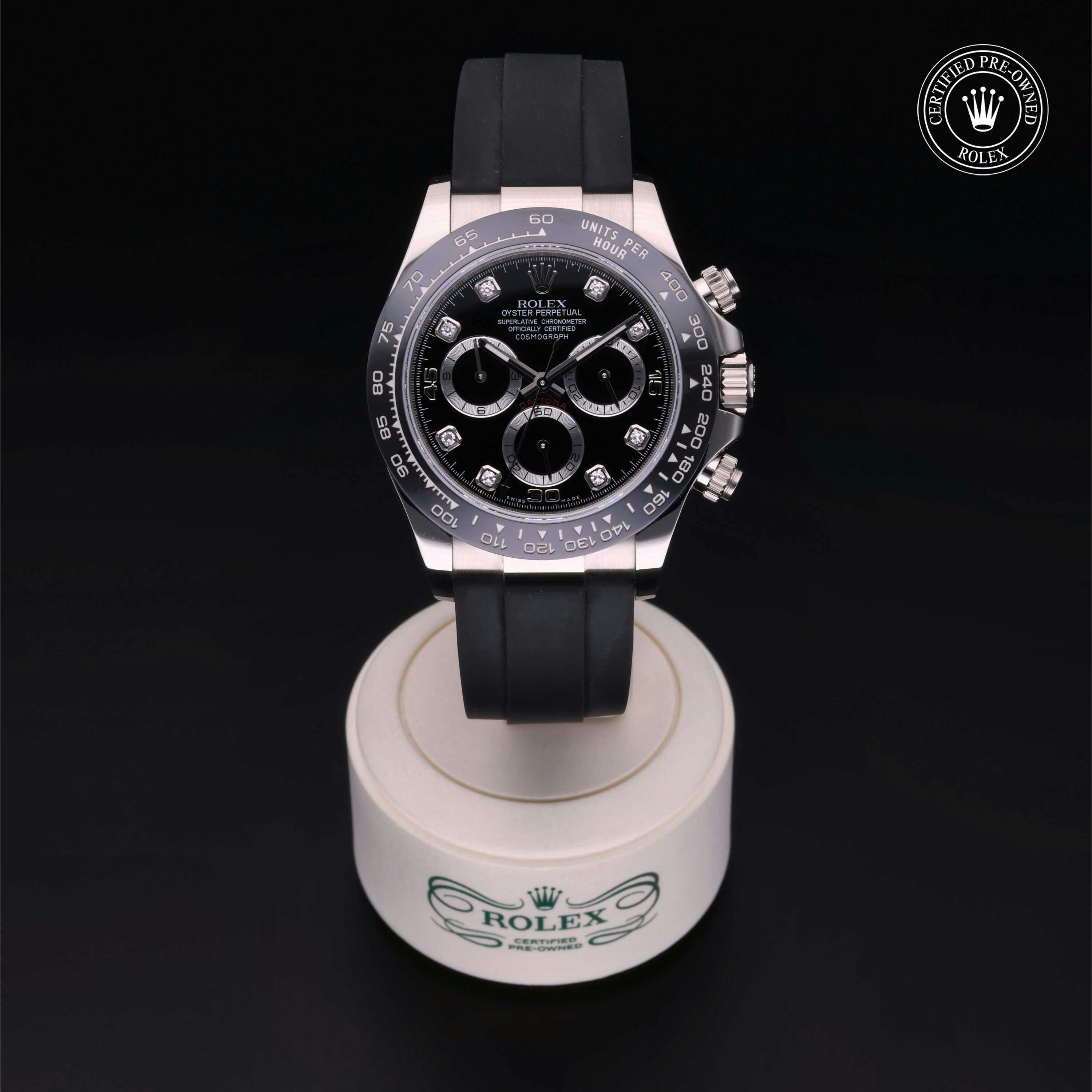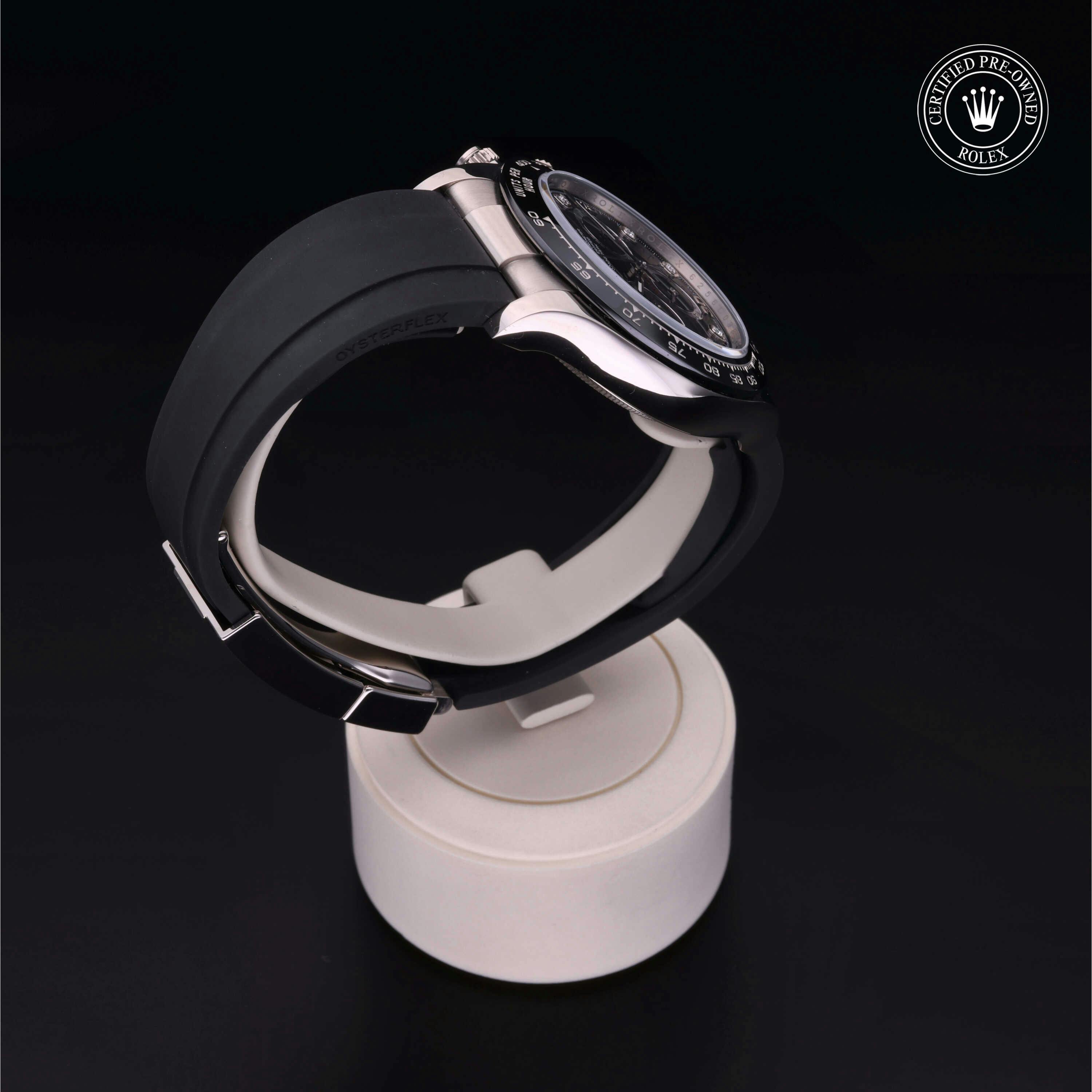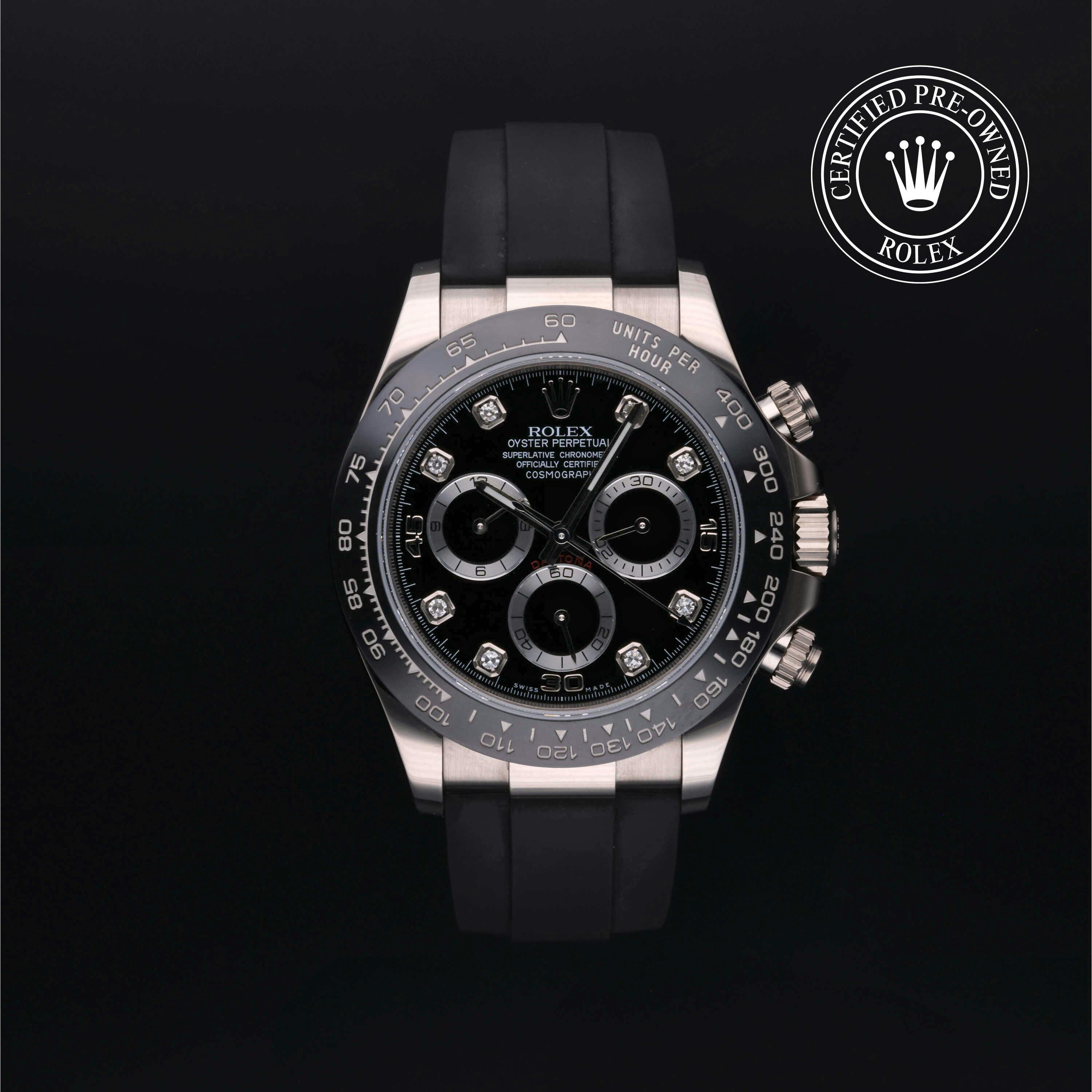 Rolex Certified Pre-Owned Cosmograph Daytona (116519LN) self - winding automatic watch, features a 40mm 18k white gold case with a black cerachrom tachymetric scale bezel surrounding a black diamond set dial on a black oysterflex strap with an 18k white gold deployant buckle. Functions include hours, minutes, seconds and chronograph. This watch has received Rolex-authorized service and certification. It does not come with the original box or papers, but includes a custom Rolex Certified Pre-Owned hang tag, travel pouch and RCPO international warranty card.