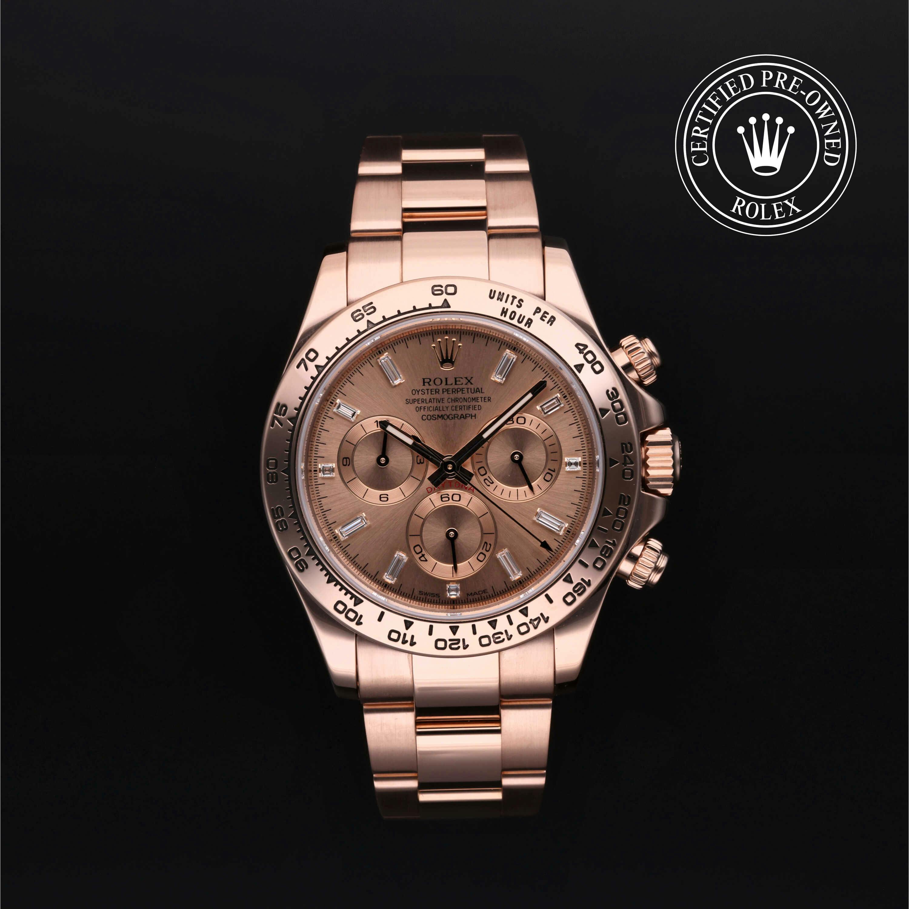 Rolex Certified Pre-Owned Cosmograph Daytona (116505) self - winding automatic watch, features a 40mm 18k rose gold case with and tachymetric scale bezel surrounding a rose baguette diamond set dial on an 18k rose gold oyster bracelet. Functions include hours, minutes, seconds and chronograph. This watch has received Rolex-authorized service and certification. It comes with the original papers, and includes a custom Rolex Certified Pre-Owned hang tag, travel pouch and RCPO international warranty card.