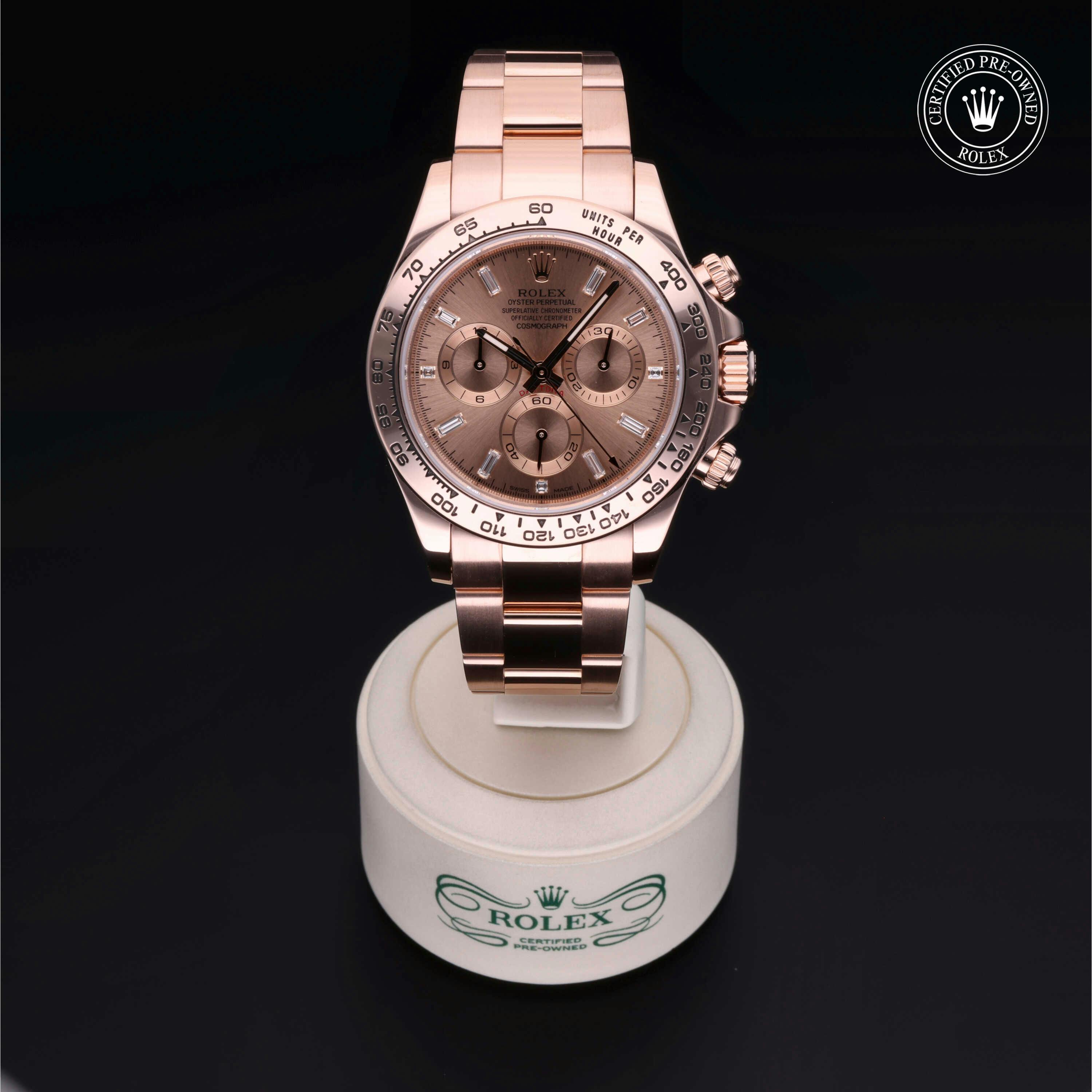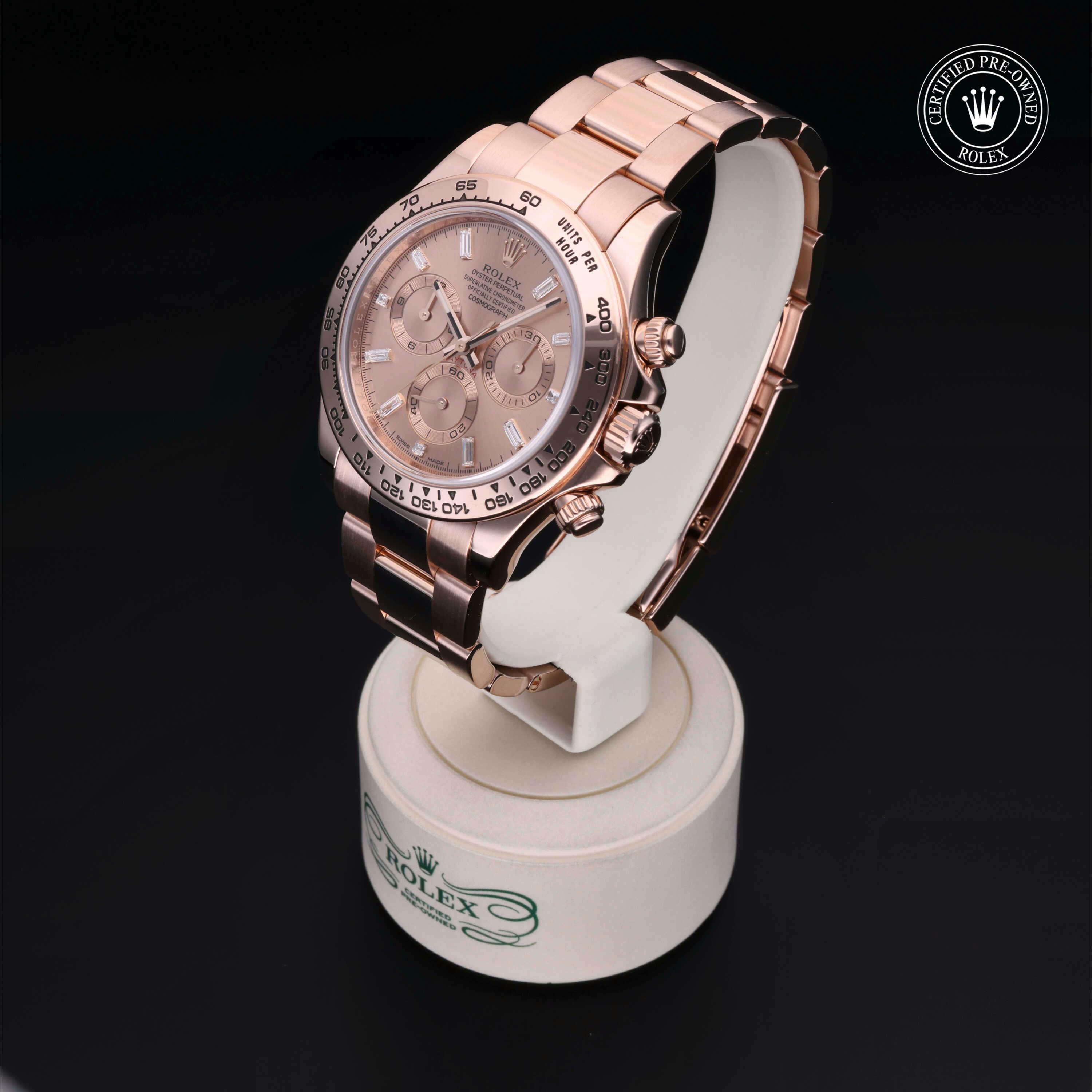 Rolex Certified Pre-Owned Cosmograph Daytona (116505) self - winding automatic watch, features a 40mm 18k rose gold case with and tachymetric scale bezel surrounding a rose baguette diamond set dial on an 18k rose gold oyster bracelet. Functions include hours, minutes, seconds and chronograph. This watch has received Rolex-authorized service and certification. It comes with the original papers, and includes a custom Rolex Certified Pre-Owned hang tag, travel pouch and RCPO international warranty card.