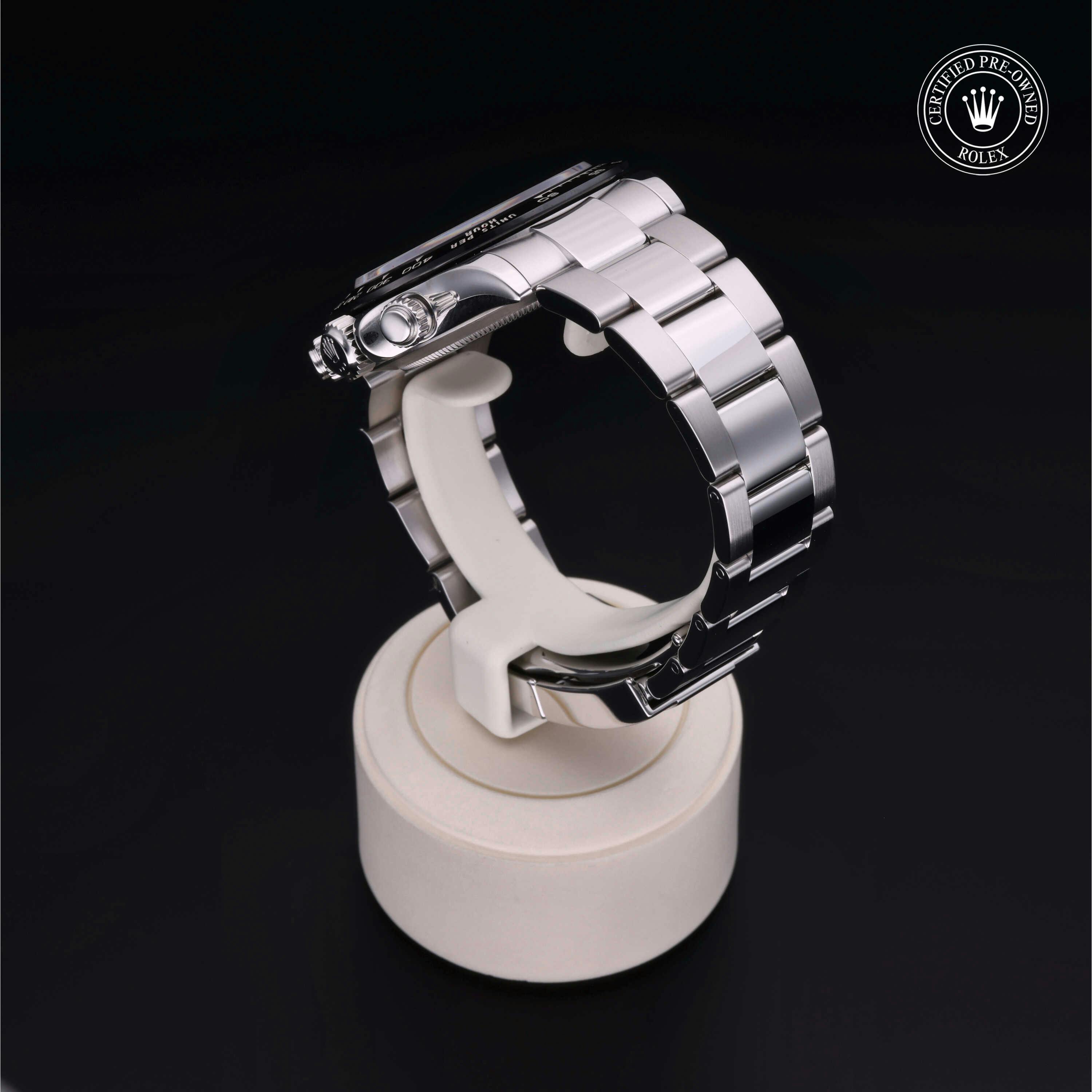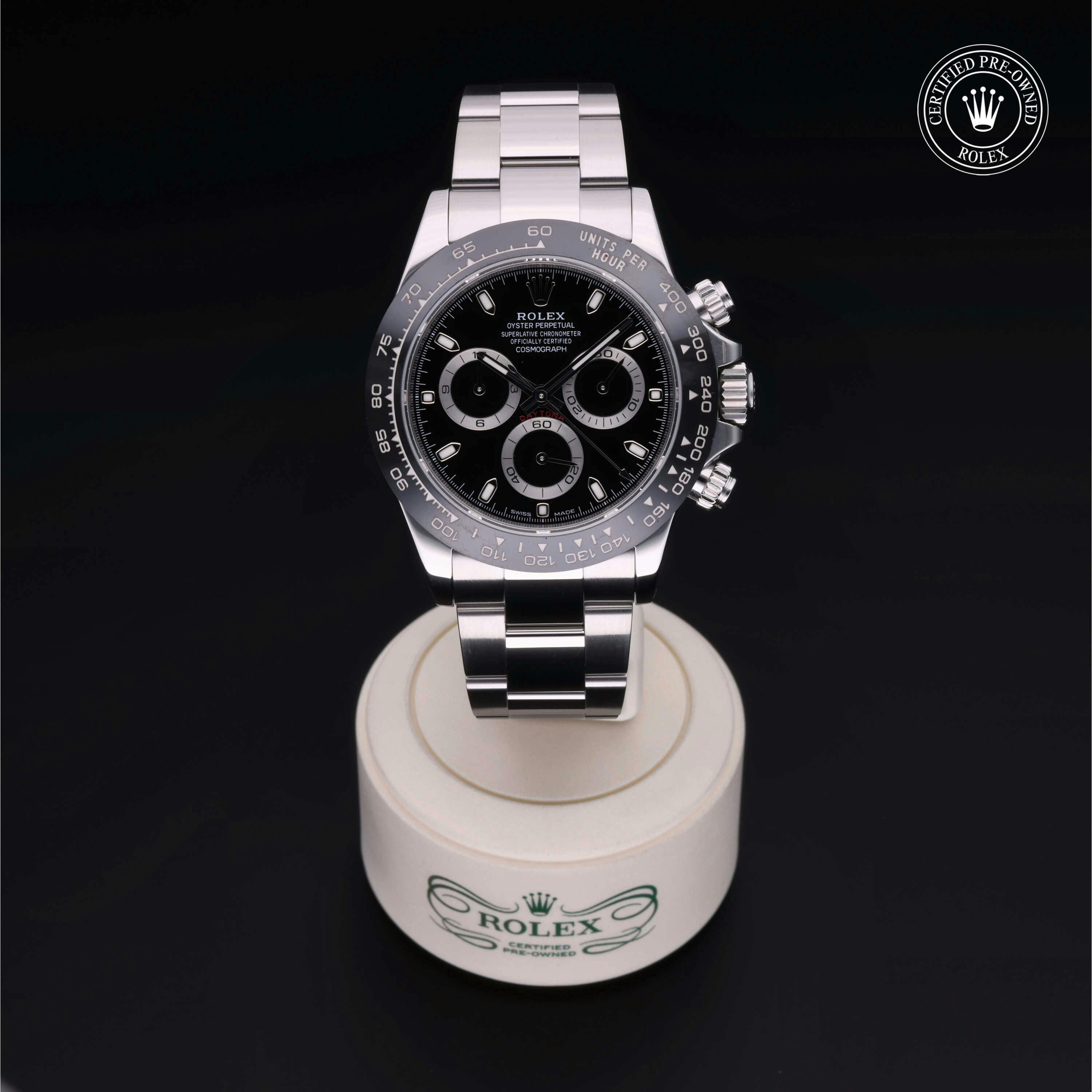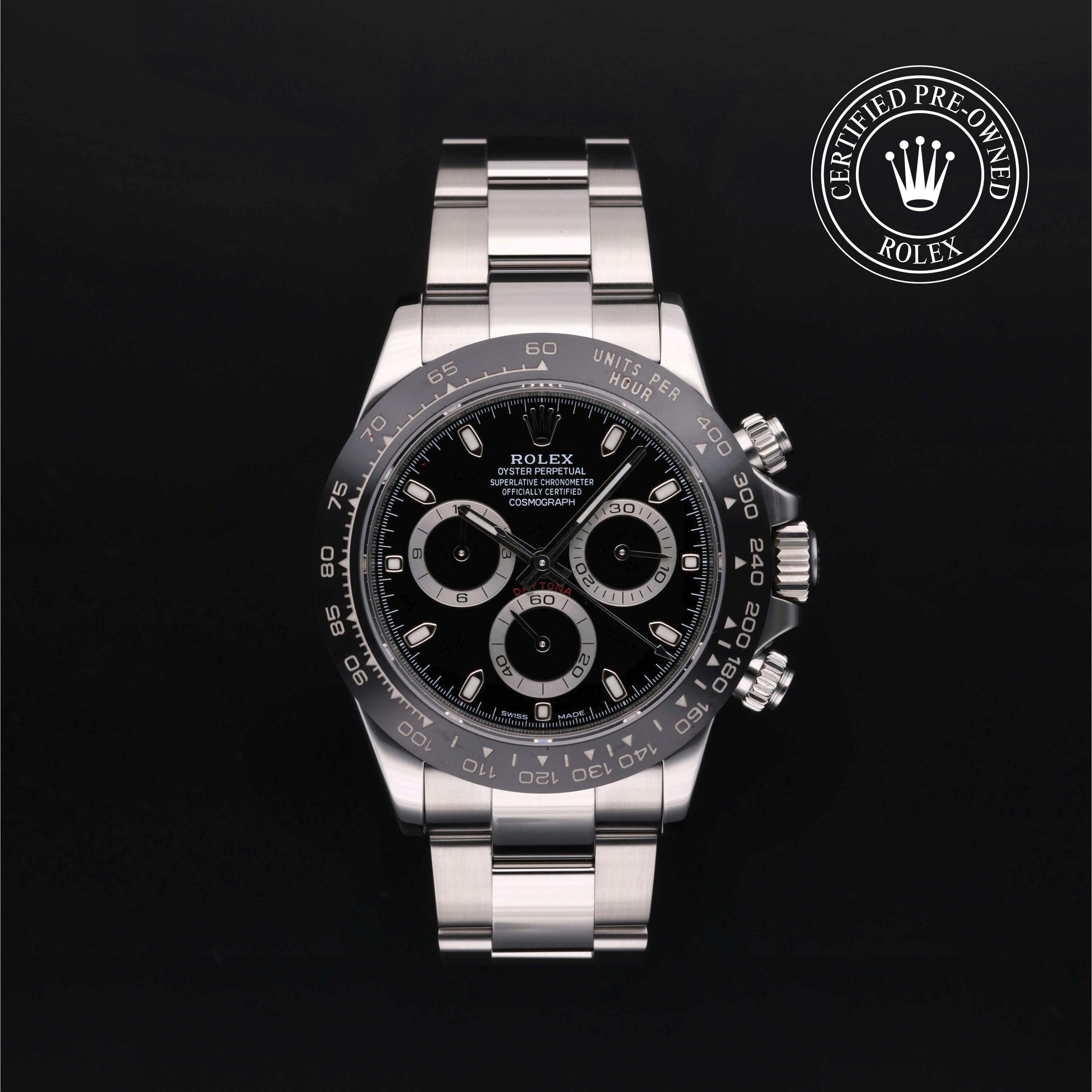 Rolex Certified Pre-Owned Cosmograph Daytona (116500LN) self - winding automatic watch, features a 40mm stainless steel case with a black cerachrom tachymetric scale bezel surrounding a black dial on a stainless steel oyster bracelet. Functions include hours, minutes, seconds and chronograph. This watch has received Rolex-authorized service and is certified by Rolex. It comes with the original box and papers, and includes a custom Rolex Certified Pre-Owned hang tag, travel pouch and international warranty card.
