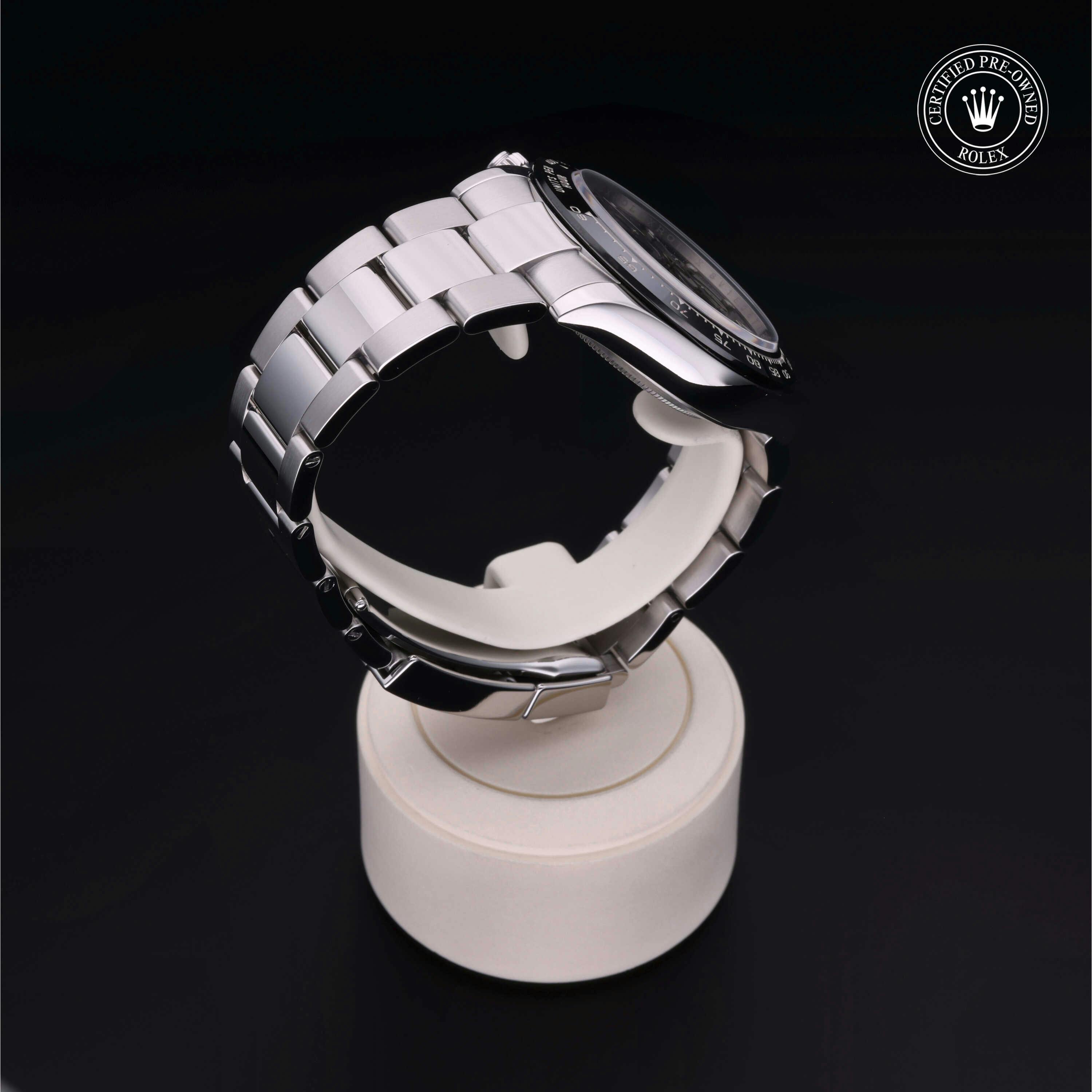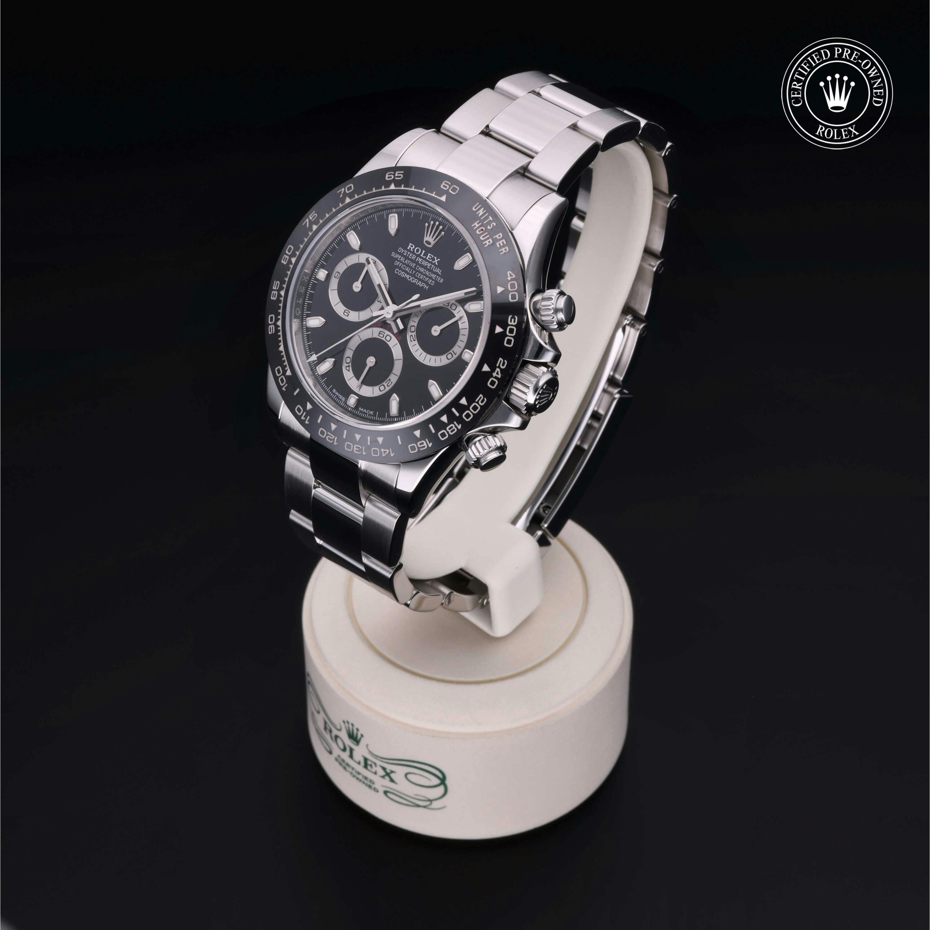 Rolex Certified Pre-Owned Cosmograph Daytona (116500LN) self - winding automatic watch, features a 40mm stainless steel case with a black cerachrom tachymetric scale bezel surrounding a black dial on a stainless steel oyster bracelet. Functions include hours, minutes, seconds and chronograph. This watch has received Rolex-authorized service and is certified by Rolex. It comes with the original box and papers, and includes a custom Rolex Certified Pre-Owned hang tag, travel pouch and international warranty card.