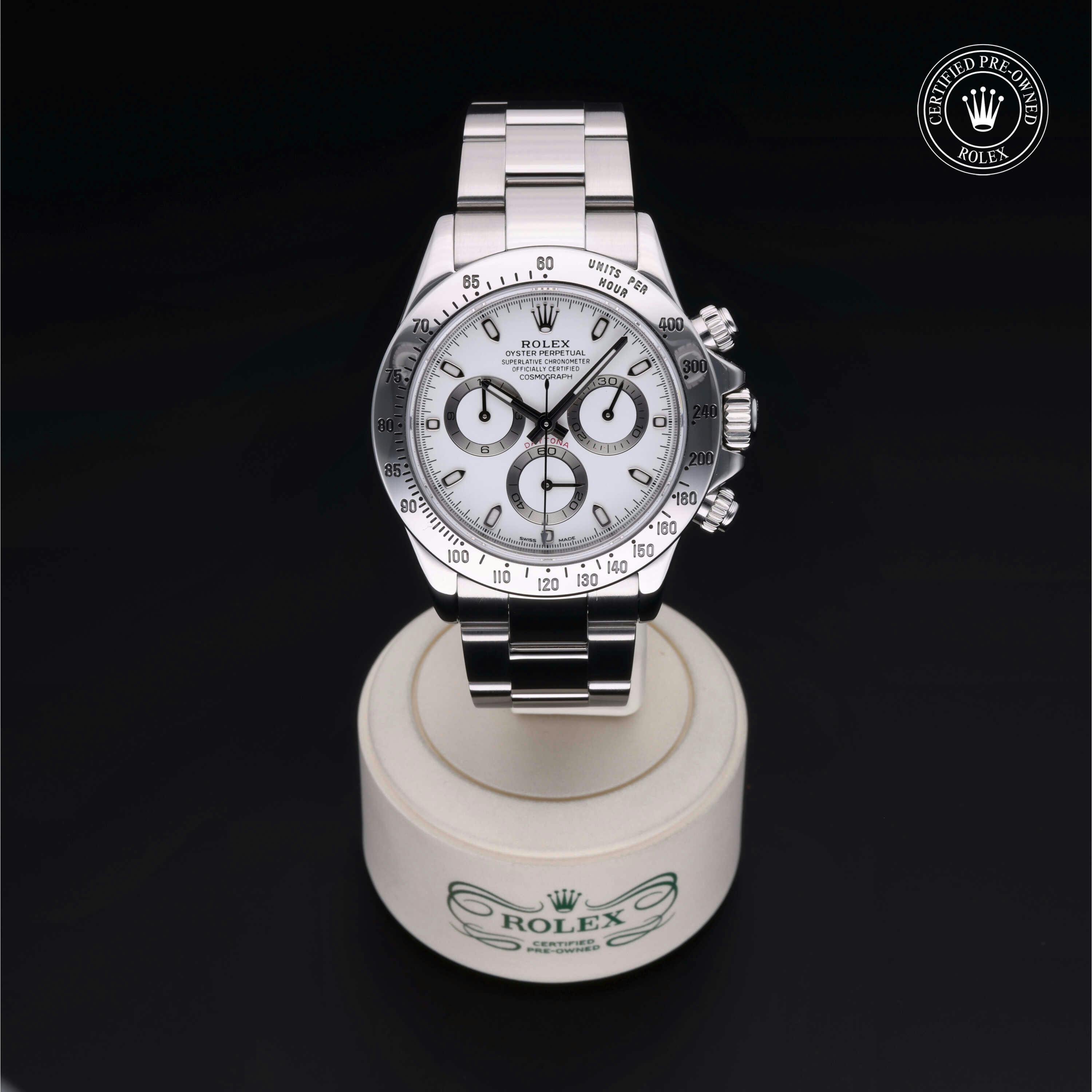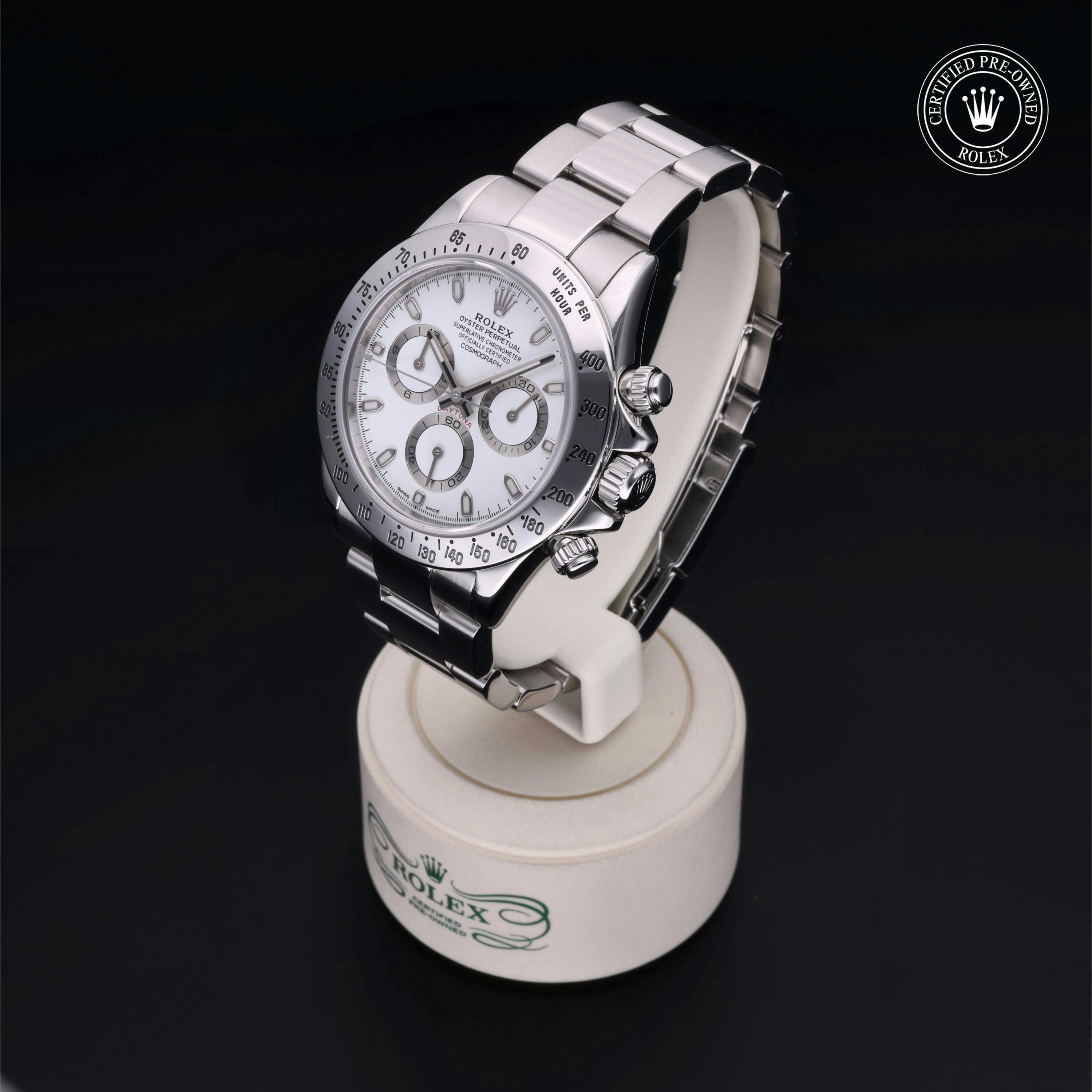 Rolex Certified Pre-Owned Cosmograph Daytona (116520) self - winding automatic watch, features a 40mm stainless steel case and tachymetric scale bezel surrounding a white dial on a stainless steel oyster bracelet. Functions include hours, minutes, seconds and chronograph. This watch has received Rolex-authorized service and certification. It comes with the original box, and includes a custom Rolex Certified Pre-Owned hang tag, travel pouch and RCPO international warranty card.