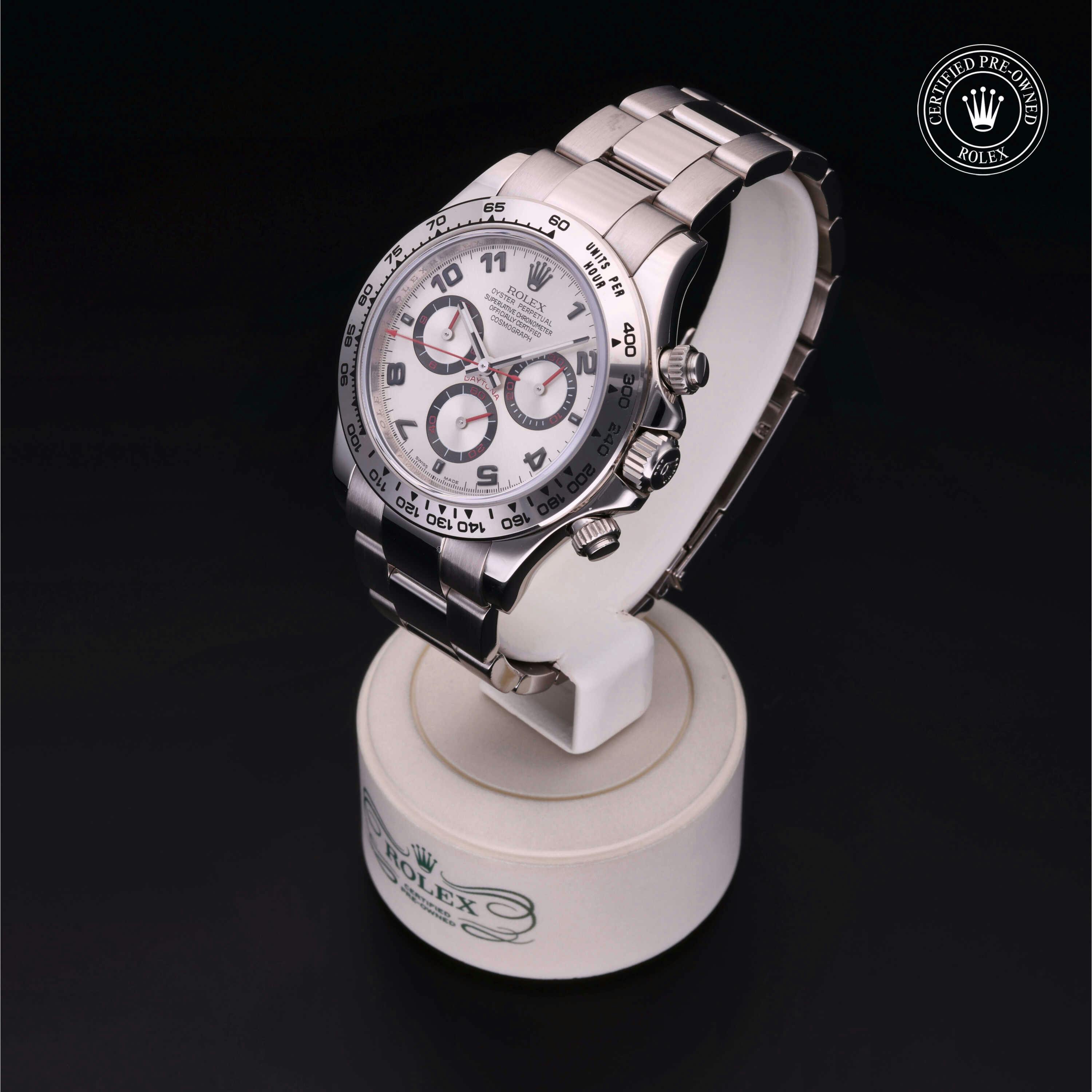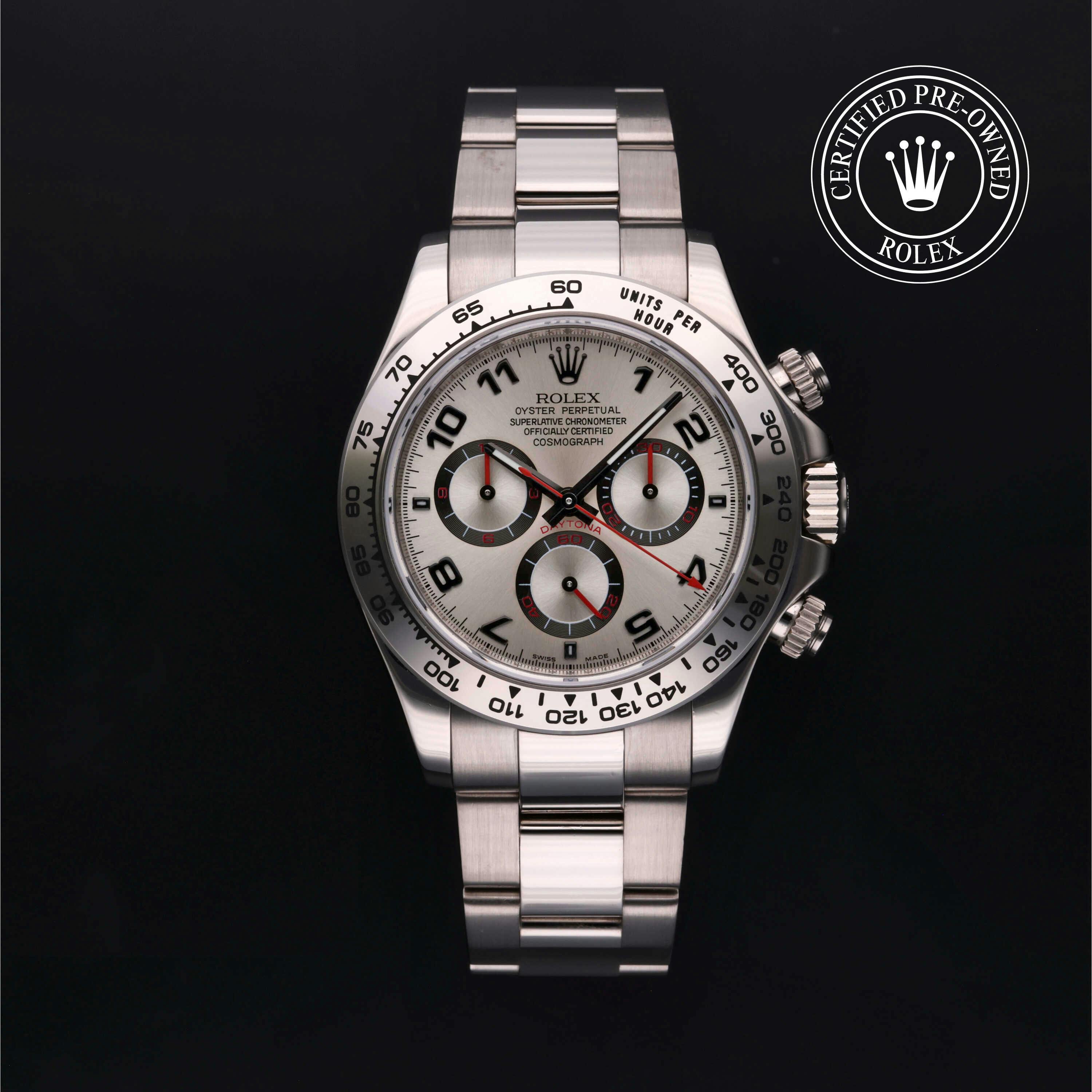 Rolex Certified Pre-Owned Cosmograph Daytona (116509) self-winding automatic watch, features a 40mm 18k white gold case and tachymetric scale bezel surrounding a silver dial on an 18k white gold oyster bracelet. Functions include hours, minutes, seconds and chronograph. This watch has received Rolex-authorized service and certification. It does not come with the original box or papers, but includes a custom Rolex Certified Pre-Owned hang tag, travel pouch and RCPO international warranty card.