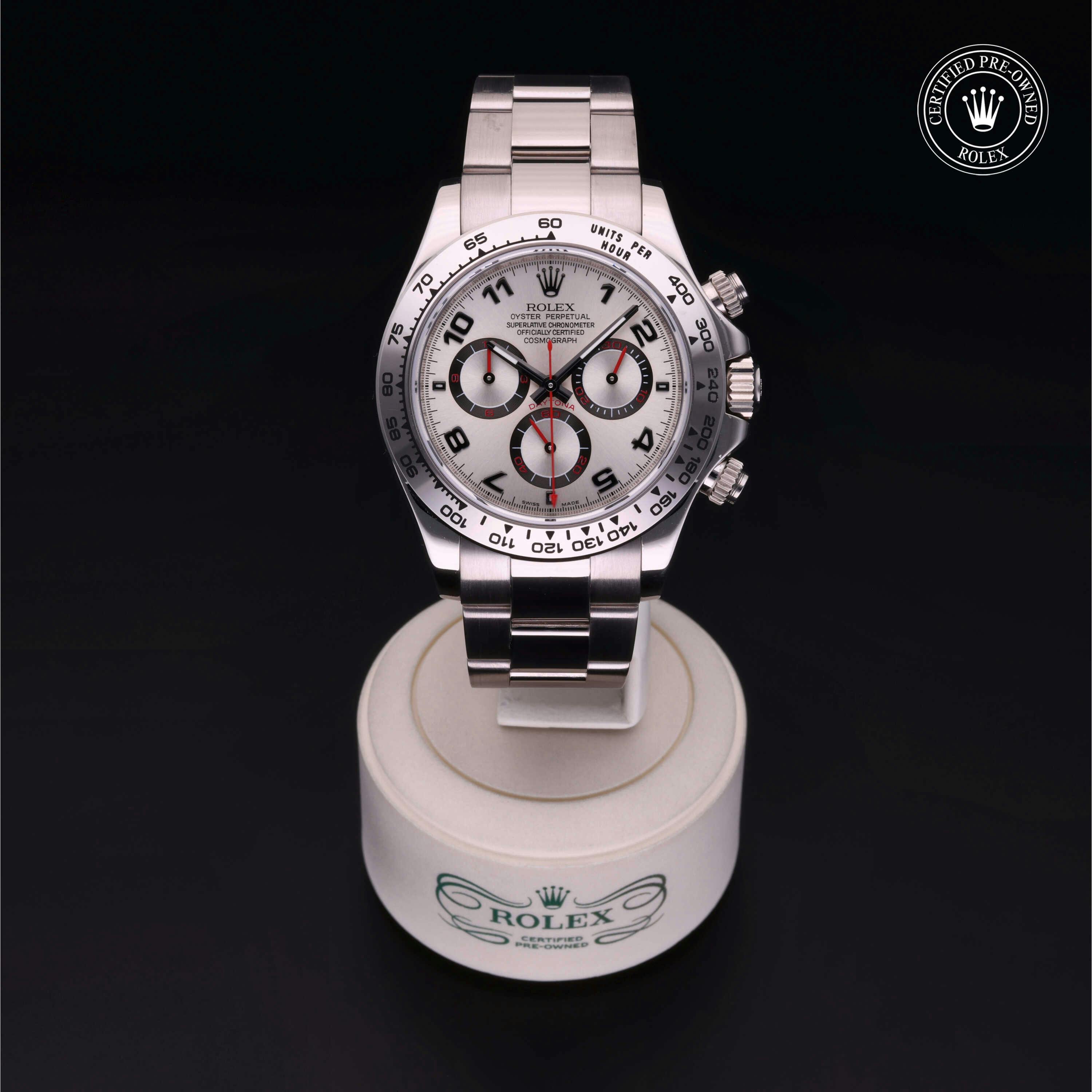 Rolex Certified Pre-Owned Cosmograph Daytona (116509) self-winding automatic watch, features a 40mm 18k white gold case and tachymetric scale bezel surrounding a silver dial on an 18k white gold oyster bracelet. Functions include hours, minutes, seconds and chronograph. This watch has received Rolex-authorized service and certification. It does not come with the original box or papers, but includes a custom Rolex Certified Pre-Owned hang tag, travel pouch and RCPO international warranty card.
