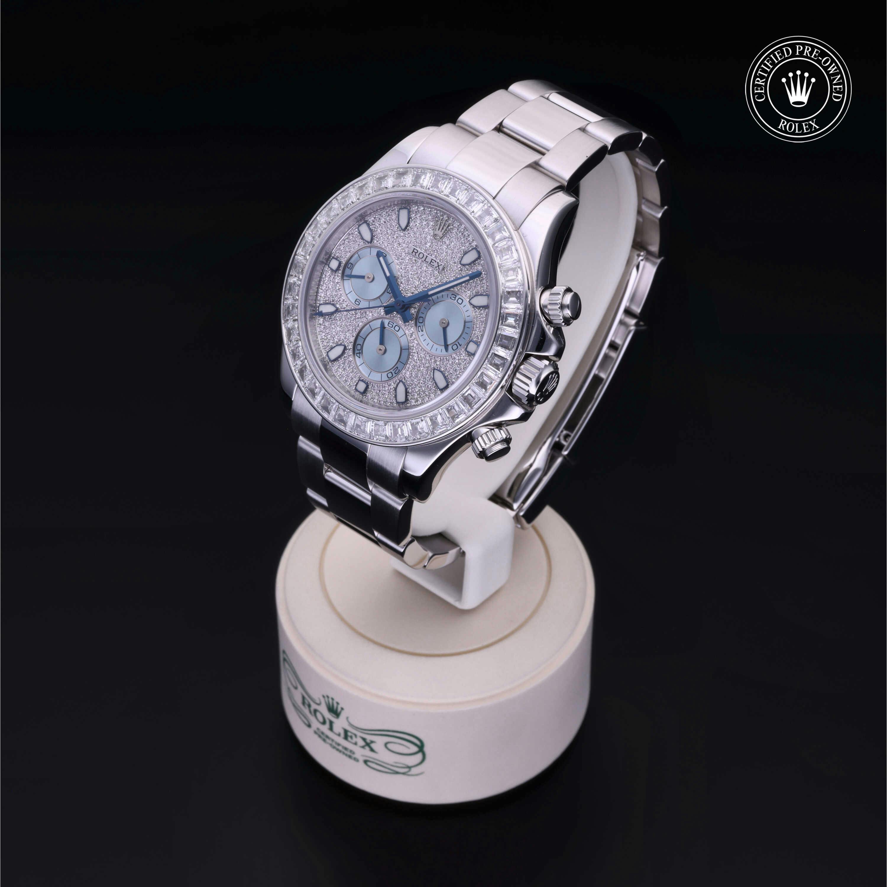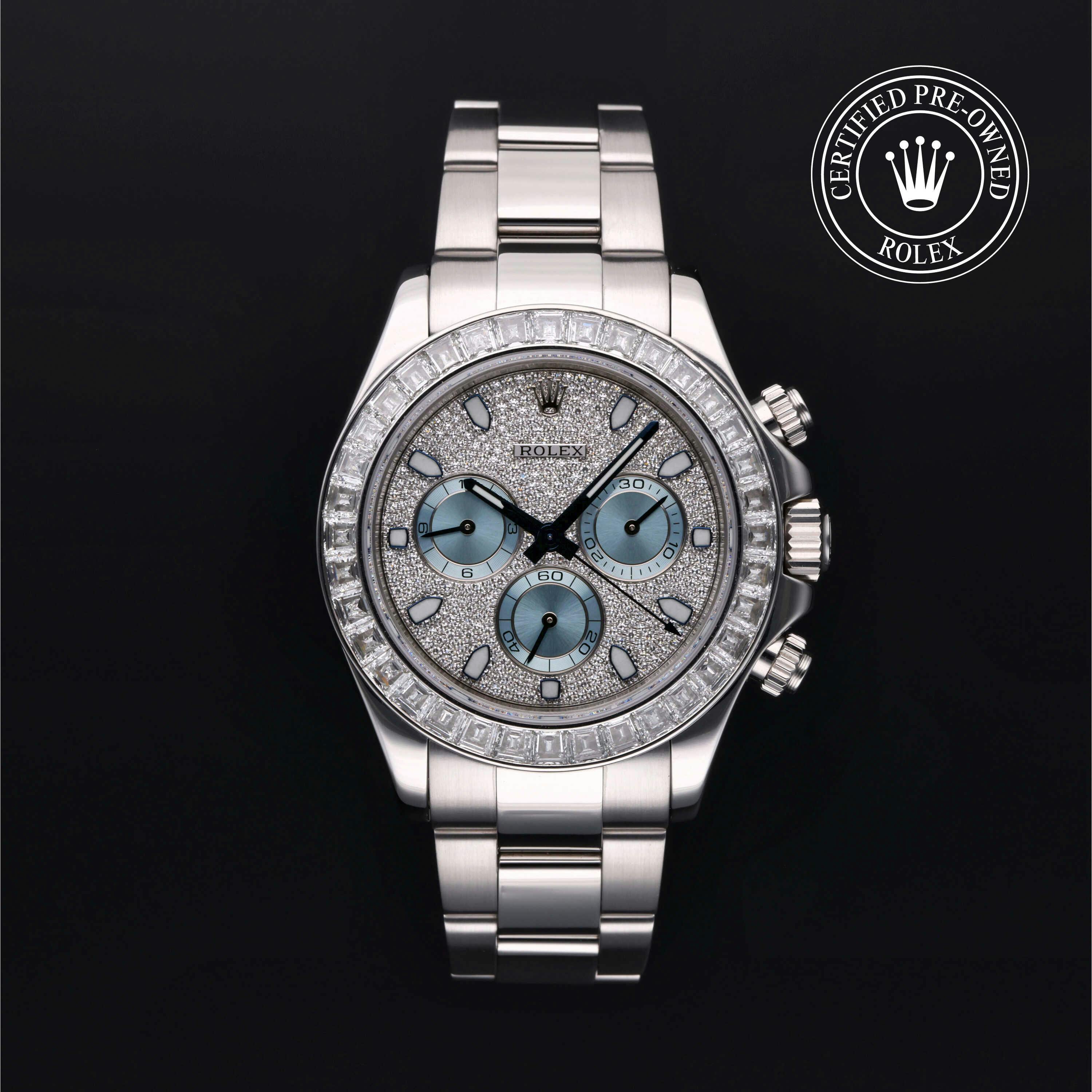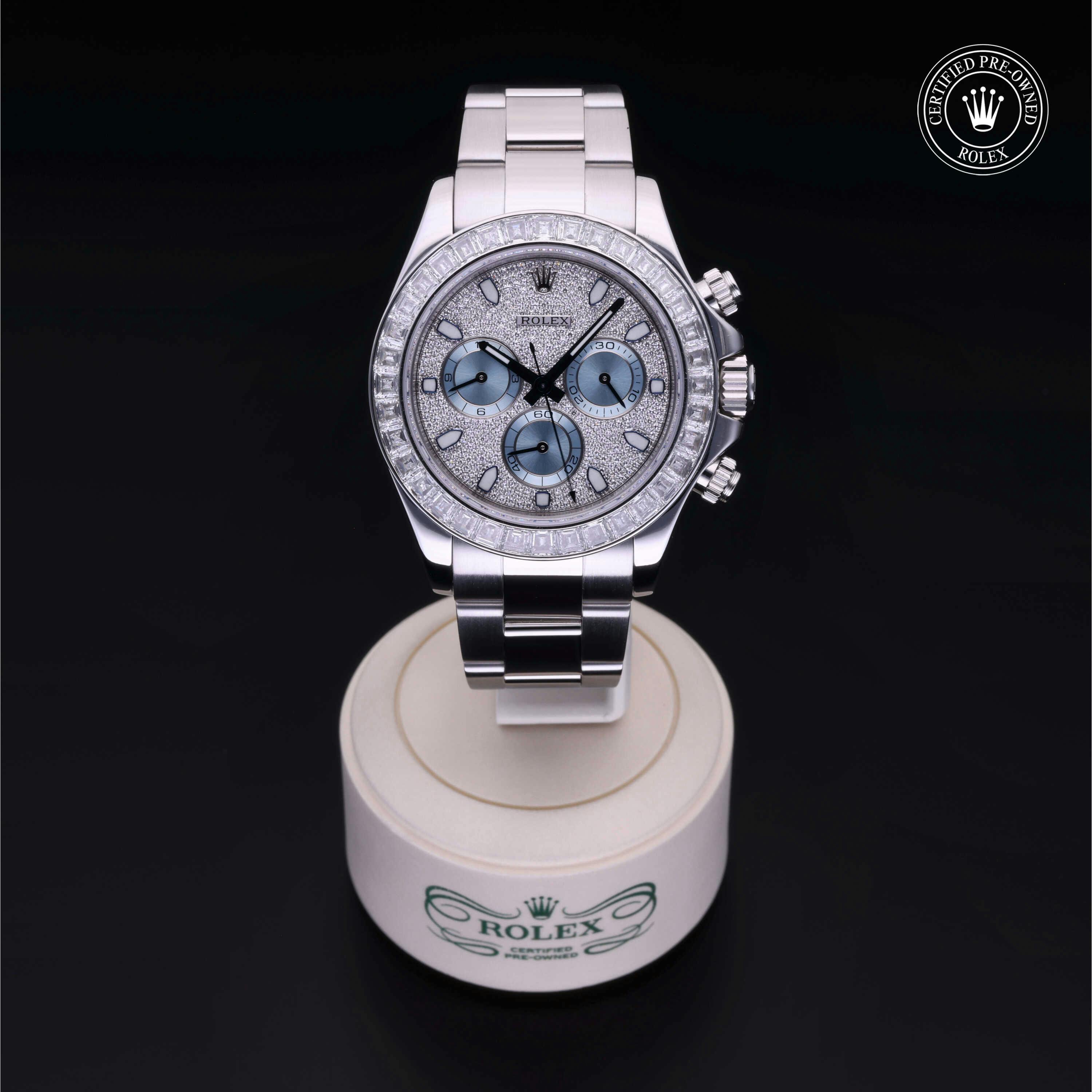 Rolex Certified Pre-Owned Cosmograph Daytona (116576TBR) self - winding automatic watch, features a 40mm platinum case with a diamond set bezel surrounding an ice blue and pave diamond set dial on a platinum Oyster bracelet. Functions include hours, minutes, seconds and chronograph. This watch has received Rolex-authorized service and certification. It does not come with the original box or papers, but includes a custom Rolex Certified Pre-Owned hang tag, travel pouch and RCPO international warranty card.