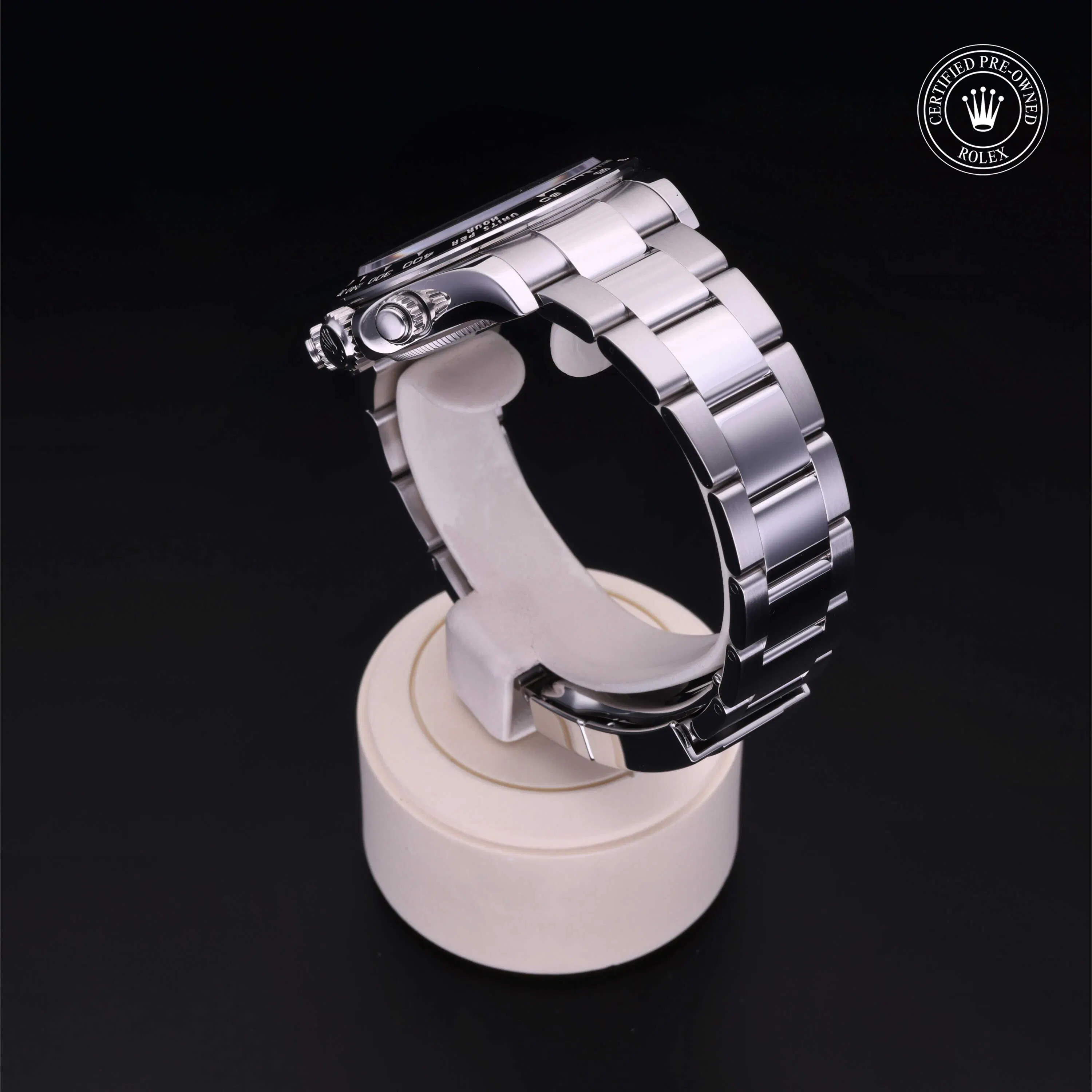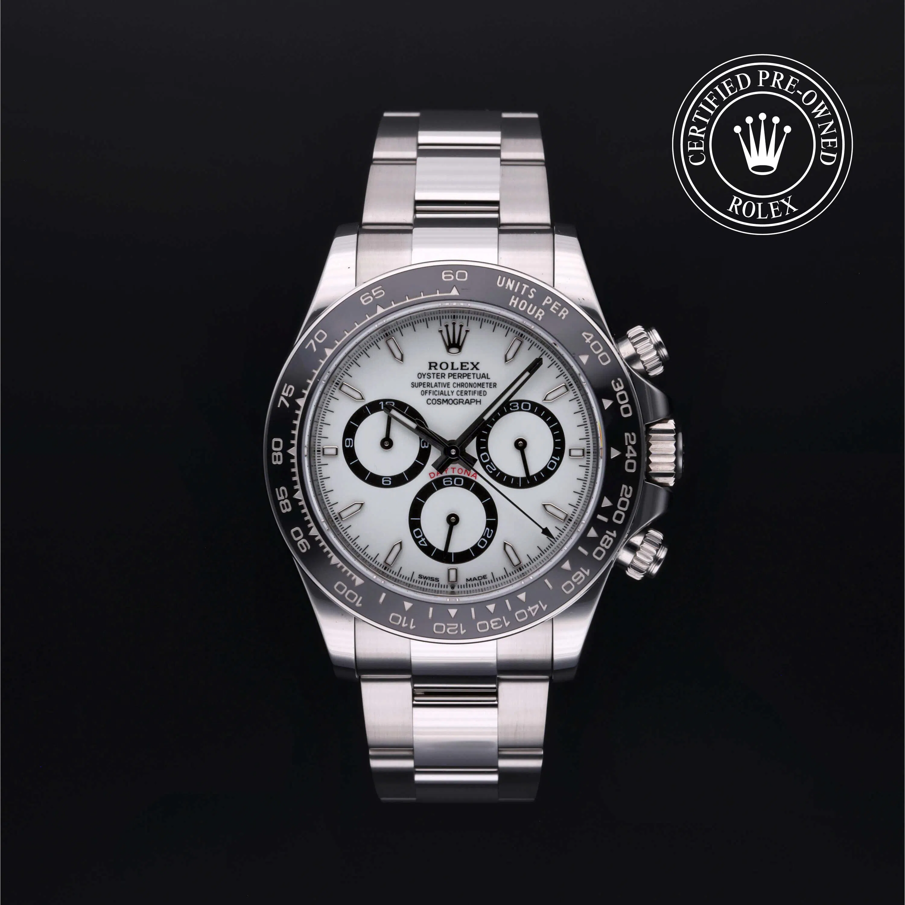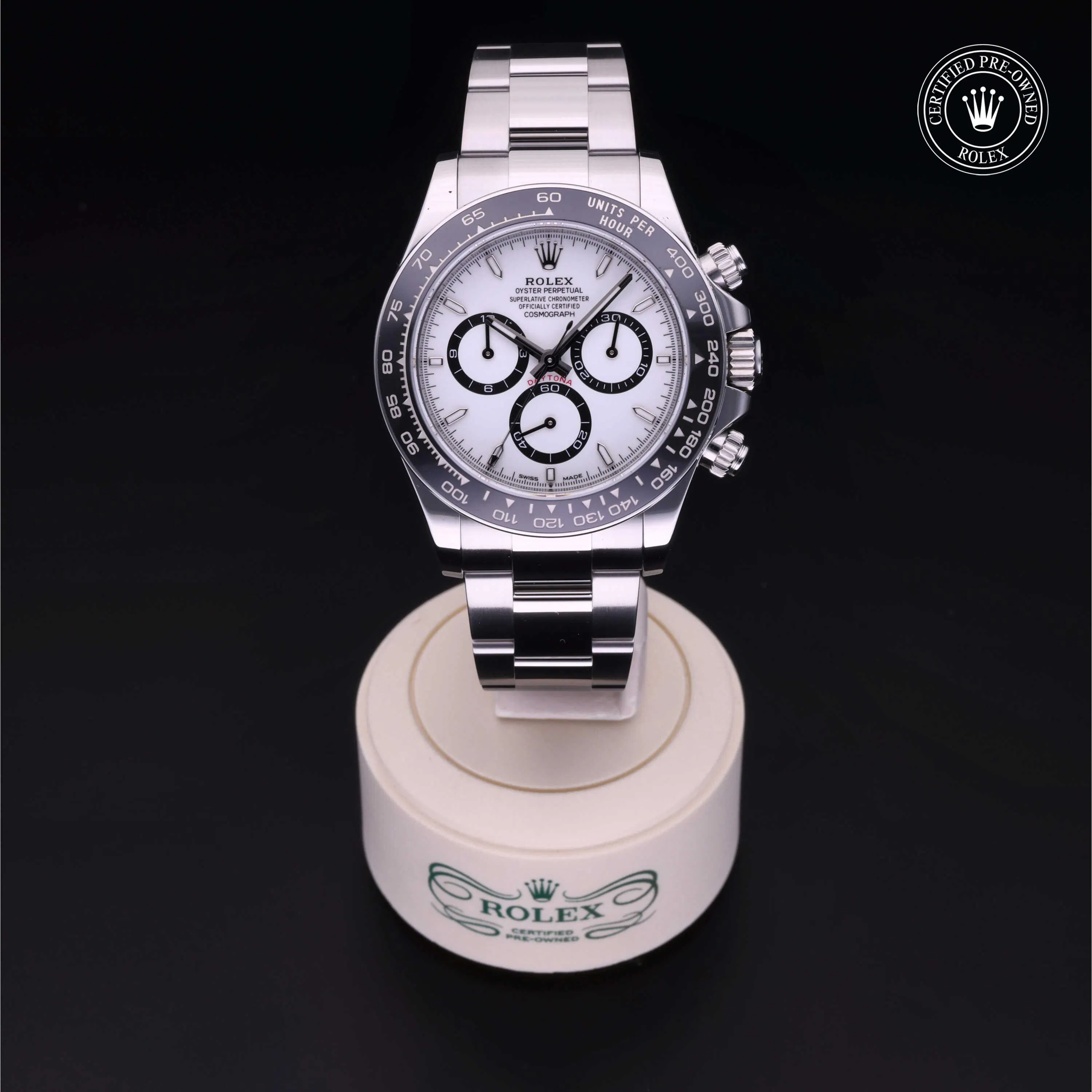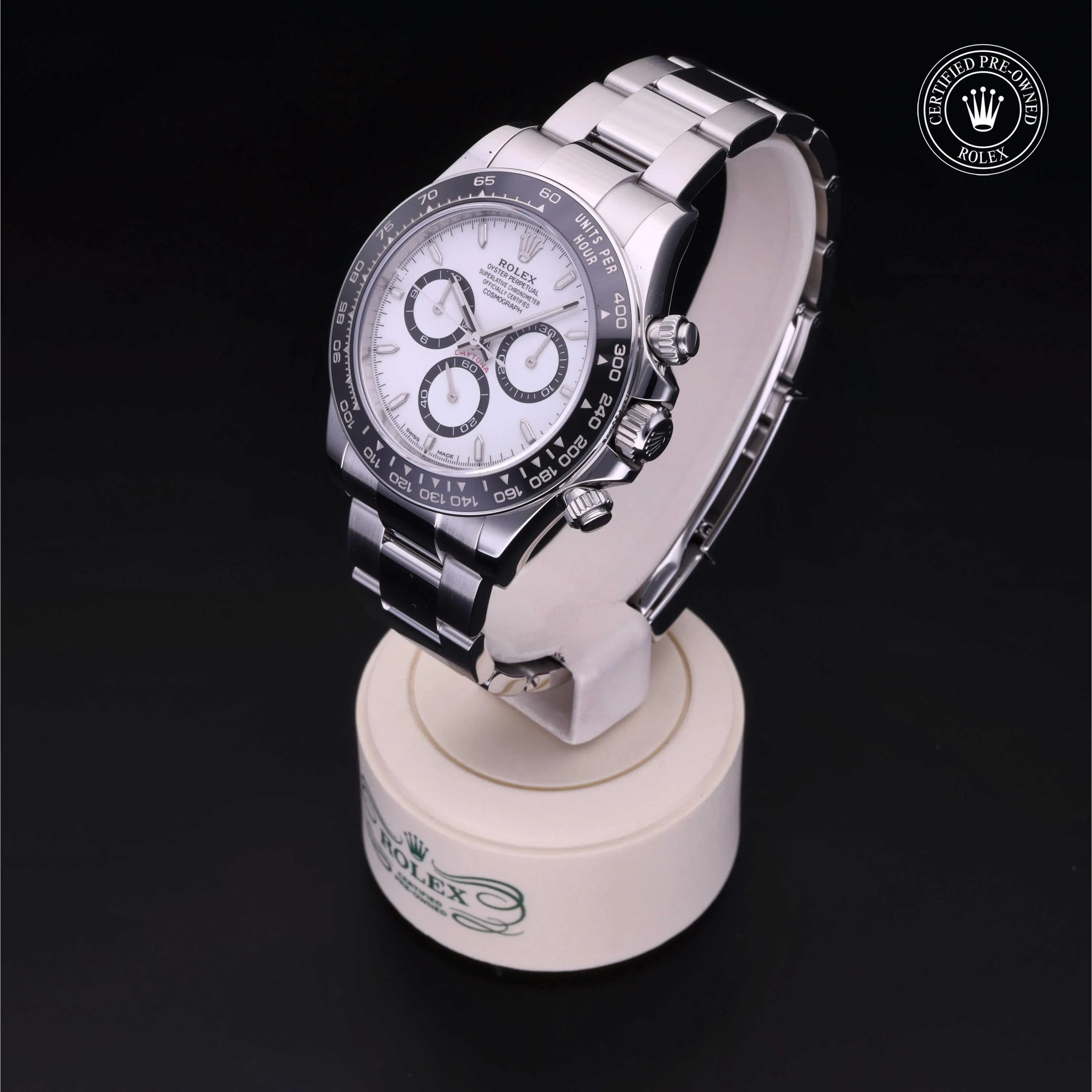 Rolex Certified Pre-Owned Cosmograph Daytona (126500LN) self - winding automatic watch, features a 40mm stainless steel case with a black cerachrom tachymetric scale bezel surrounding a white dial on a stainless steel oyster bracelet. Functions include hours, minutes, seconds and chronograph. This watch has received Rolex-authorized service and certification. It comes with the original box and papers, and includes a custom Rolex Certified Pre-Owned hang tag, travel pouch and RCPO international warranty card.