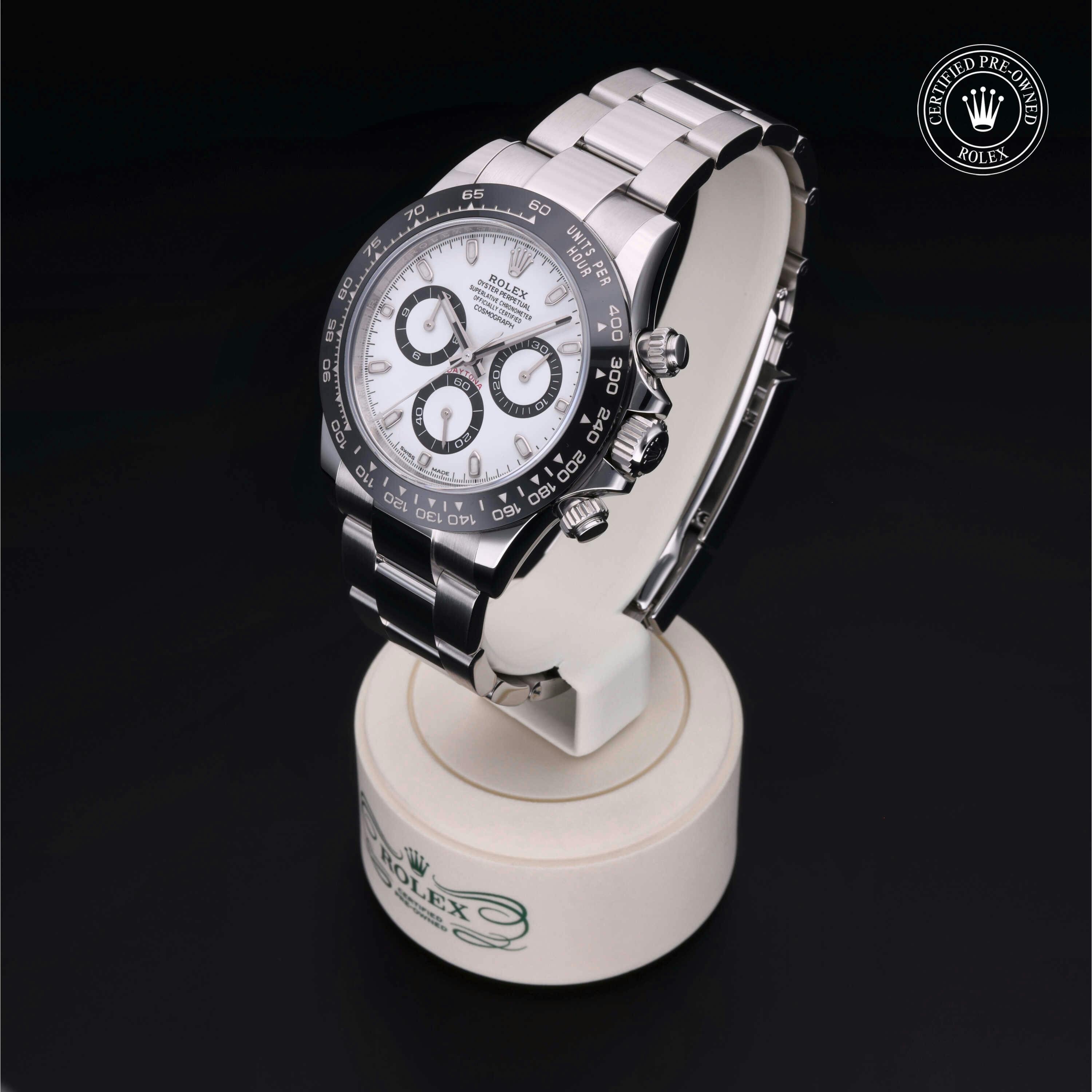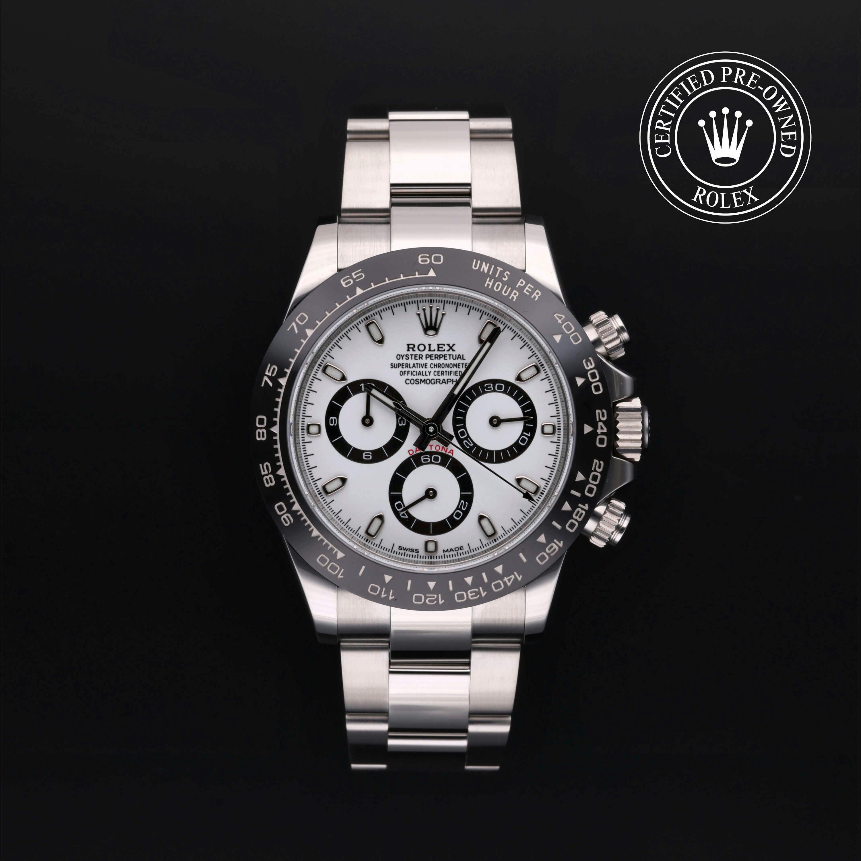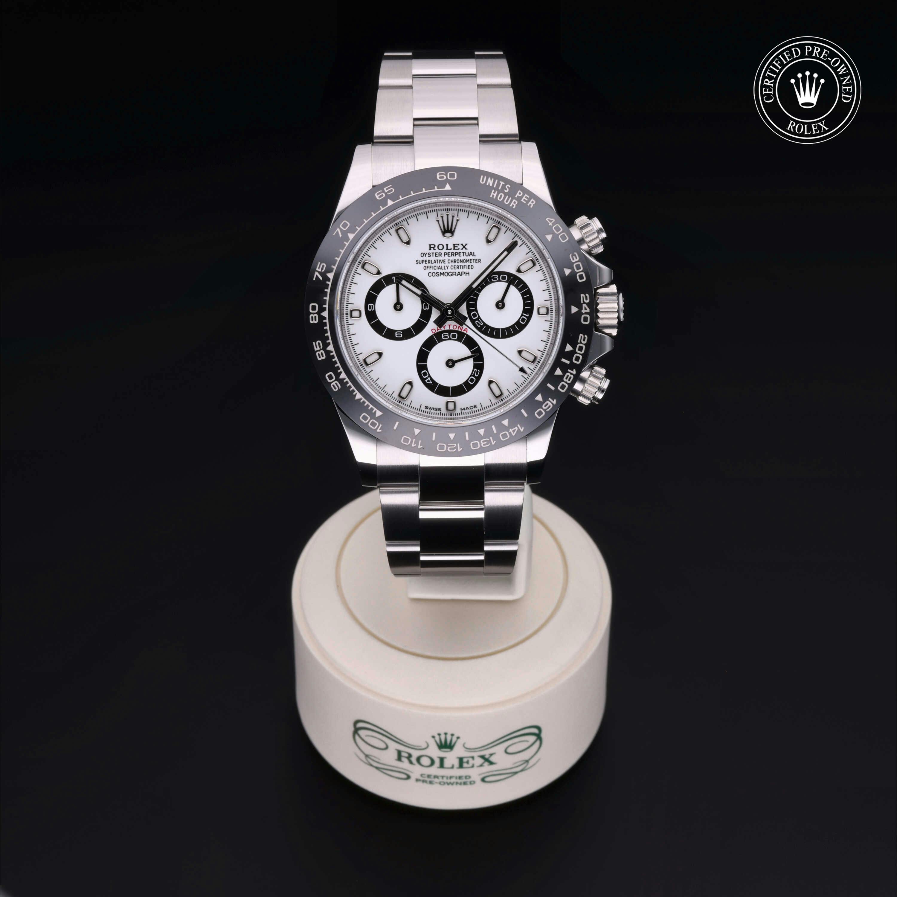 Rolex Certified Pre-Owned Cosmograph Daytona (116500LN) self - winding automatic watch, features a 40mm stainless steel case with a black cerachrom bezel surrounding a white dial on a stainless steel oyster bracelet. Functions include hours, minutes, seconds and chronograph. This watch has received Rolex-authorized service and certification. It comes with the original box and papers, and includes a custom Rolex Certified Pre-Owned hang tag, travel pouch and RCPO international warranty card.