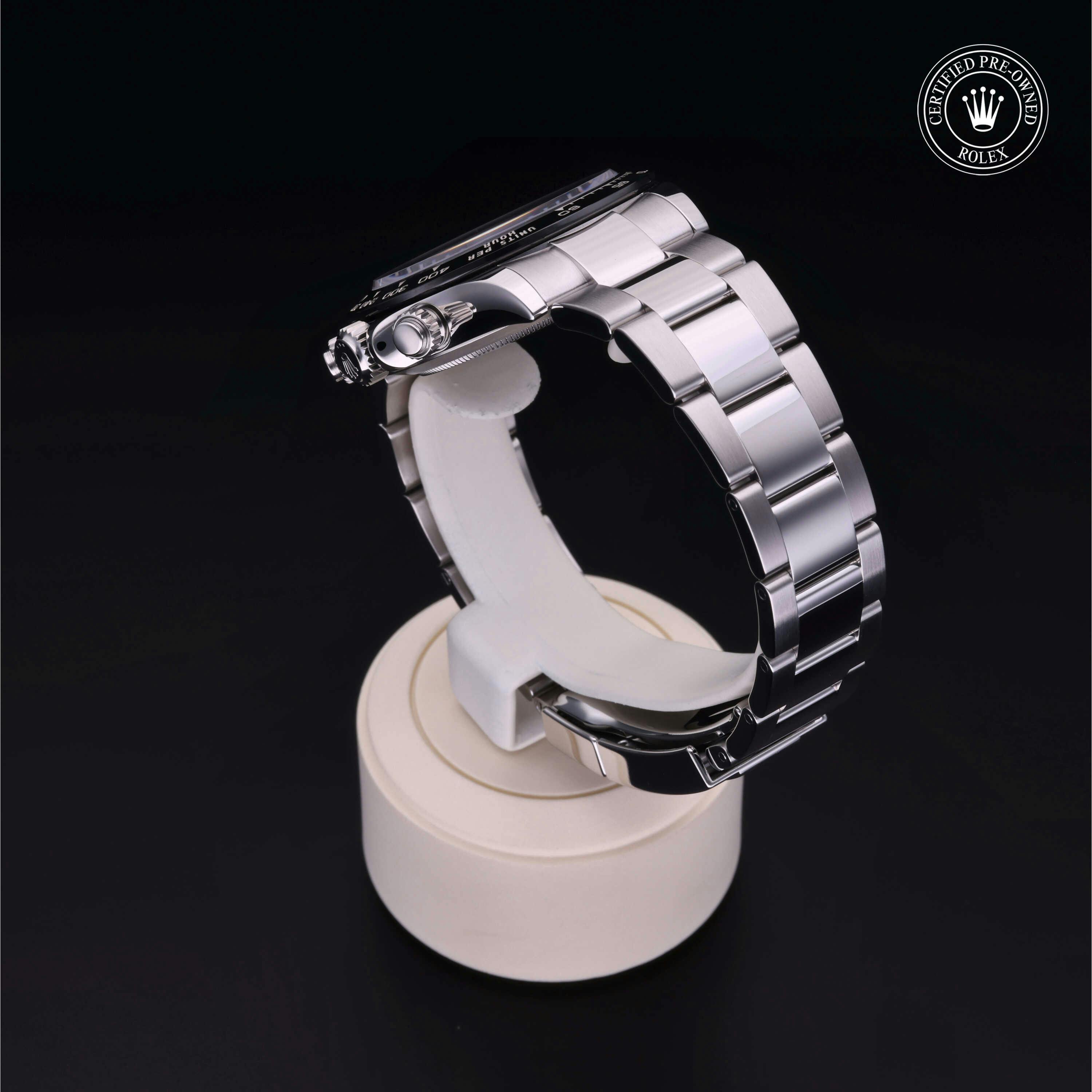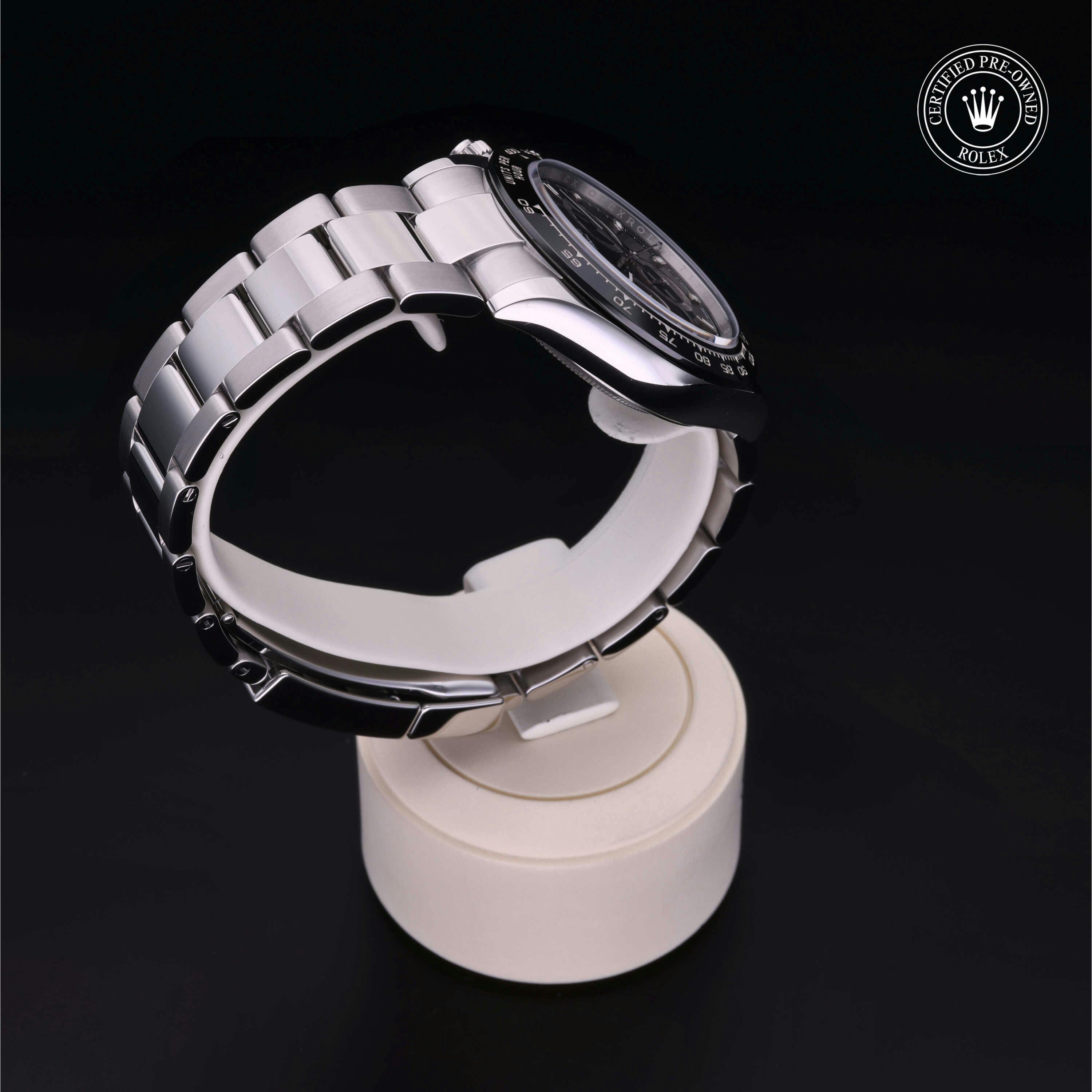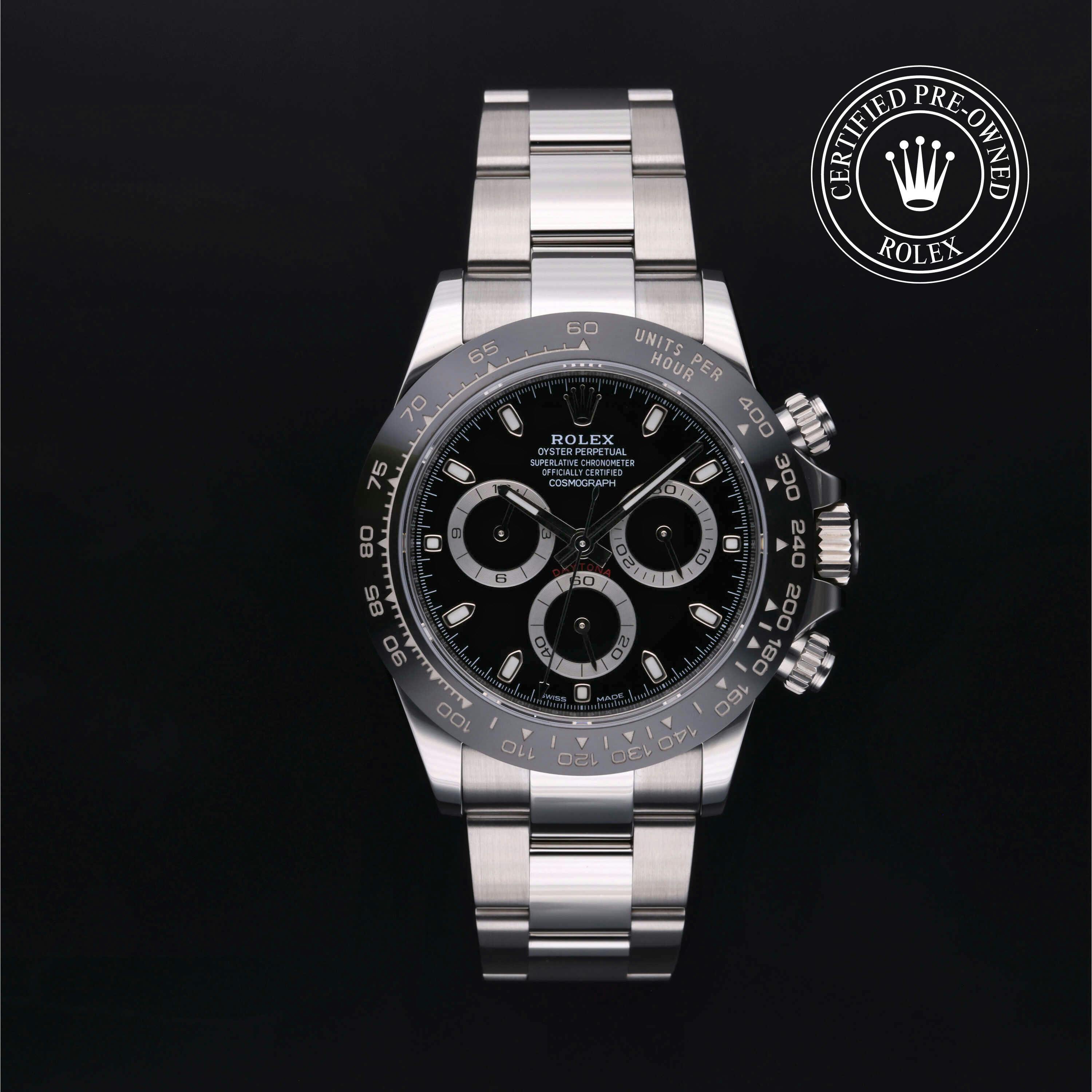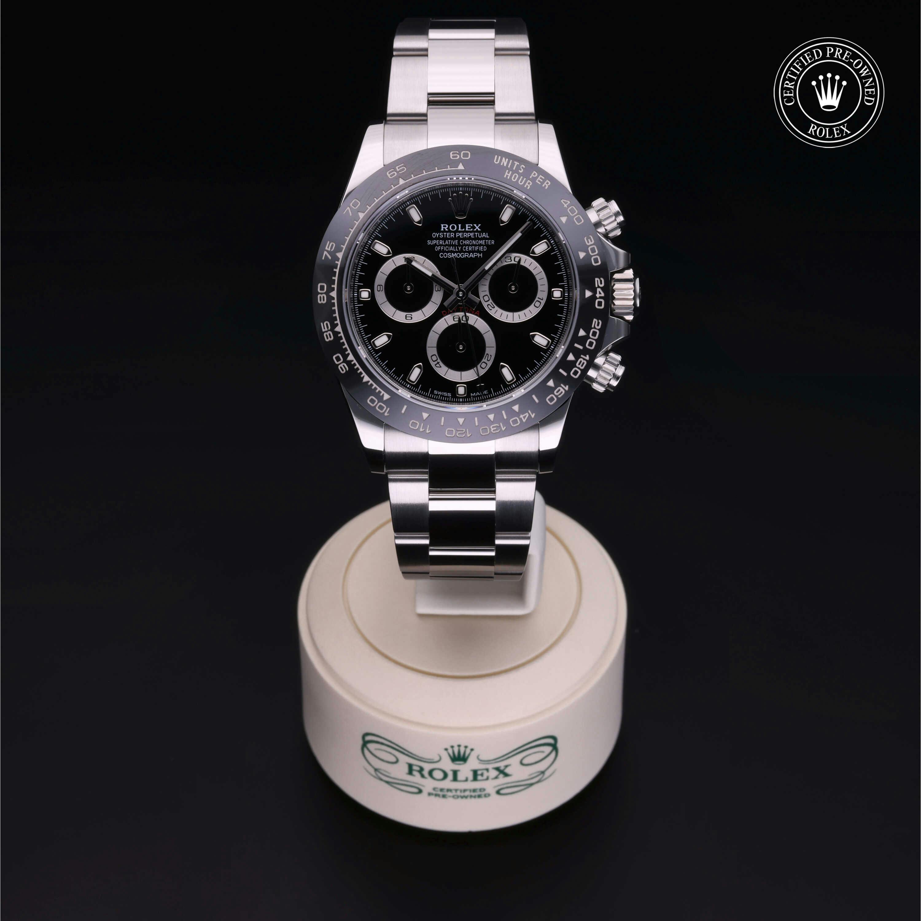 Rolex Certified Pre-Owned Cosmograph Daytona (116500LN) self - winding automatic watch, features a 40mm stainless steel case with a black cerachrom tachymetric scale bezel surrounding a black dial on a stainless steel oyster bracelet. Functions include hours, minutes, seconds, chronograph and tachymeter. This watch has received Rolex-authorized service and certification. It comes with the original box and papers, and includes a custom Rolex Certified Pre-Owned hang tag, travel pouch and RCPO international warranty card.