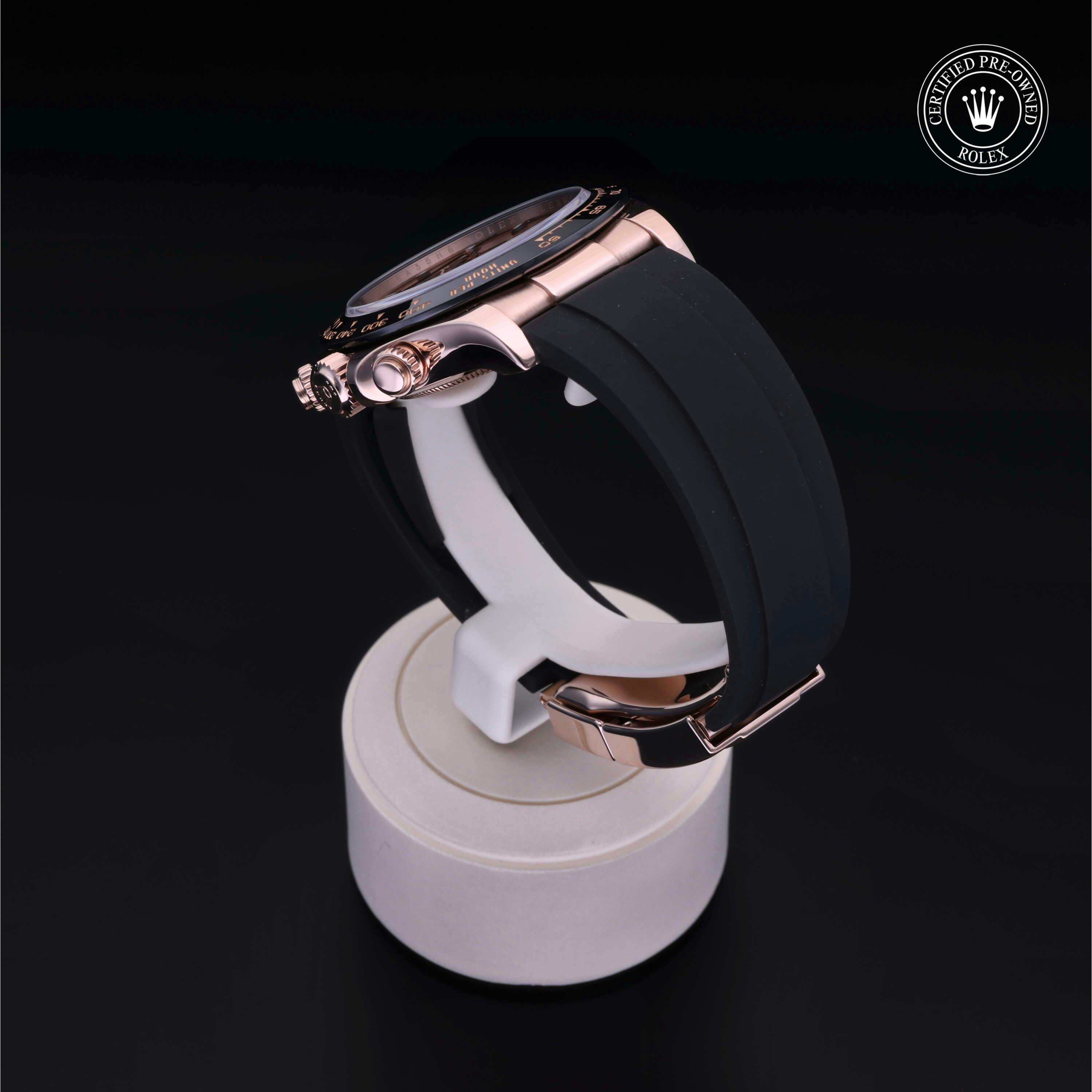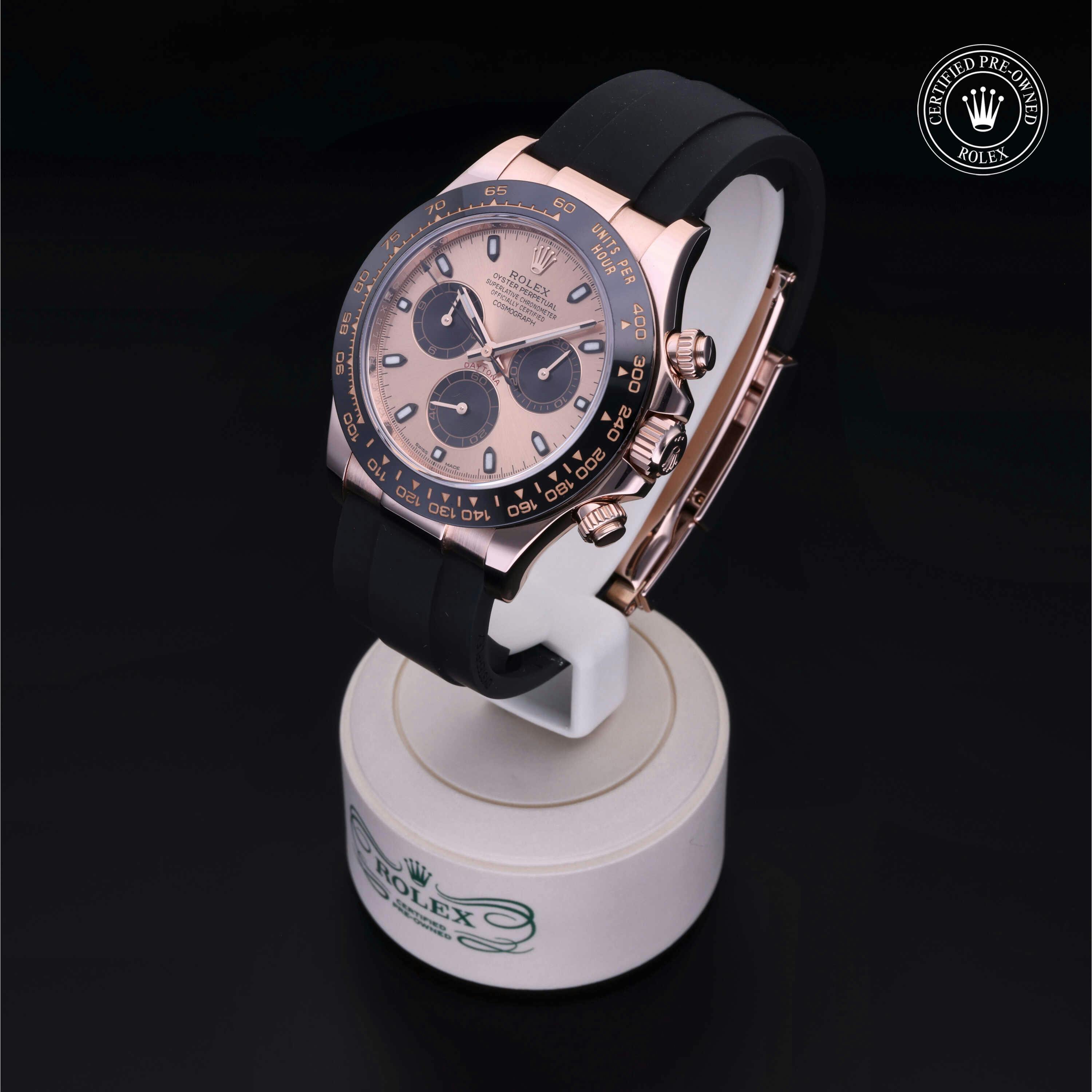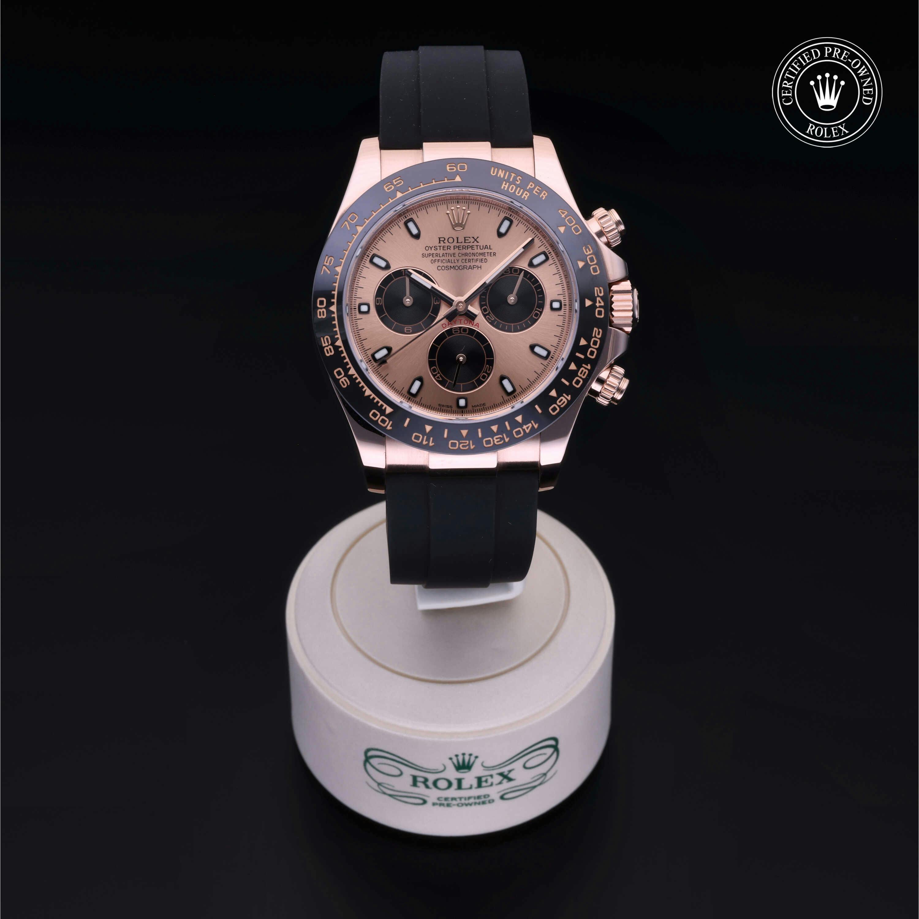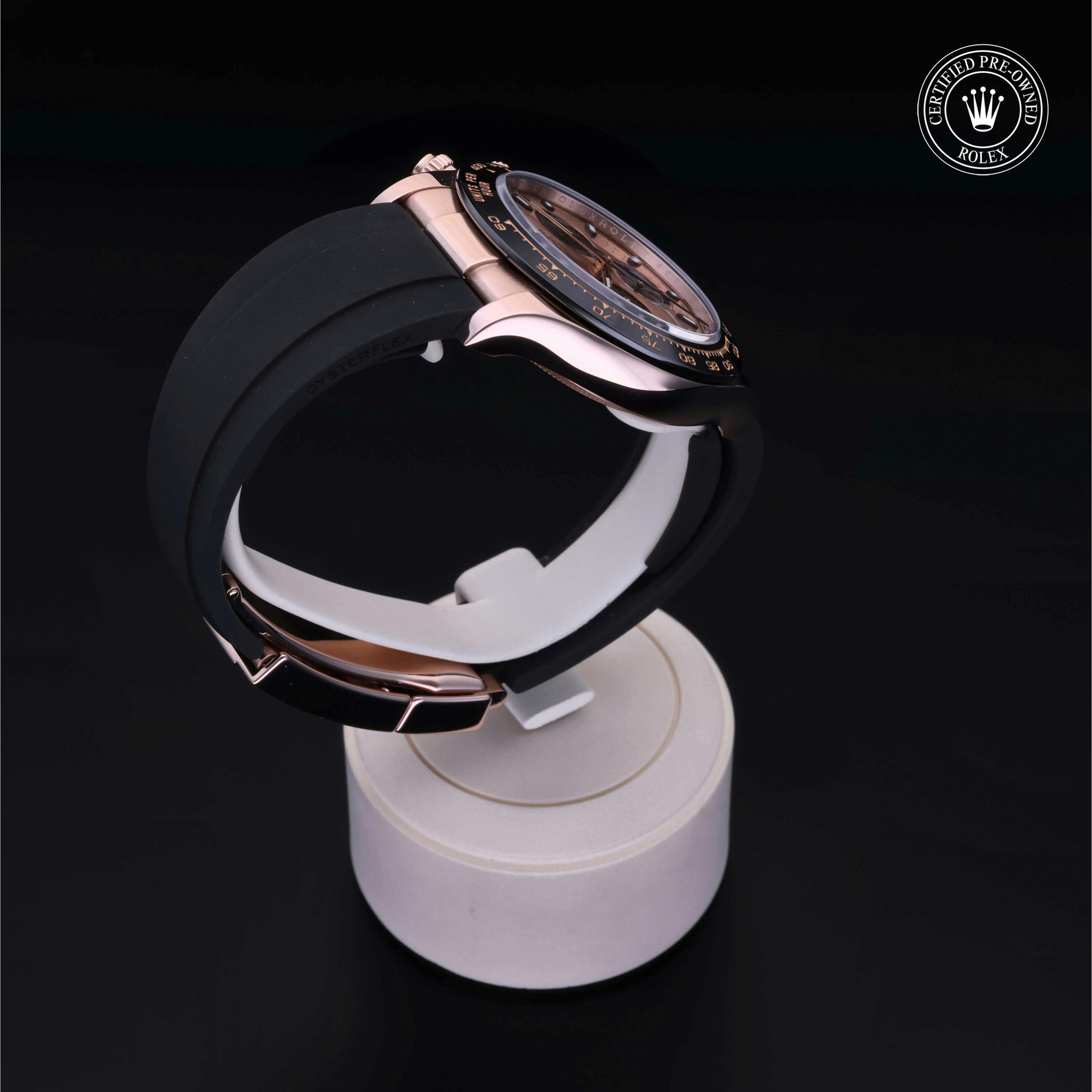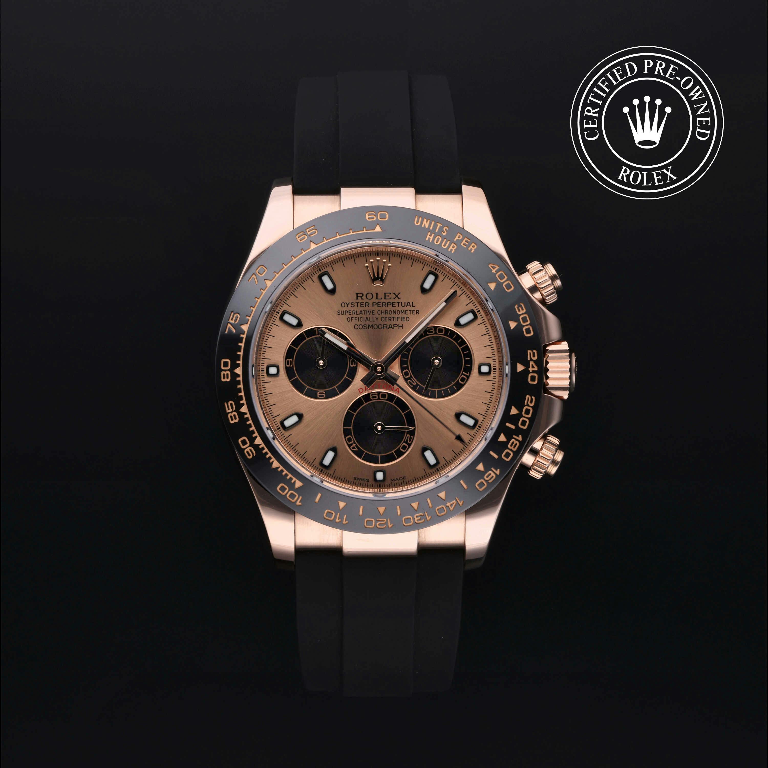 Rolex Certified Pre-Owned Cosmograph Daytona (116515LN) self - winding automatic watch, features a 40mm 18k rose gold case with a black cerachrom tachymetric scale bezel surrounding a pink dial on a black oysterflex strap with an 18k rose gold deployant buckle. Functions include hours, minutes and seconds. This watch has received Rolex-authorized service and certification. It comes with the original papers, and includes a custom Rolex Certified Pre-Owned hang tag, travel pouch and RCPO international warranty card.
