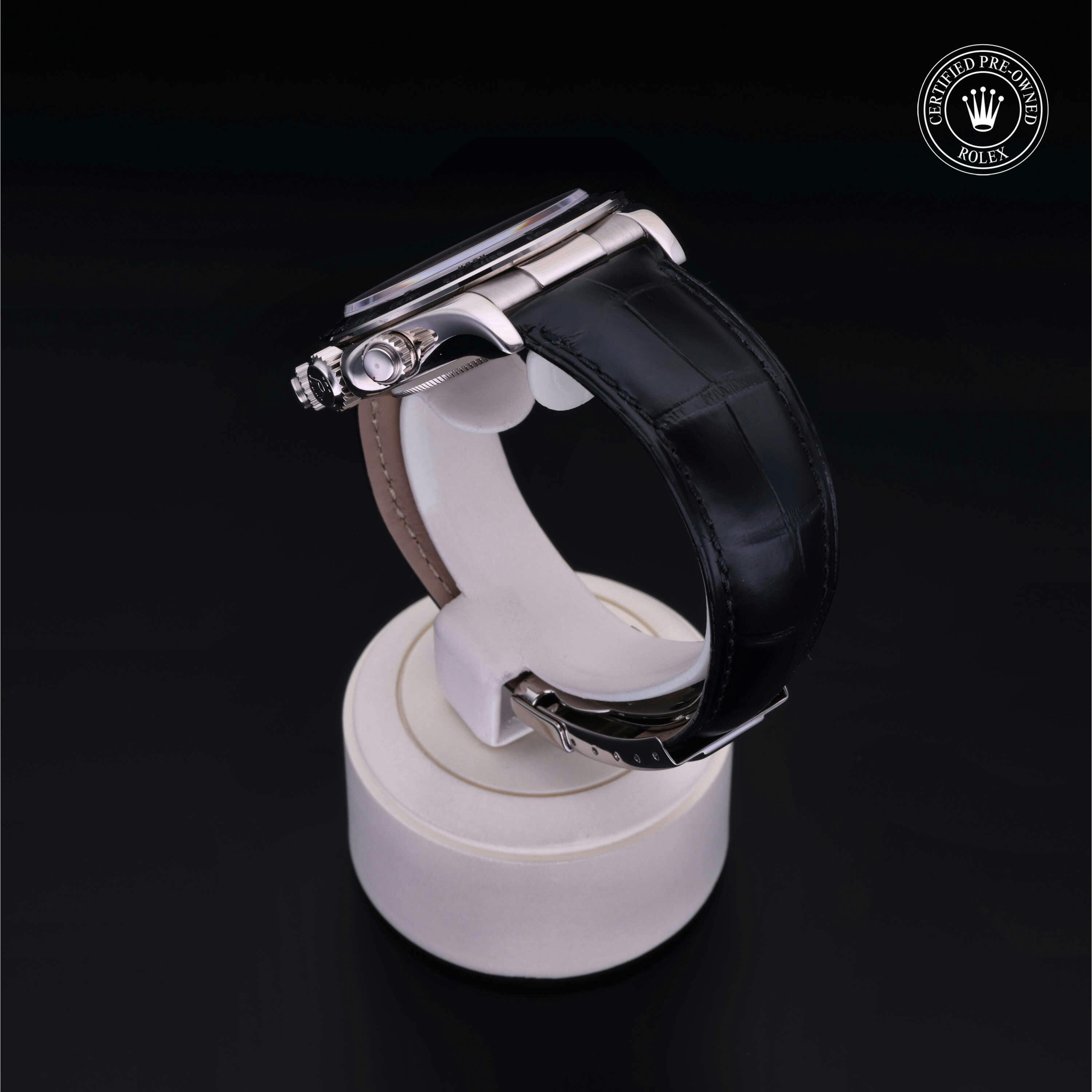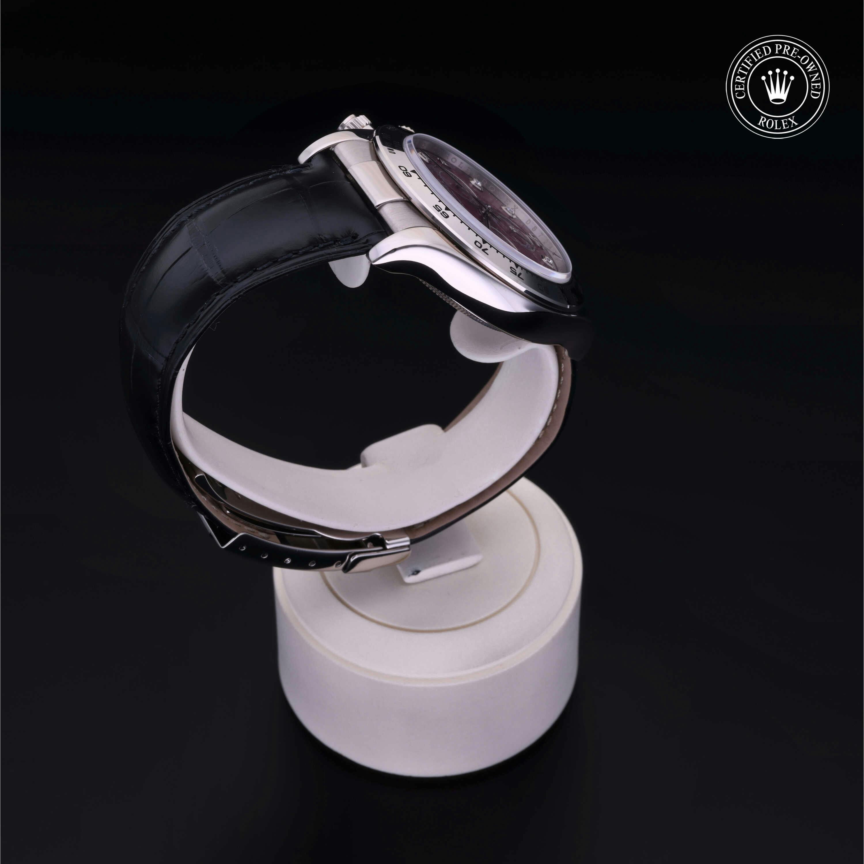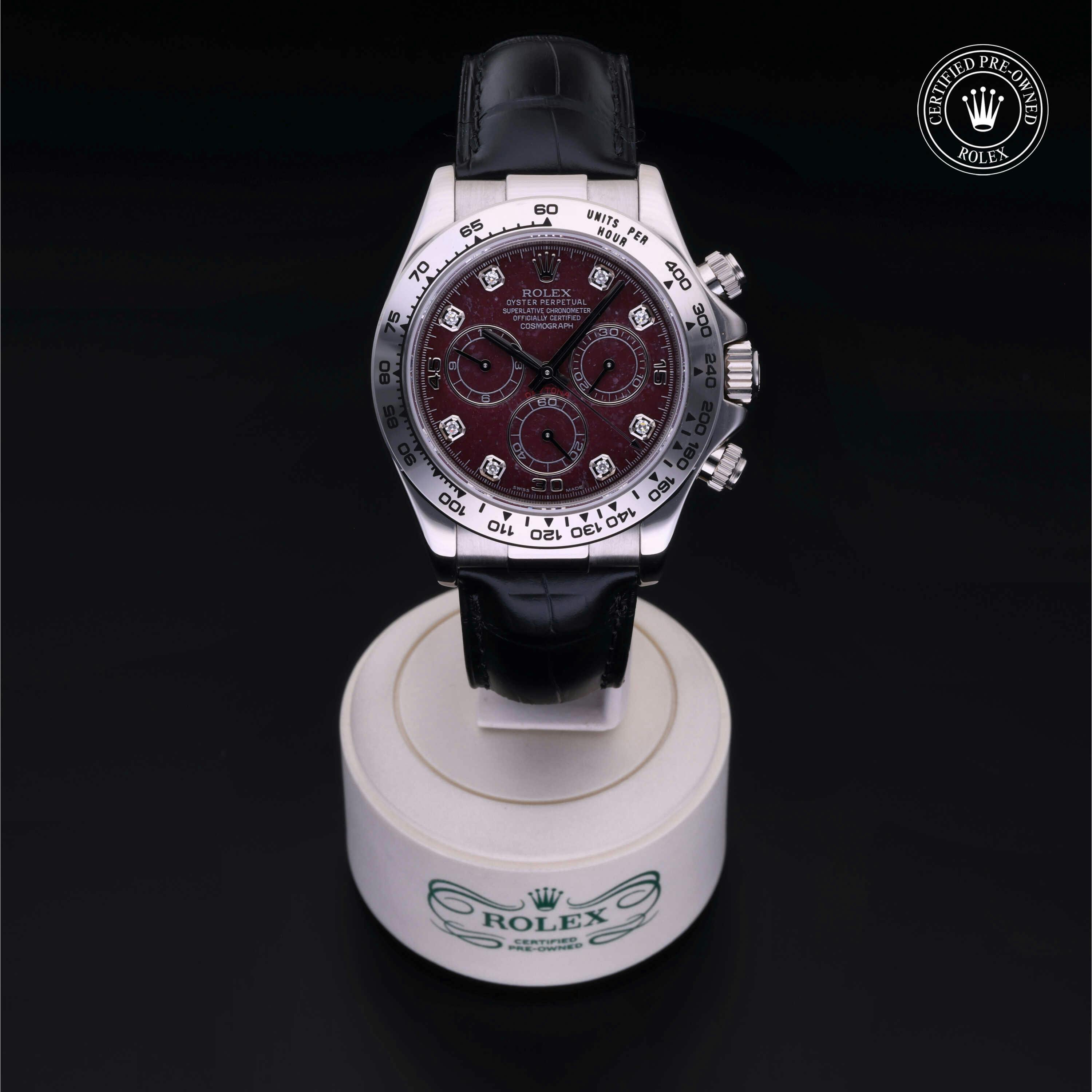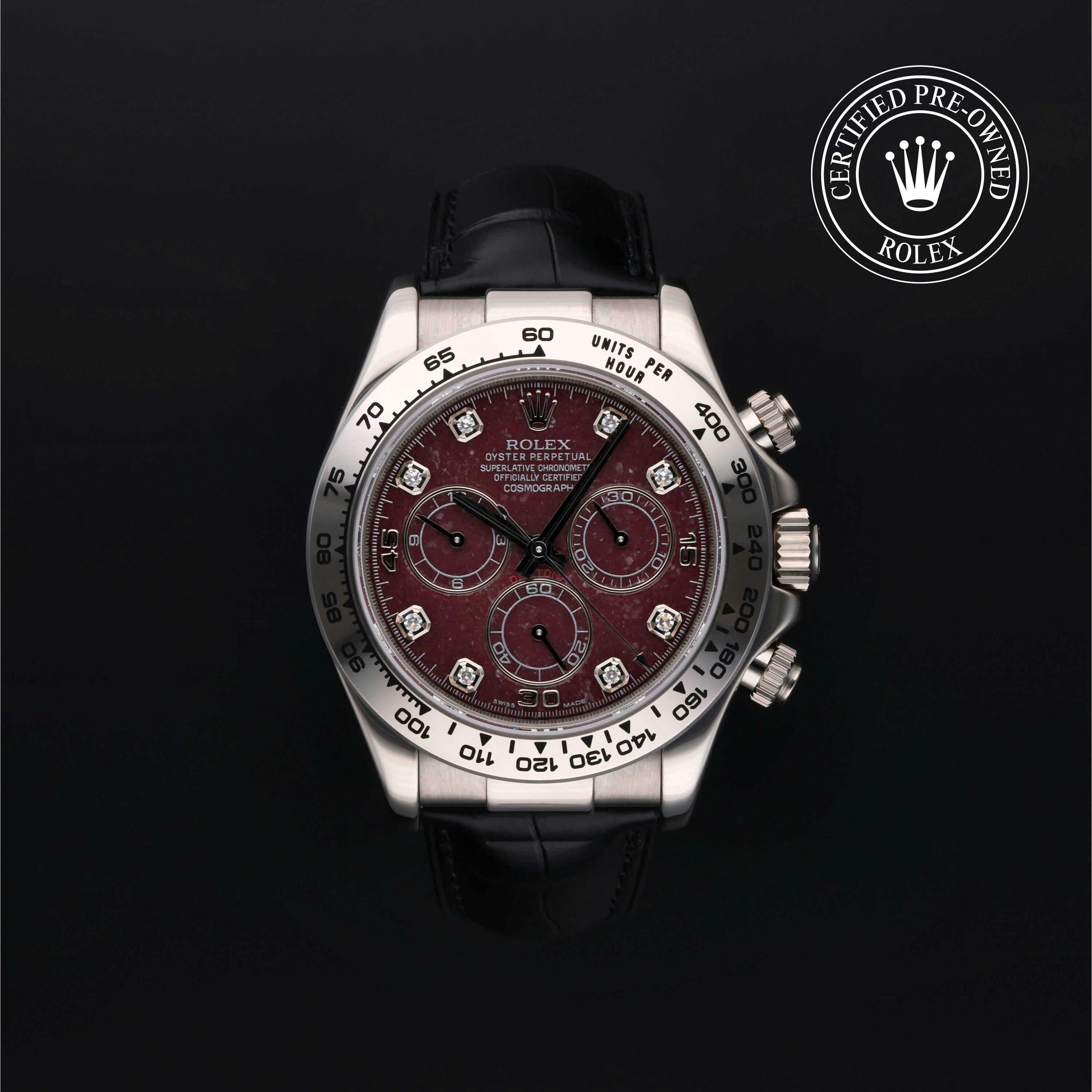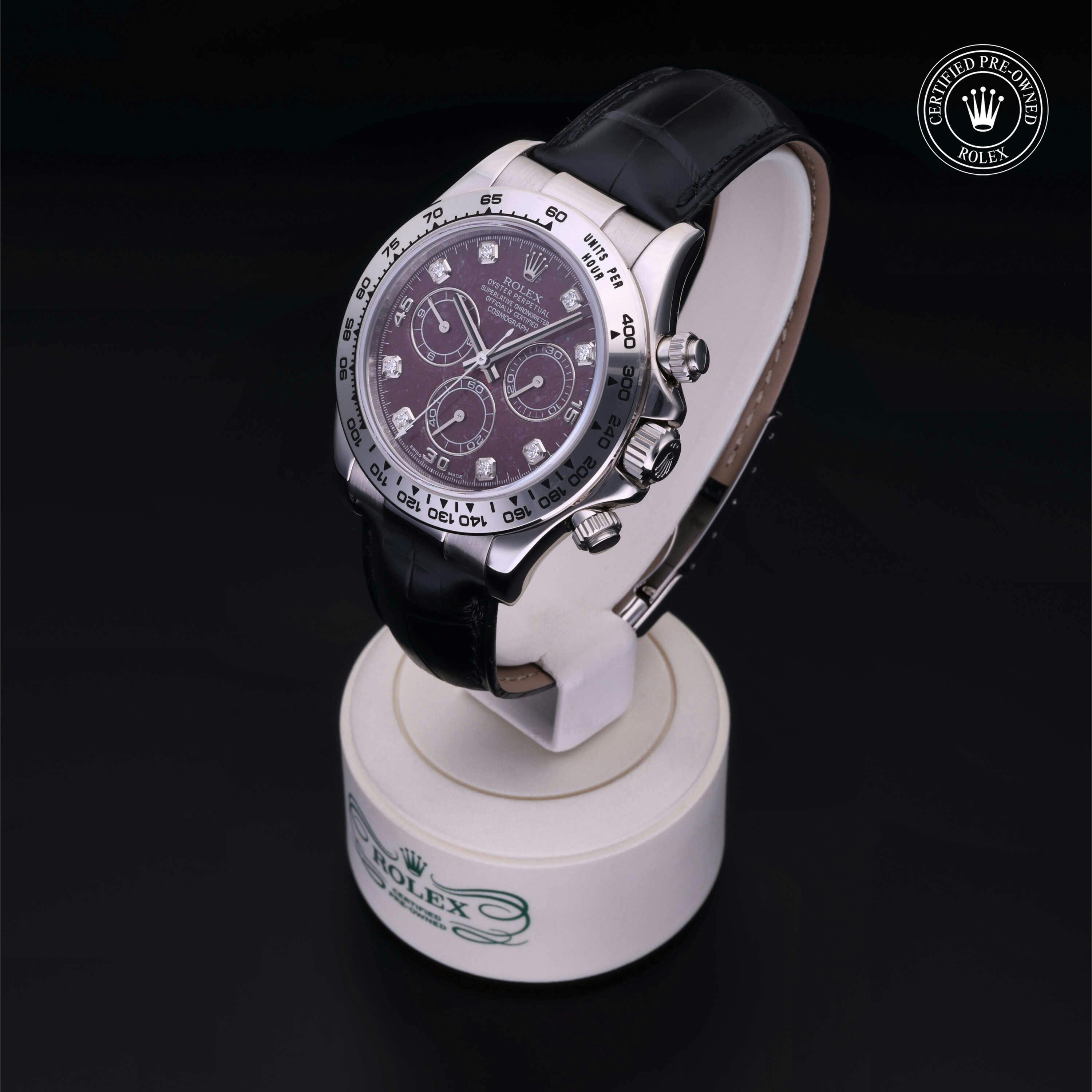 Rolex Certified Pre-Owned Cosmograph Daytona (116519) self - winding automatic watch, features a 40mm 18k white gold case surrounding a grossular diamond set dial on a black alligator strap with an 18k white gold deployant buckle. Functions include hours, minutes and seconds. This watch has received Rolex-authorized service and certification. It comes with the original papers, and includes a custom Rolex Certified Pre-Owned hang tag, travel pouch and RCPO international warranty card.