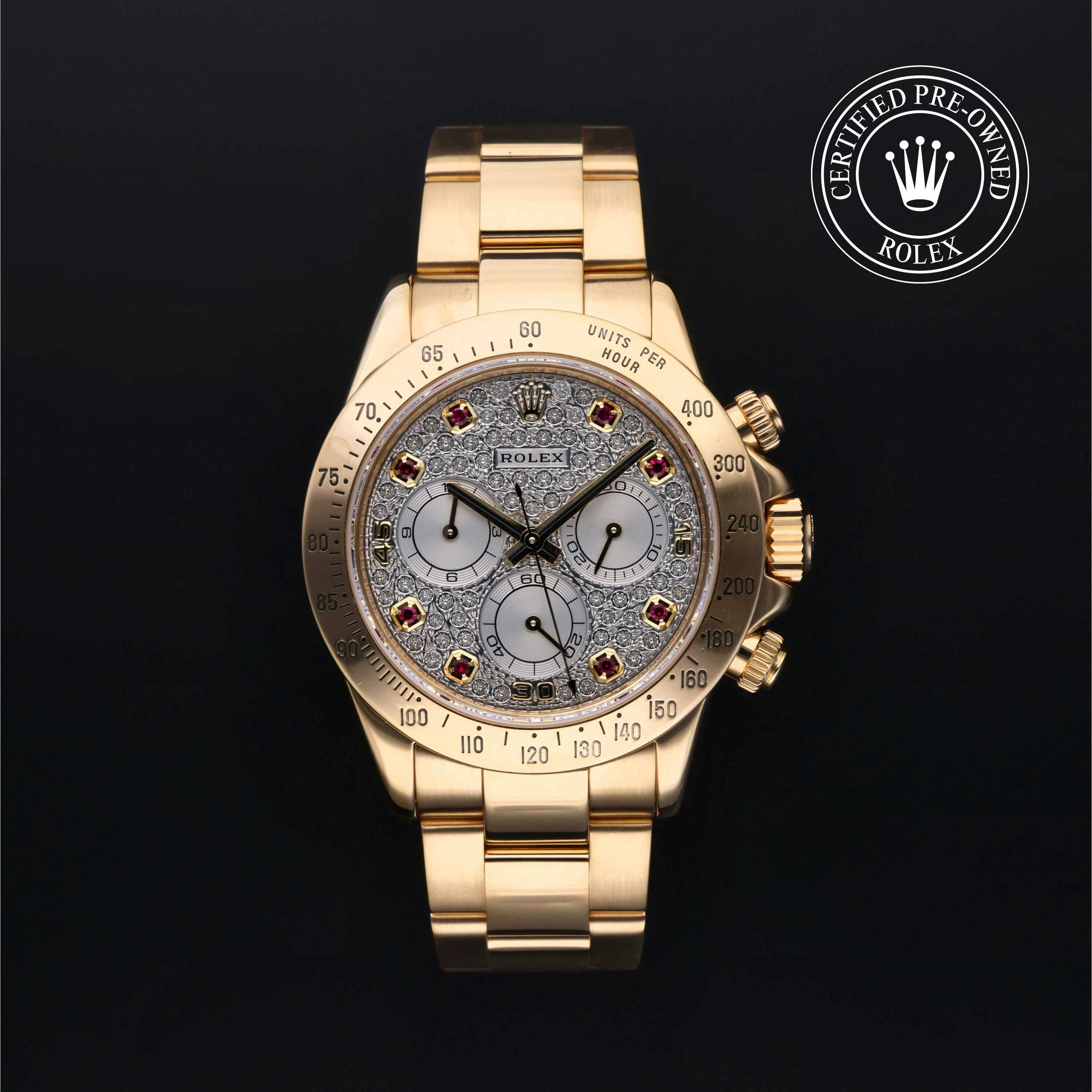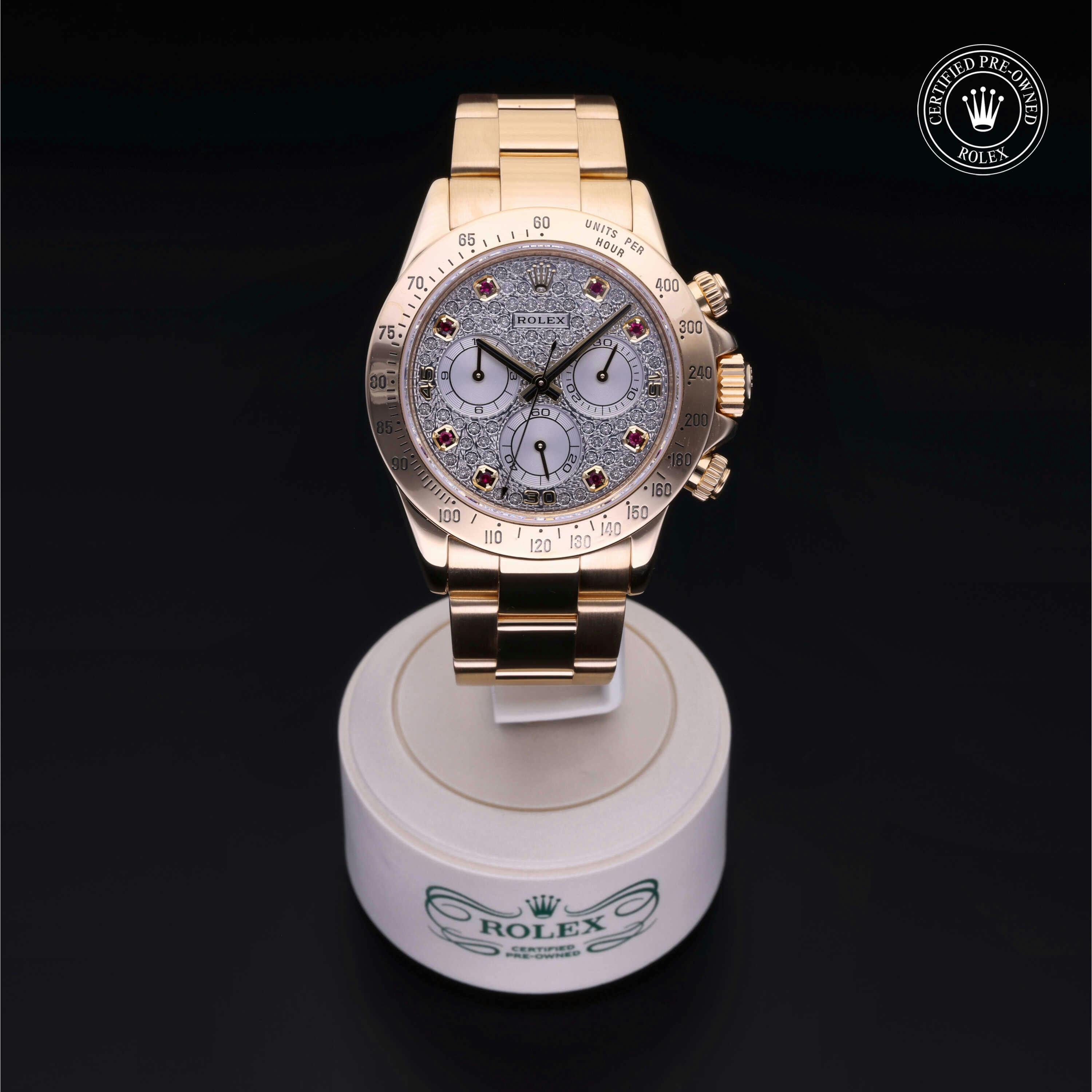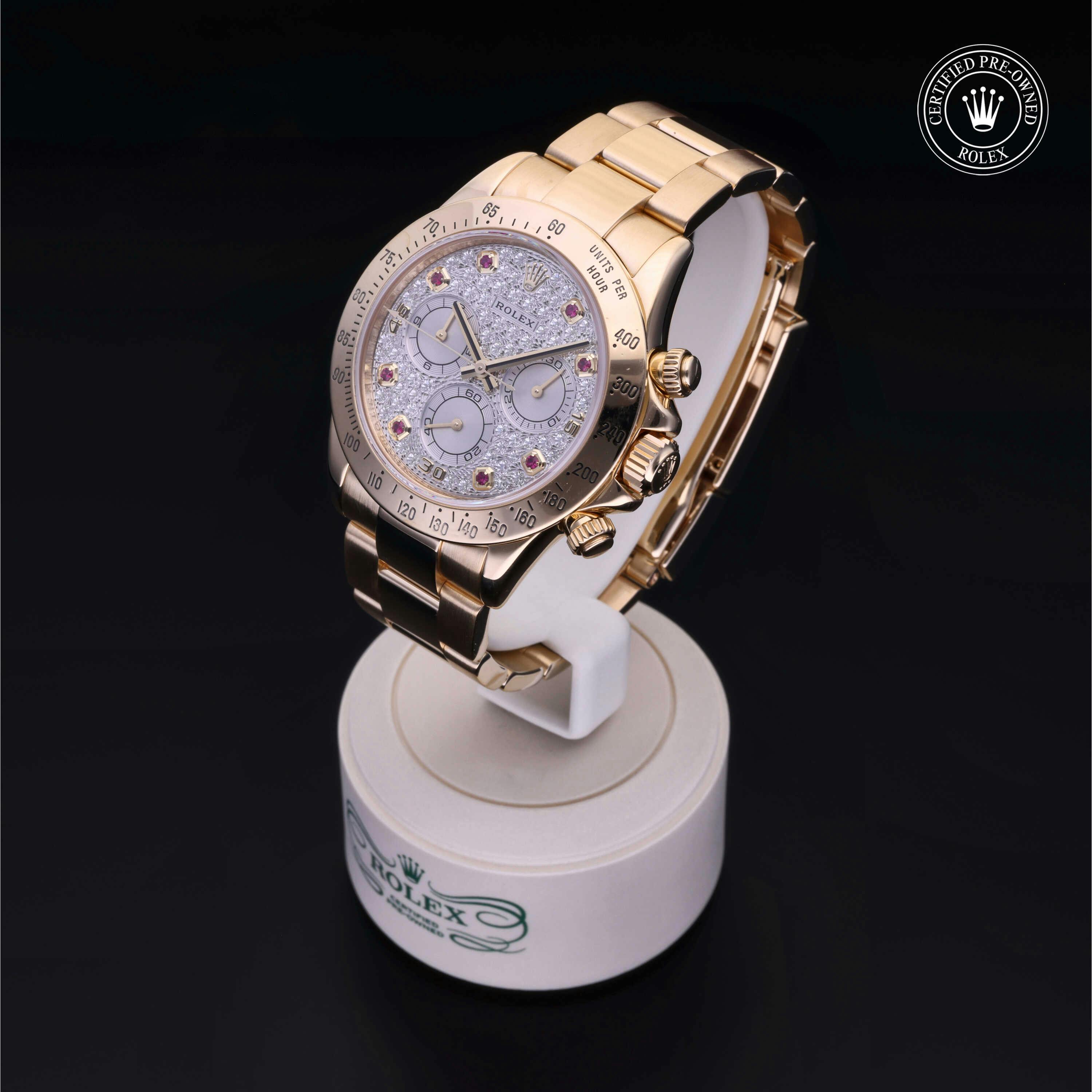 Rolex Certified Pre-Owned Cosmograph Daytona (116528) self - winding automatic watch, features a 40mm 18k yellow gold case and fixed bezel surrounding a pave diamond and ruby set dial on an 18k yellow gold oyster bracelet. Functions include hours, minutes, seconds and chronograph. This watch has received Rolex-authorized service and certification. It does not come with the original box or papers, but includes a custom Rolex Certified Pre-Owned hang tag, travel pouch and RCPO international warranty card.