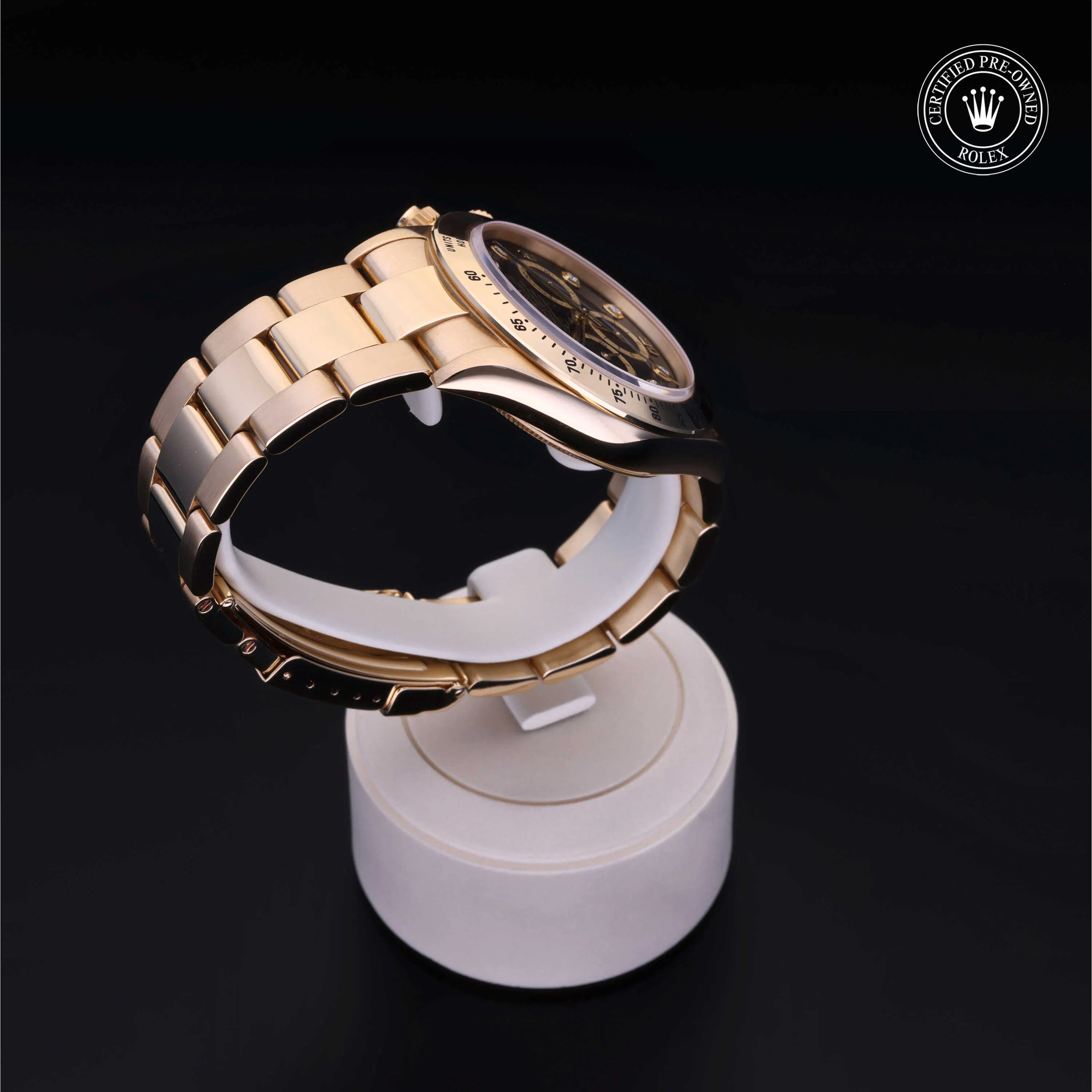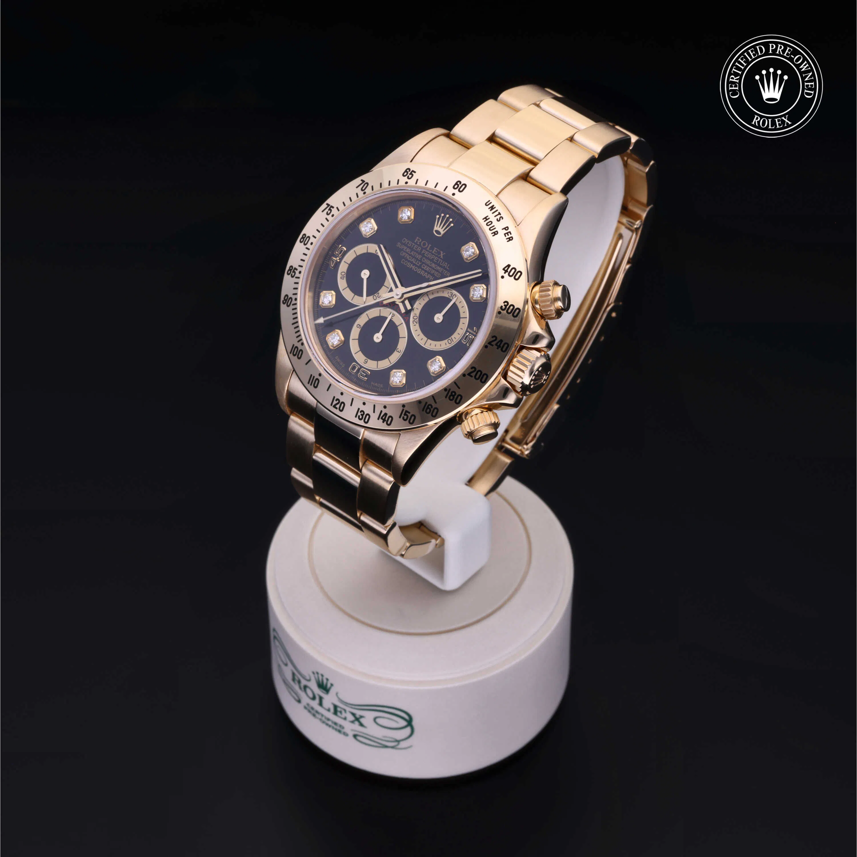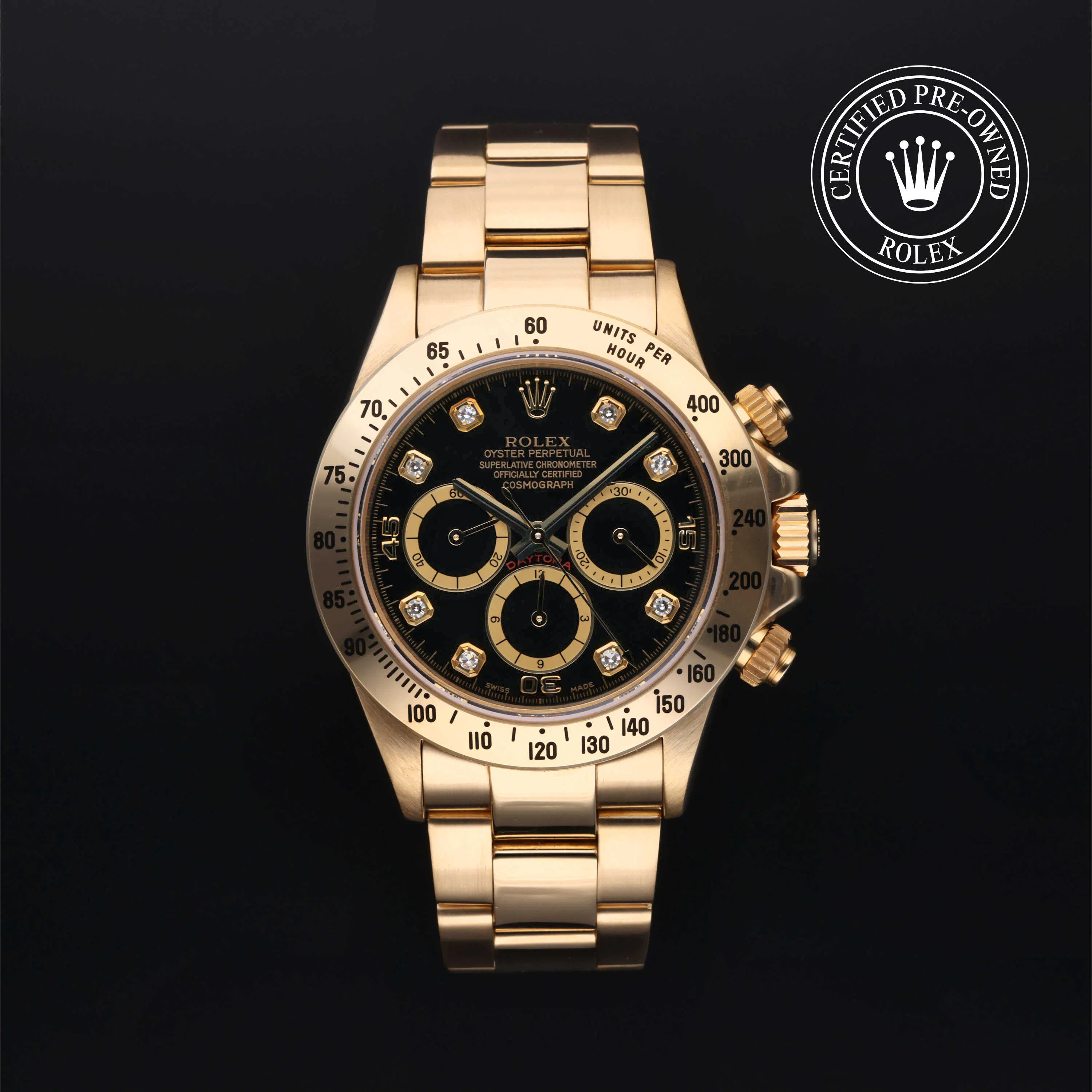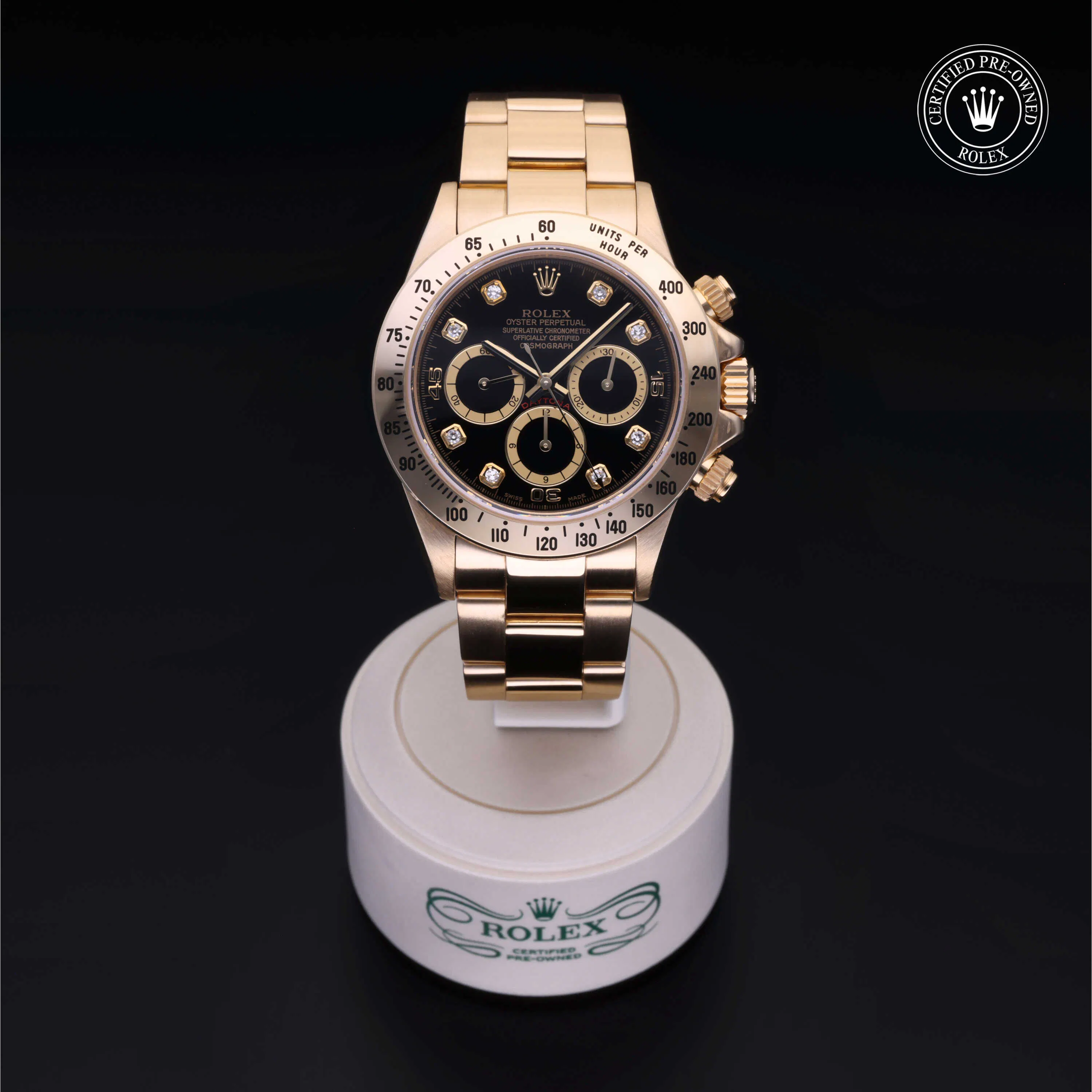 Rolex Certified Pre-Owned Cosmograph Daytona (16528) self - winding automatic watch, features a 40mm 18k yellow gold case and fixed bezel surrounding a black diamond set dial on an 18k yellow gold oyster bracelet. Functions include hours, minutes and seconds. This watch has received Rolex-authorized service and certification. It does not come with the original box or papers, but includes a custom Rolex Certified Pre-Owned hang tag, travel pouch and RCPO international warranty card.