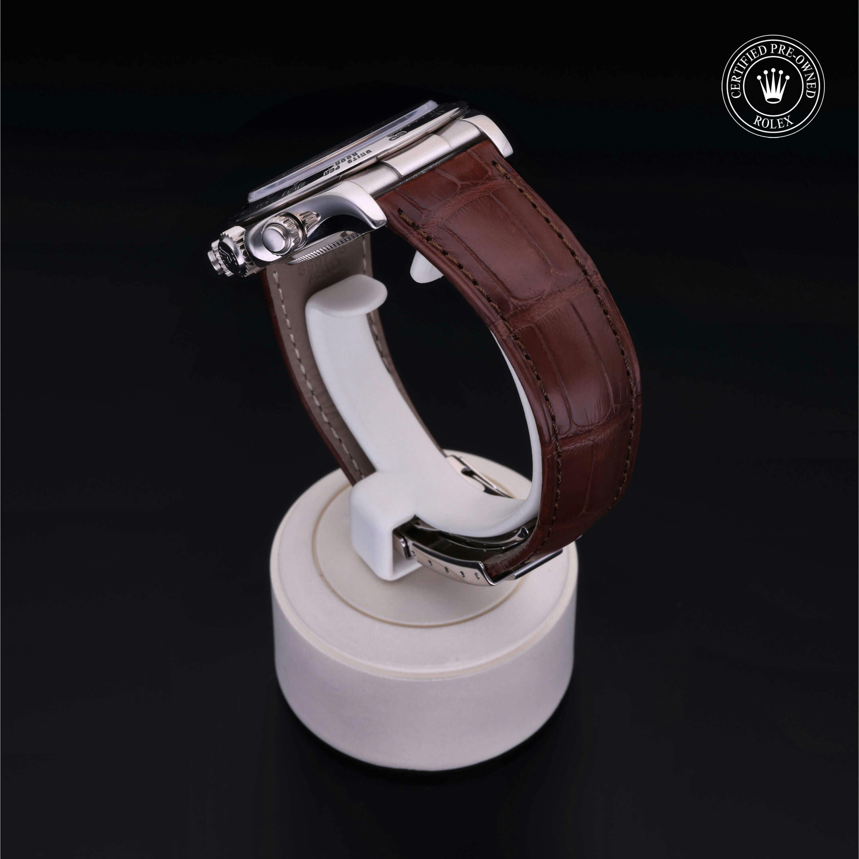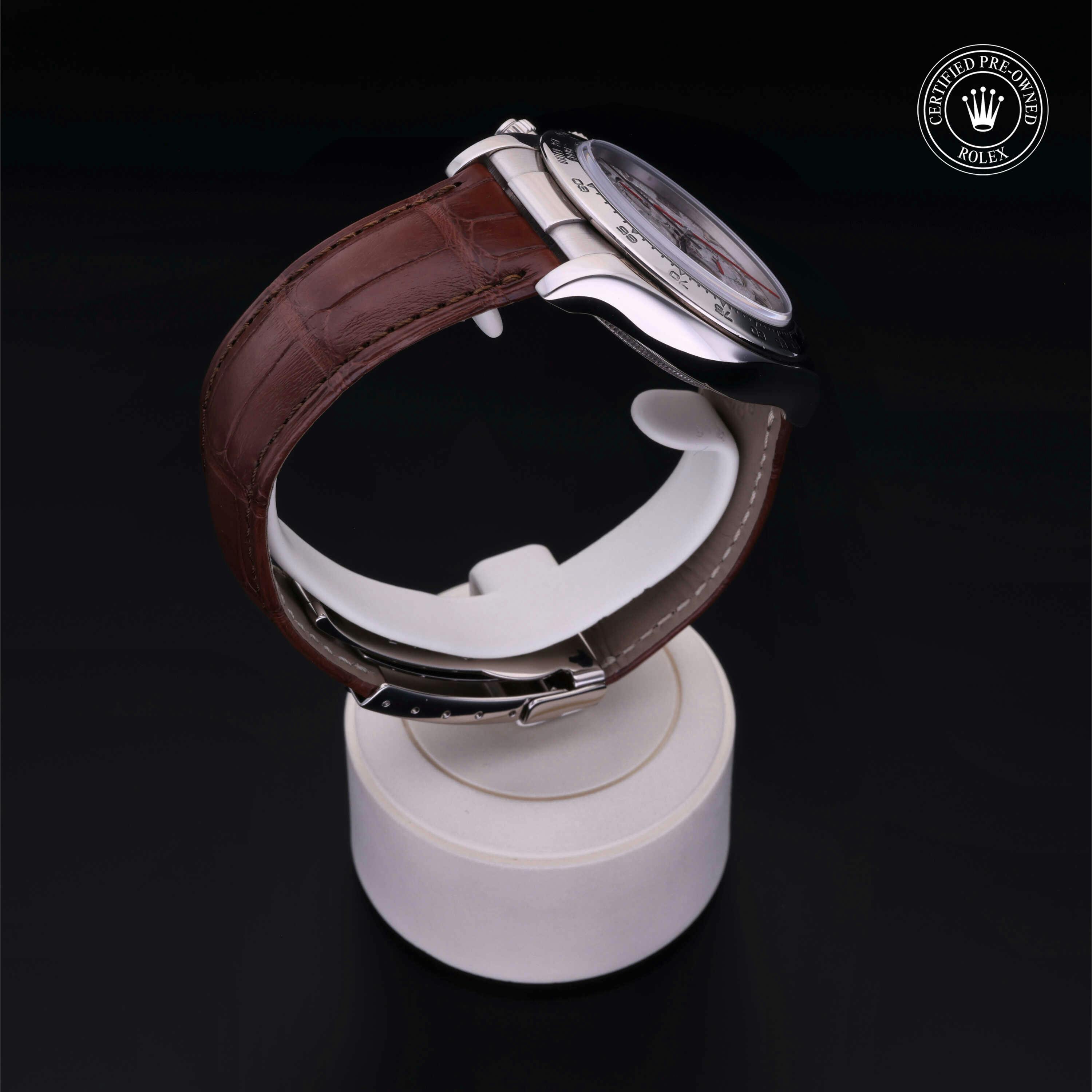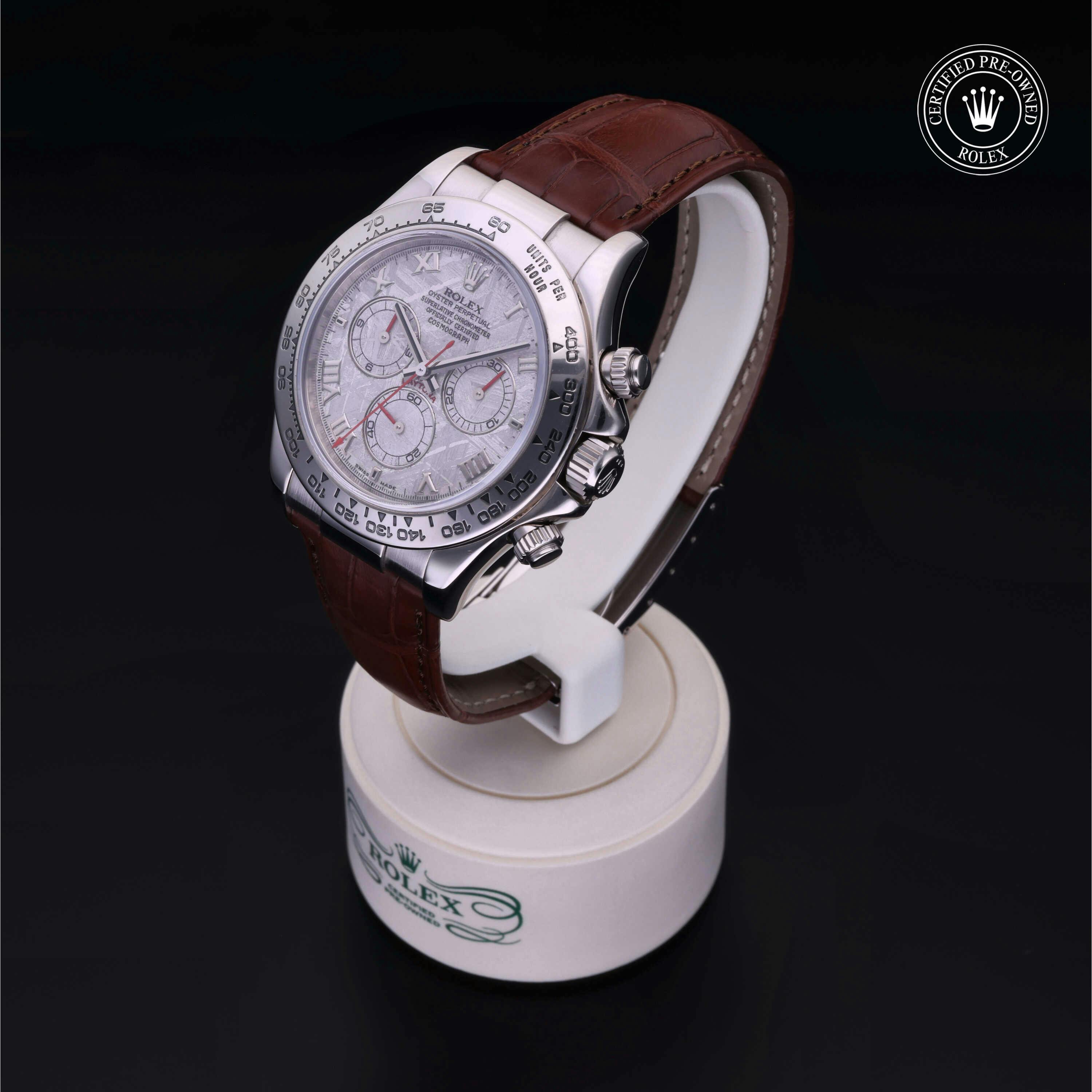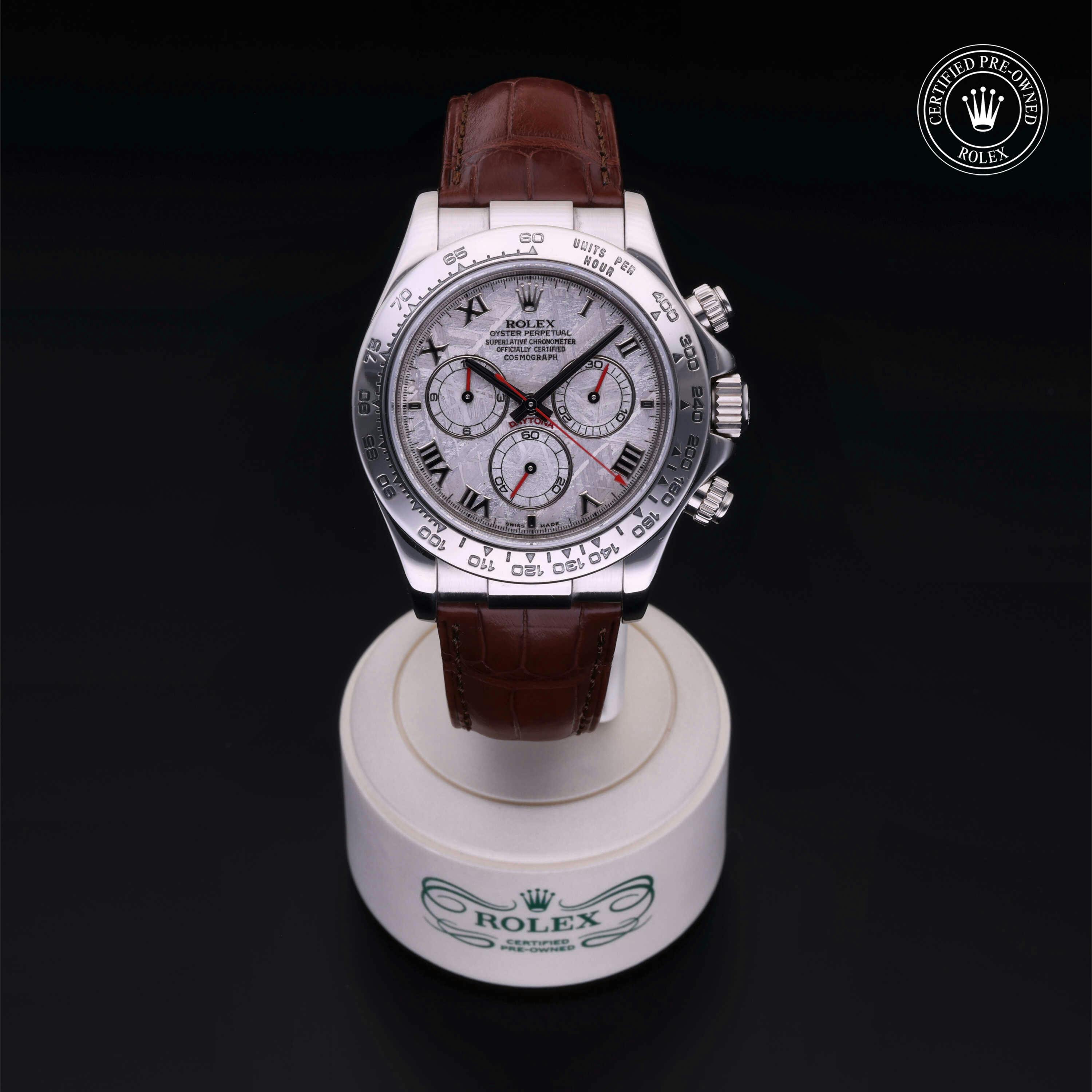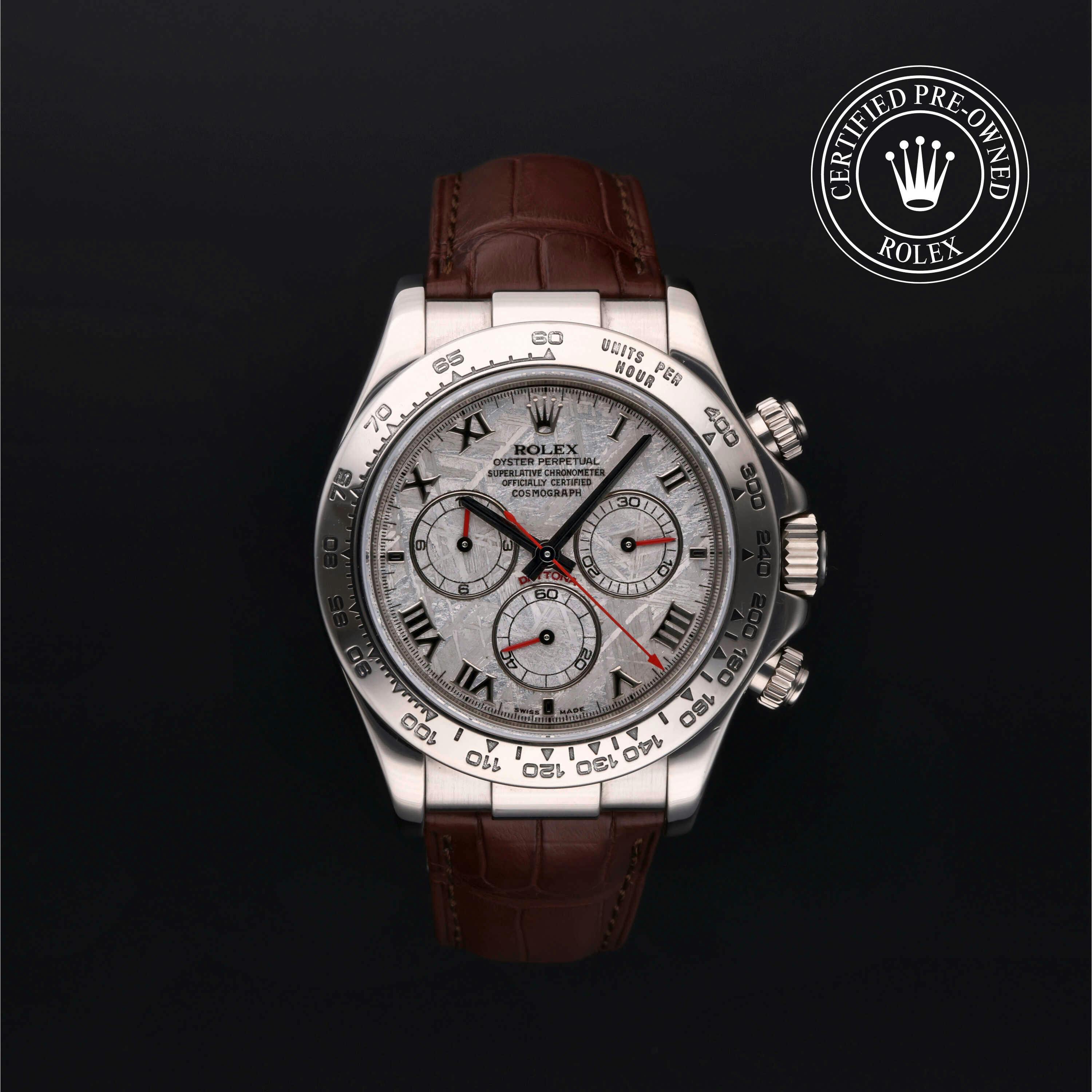 Rolex Certified Pre-Owned Cosmograph Daytona (116519) self - winding automatic watch, features a 40mm 18k white gold case surrounding a meteorite dial on a brown alligator strap with an 18k white gold deployant buckle. Functions include hours, minutes, seconds and chronograph. This watch has received Rolex-authorized service and certification. It does not come with the original box or papers, but includes a custom Rolex Certified Pre-Owned hang tag, travel pouch and RCPO international warranty card.