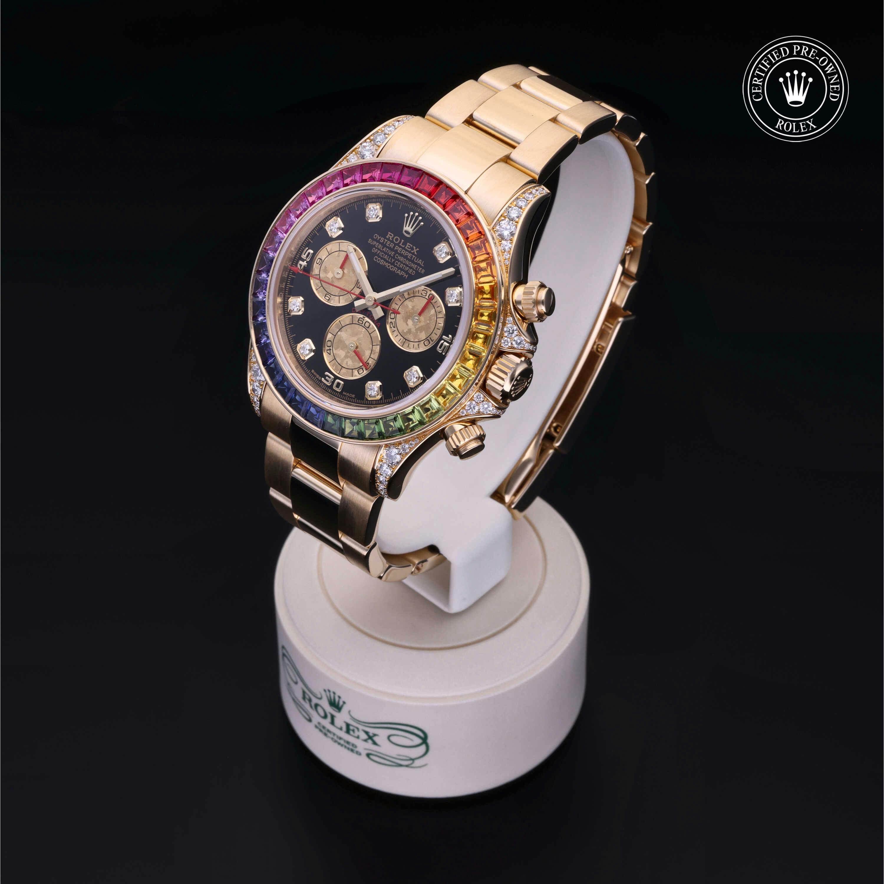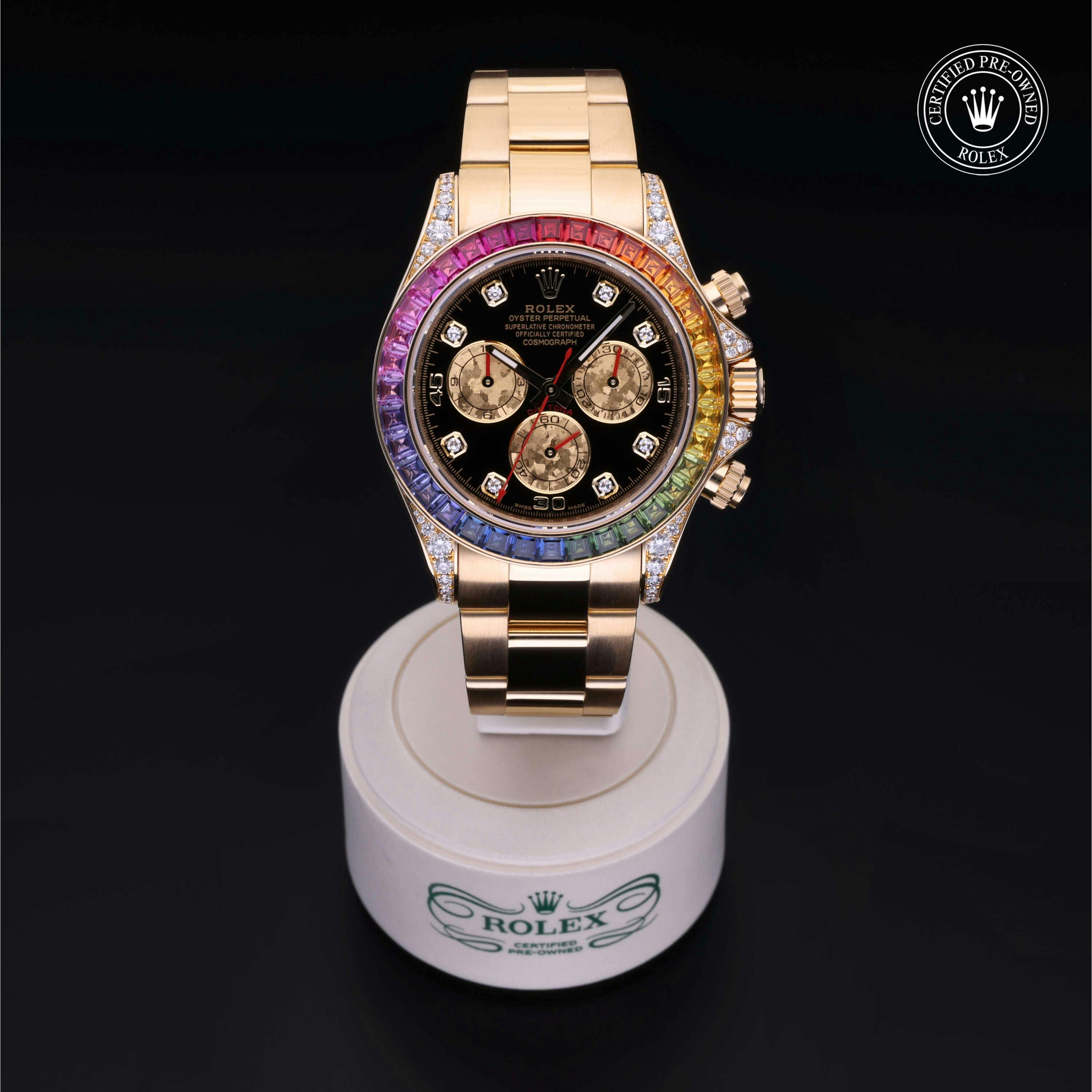 Rolex Certified Pre-Owned Cosmograph Daytona "Rainbow" (116598RBOW) self - winding automatic watch, features a 40mm 18k yellow gold diamond set case with a multi-color sapphire set bezel surrounding a black diamond set dial on an 18k yellow gold oyster bracelet. Functions include hours, minutes, seconds and chronograph. This watch has received Rolex-authorized service and certification. It comes with the original box, and includes a custom Rolex Certified Pre-Owned hang tag, travel pouch and RCPO international warranty card.
