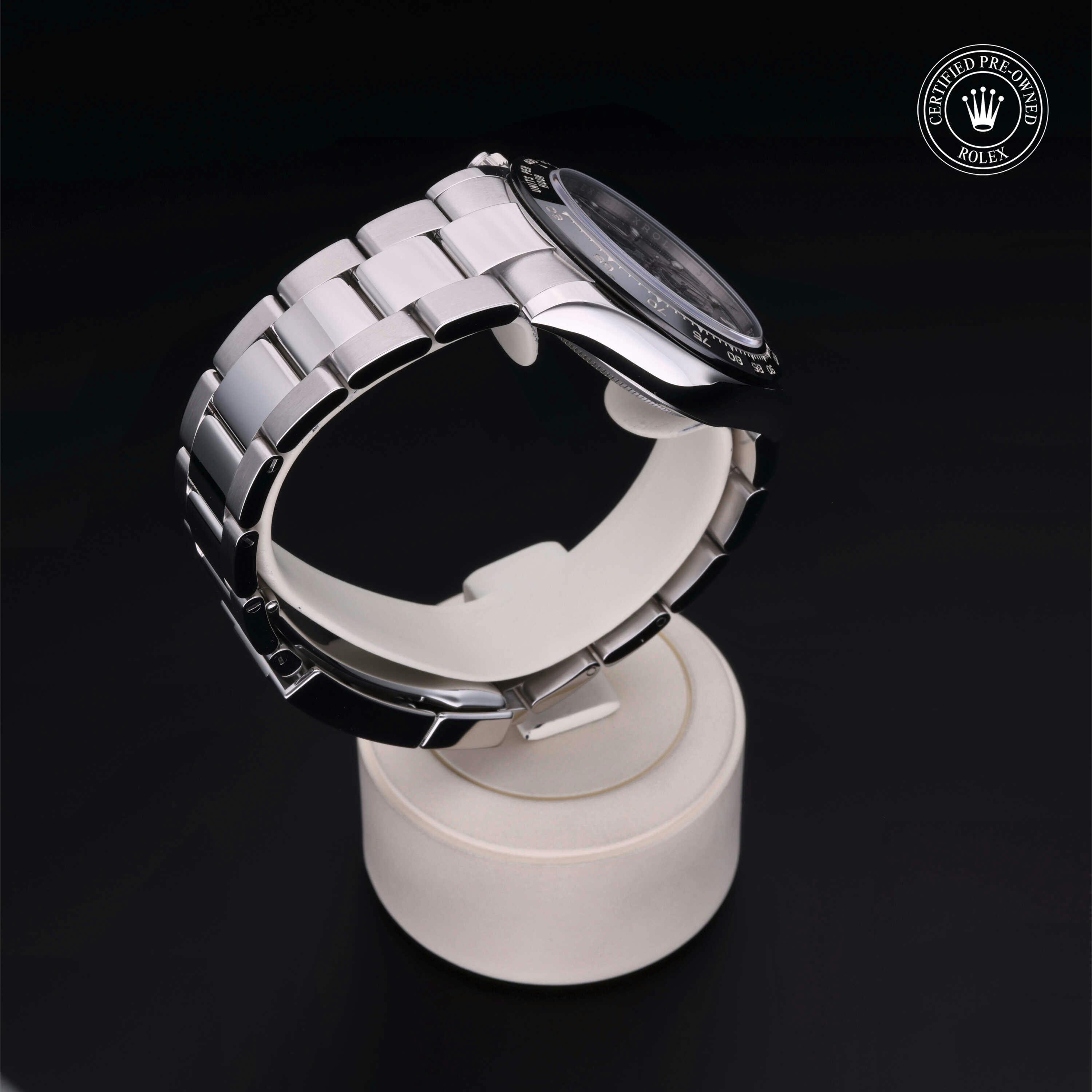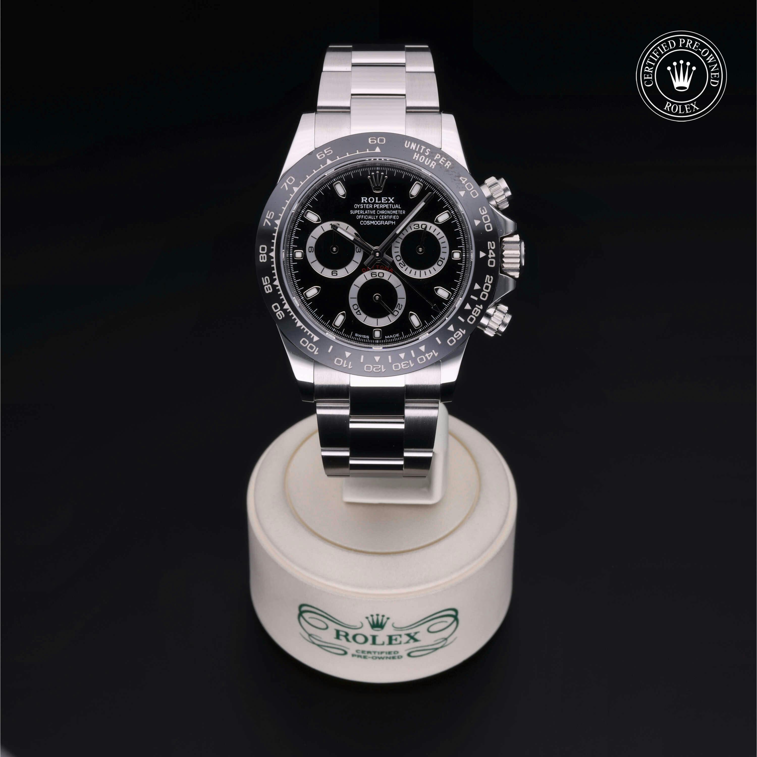 Rolex Certified Pre-Owned Cosmograph Daytona (116500LN) self - winding automatic watch, features a 40mm stainless steel case with a black cerachrom tachymetric scale bezel surrounding a black dial on a stainless steel oyster bracelet. Functions include hours, minutes, seconds, chronograph and tachymeter. This watch has received Rolex-authorized service and certification. It comes with the original box and papers, and includes a custom Rolex Certified Pre-Owned hang tag, travel pouch and RCPO international warranty card.