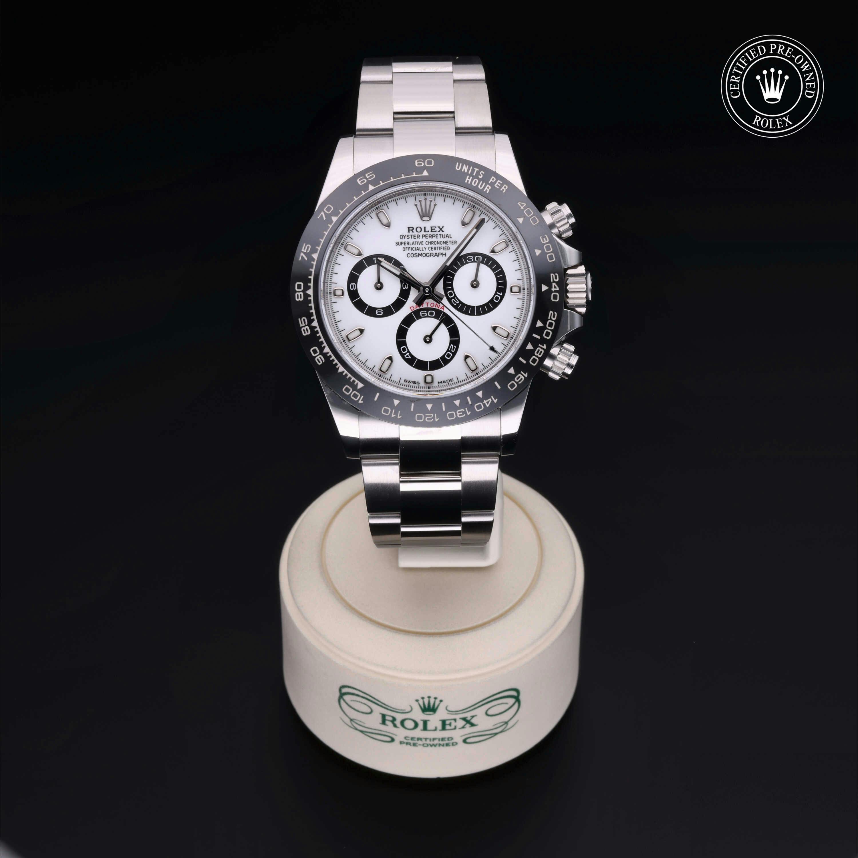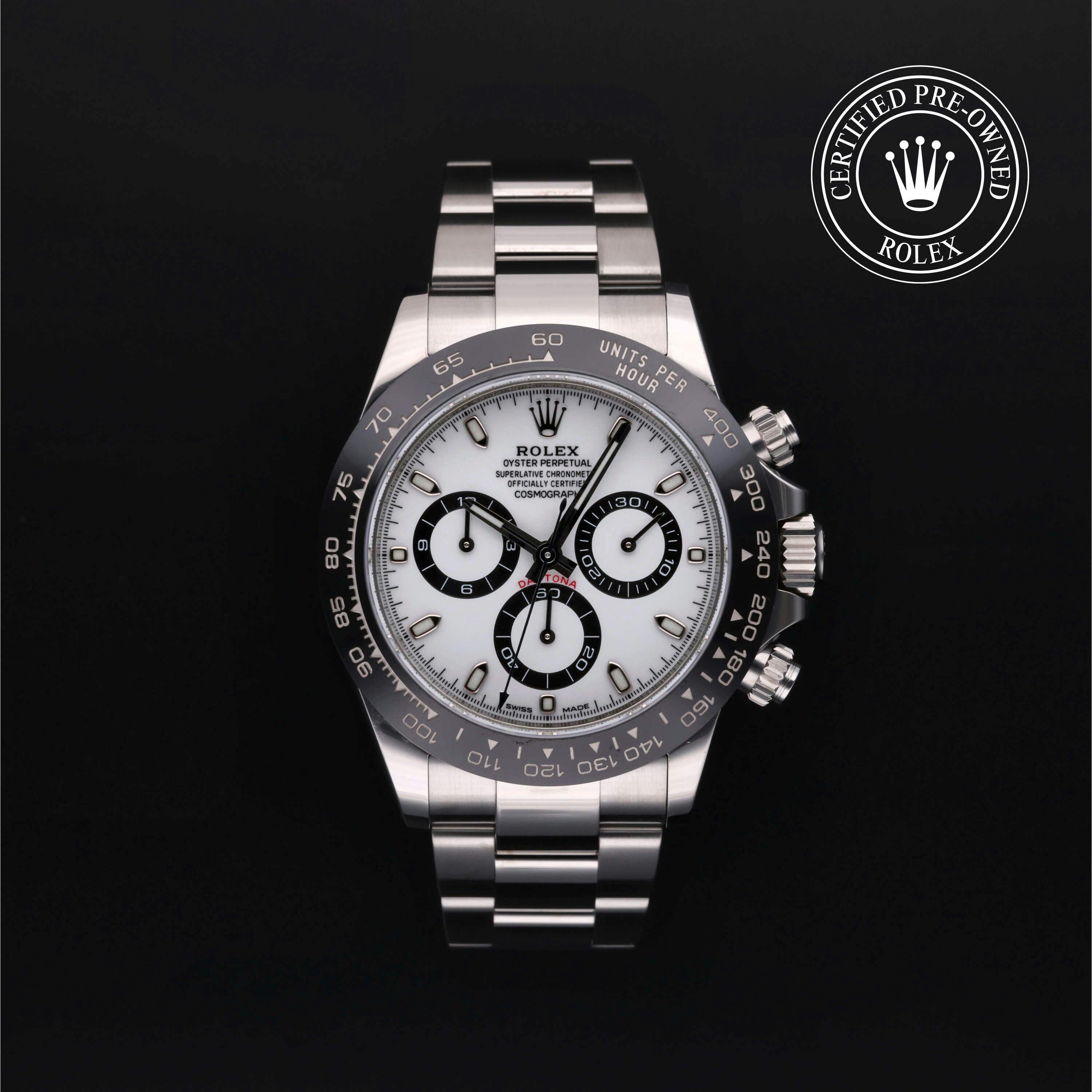 Rolex Certified Pre-Owned Cosmograph Daytona (116500LN) self - winding automatic watch, features a 40mm stainless steel case with a black cerachrom tachymetric scale bezel surrounding a white dial on a stainless steel oyster bracelet. Functions include hours, minutes, seconds and chronograph. This watch has received Rolex-authorized service and certification. It comes with the original box and papers, and includes a custom Rolex Certified Pre-Owned hang tag, travel pouch and RCPO international warranty card.
