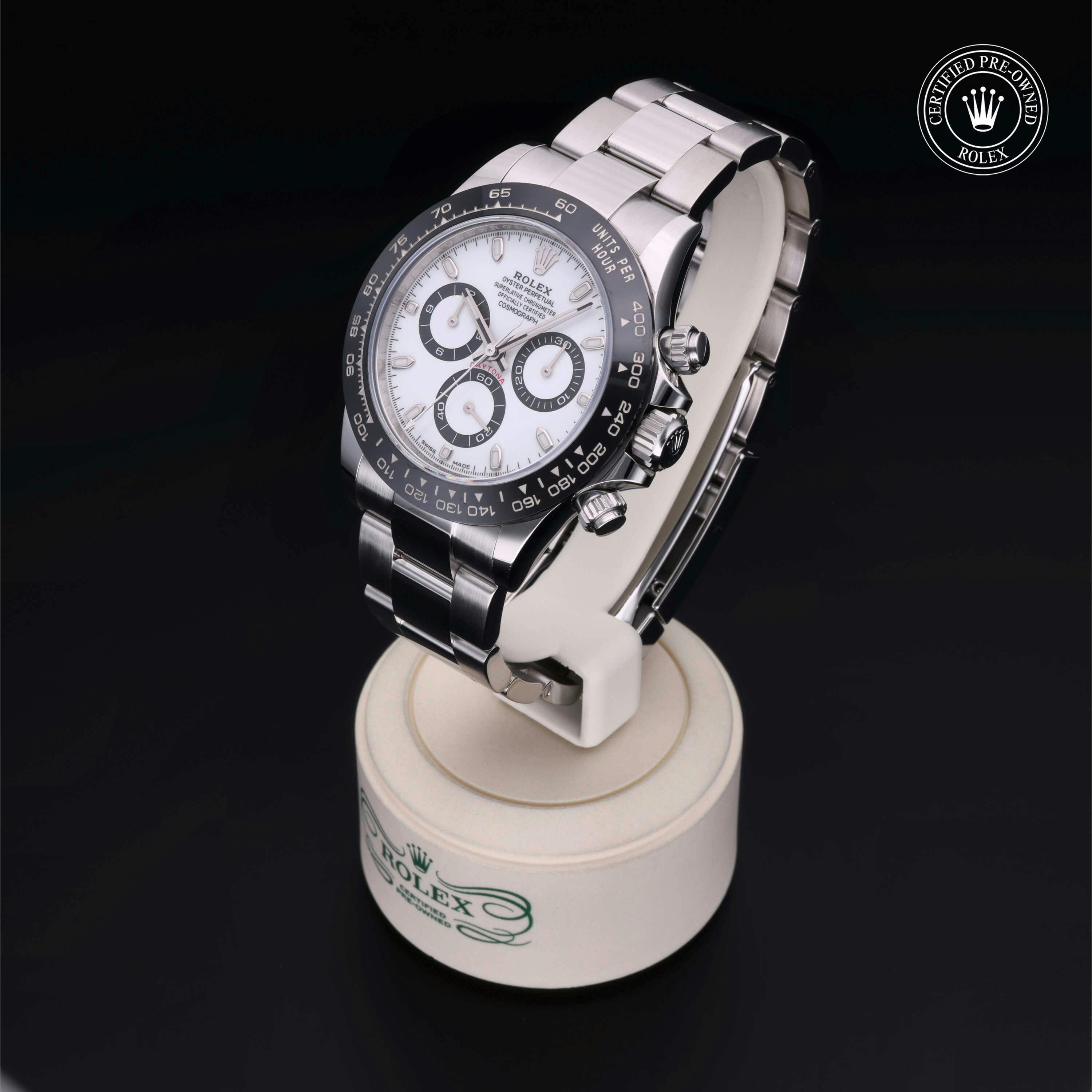 Rolex Certified Pre-Owned Cosmograph Daytona (116500LN) self - winding automatic watch, features a 40mm stainless steel case with a black cerachrom tachymetric scale bezel surrounding a white dial on a stainless steel oyster bracelet. Functions include hours, minutes, seconds and chronograph. This watch has received Rolex-authorized service and certification. It comes with the original box and papers, and includes a custom Rolex Certified Pre-Owned hang tag, travel pouch and RCPO international warranty card.
