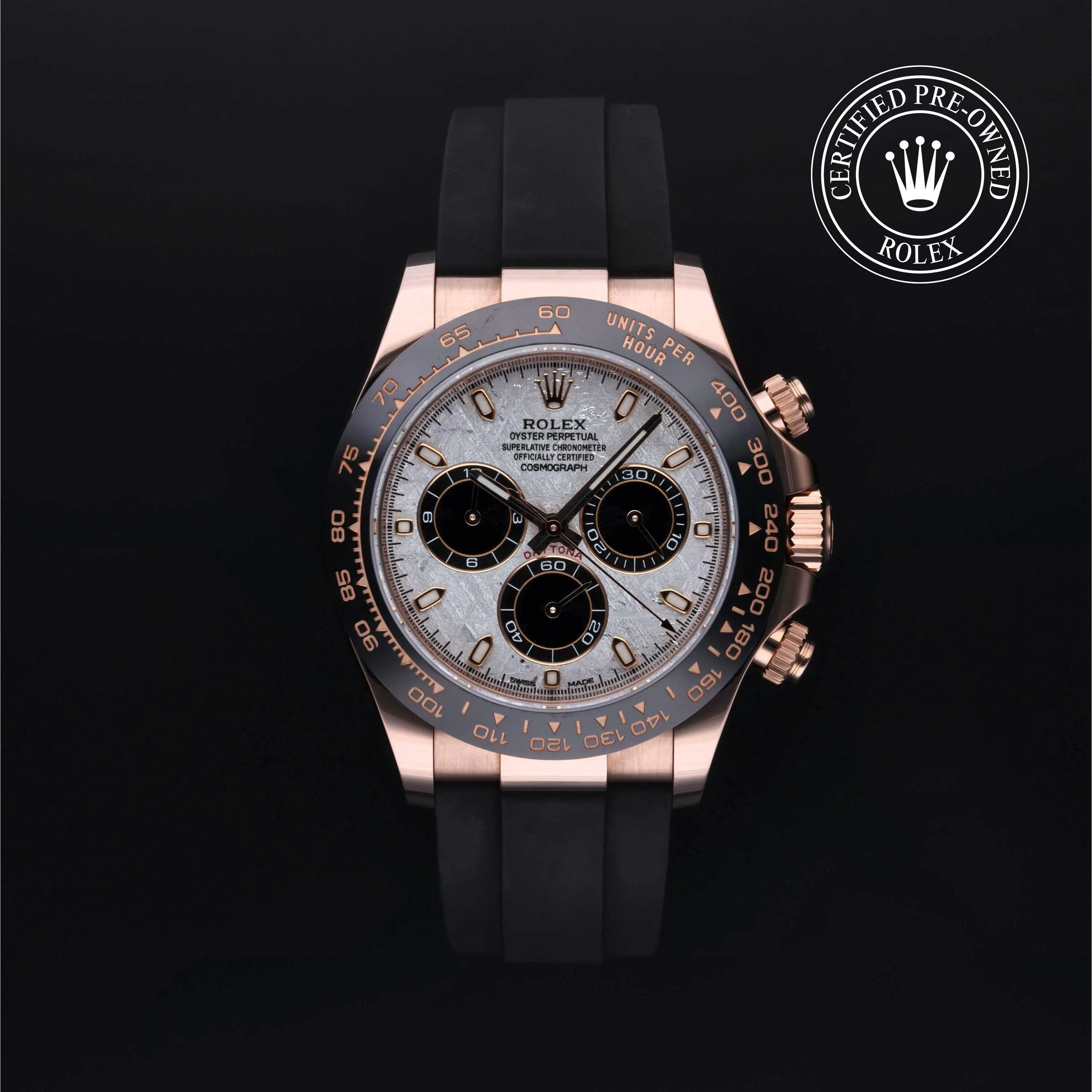 Rolex Certified Pre-Owned Cosmograph Daytona (116515LN) self - winding automatic watch, features a 40mm 18k rose gold case with a black cerachrom tachymetric scale bezel surrounding a meteorite dial on a black oysterflex strap with an 18k rose gold deployant buckle. Functions include hours, minutes, seconds and chronograph. This watch has received Rolex-authorized service and certification. It comes with the original papers, and includes a custom Rolex Certified Pre-Owned hang tag, travel pouch and RCPO international warranty card.