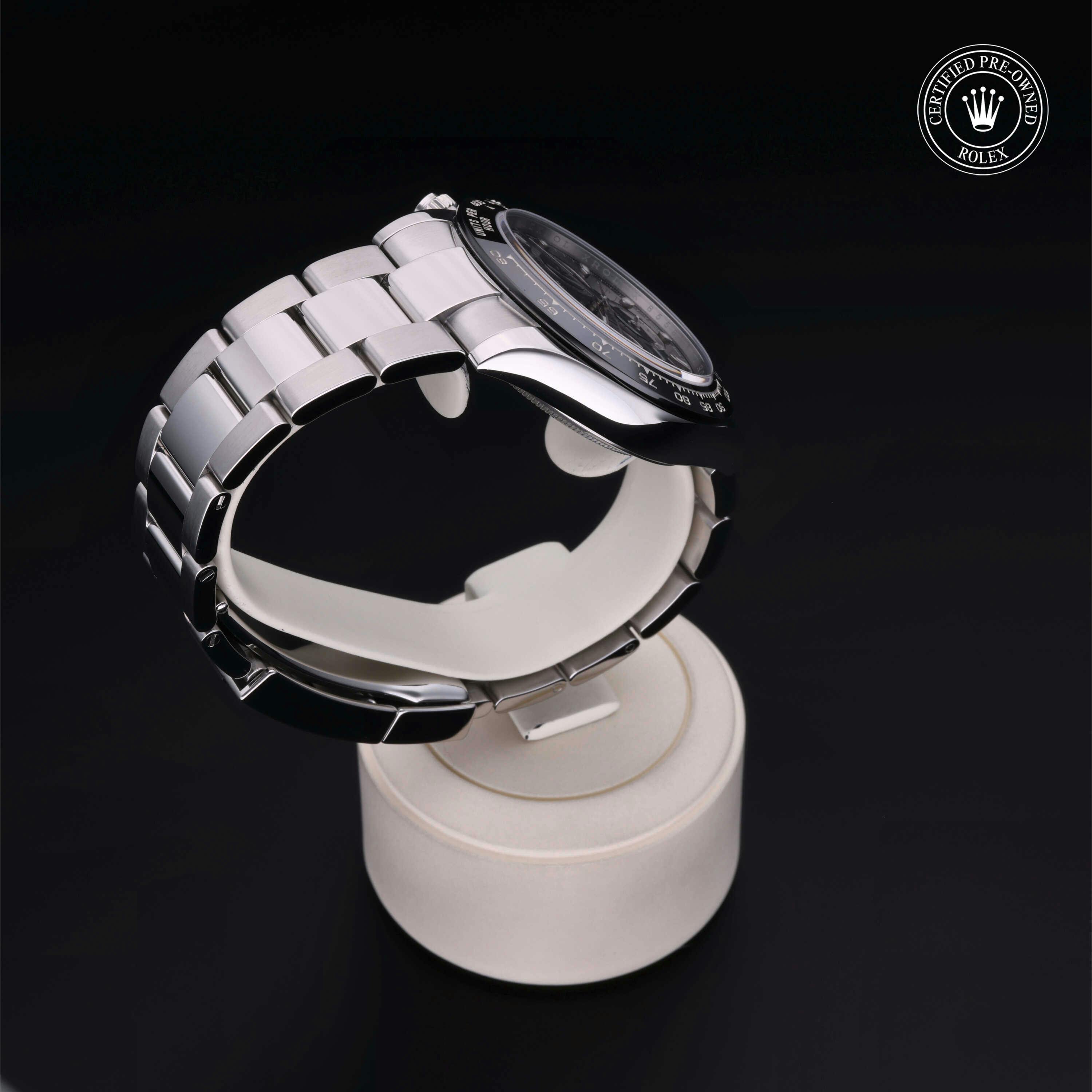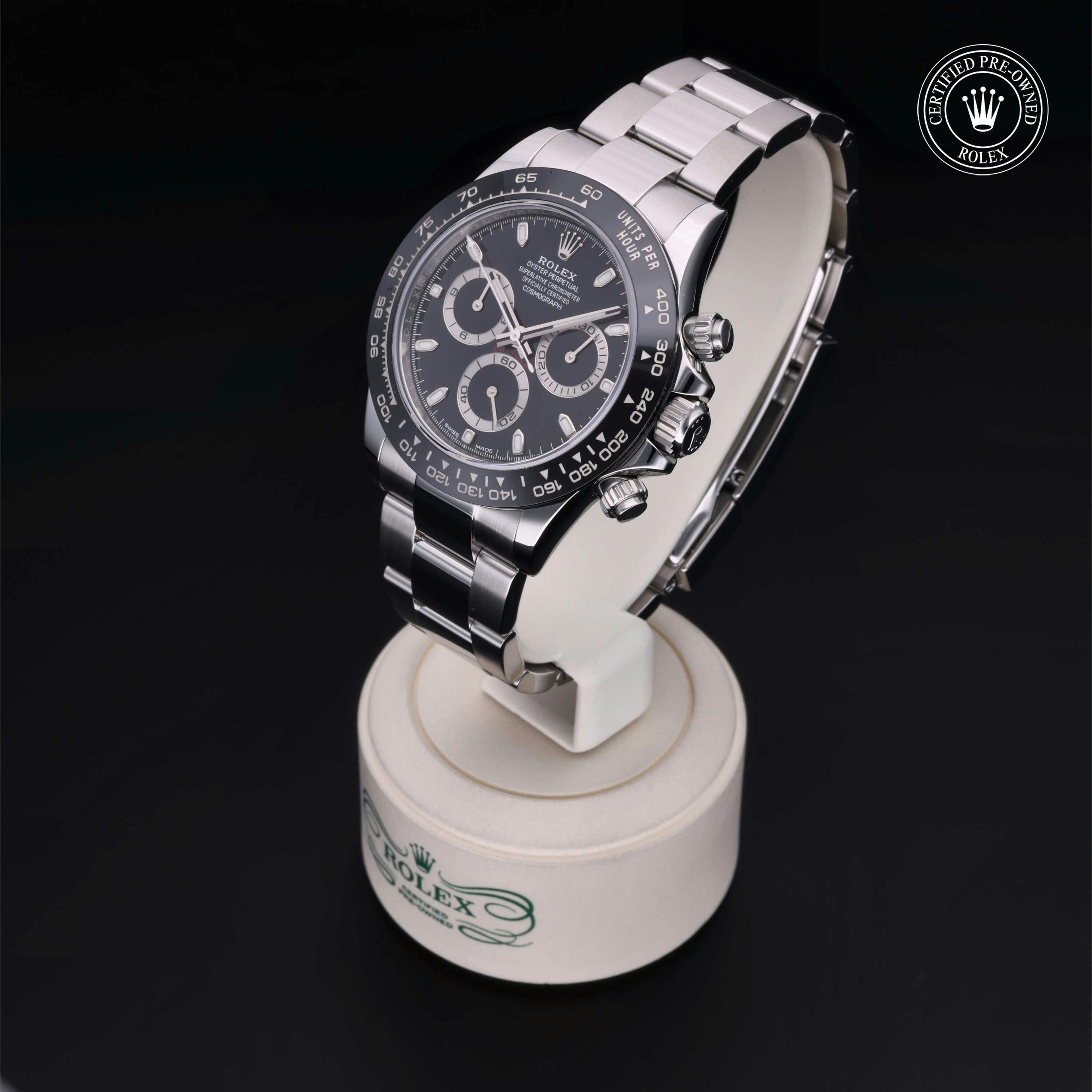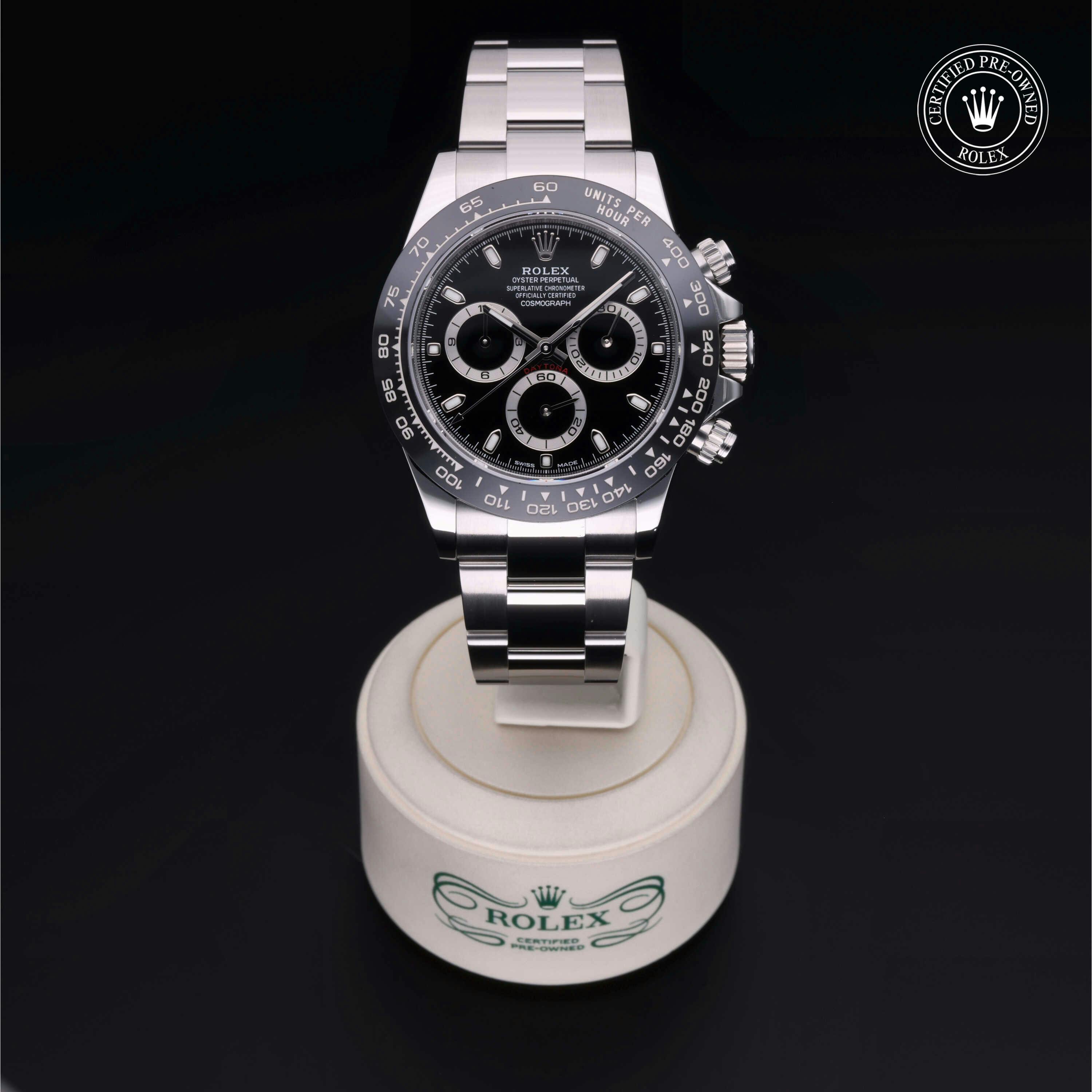 Rolex Certified Pre-Owned Cosmograph Daytona (116500LN) self - winding automatic watch, features a 40mm stainless steel case with a black cerachrom tachymetric scale bezel surrounding a black dial. The watch is secured on a stainless steel Oyster bracelet complete with a folding buckle. Functions include hours, minutes, seconds, chronograph and tachymeter. This watch has been serviced by an authorized service center and certified by Rolex. It comes with the original box and papers as well as a custom Rolex Certified Pre-Owned hang tag, travel pouch and international warranty card.