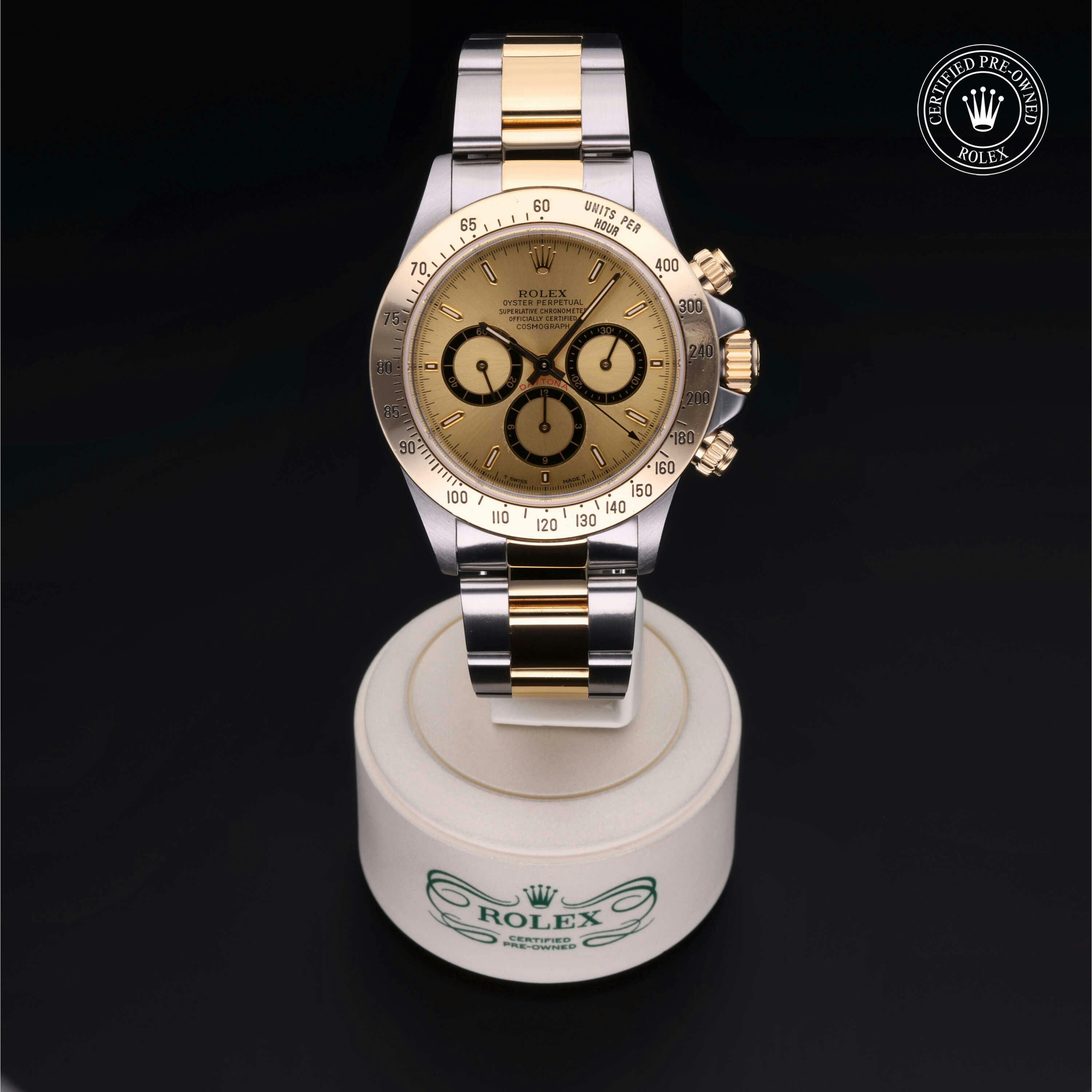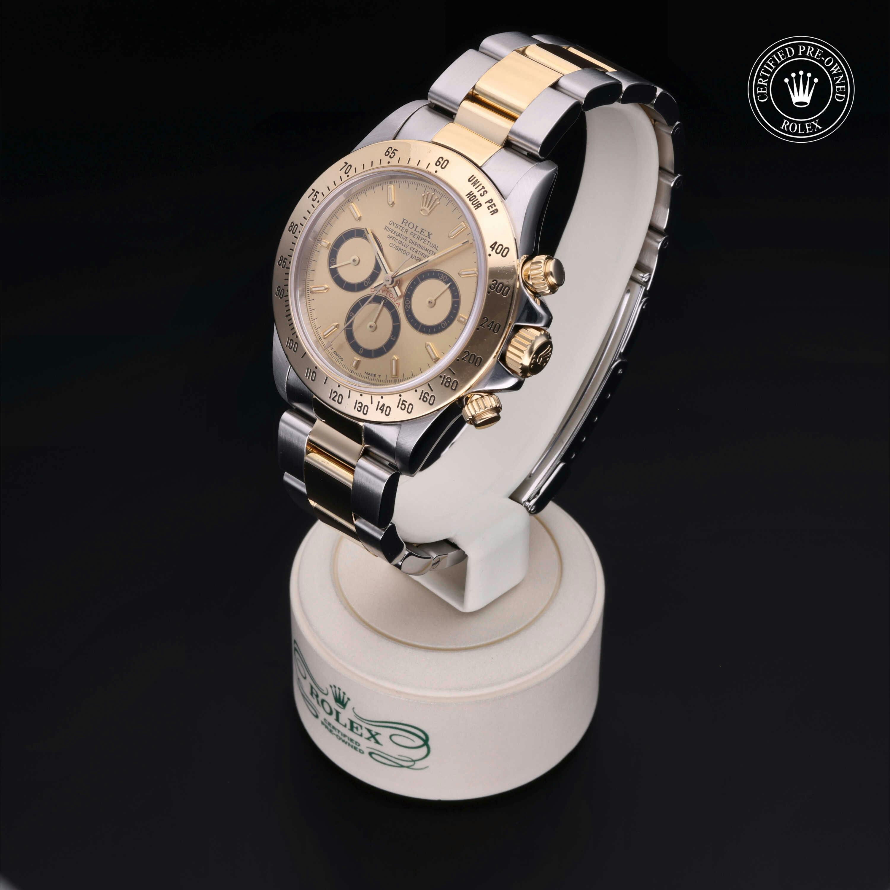 Rolex Certified Pre-Owned Cosmograph Daytona (16523) self - winding automatic watch, features a 40mm stainless steel case with an 18k yellow gold tachymetric scale bezel surrounding a champagne dial on a stainless steel and 18k yellow gold oyster bracelet. Functions include hours, minutes, seconds and chronograph. This watch has received Rolex-authorized service and certification. It does not come with the original box or papers, but includes a custom Rolex Certified Pre-Owned hang tag, travel pouch and RCPO international warranty card.
