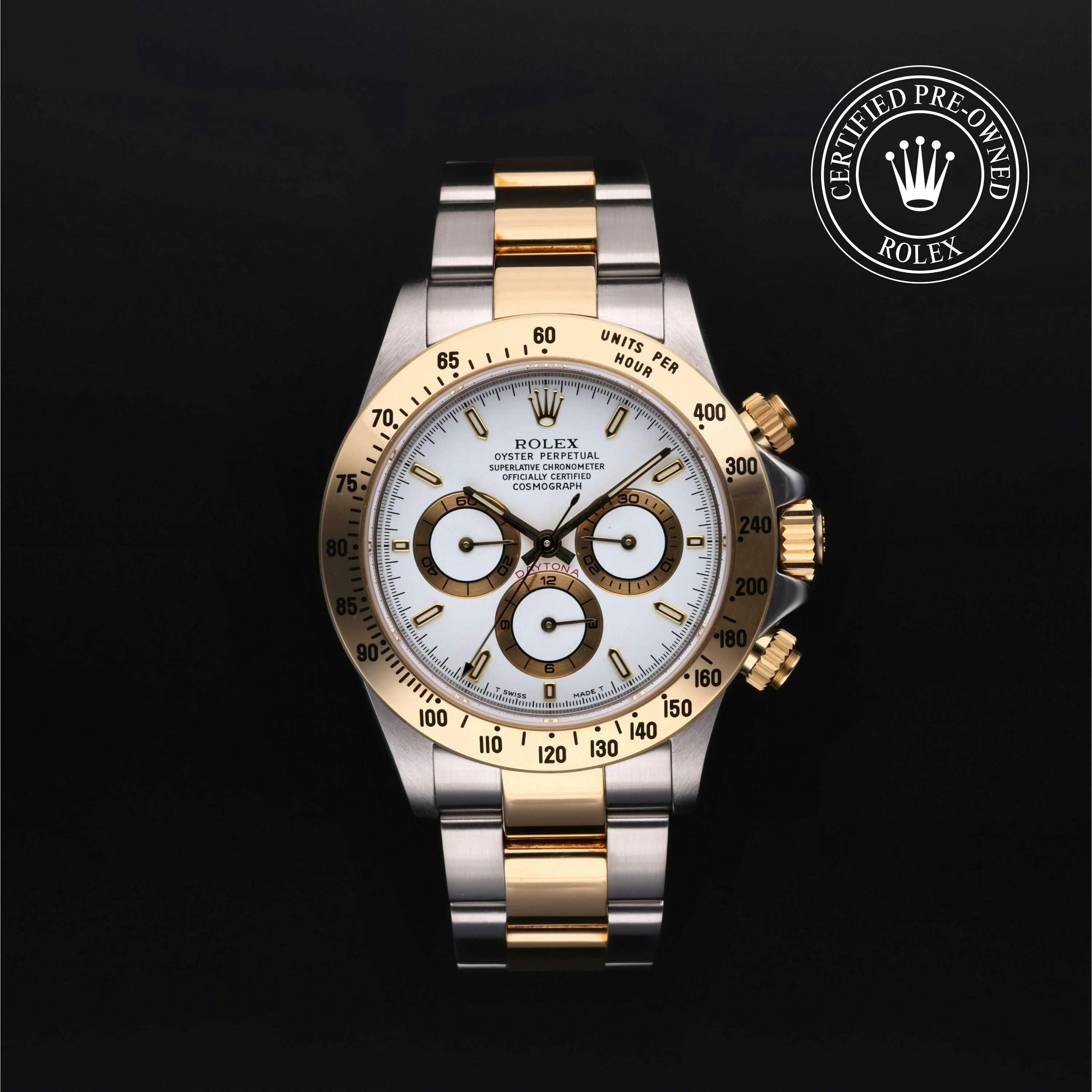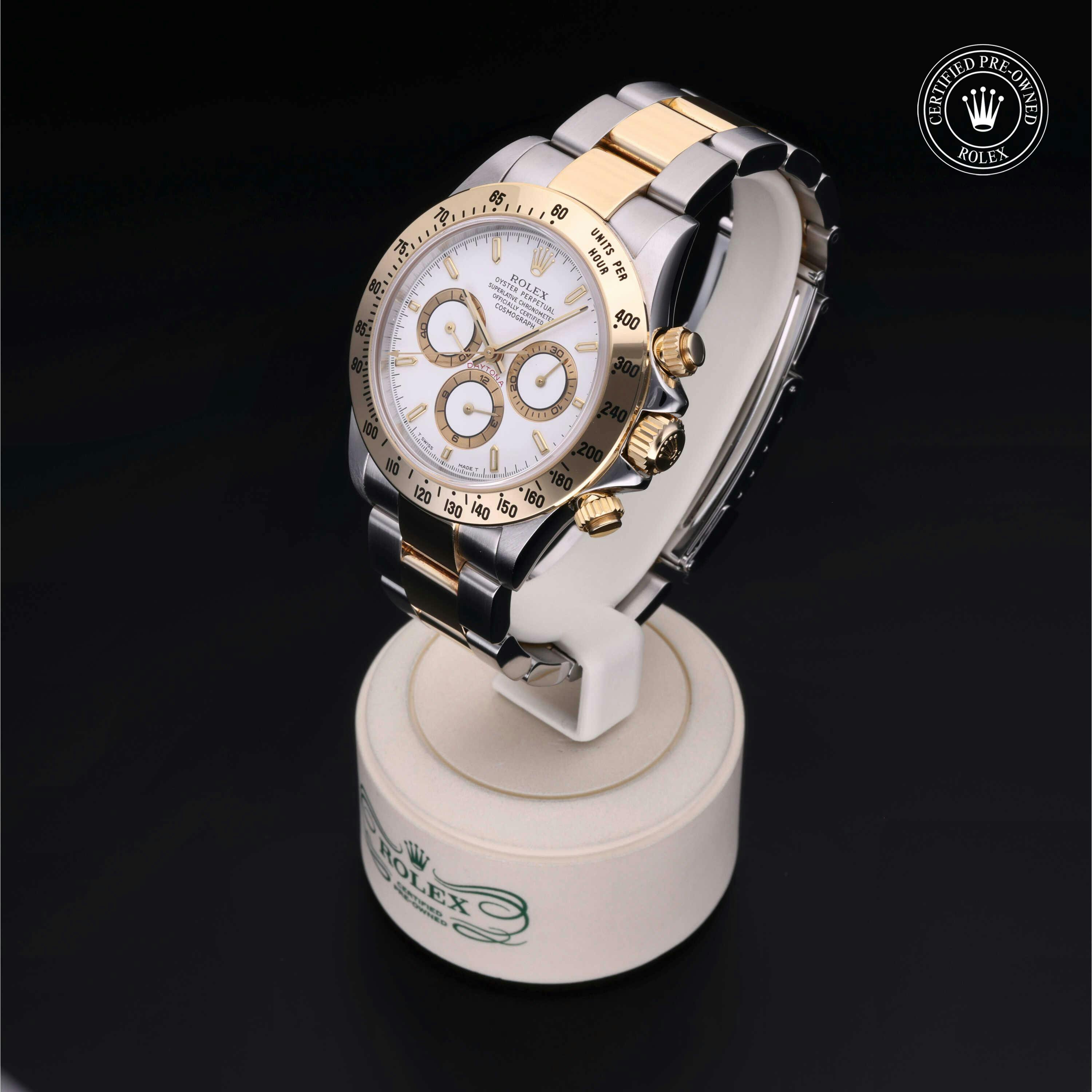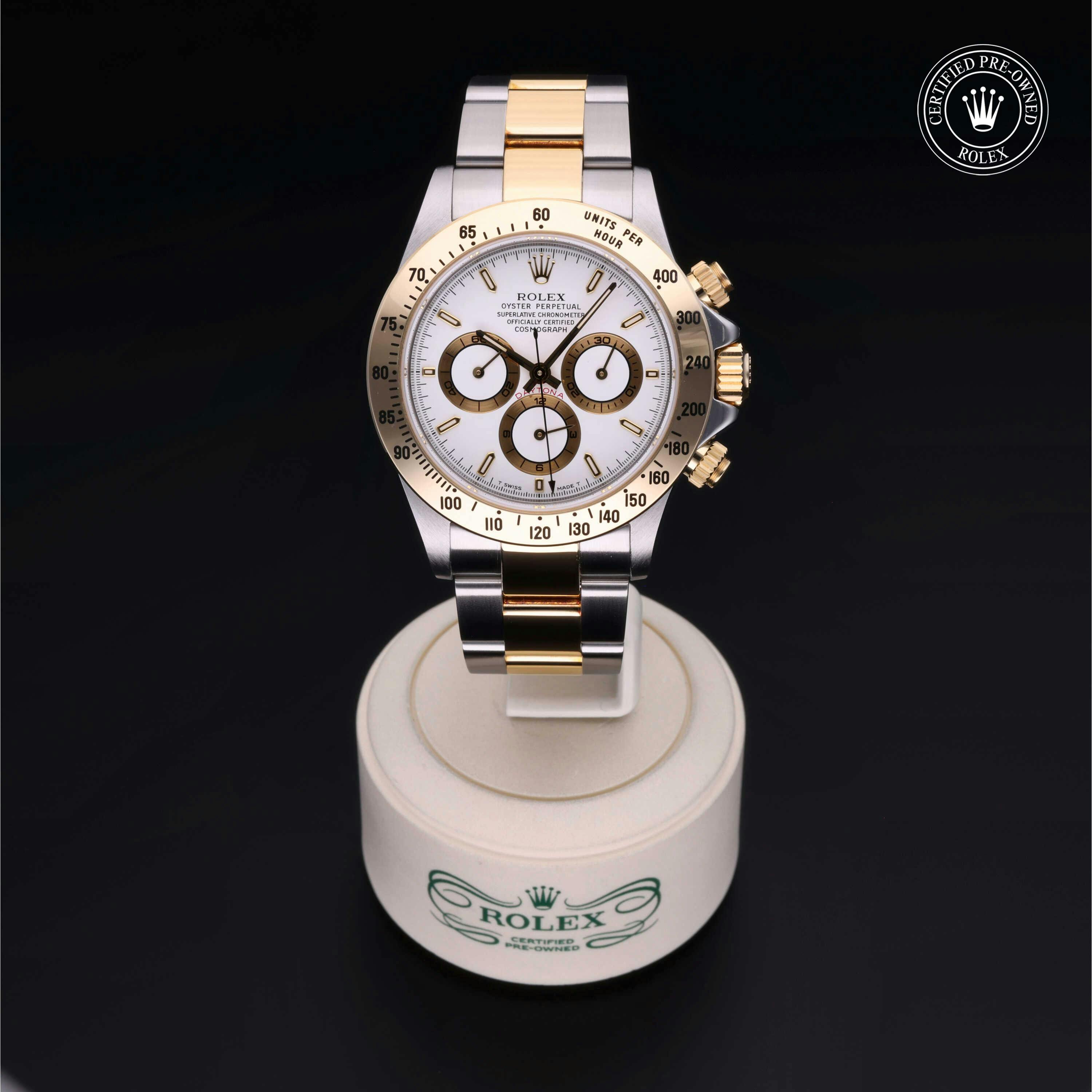 Rolex Certified Pre-Owned Cosmograph (16523) self - winding automatic watch, features a 40mm stainless steel case with an 18k yellow gold tachymetric scale bezel surrounding a white dial on a stainless steel and 18k yellow gold oyster bracelet. Functions include hours, minutes, seconds and chronograph. This watch has received Rolex-authorized service and certification. It does not come with the original box or papers, but includes a custom Rolex Certified Pre-Owned hang tag, travel pouch and RCPO international warranty card.