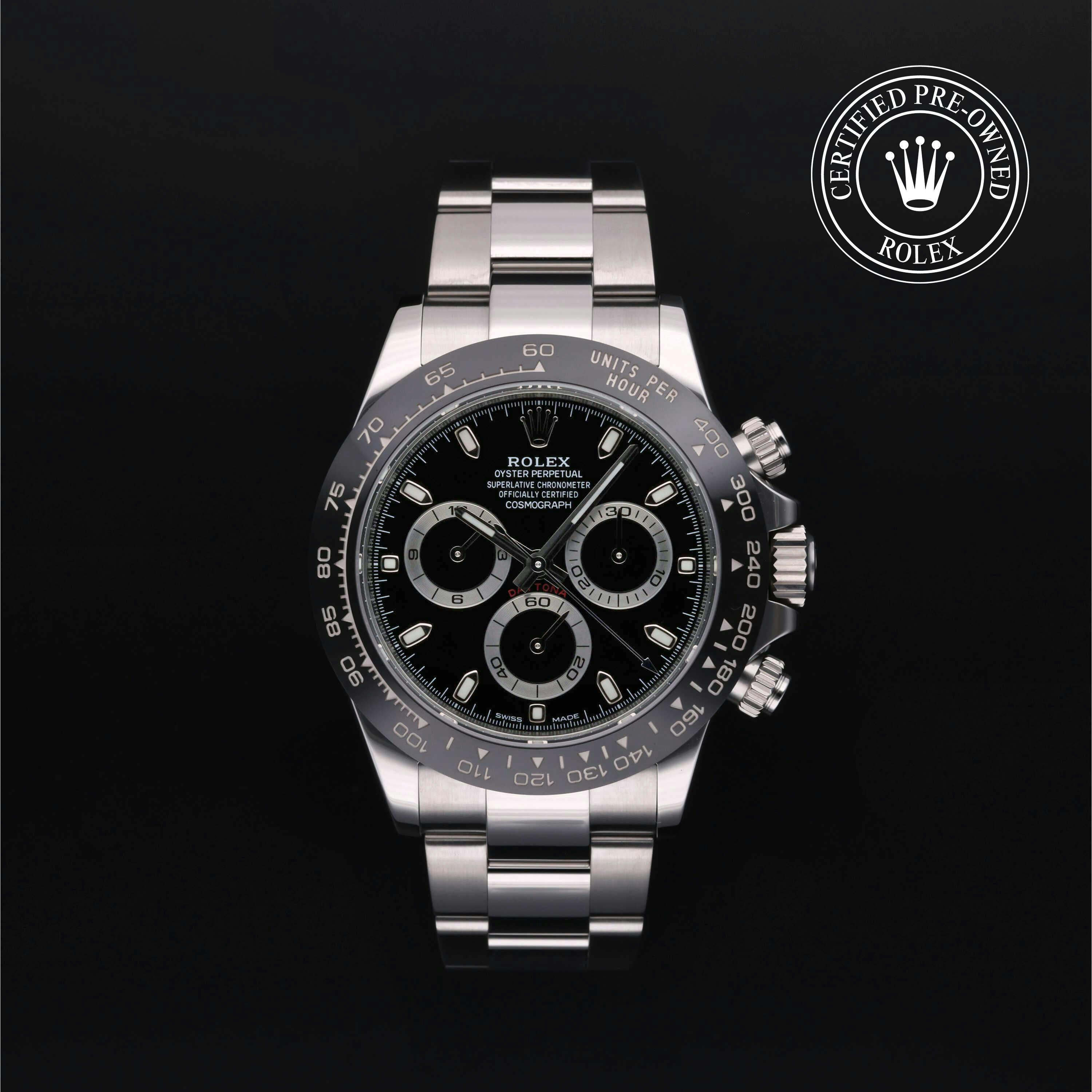 Rolex Certified Pre-Owned Cosmograph Daytona (116500LN) self - winding automatic watch, features a 40mm stainless steel case with a black cerachrom tachymetric scale bezel surrounding a black dial on a stainless steel oyster bracelet. Functions include hours, minutes, seconds, chronograph and tachymeter. This watch has received Rolex-authorized service and certification. It comes with the original papers, and includes a custom Rolex Certified Pre-Owned hang tag, travel pouch and RCPO international warranty card.