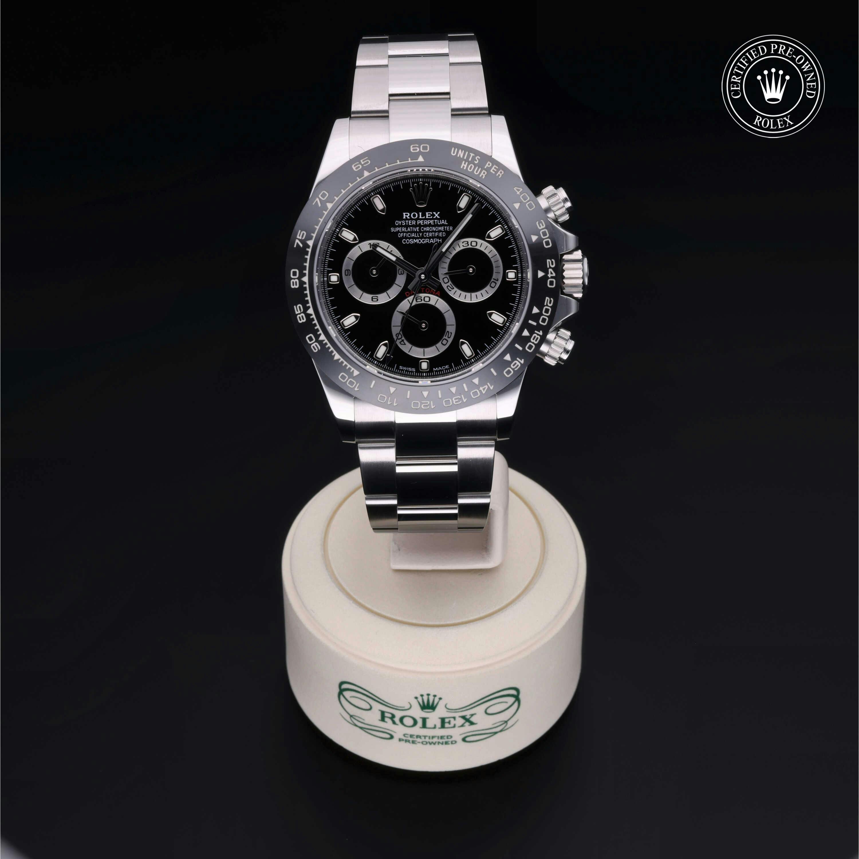 Rolex Certified Pre-Owned Cosmograph Daytona (116500LN) self - winding automatic watch, features a 40mm stainless steel case with a black cerachrom tachymetric scale bezel surrounding a black dial on a stainless steel oyster bracelet. Functions include hours, minutes, seconds, chronograph and tachymeter. This watch has received Rolex-authorized service and certification. It comes with the original papers, and includes a custom Rolex Certified Pre-Owned hang tag, travel pouch and RCPO international warranty card.