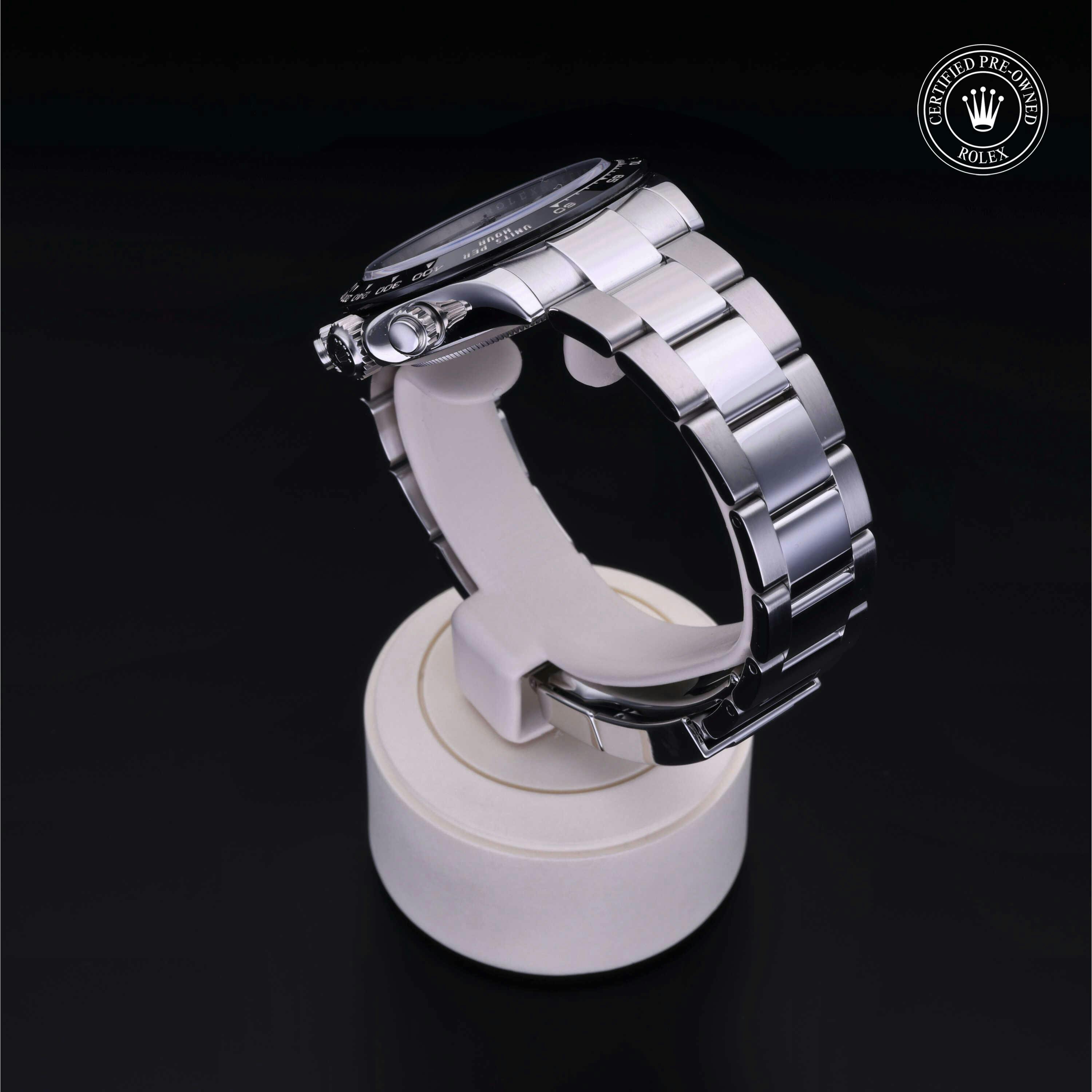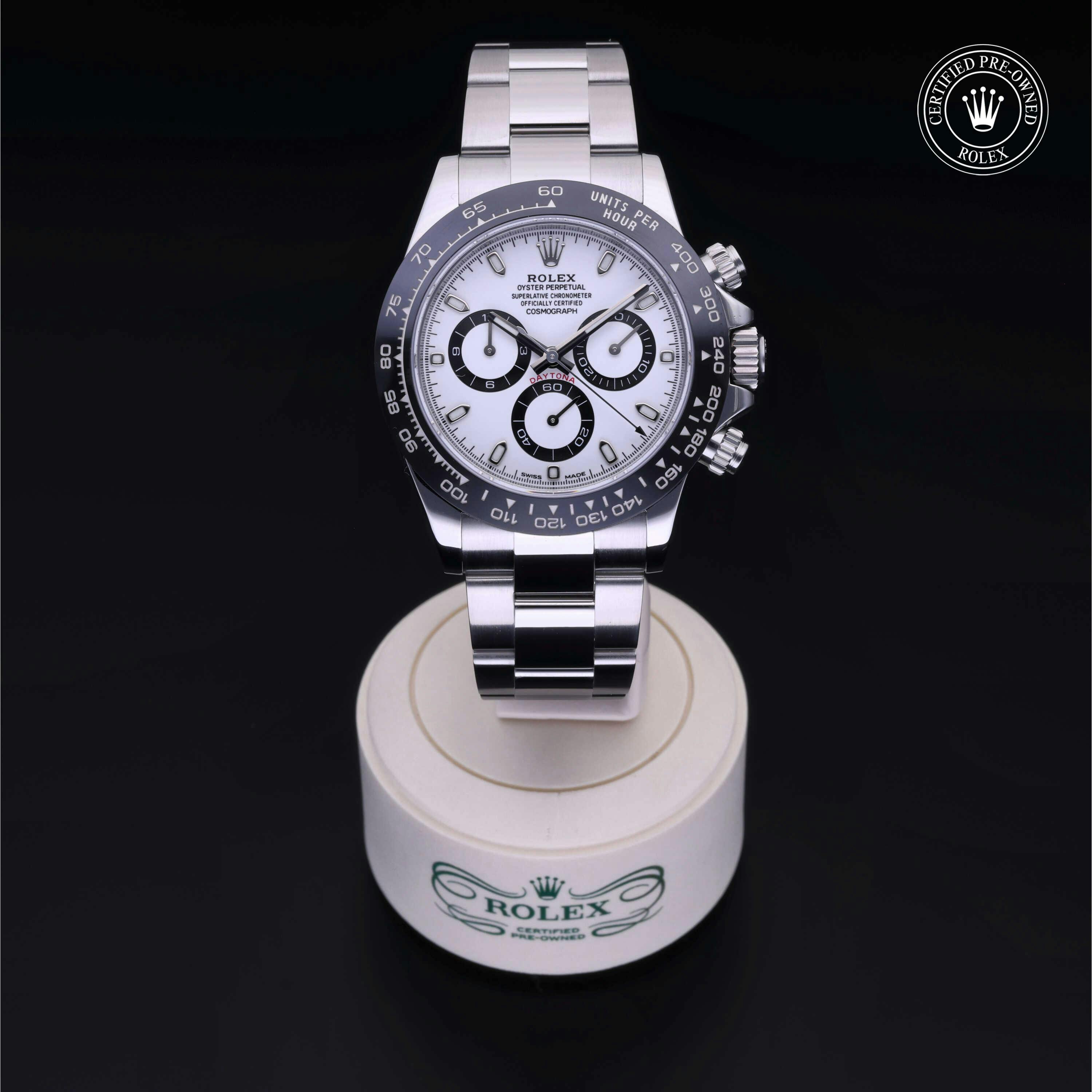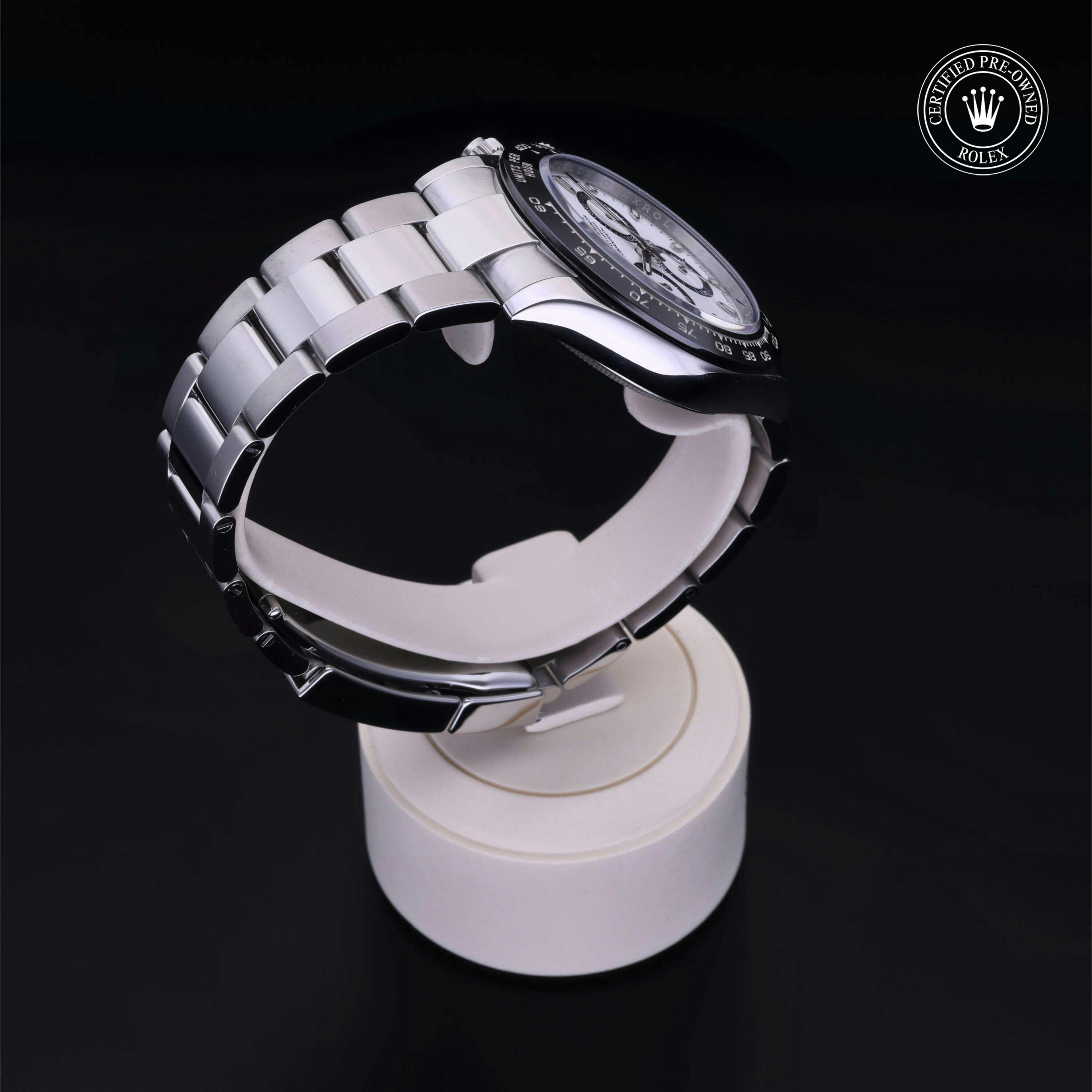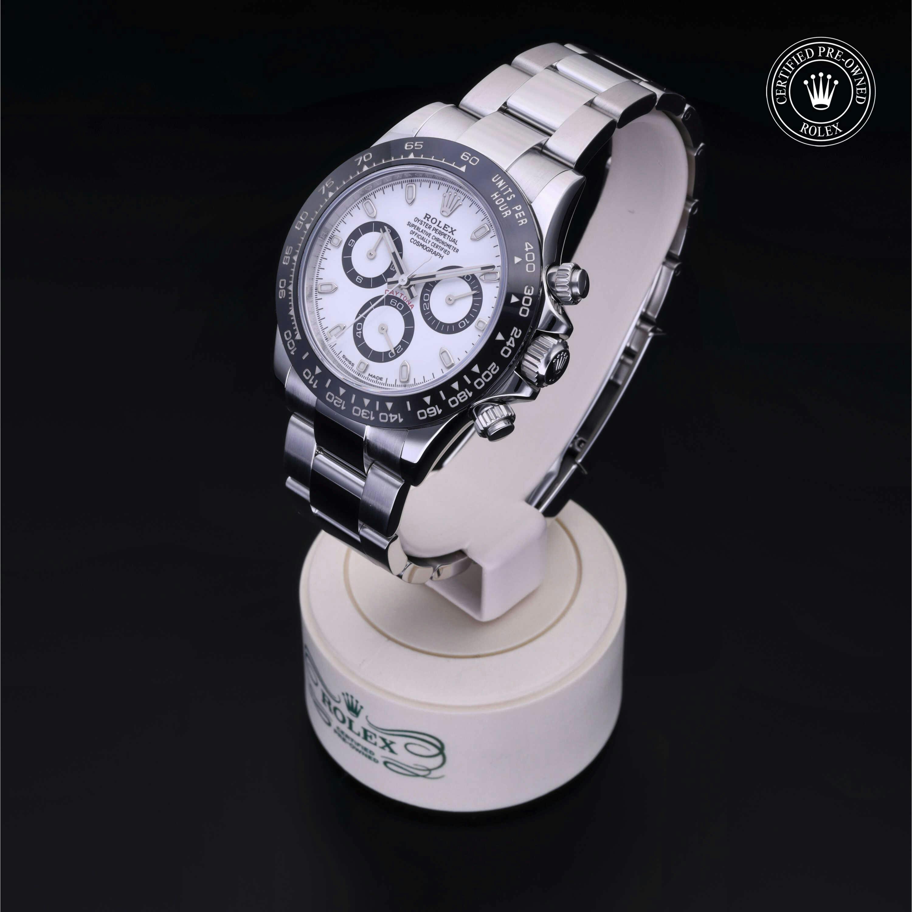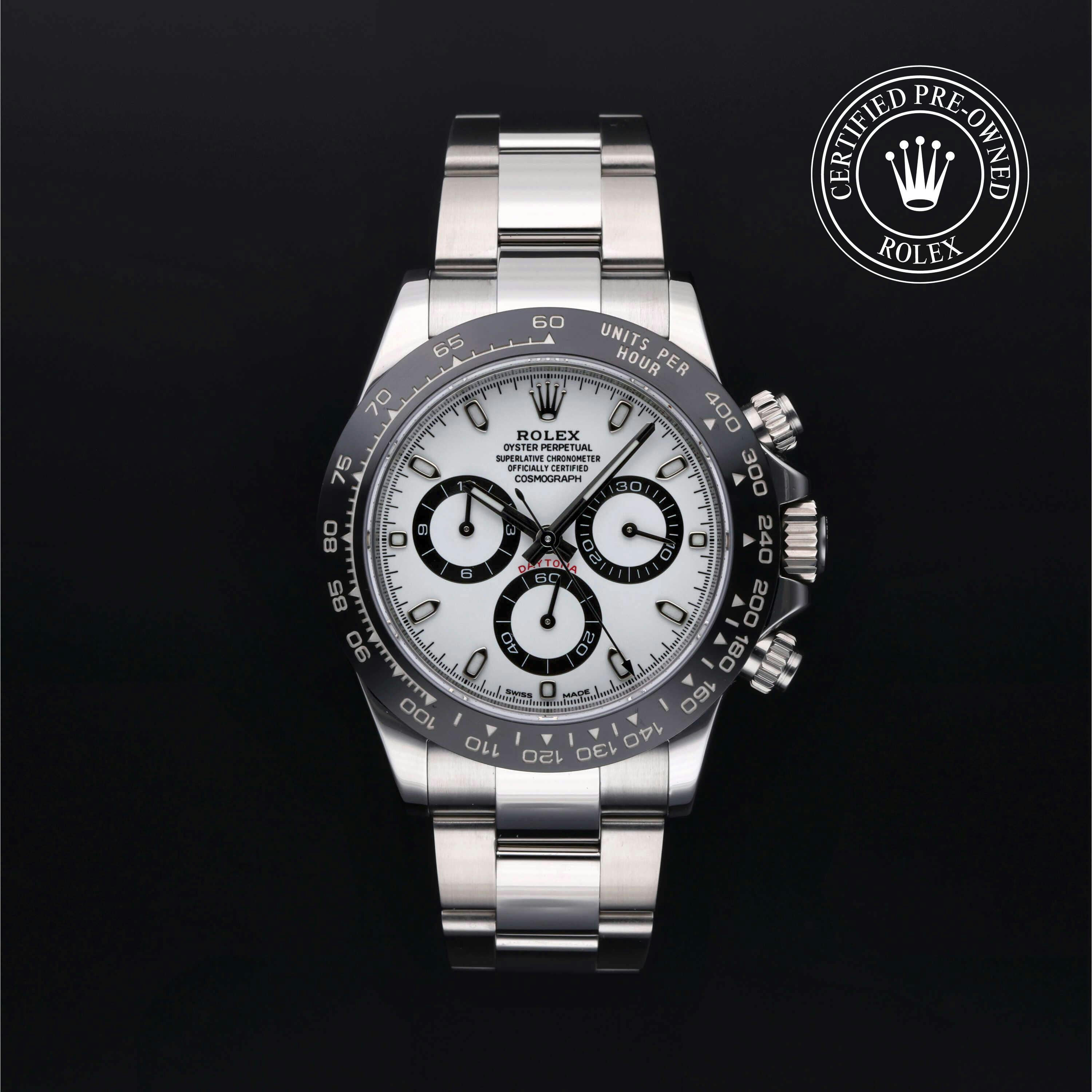 Rolex Certified Pre-Owned Cosmograph Daytona (116500LN) self - winding automatic watch, features a 40mm stainless steel case with a black cerachrom tachymetric scale bezel surrounding a white dial on a stainless steel oyster bracelet. Functions include hours, minutes, seconds and chronograph. This watch has received Rolex-authorized service and certification. It comes with the original papers, and includes a custom Rolex Certified Pre-Owned hang tag, travel pouch and RCPO international warranty card.