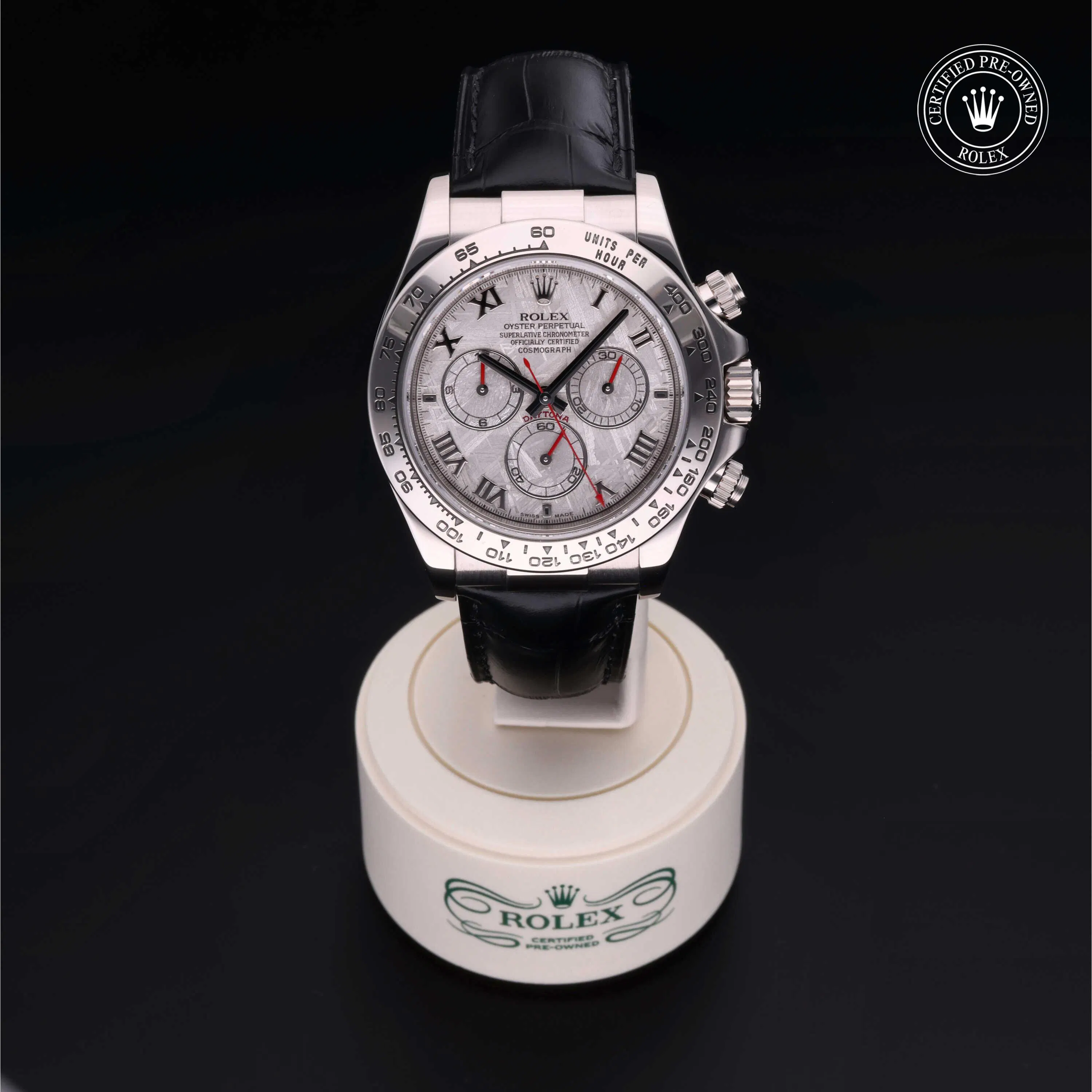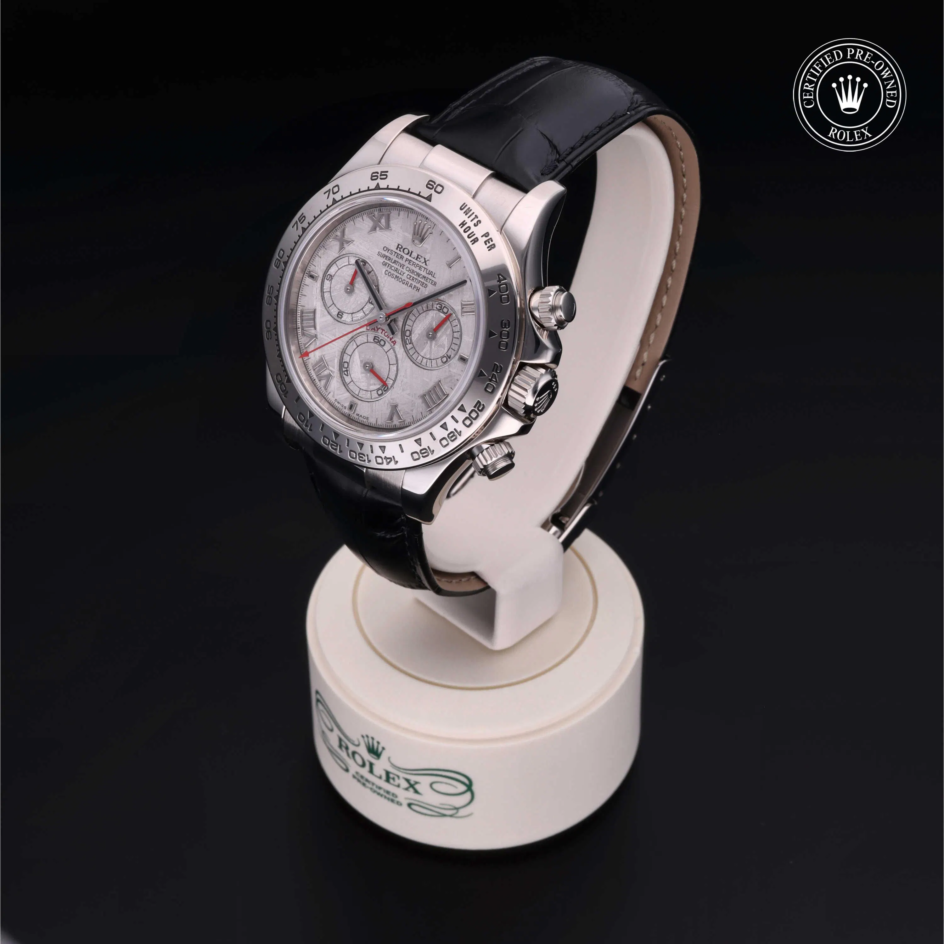 Rolex Certified Pre-Owned Cosmograph Daytona (116519) self - winding automatic watch, features a 40mm 18k white gold case and tachymetric scale bezel surrounding a meteorite dial on a black alligator strap with an 18k white gold deployant buckle. Functions include hours, minutes, seconds and chronograph. This watch has received Rolex-authorized service and certification. It does not come with the original box or papers, but includes a custom Rolex Certified Pre-Owned hang tag, travel pouch and RCPO international warranty card.