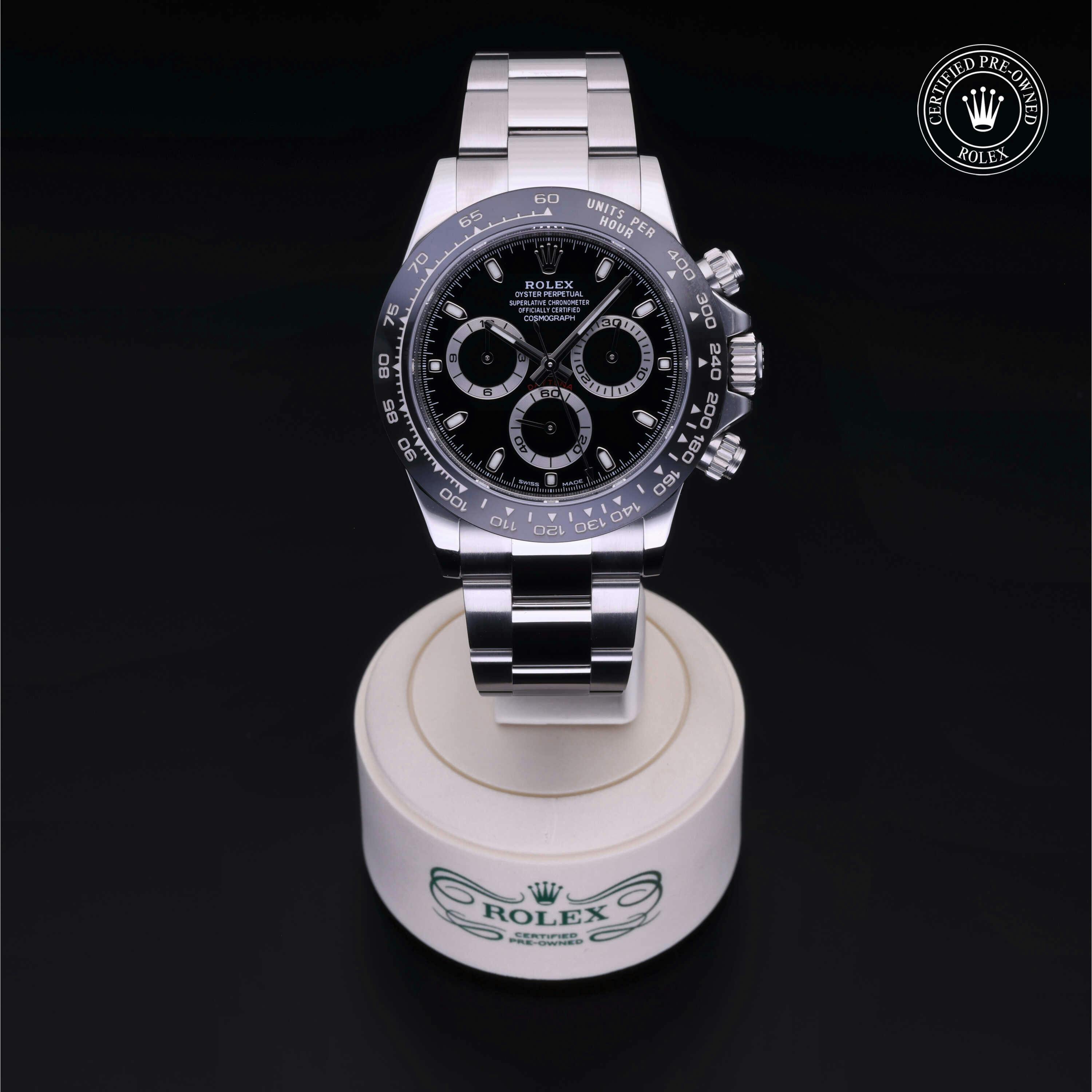 Rolex Certified Pre-Owned Cosmograph Daytona (116500LN) self - winding automatic watch, features a 40mm stainless steel case with a black cerachrom tachymetric scale bezel surrounding a black dial on a stainless steel oyster bracelet. Functions include hours, minutes, seconds, chronograph and tachymeter. This watch has received Rolex-authorized service and certification. It comes with the original box and papers, and includes a custom Rolex Certified Pre-Owned hang tag, travel pouch and RCPO international warranty card.