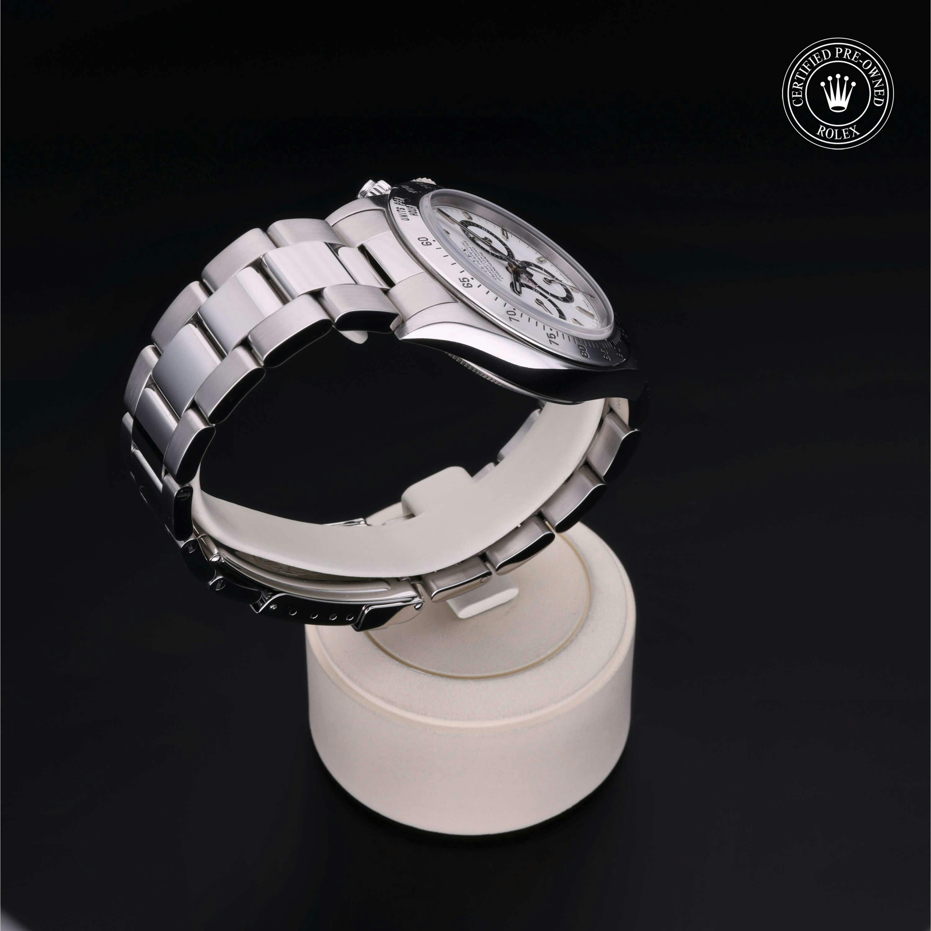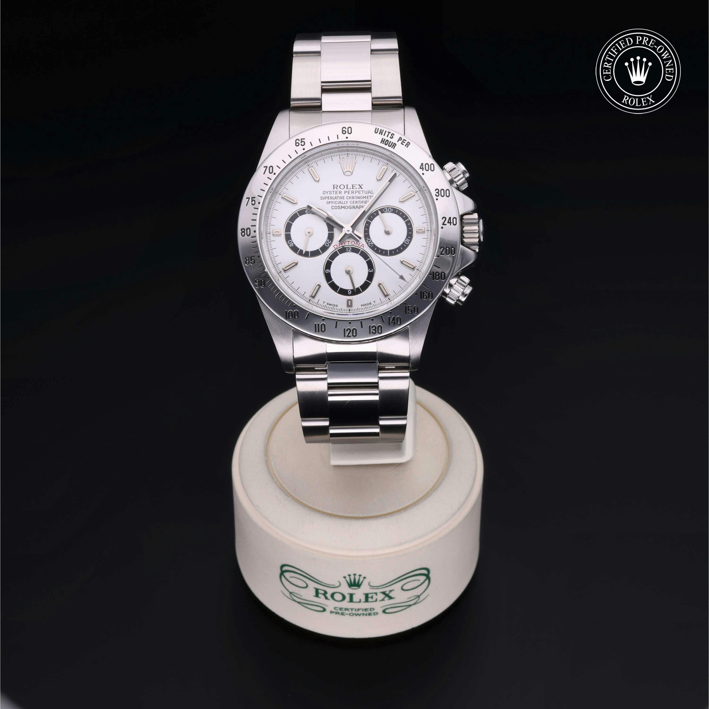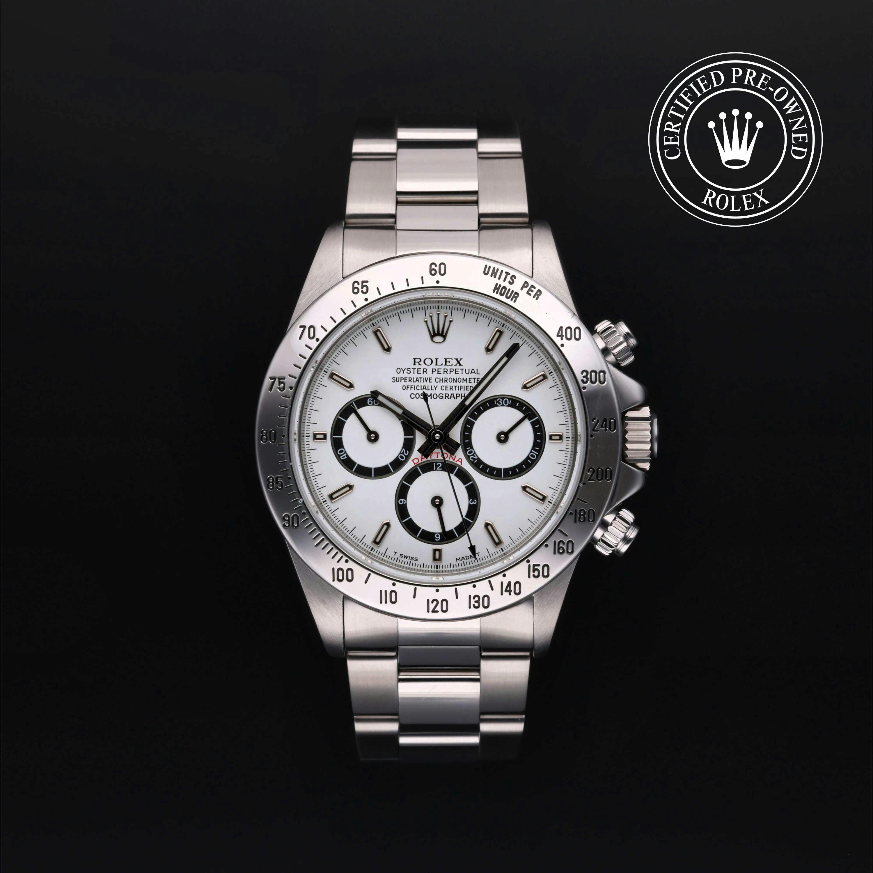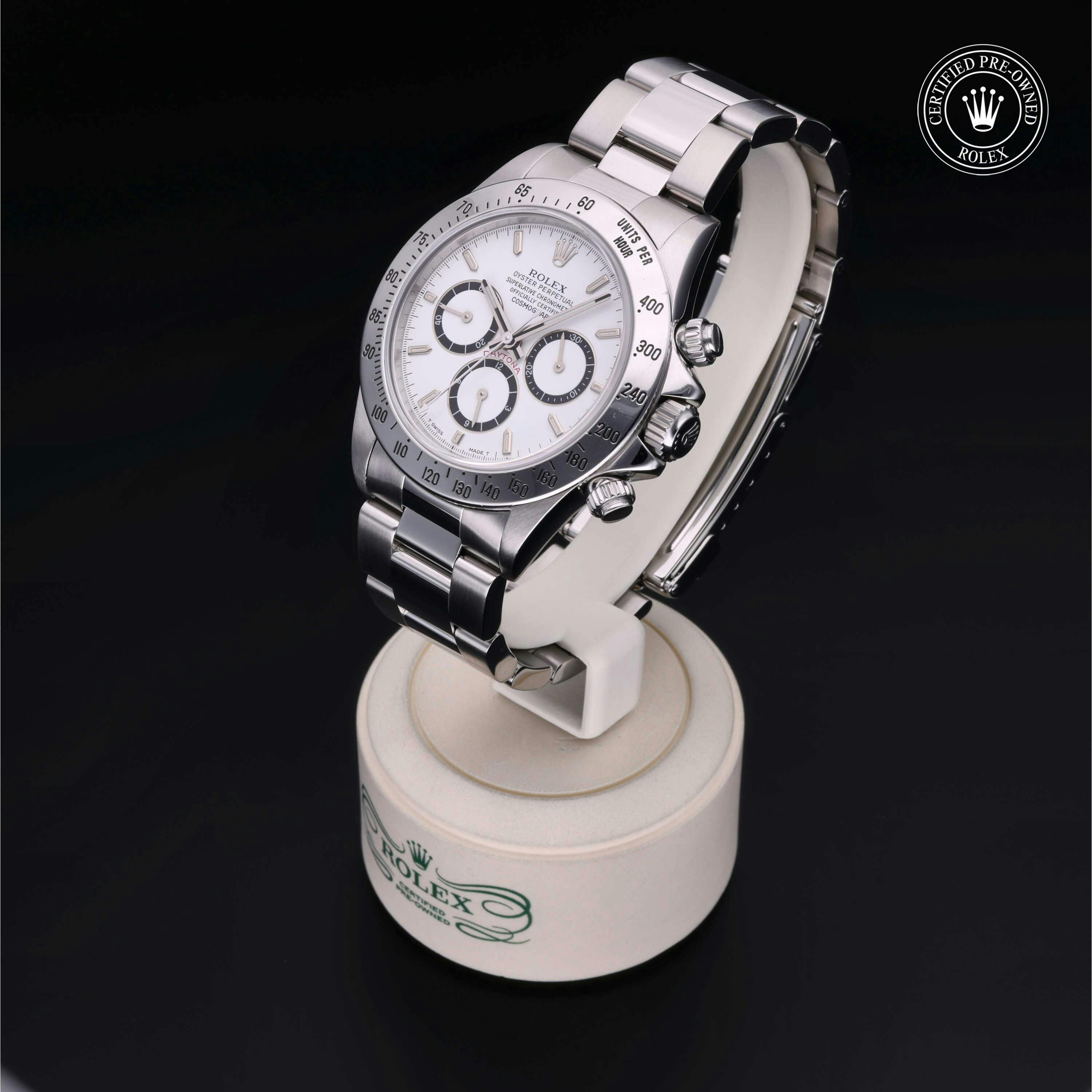 Rolex Certified Pre-Owned Cosmograph Daytona (16520) self - winding automatic watch, features a 40mm stainless steel case and tachymetric scale bezel surrounding a white dial on a stainless steel oyster bracelet. Functions include hours, minutes, seconds and chronograph. This watch has received Rolex-authorized service and certification. It comes with the original papers, and includes a custom Rolex Certified Pre-Owned hang tag, travel pouch and RCPO international warranty card.