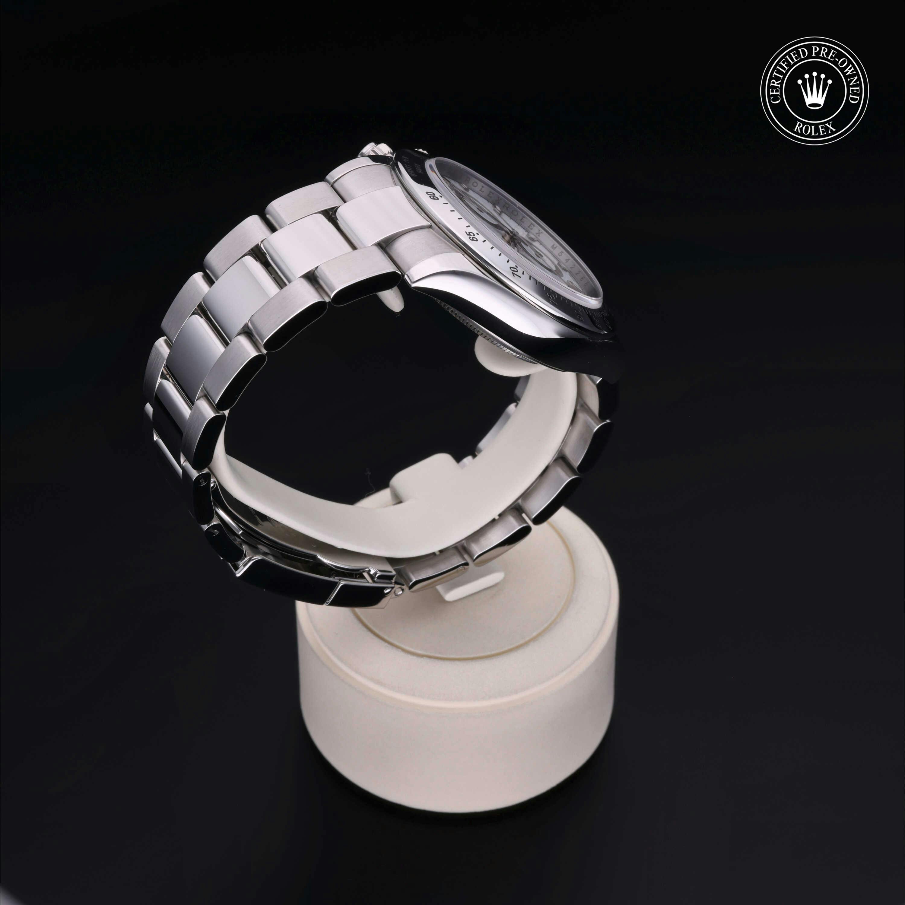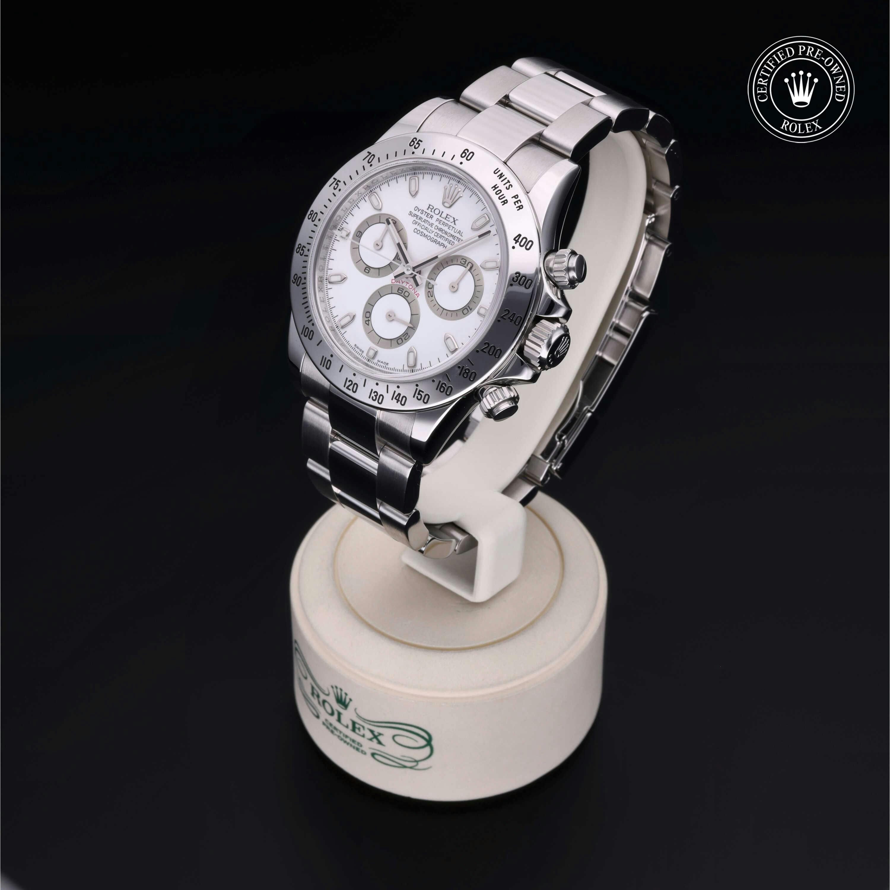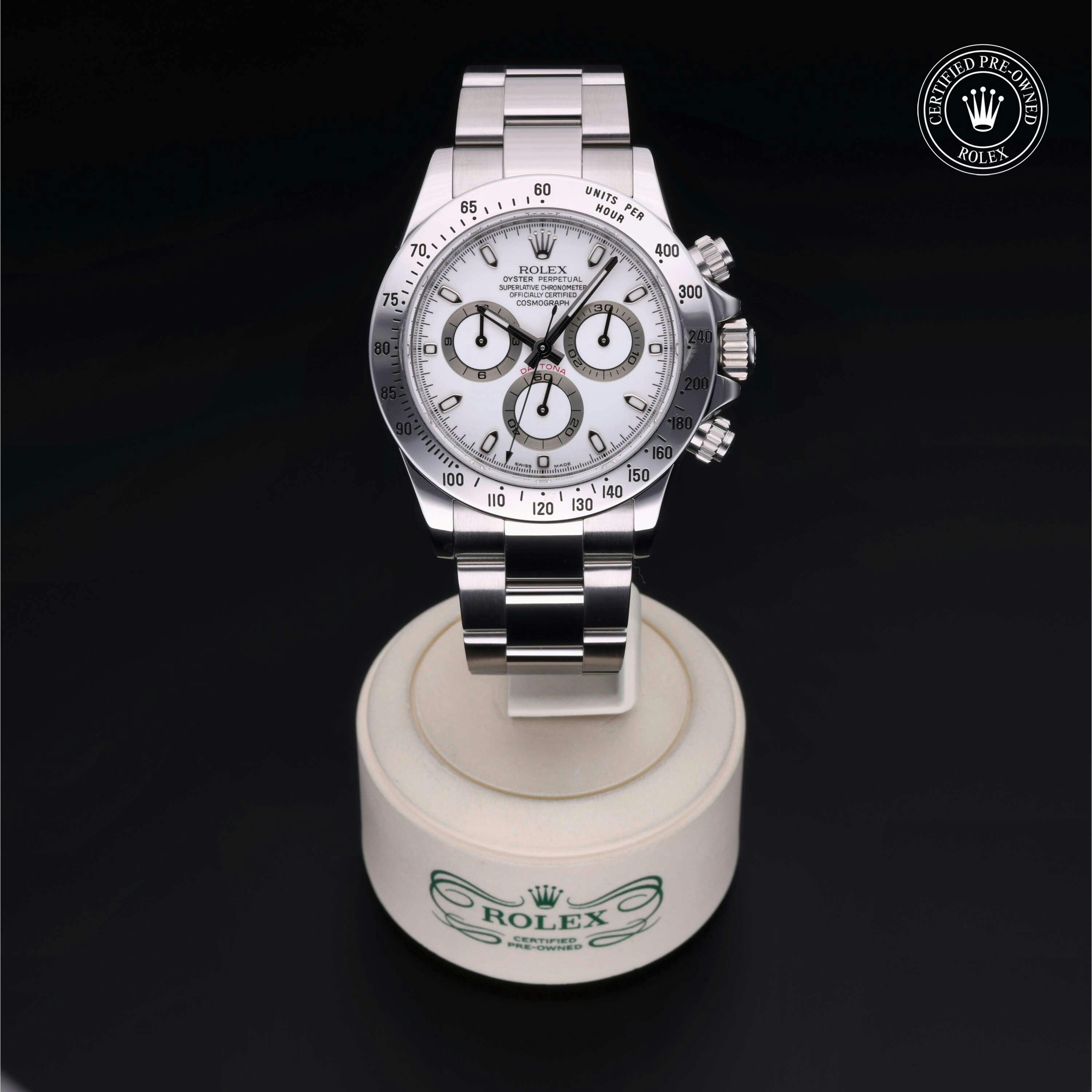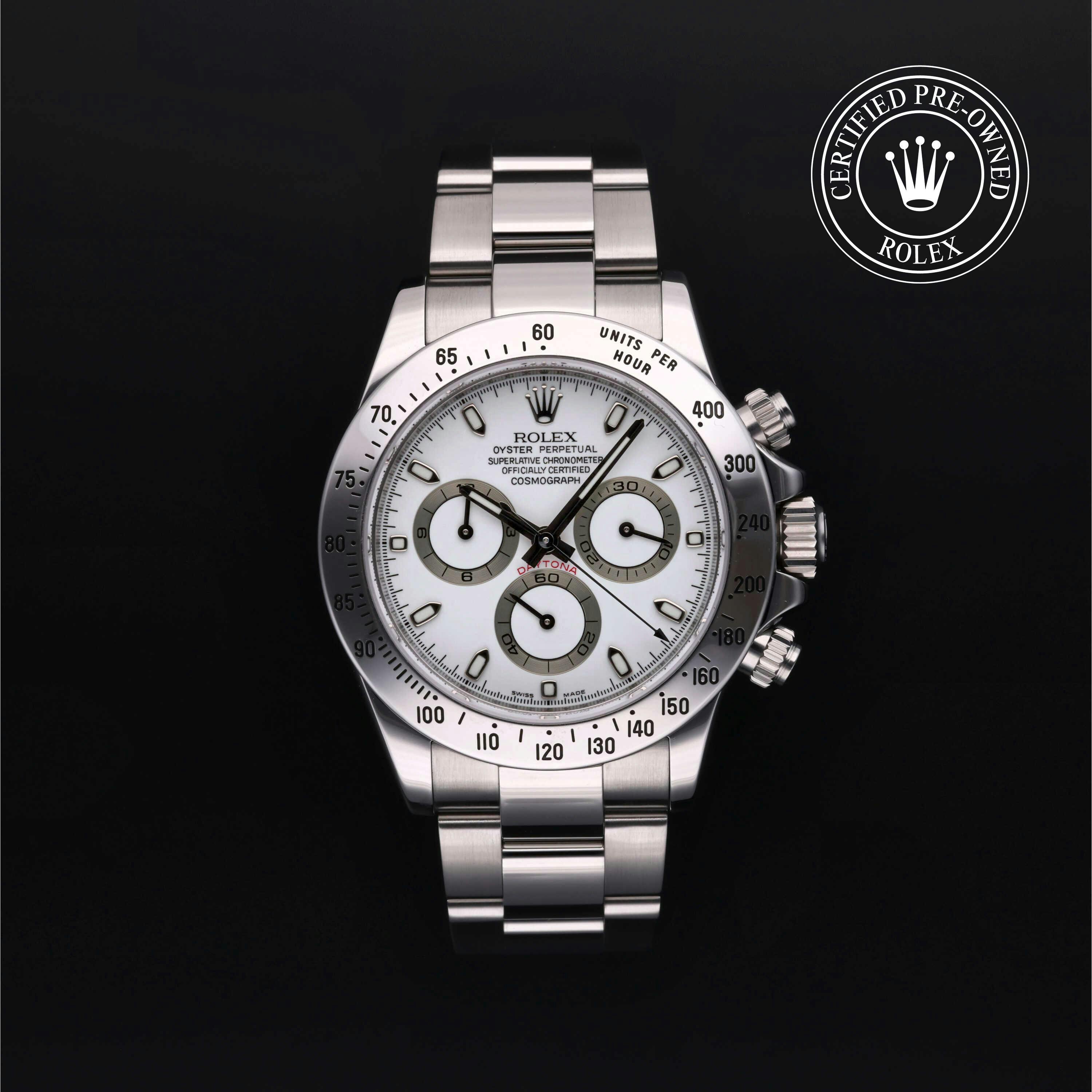 Rolex Certified Pre-Owned Cosmograph Daytona (116520) self - winding automatic watch, features a 40mm stainless steel case and tachymetric scale bezel surrounding a white dial on a stainless steel oyster bracelet. Functions include hours, minutes, seconds and chronograph. This watch has received Rolex-authorized service and certification. It does not come with the original box or papers, but includes a custom Rolex Certified Pre-Owned hang tag, travel pouch and RCPO international warranty card.