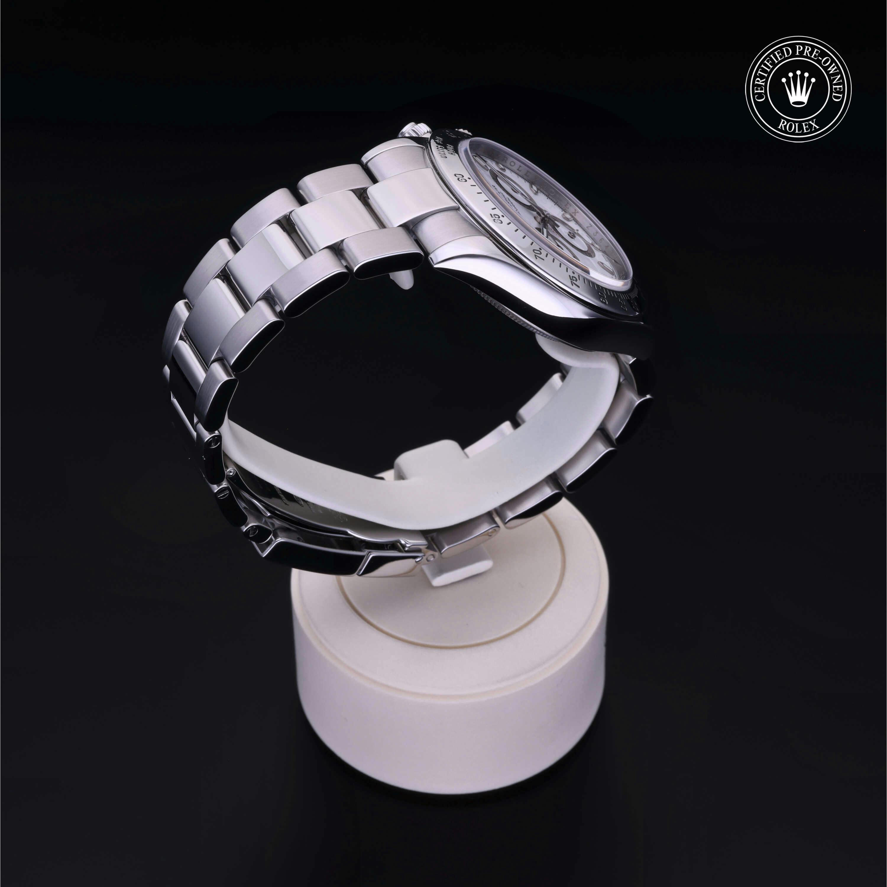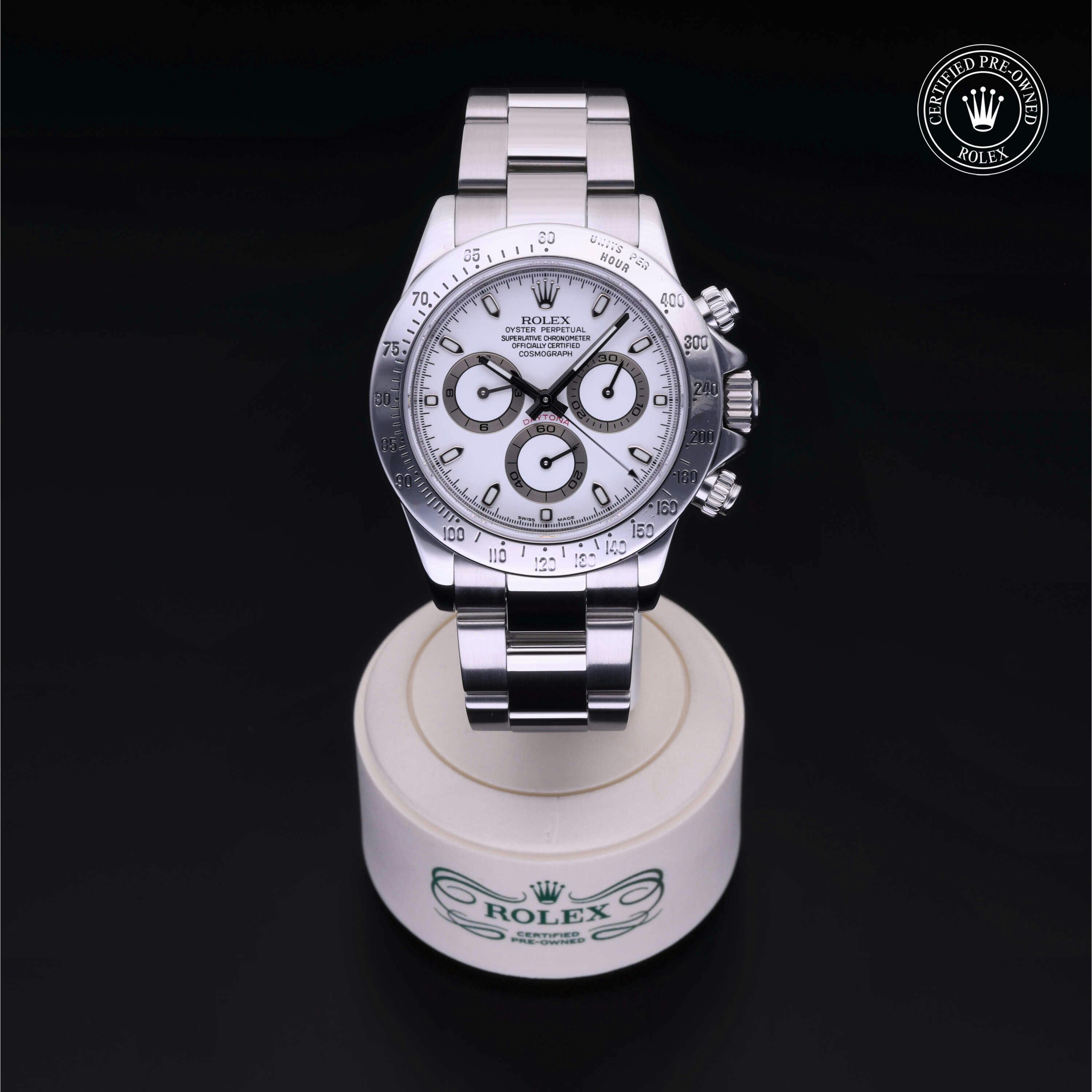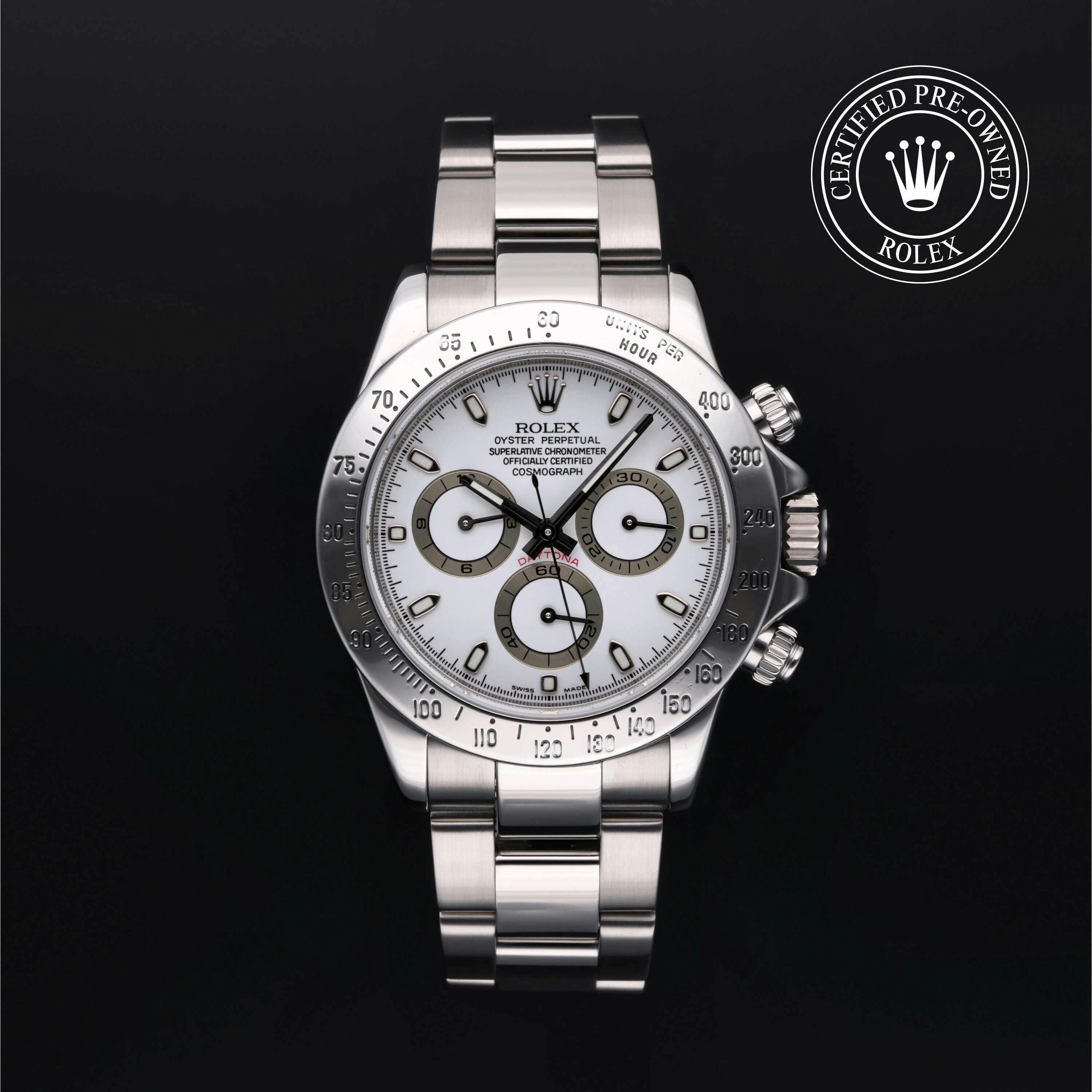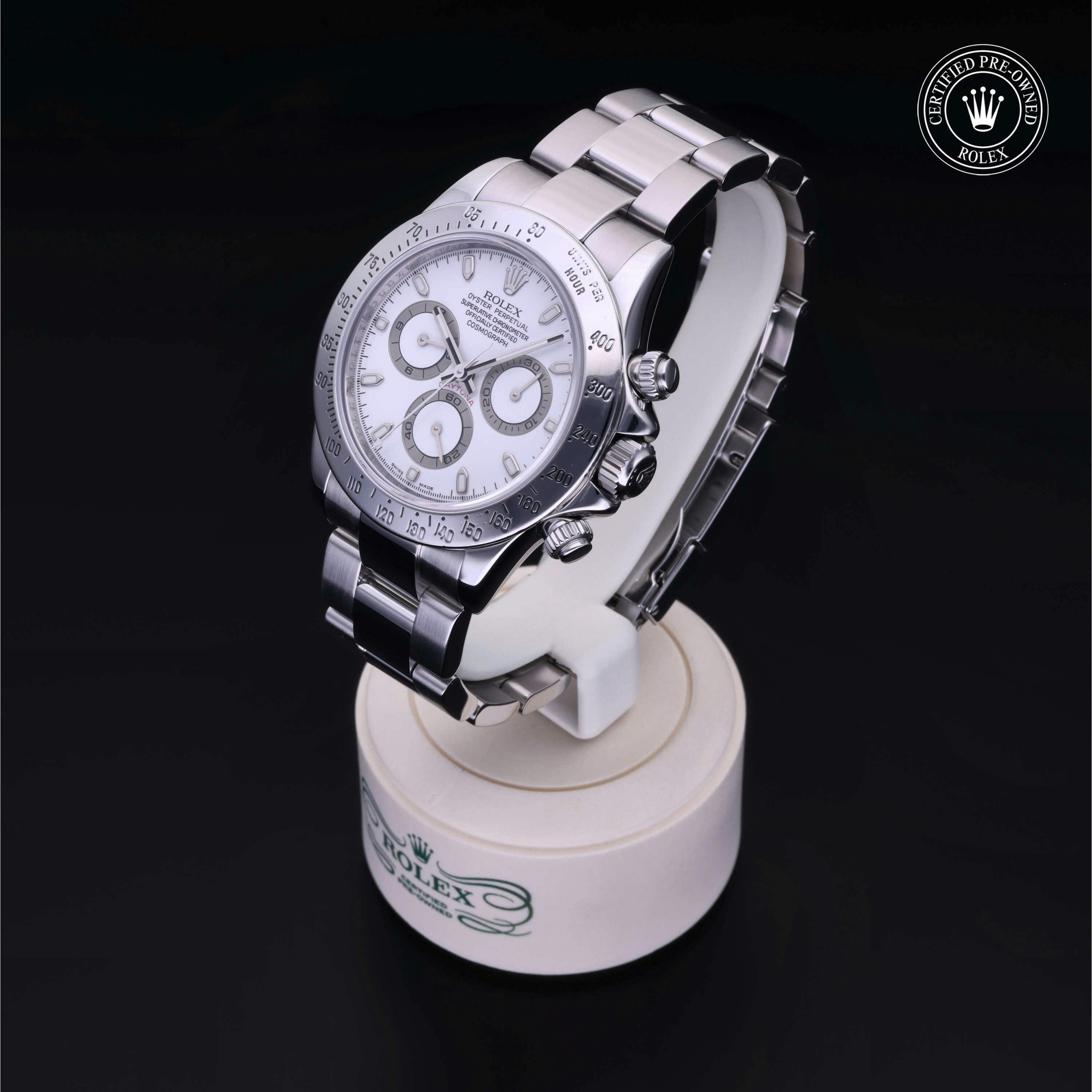 Rolex Certified Pre-Owned Cosmograph Daytona (116520) self - winding automatic watch, features a 40mm stainless steel case and tachymetric scale bezel surrounding a white dial on a stainless steel oyster bracelet. Functions include hours, minutes, seconds and chronograph. This watch has received Rolex-authorized service and certification. It does not come with the original box or papers, but includes a custom Rolex Certified Pre-Owned hang tag, travel pouch and RCPO international warranty card.