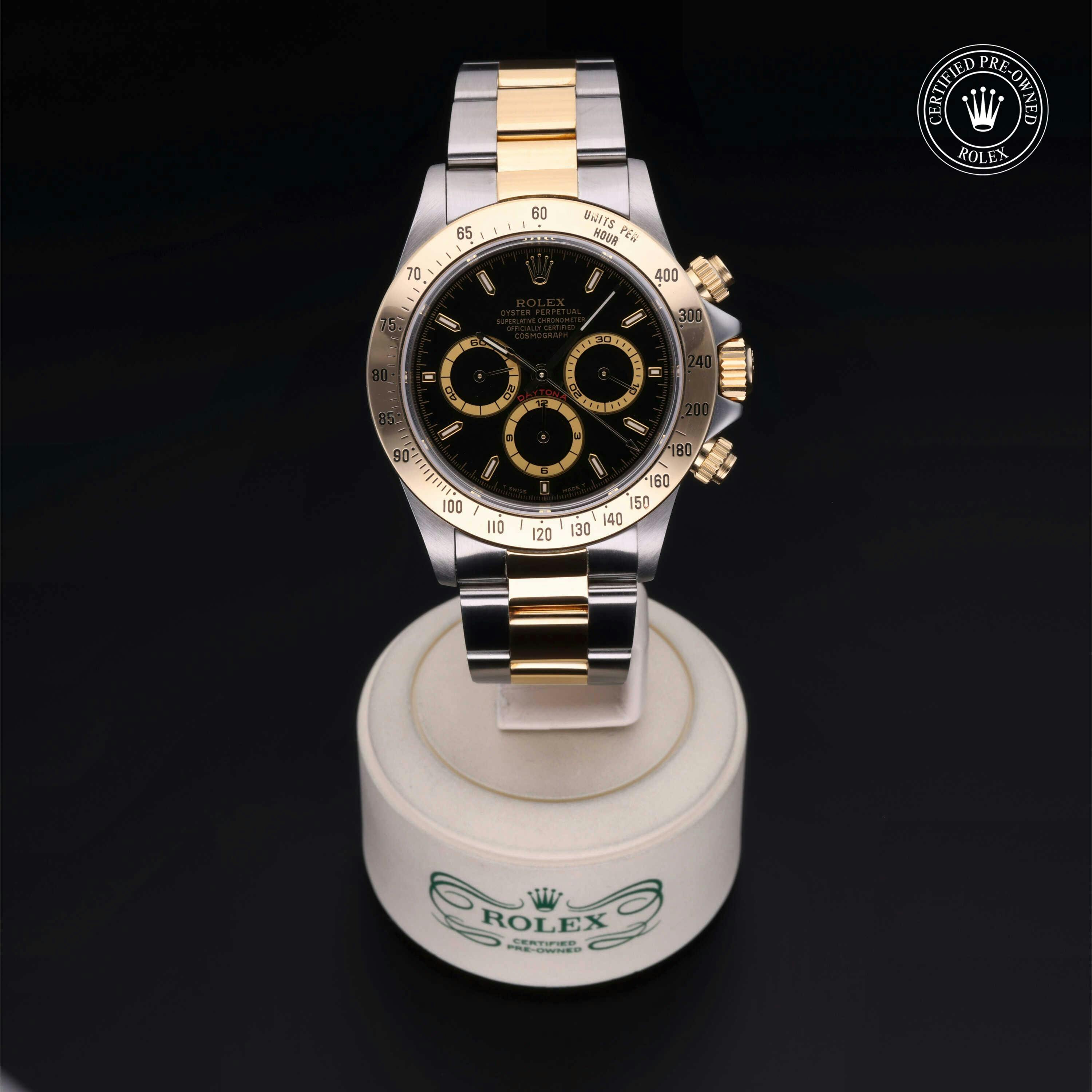 Rolex Certified Pre-Owned Cosmograph Daytona (16523) self - winding automatic watch, features a 40mm stainless steel case with an 18k yellow gold tachymetric scale bezel surrounding a black dial on a stainless steel and 18k yellow gold oyster bracelet. Functions include hours, minutes, seconds and chronograph. This watch has received Rolex-authorized service and certification. It does not come with the original box or papers, but includes a custom Rolex Certified Pre-Owned hang tag, travel pouch and RCPO international warranty card.