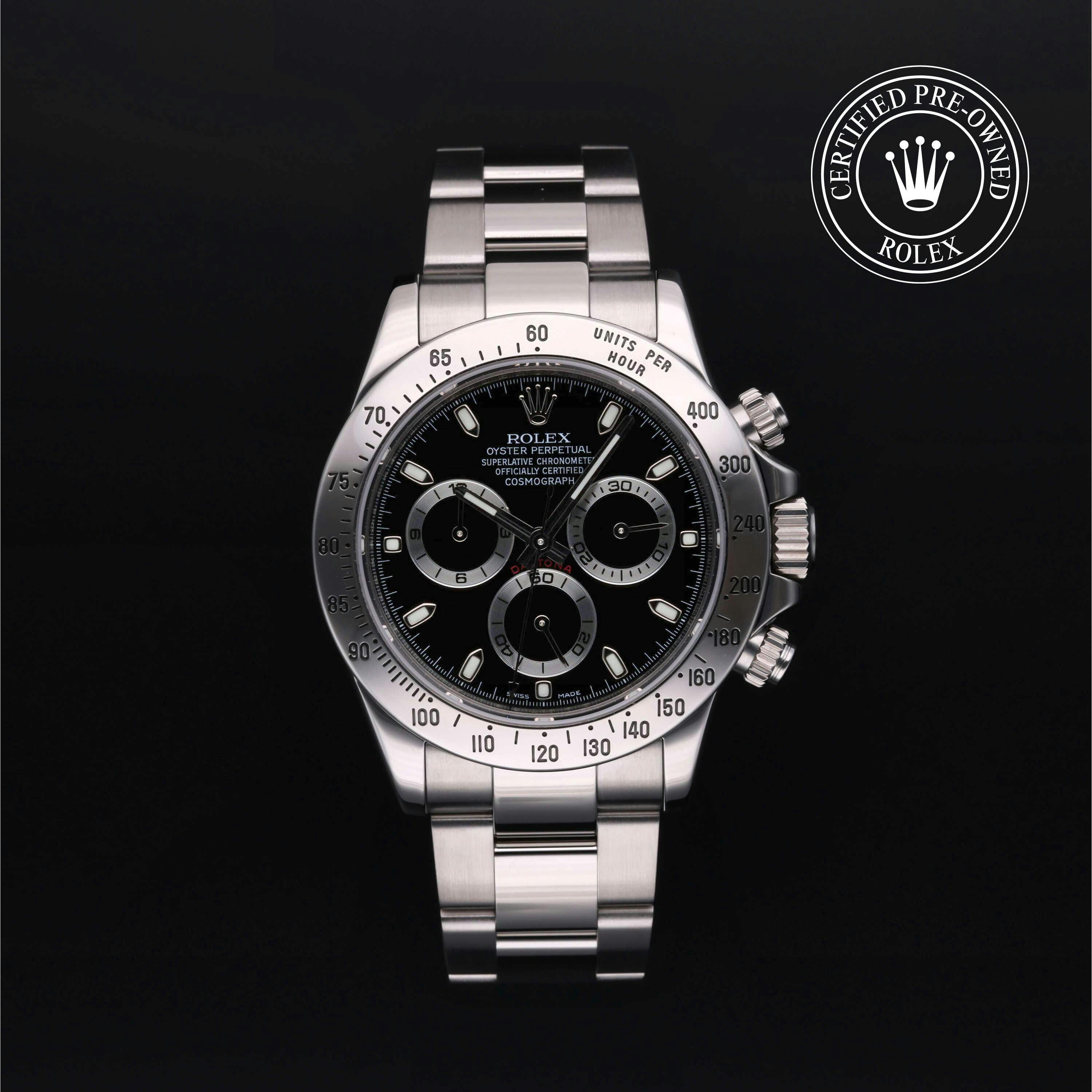 Rolex Certified Pre-Owned Cosmograph Daytona (116520) self - winding automatic watch, features a 40mm stainless steel case and tachymetric scale bezel surrounding a black dial on a stainless steel oyster bracelet. Functions include hours, minutes, seconds, chronograph and tachymeter. This watch has received Rolex-authorized service and certification. It does not come with the original box or papers, but includes a custom Rolex Certified Pre-Owned hang tag, travel pouch and RCPO international warranty card.
