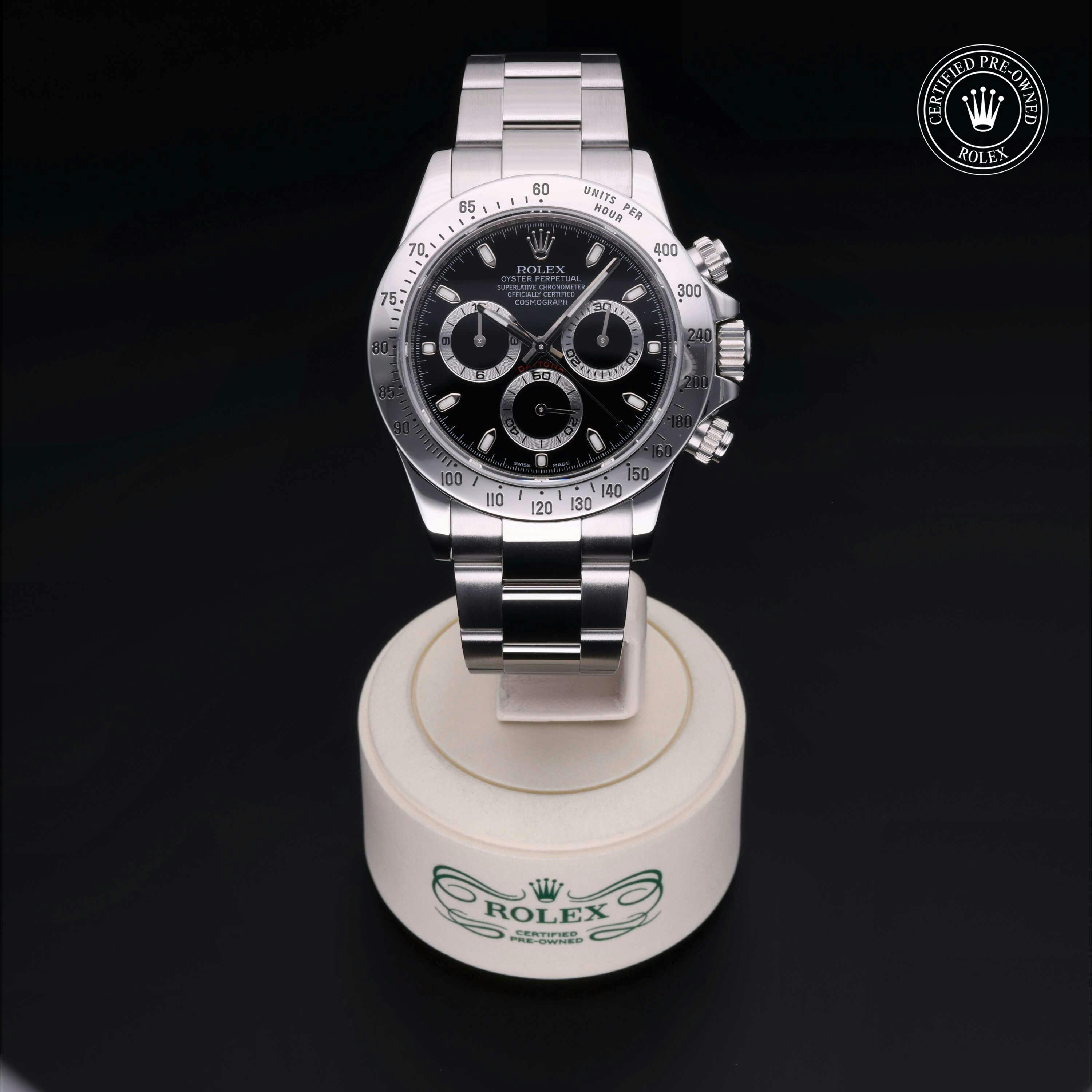 Rolex Certified Pre-Owned Cosmograph Daytona (116520) self - winding automatic watch, features a 40mm stainless steel case and tachymetric scale bezel surrounding a black dial on a stainless steel oyster bracelet. Functions include hours, minutes, seconds, chronograph and tachymeter. This watch has received Rolex-authorized service and certification. It does not come with the original box or papers, but includes a custom Rolex Certified Pre-Owned hang tag, travel pouch and RCPO international warranty card.