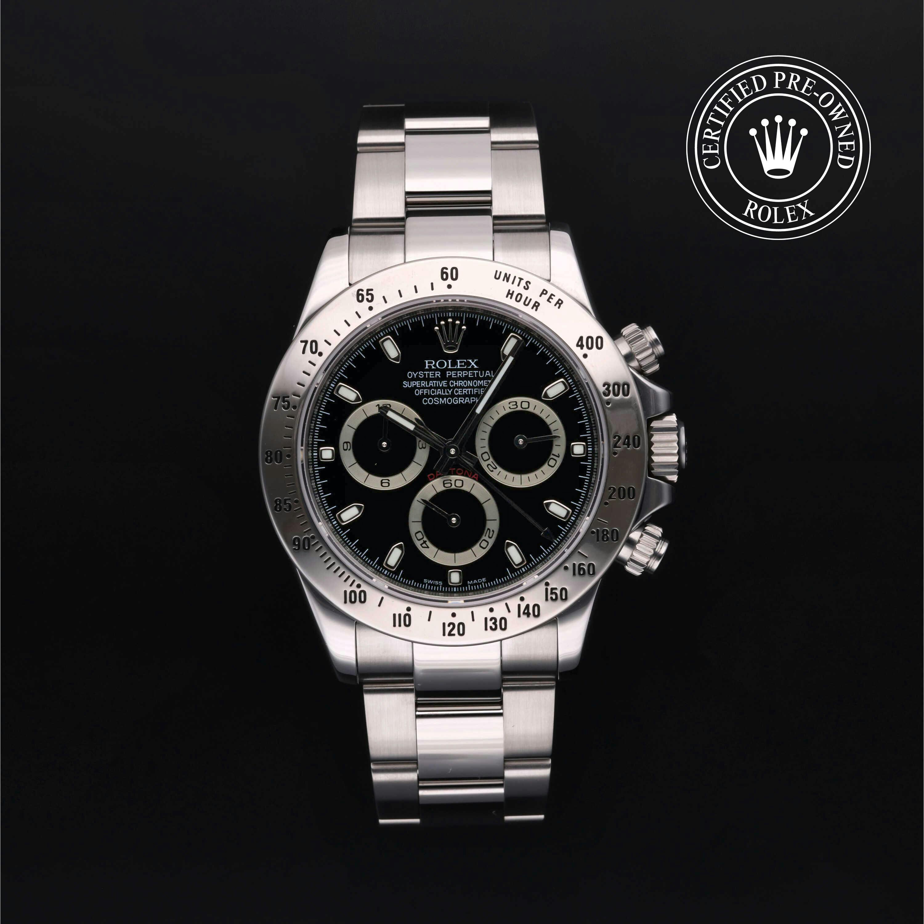 Rolex Certified Pre-Owned Cosmograph Daytona (116520) self - winding automatic watch, features a 40mm stainless steel case and tachymetric scale bezel surrounding a black dial on a stainless steel oyster bracelet. Functions include hours, minutes, seconds, chronograph and tachymeter. This watch has received Rolex-authorized service and certification. It does not come with the original box or papers, but includes a custom Rolex Certified Pre-Owned hang tag, travel pouch and RCPO international warranty card.
