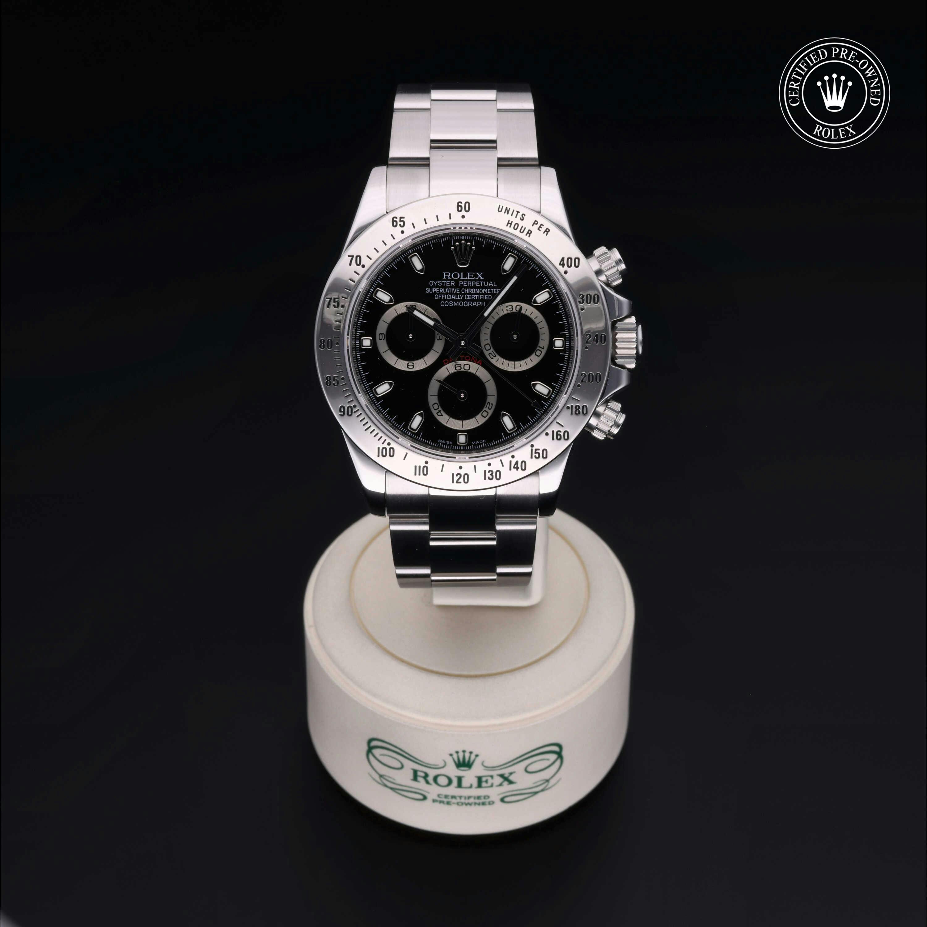 Rolex Certified Pre-Owned Cosmograph Daytona (116520) self - winding automatic watch, features a 40mm stainless steel case and tachymetric scale bezel surrounding a black dial on a stainless steel oyster bracelet. Functions include hours, minutes, seconds, chronograph and tachymeter. This watch has received Rolex-authorized service and certification. It does not come with the original box or papers, but includes a custom Rolex Certified Pre-Owned hang tag, travel pouch and RCPO international warranty card.