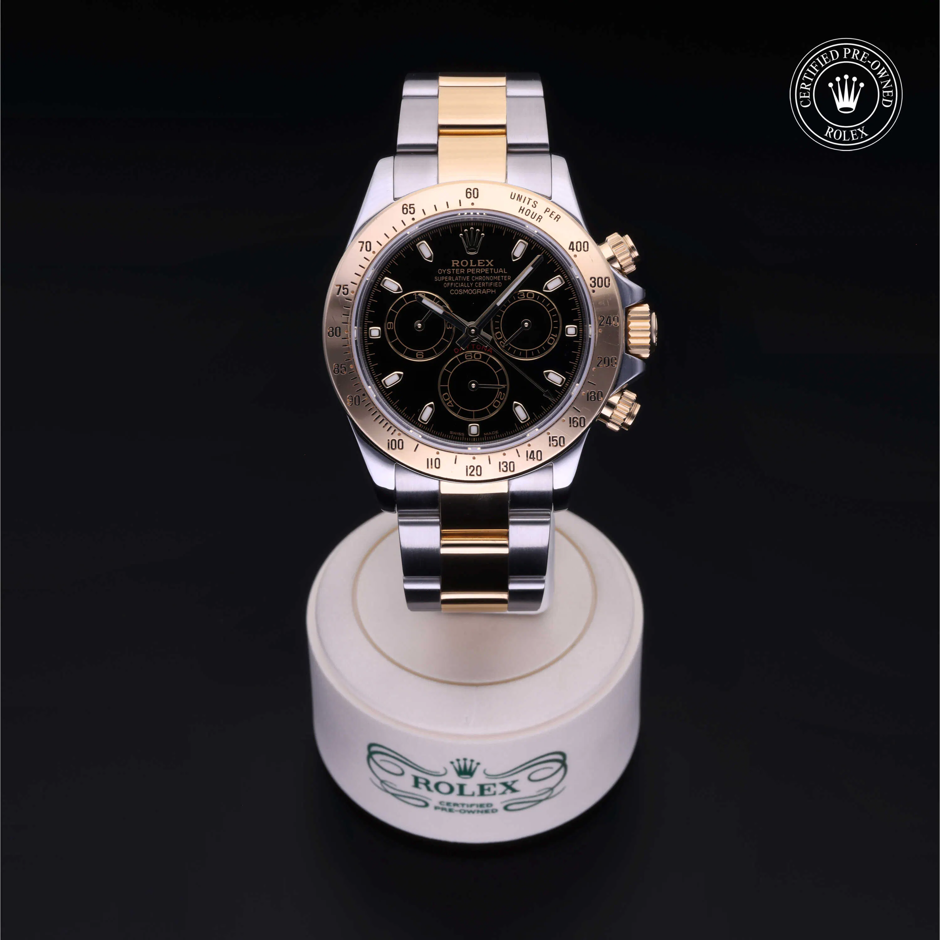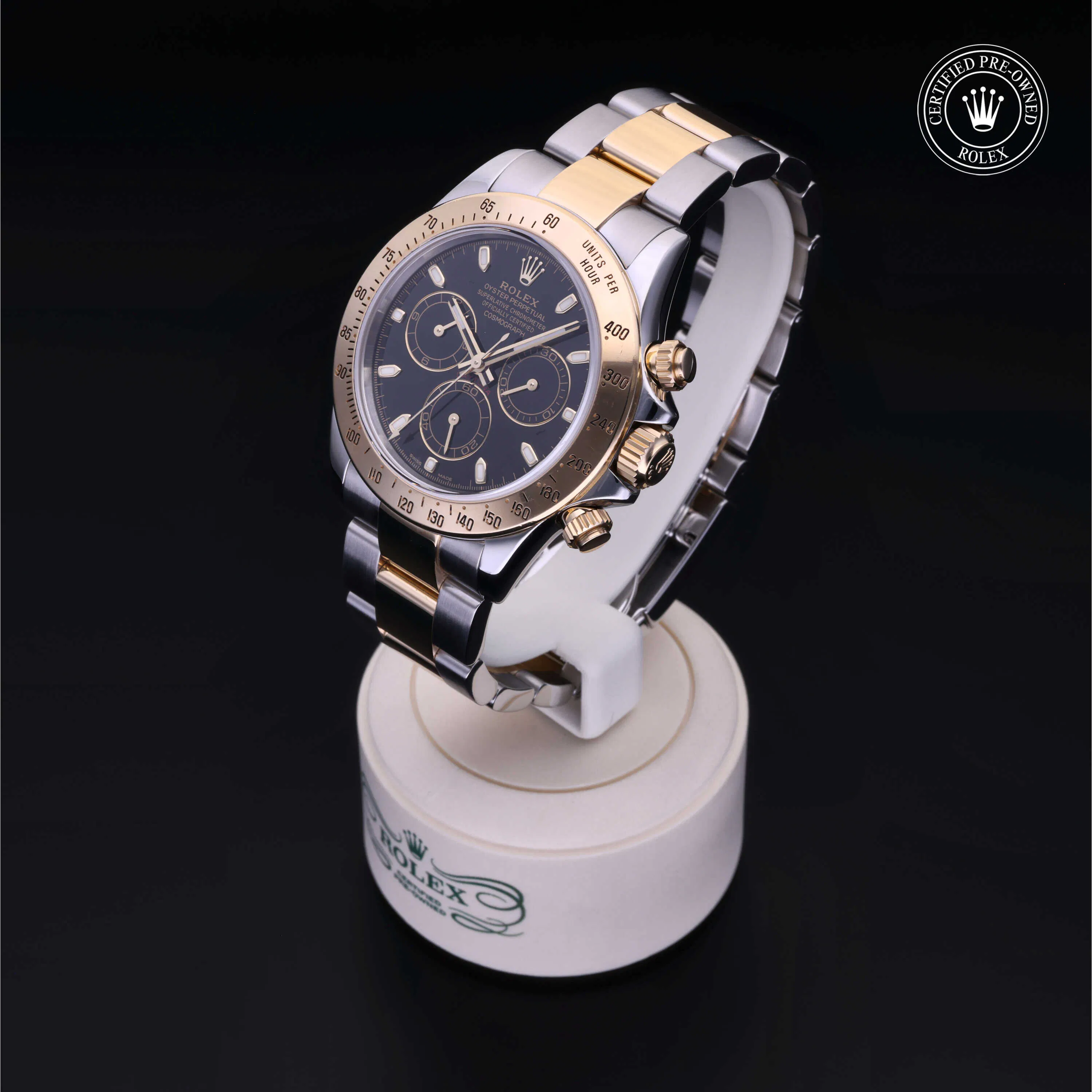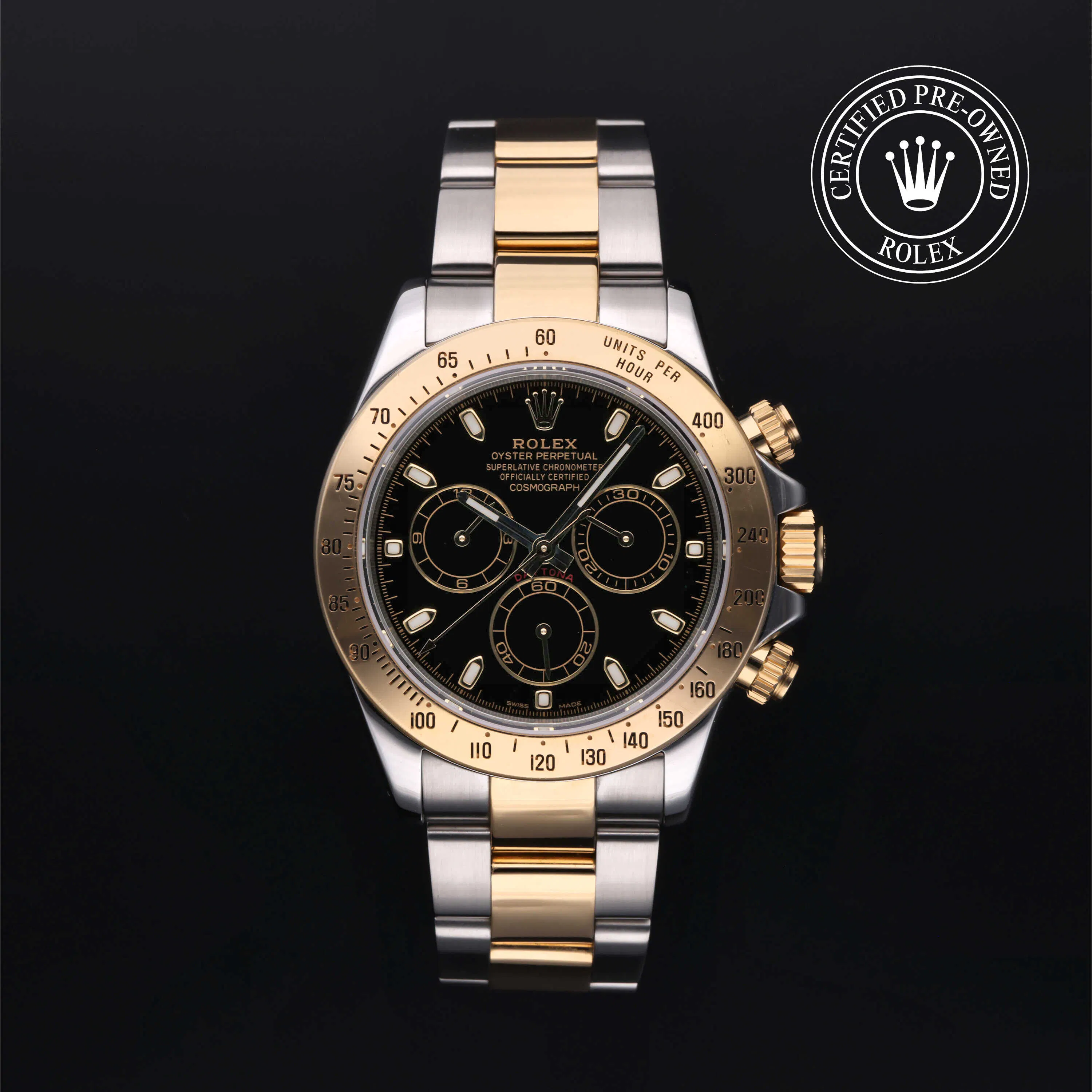 Rolex Certified Pre-Owned Cosmograph Daytona (116523) self - winding automatic watch, features a 40mm stainless steel case with an 18k yellow gold tachymetric scale bezel surrounding a black index dial. The watch is secured on a stainless steel and 18k yellow gold Oyster bracelet complete with a folding buckle. Functions include hours, minutes, seconds and chronograph. This watch has been serviced by an authorized service center and certified by Rolex. It does not come with the original box or papers, but includes a custom Rolex Certified Pre-Owned hang tag, travel pouch and international warranty card.