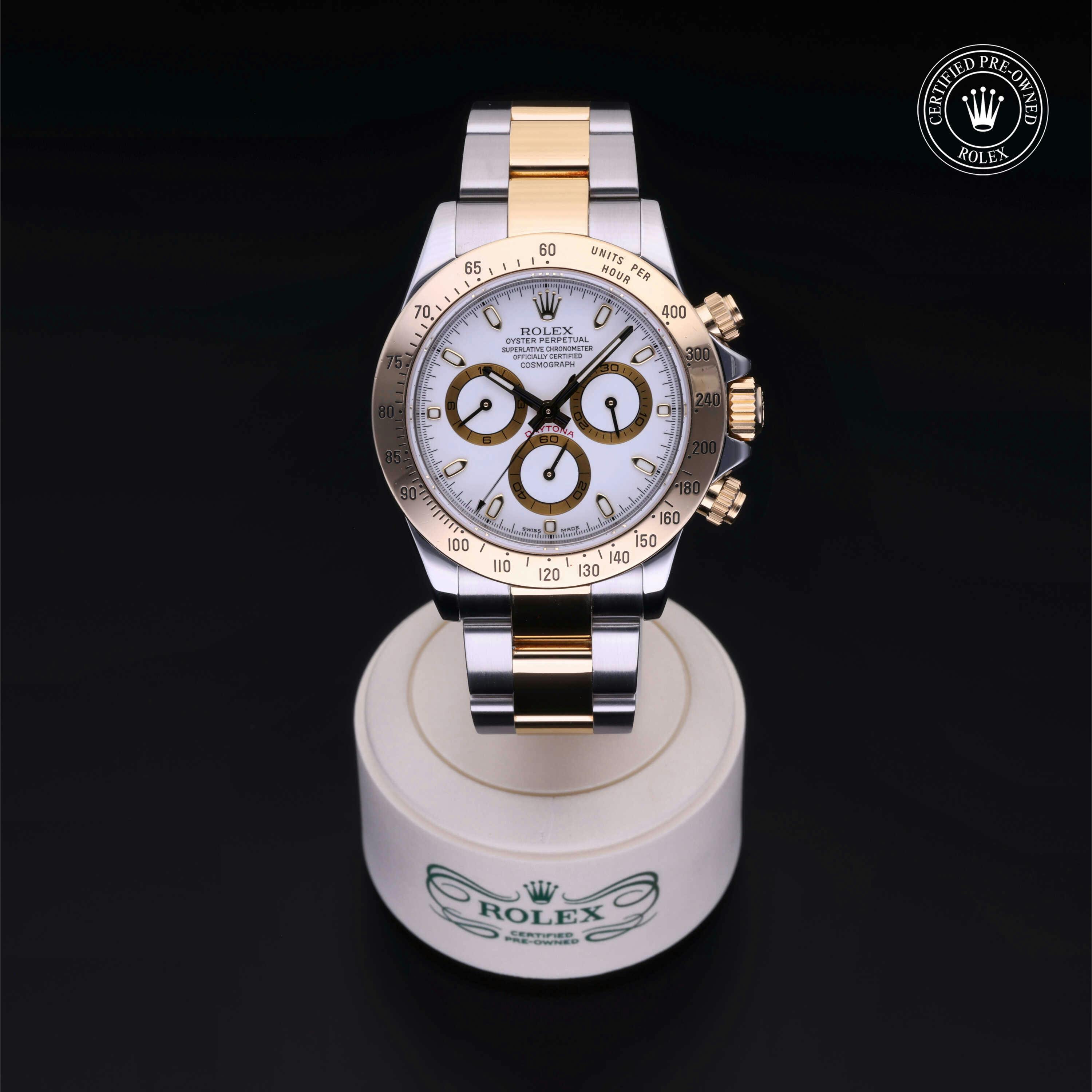 Rolex Certified Pre-Owned Cosmograph Daytona (116523) self - winding automatic watch, features a 40mm stainless steel case with an 18k yellow gold tachymetric scale bezel surrounding a white dial on a stainless steel and 18k yellow gold oyster bracelet. Functions include hours, minutes, seconds, chronograph and tachymeter. This watch has received Rolex-authorized service and certification. It does not come with the original box or papers, but includes a custom Rolex Certified Pre-Owned hang tag, travel pouch and RCPO international warranty card.