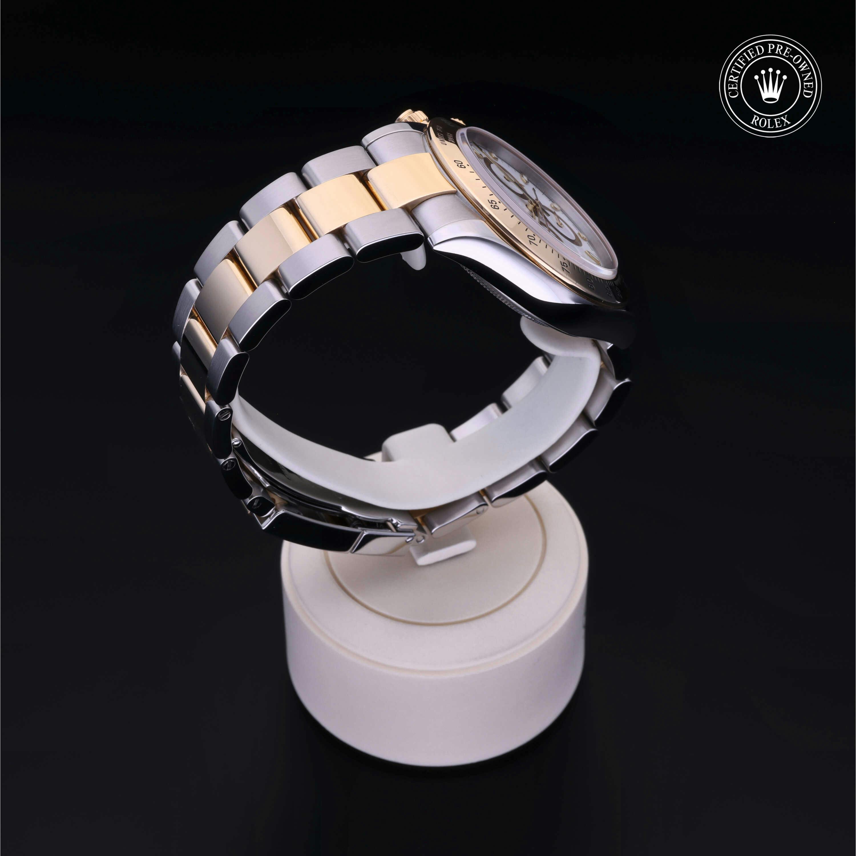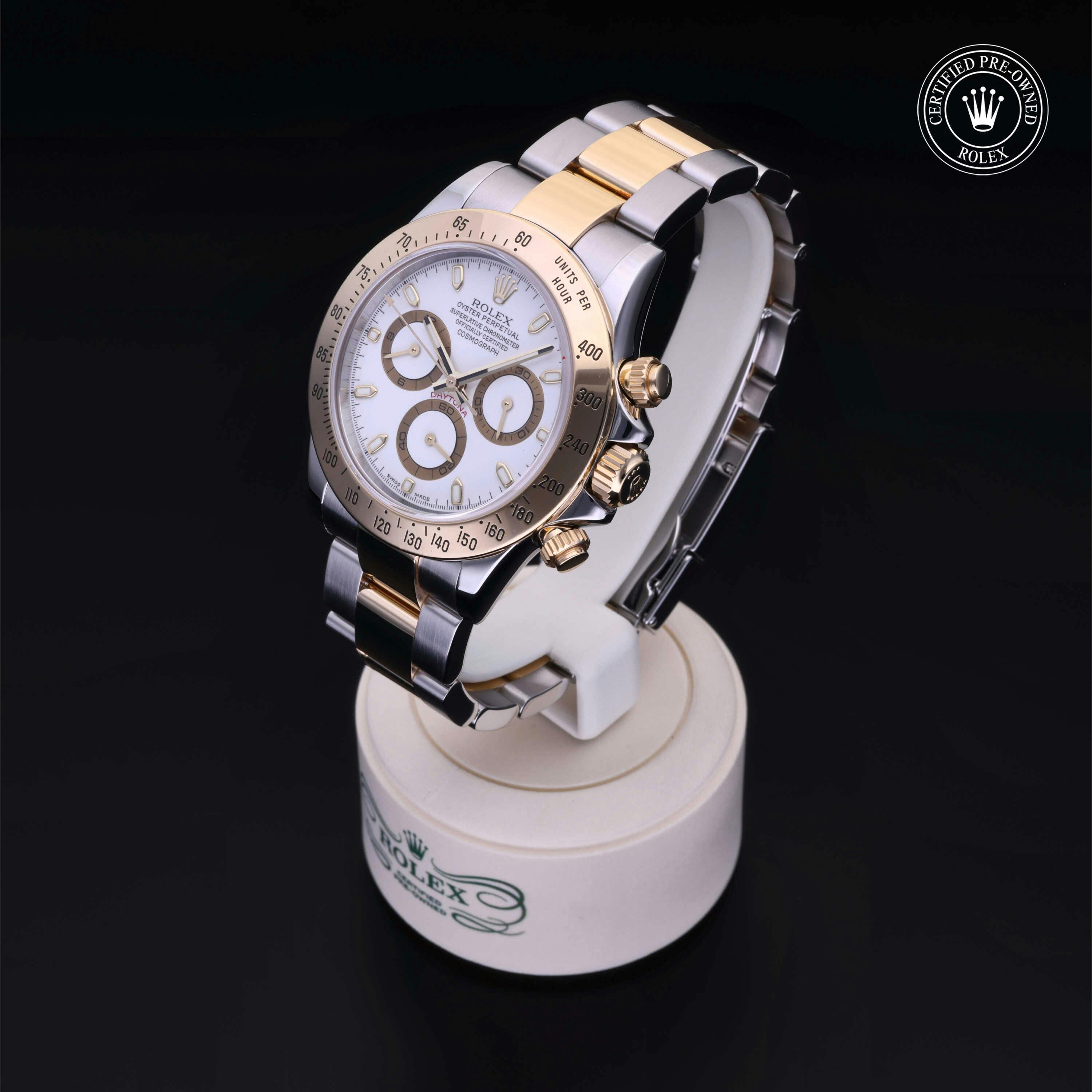 Rolex Certified Pre-Owned Cosmograph Daytona (116523) self - winding automatic watch, features a 40mm stainless steel case with an 18k yellow gold tachymetric scale bezel surrounding a white dial on a stainless steel and 18k yellow gold oyster bracelet. Functions include hours, minutes, seconds, chronograph and tachymeter. This watch has received Rolex-authorized service and certification. It does not come with the original box or papers, but includes a custom Rolex Certified Pre-Owned hang tag, travel pouch and RCPO international warranty card.